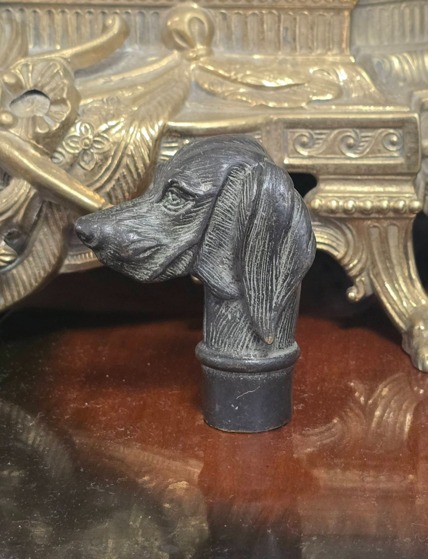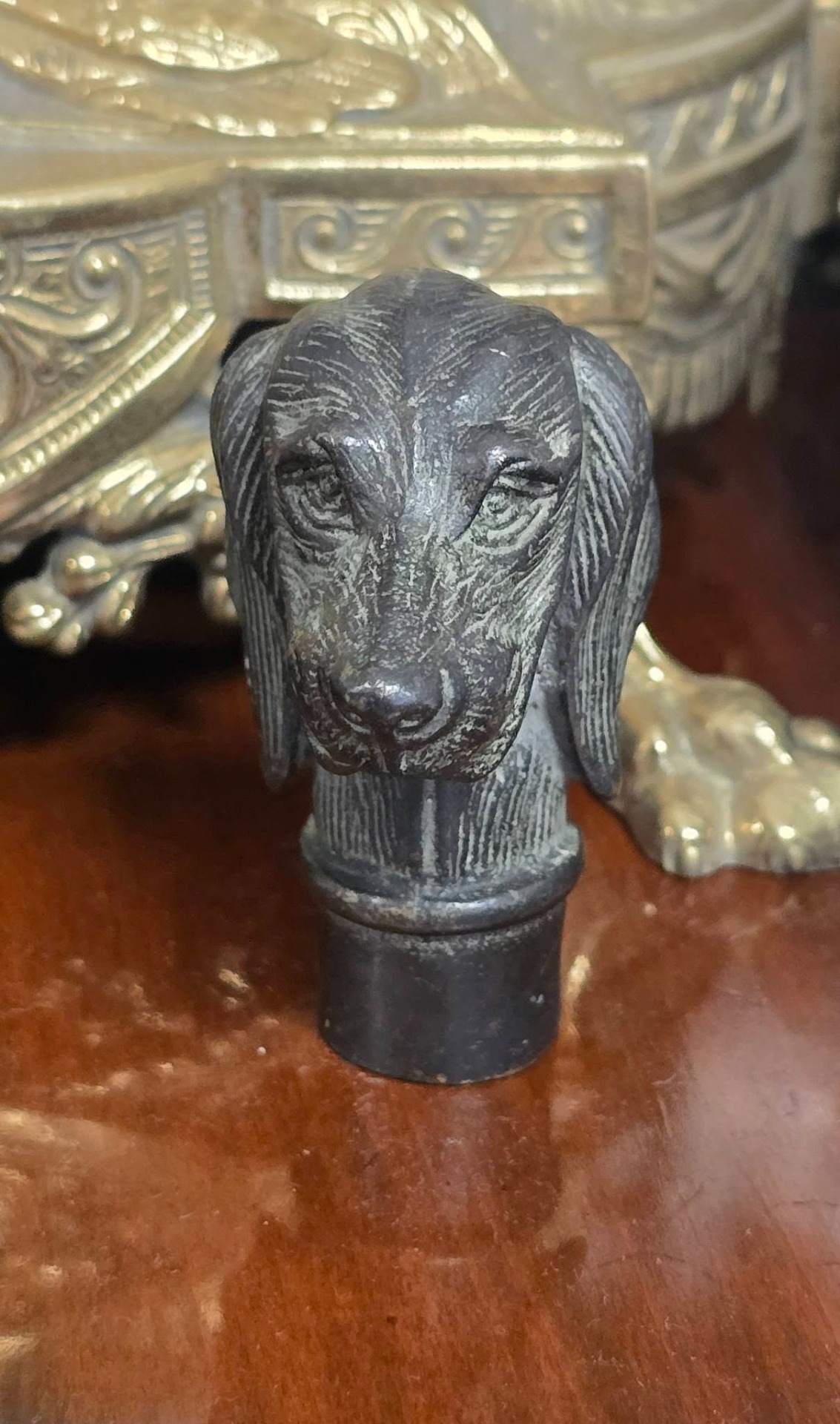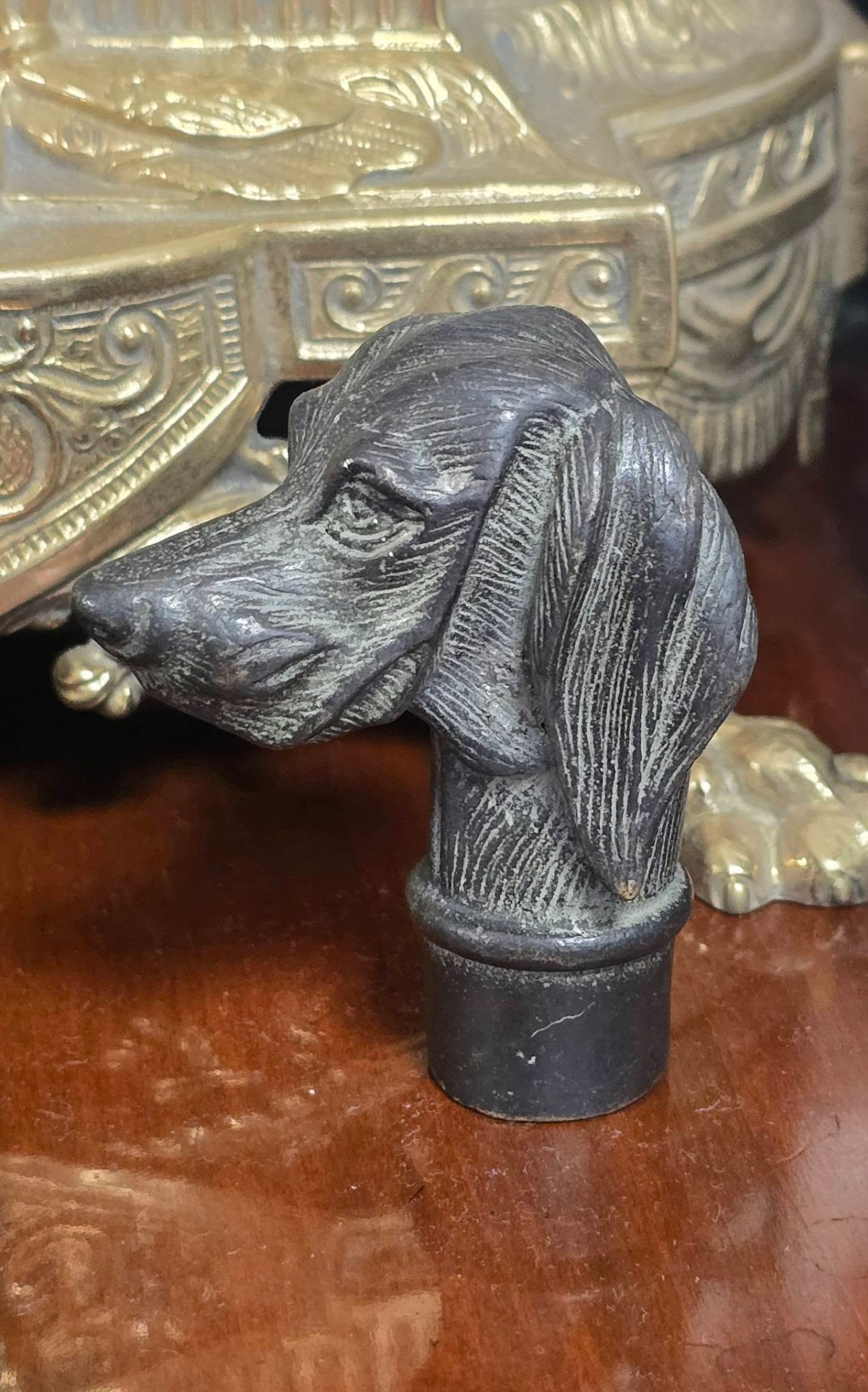 Mâner vechi pentru baston, din bronz patinat, cățel cu detalii frumos lucrate manual, piesă populară în perioada victoriană și edwuardiană (anii 1900-1915).