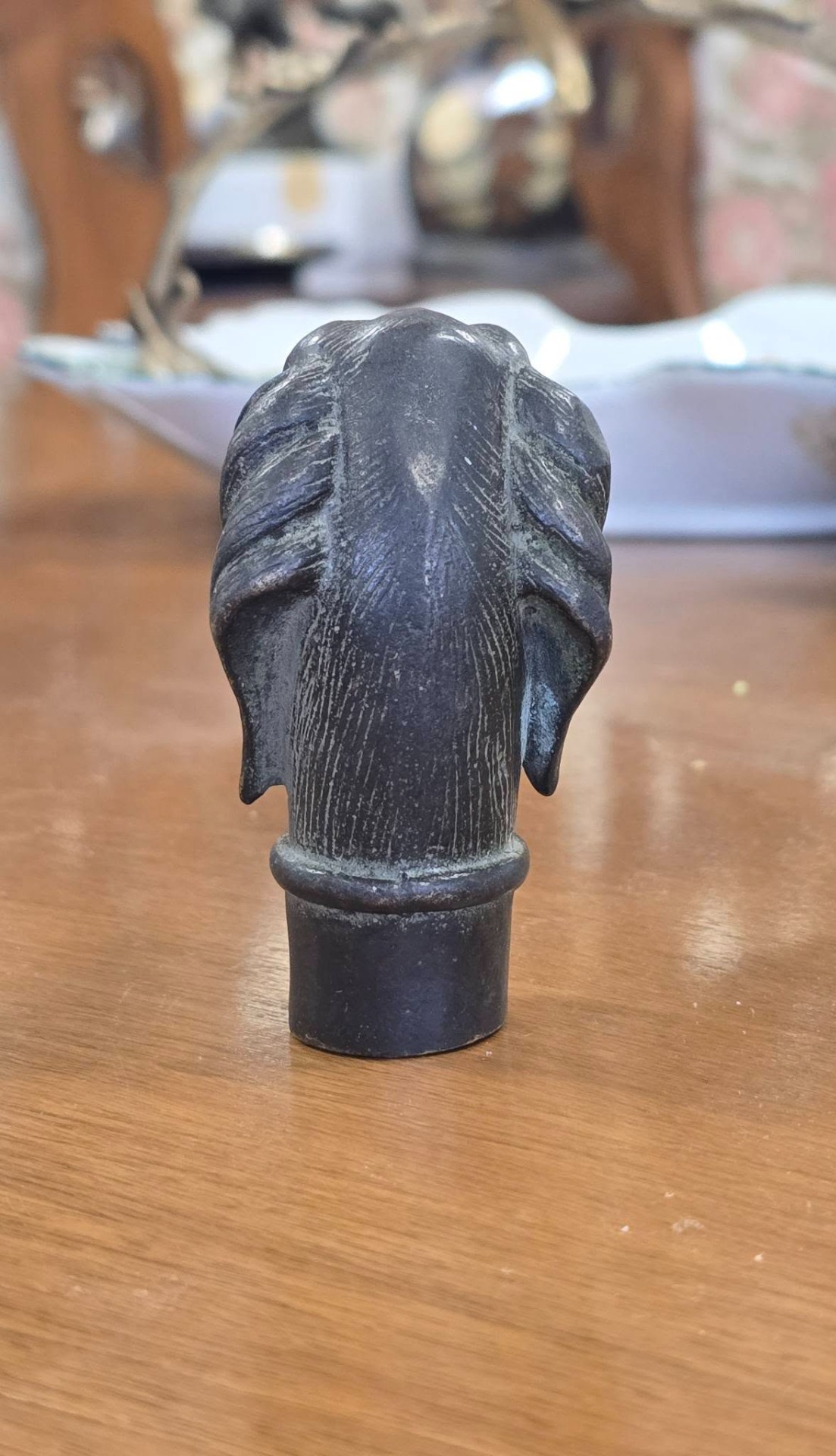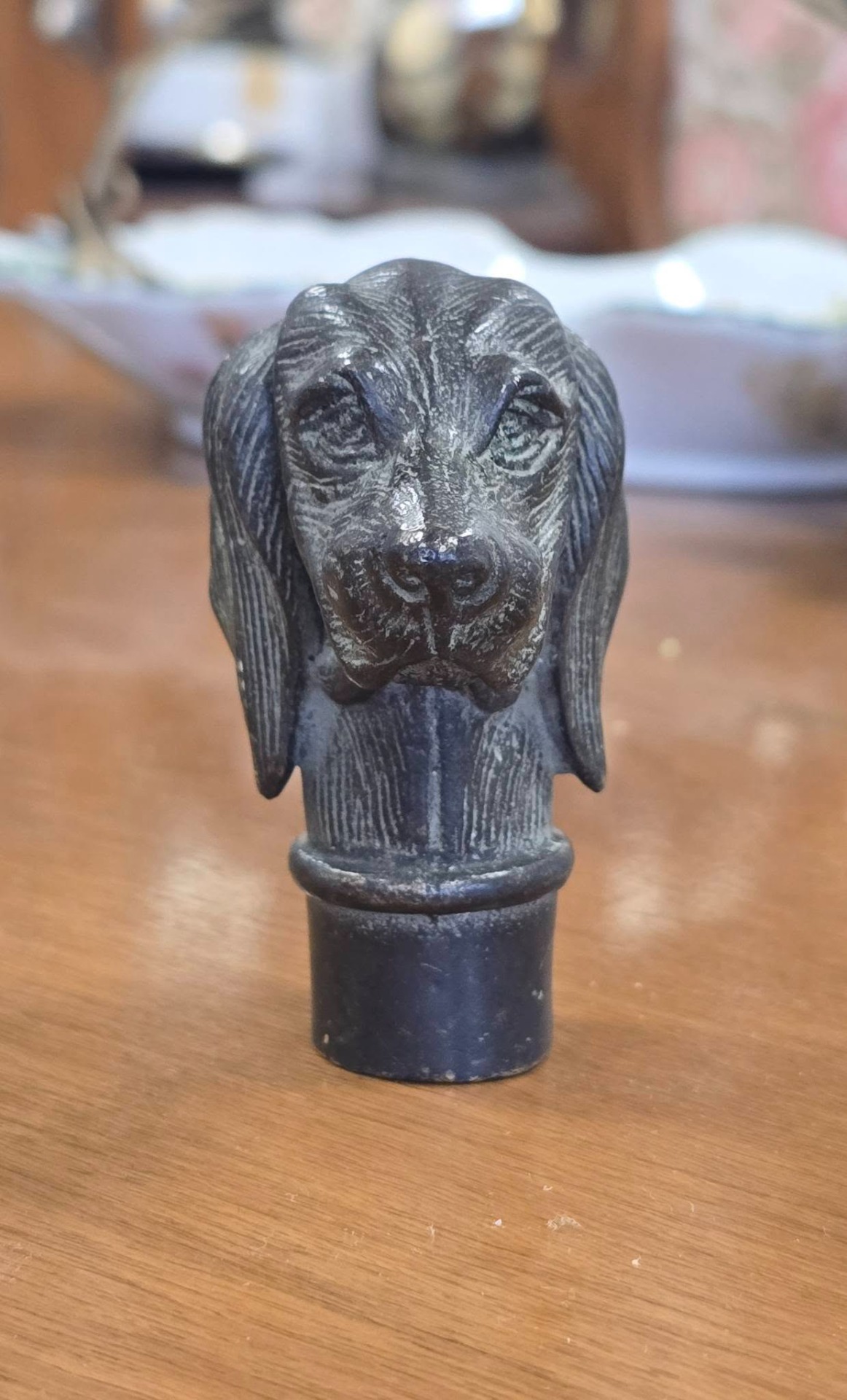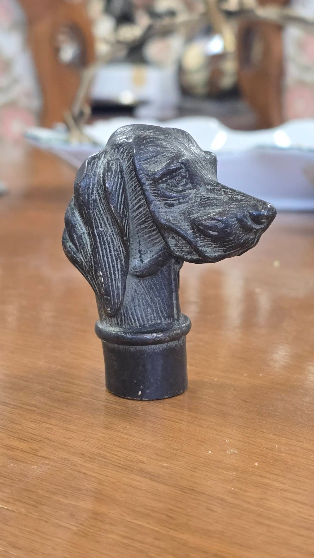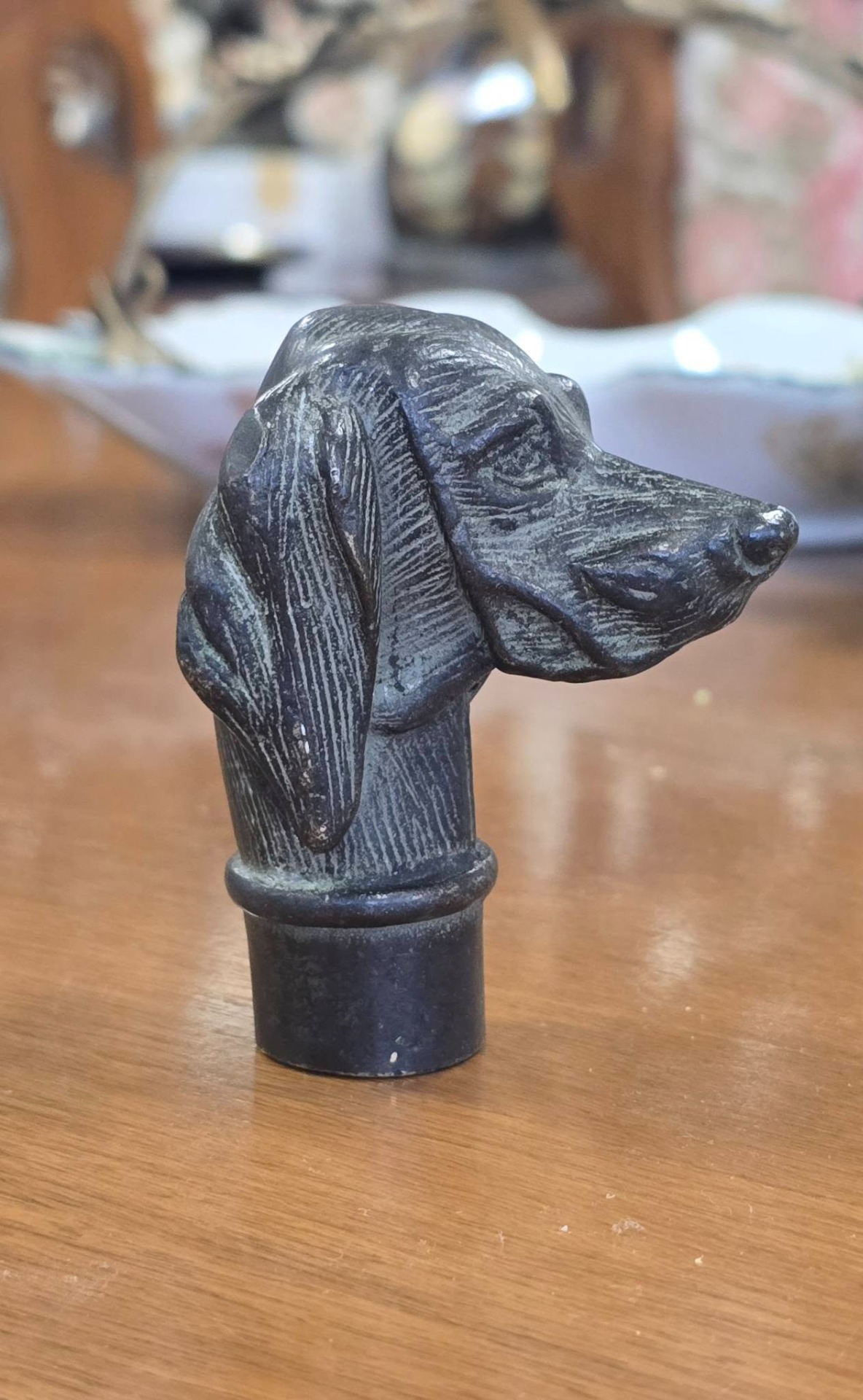 Mâner vechi pentru baston, din bronz patinat, cățel cu detalii frumos lucrate manual, piesă populară în perioada victoriană și edwuardiană (anii 1900-1915).