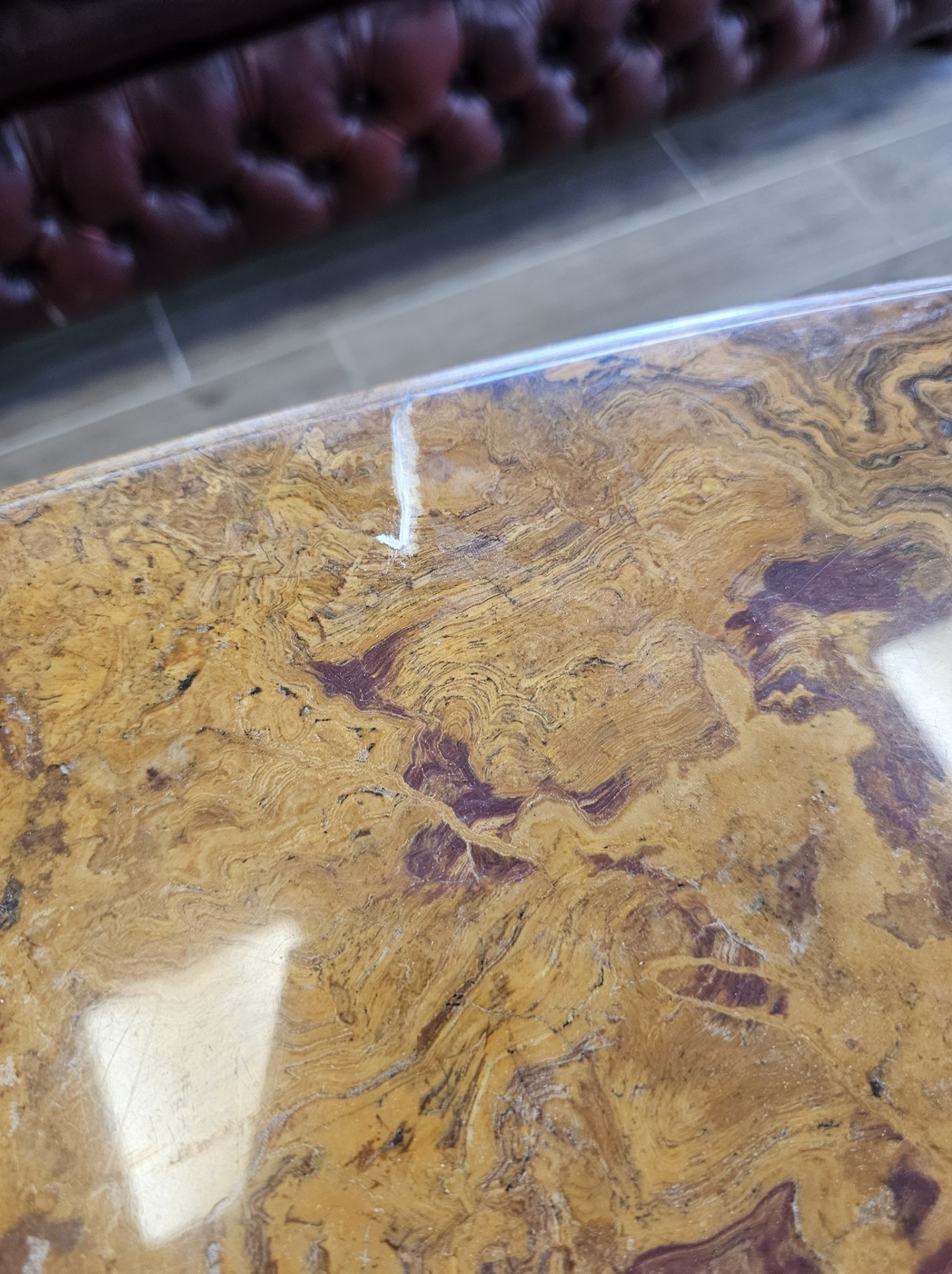 Blat din marmură naturală cu textură spectaculoasă în tonuri de maro, auriu și roșcat, cu finisaj lucios.