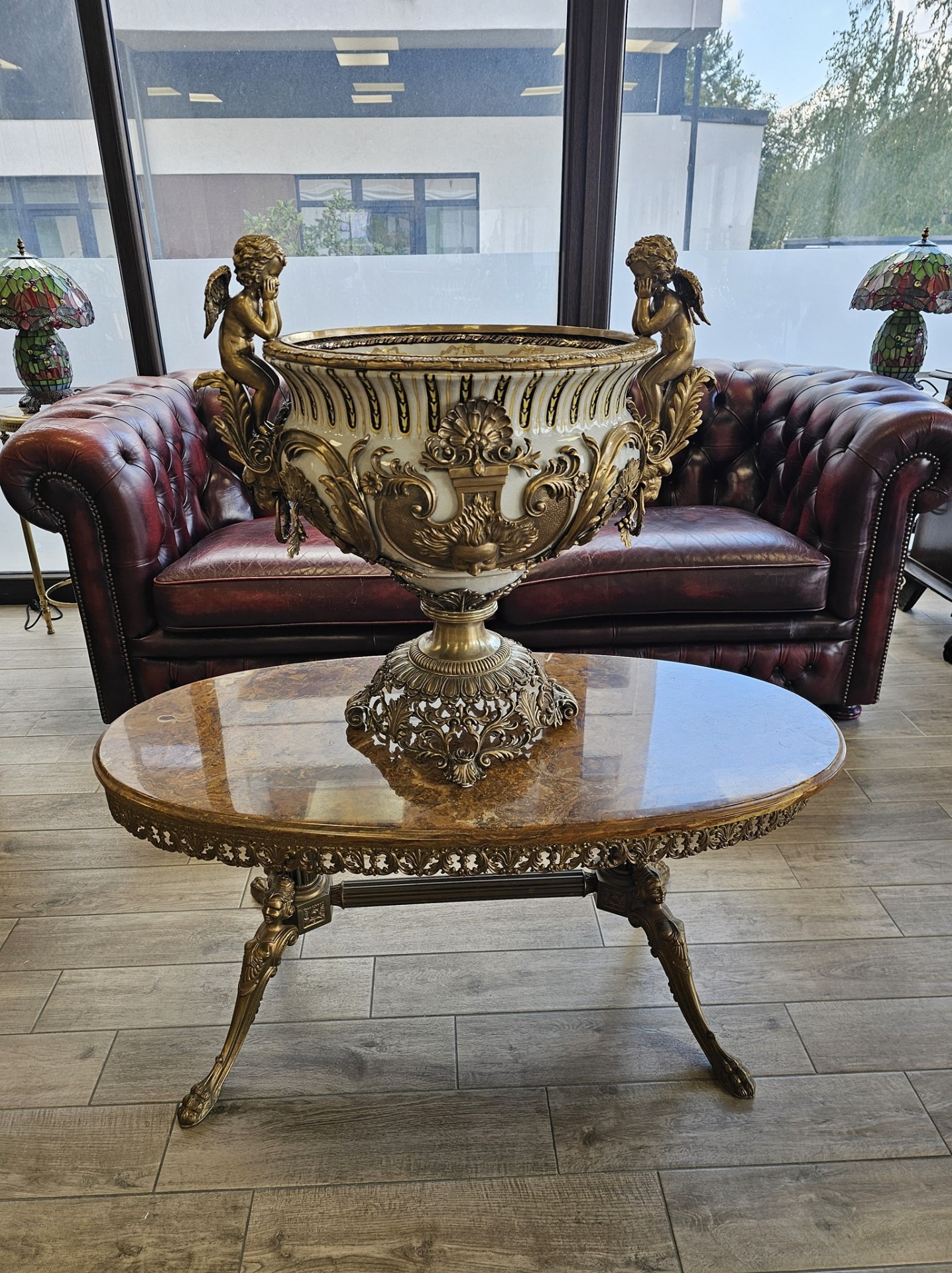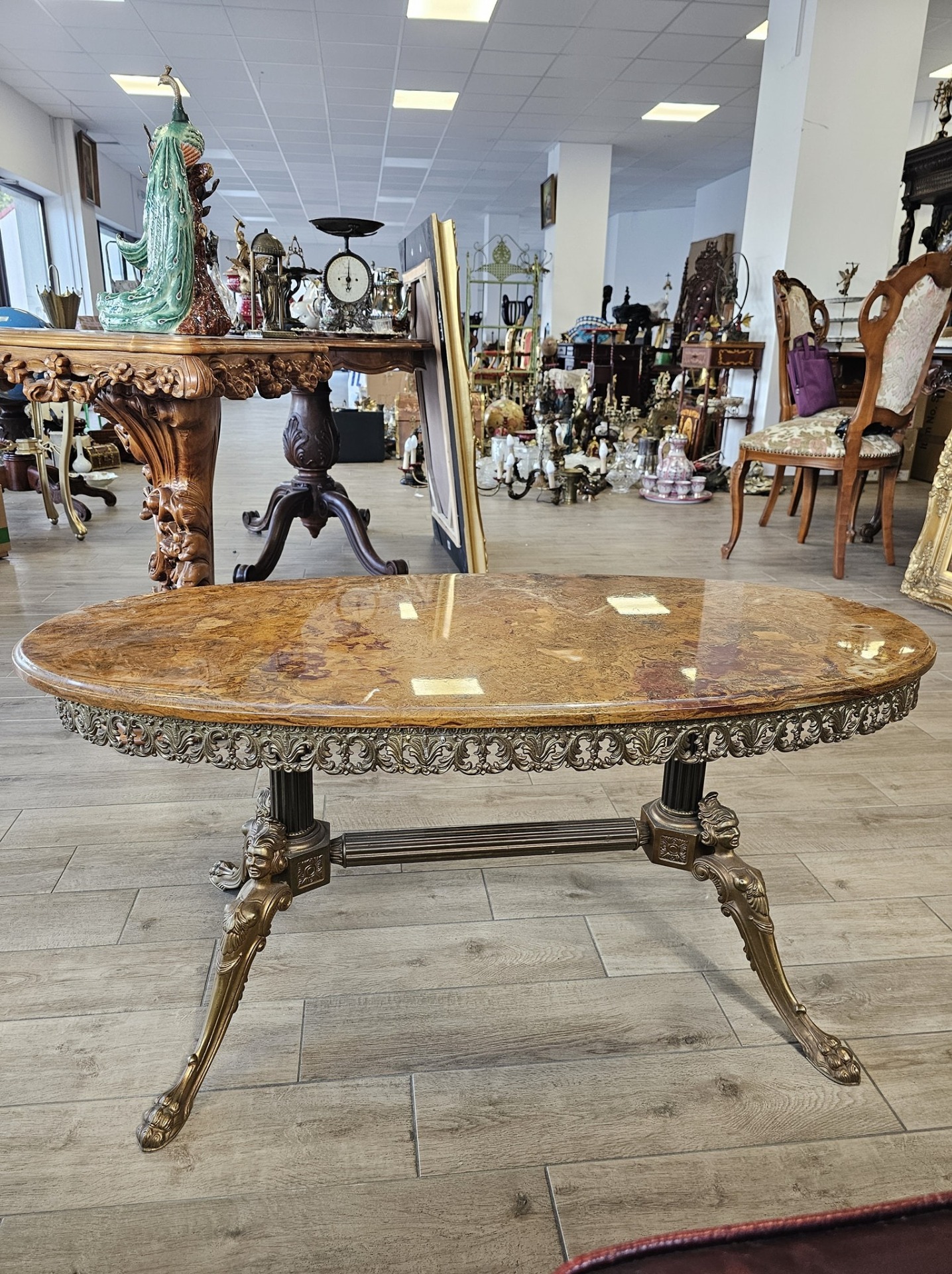 Masă grea, solidă, cu patină autentică, ideală ca masă de salon, masă de cafea sau piesă centrală într-un decor clasic și rafinat.