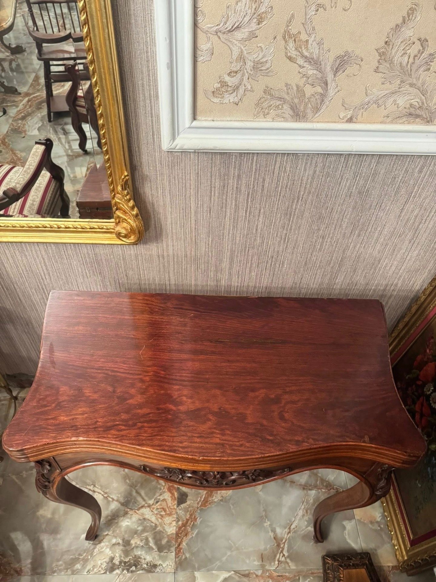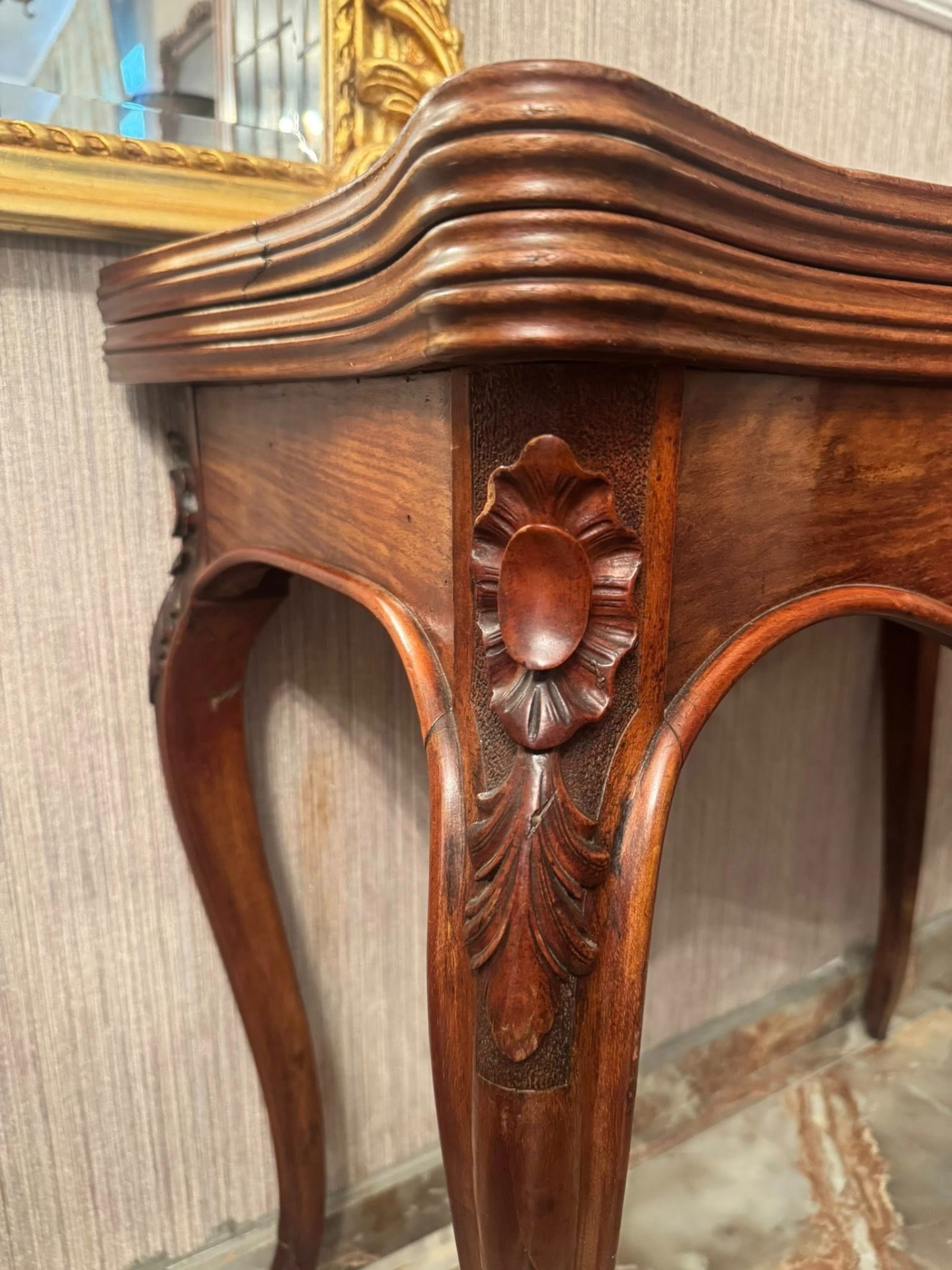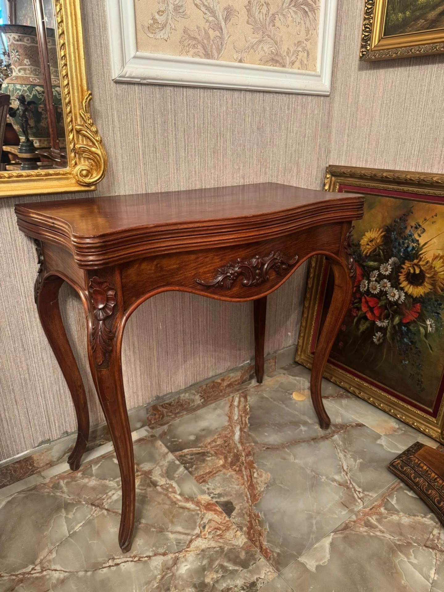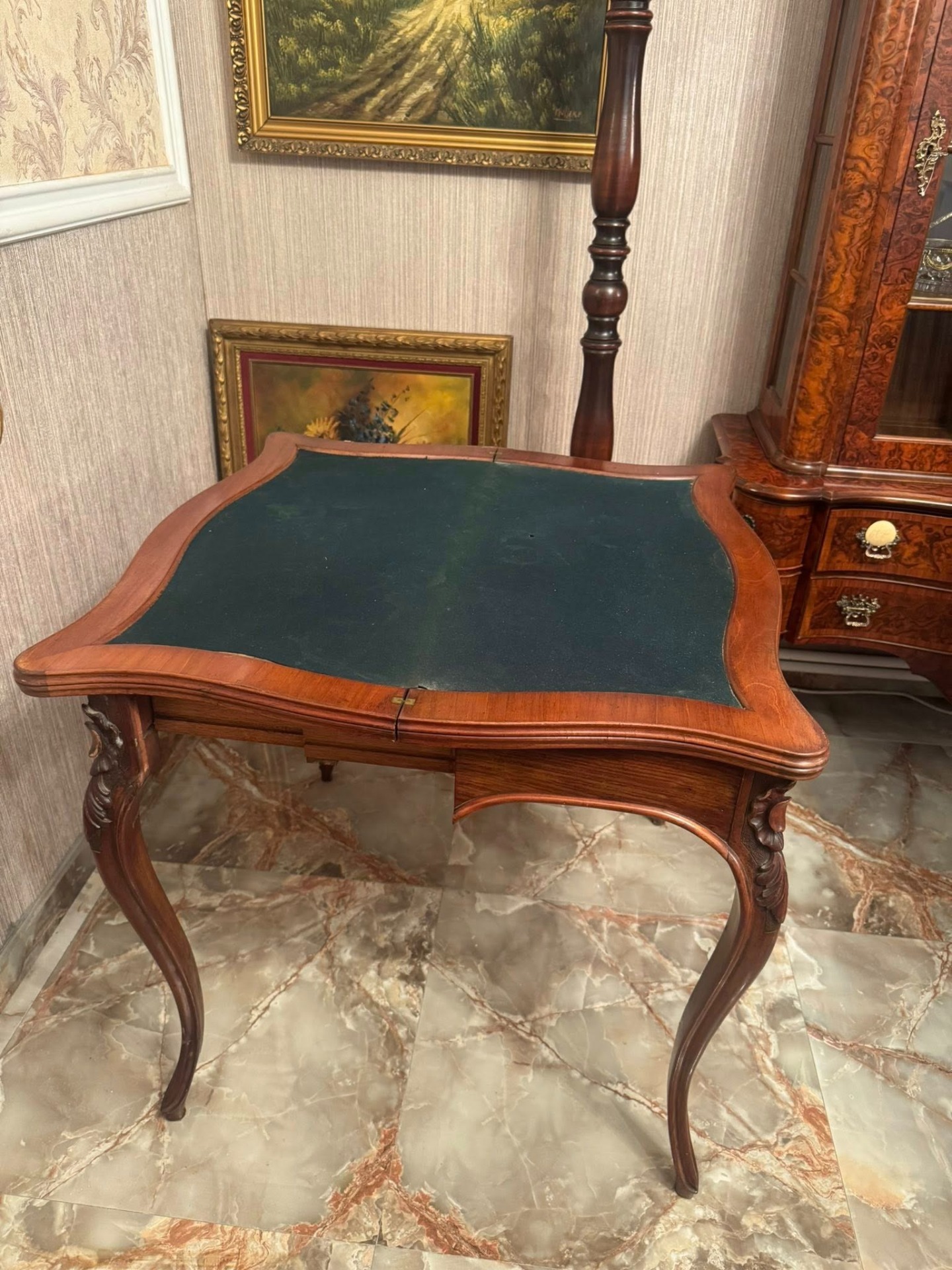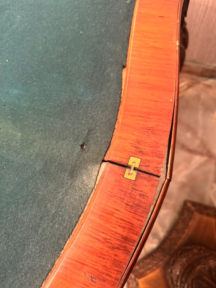 Elegantă și rafinată, această consolă din lemn masiv se deschide și devine o masă de joc sau de servit, cu interior tapițat cu postav verde. O piesă versatilă și prețioasă, ideală pentru interioare clasice sau colecții de mobilier de epocă.