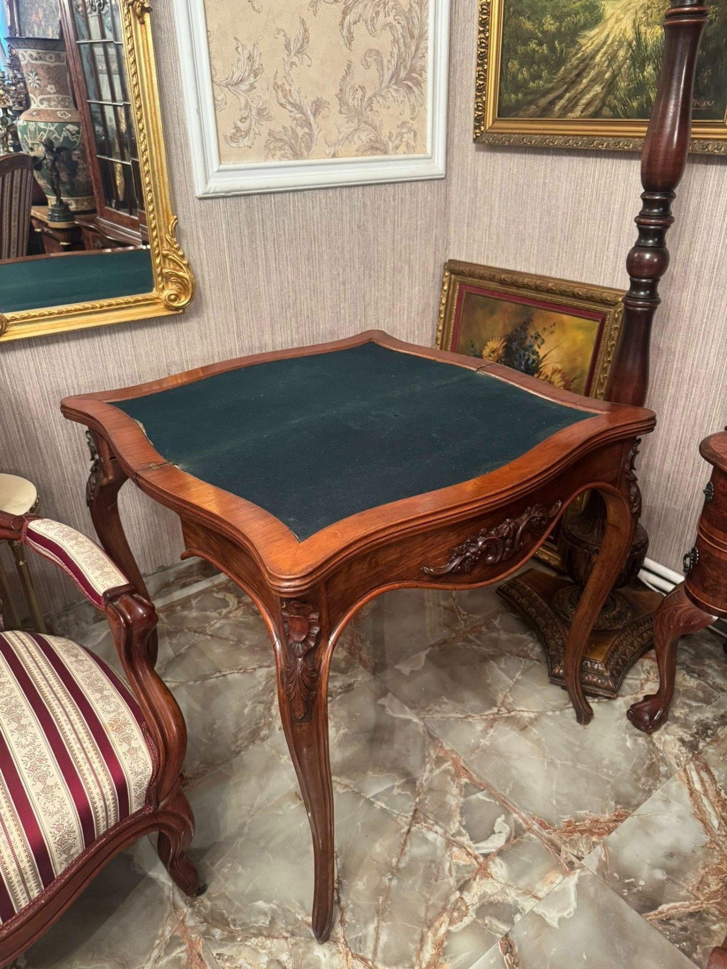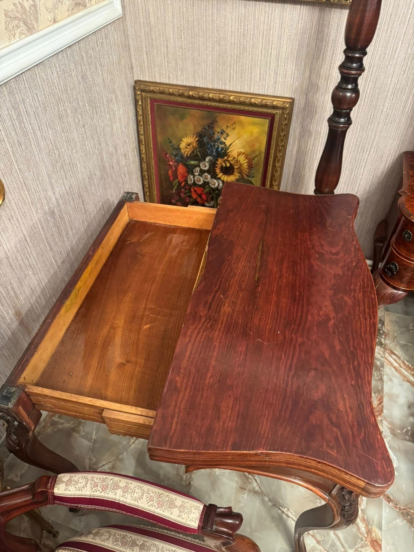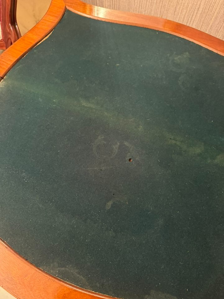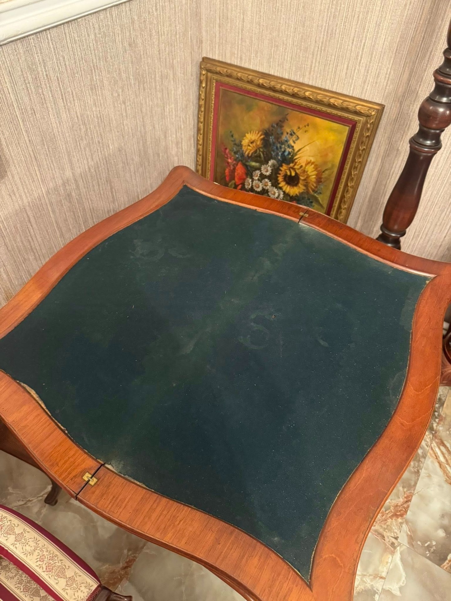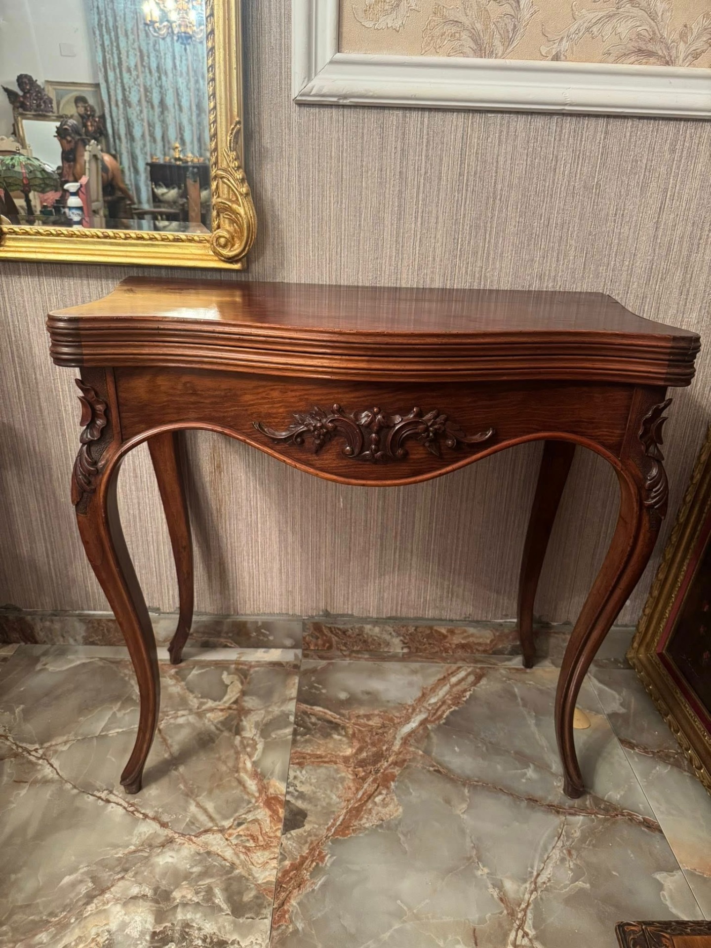 Elegantă și rafinată, această consolă din lemn masiv se deschide și devine o masă de joc sau de servit, cu interior tapițat cu postav verde. O piesă versatilă și prețioasă, ideală pentru interioare clasice sau colecții de mobilier de epocă.