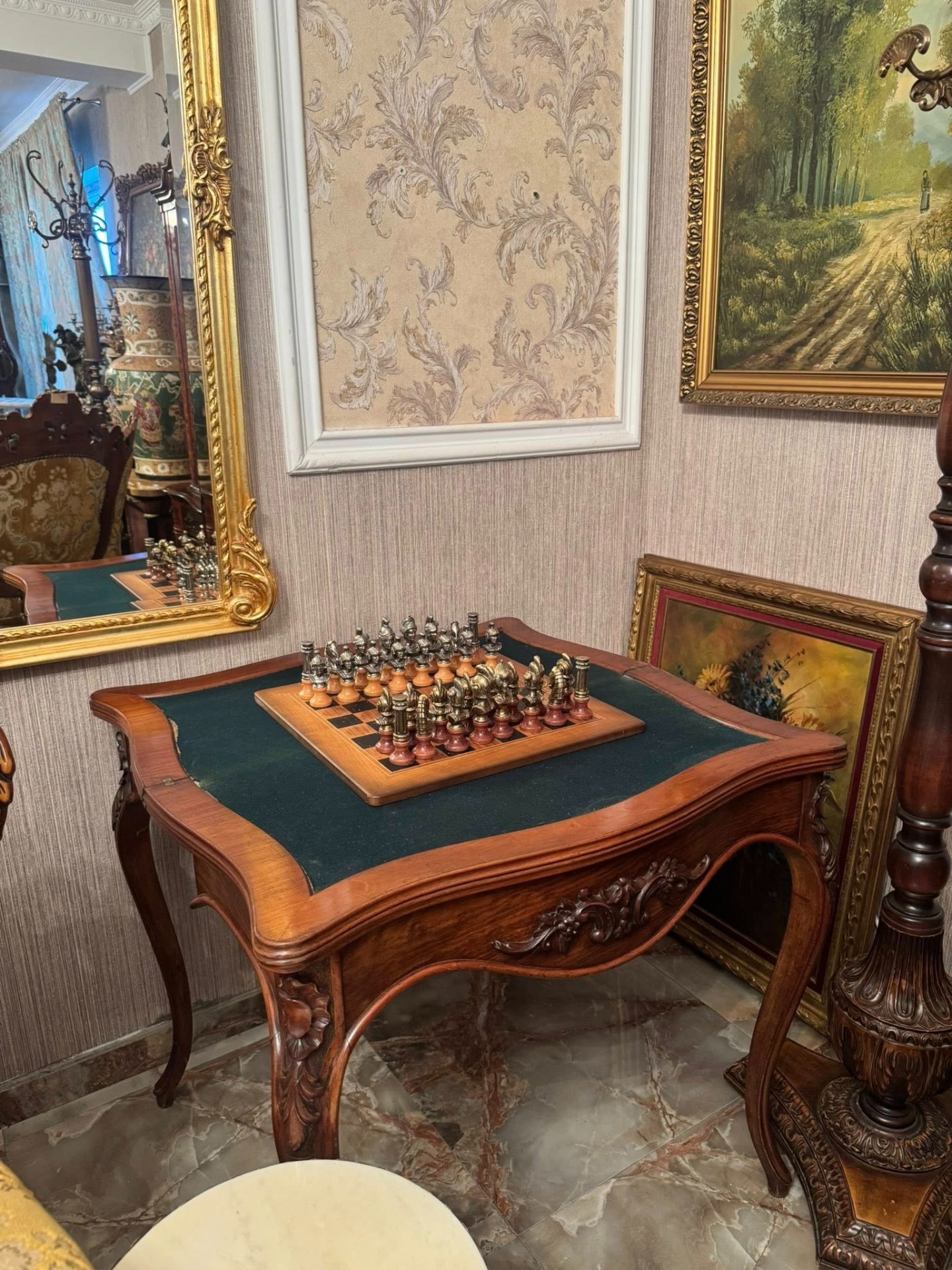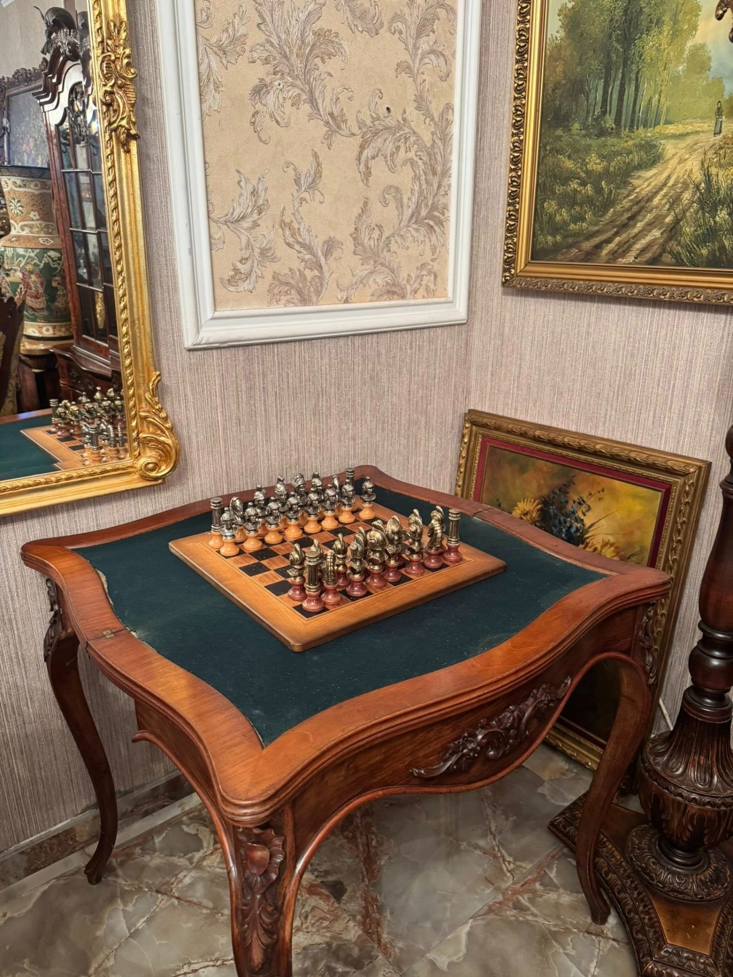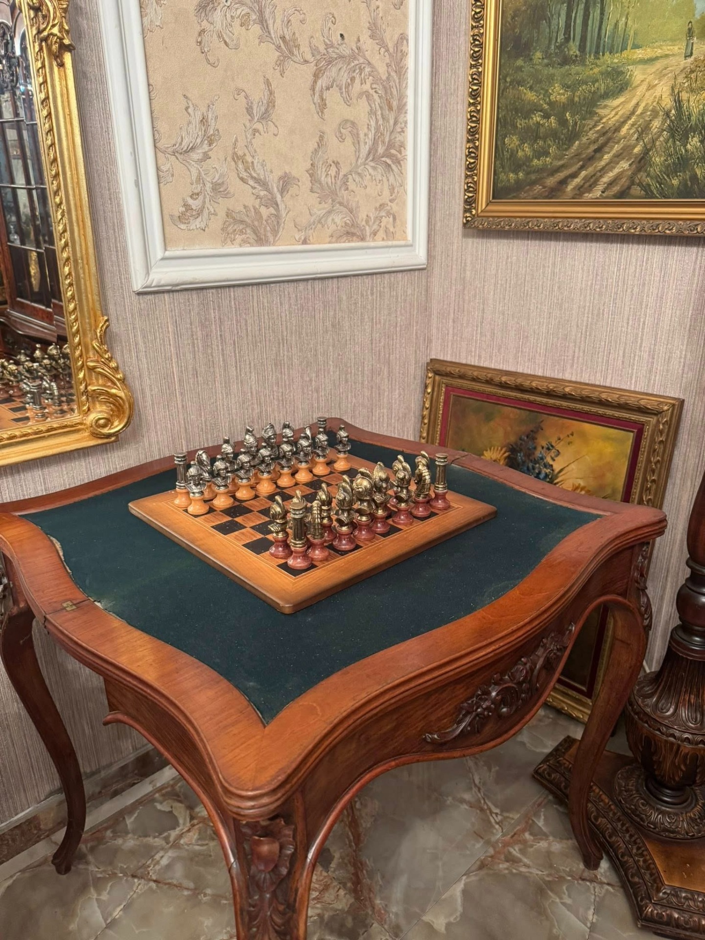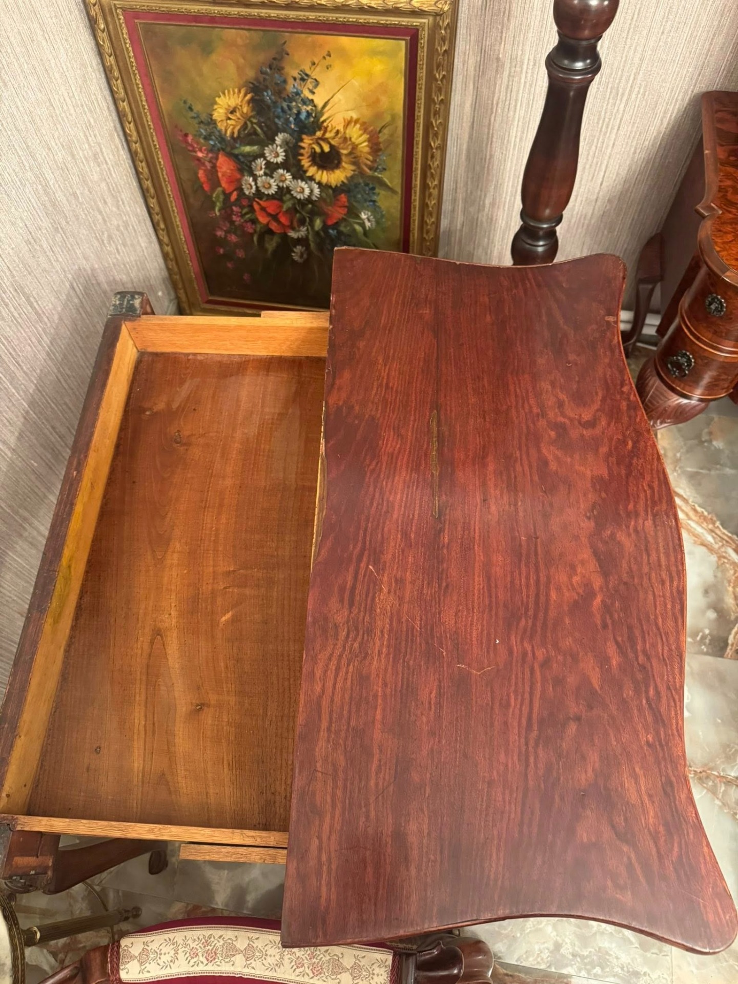 Elegantă și rafinată, această consolă din lemn masiv se deschide și devine o masă de joc sau de servit, cu interior tapițat cu postav verde. O piesă versatilă și prețioasă, ideală pentru interioare clasice sau colecții de mobilier de epocă.