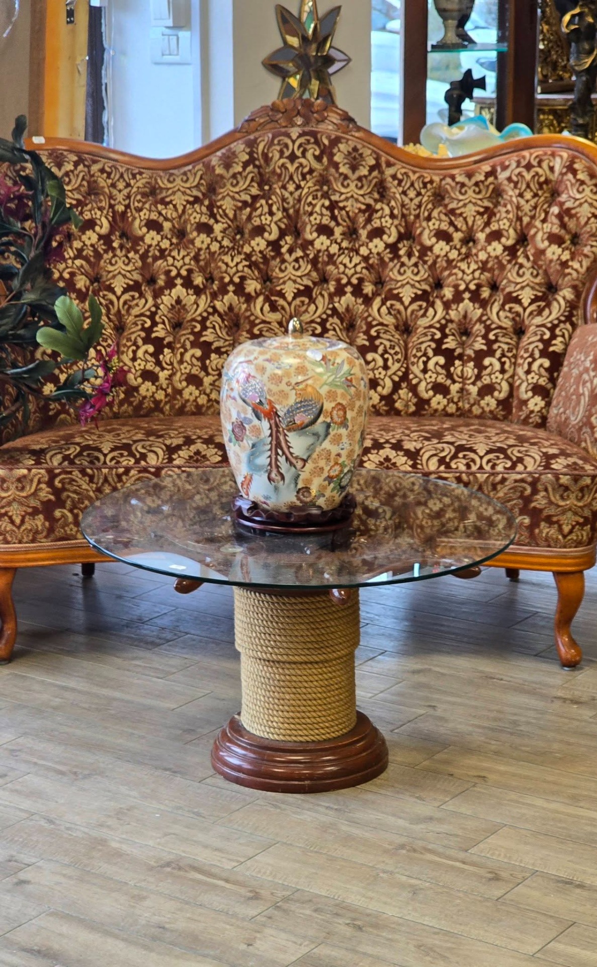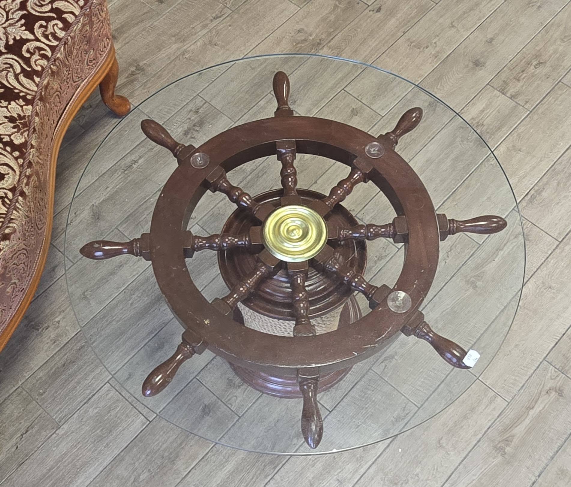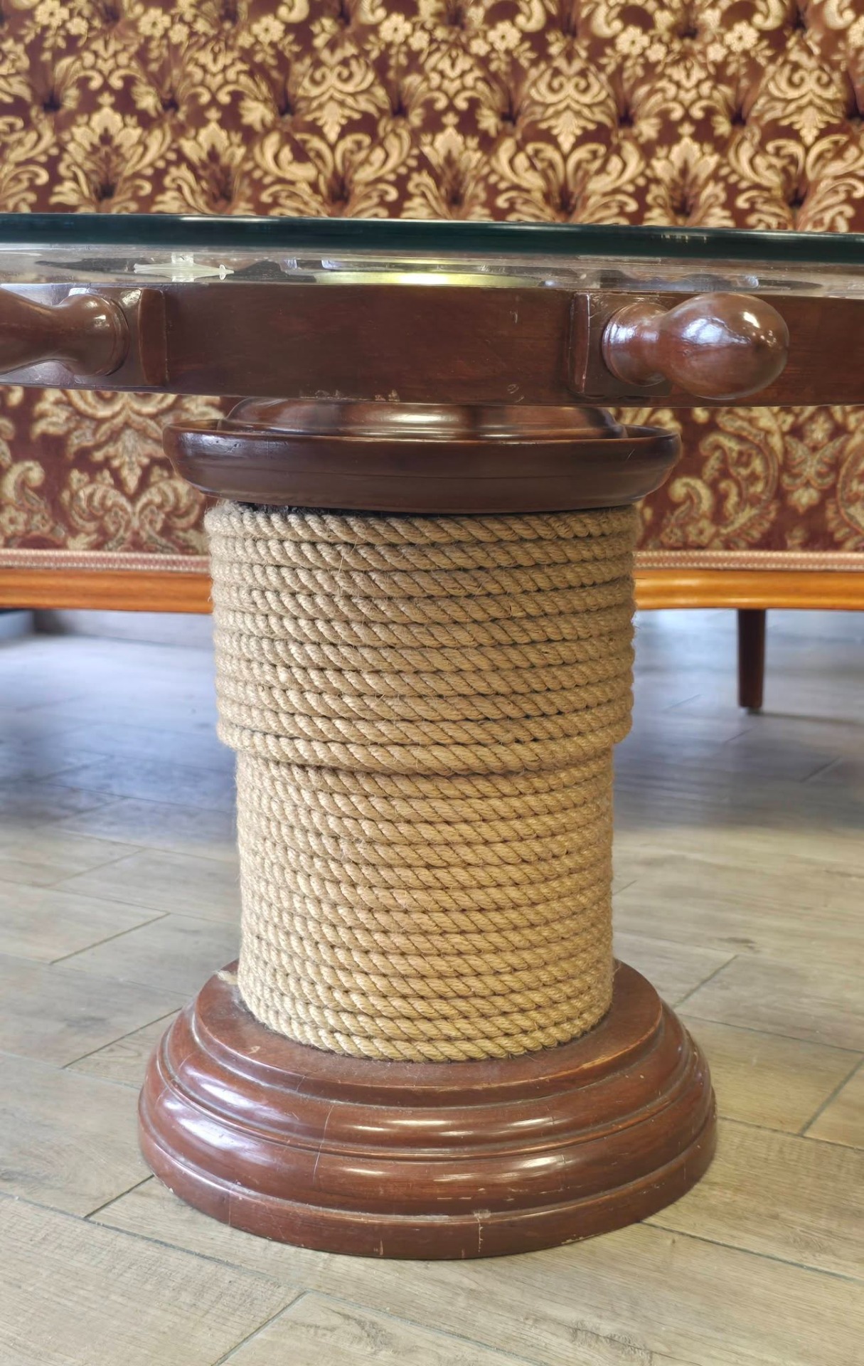 Masă de cafea artizanală, cu design nautic autentic, cu timonă din lemn masiv, blat din sticlă și picior robust, înfășurat manual în frânghie, oferind un aspect marin deosebit.