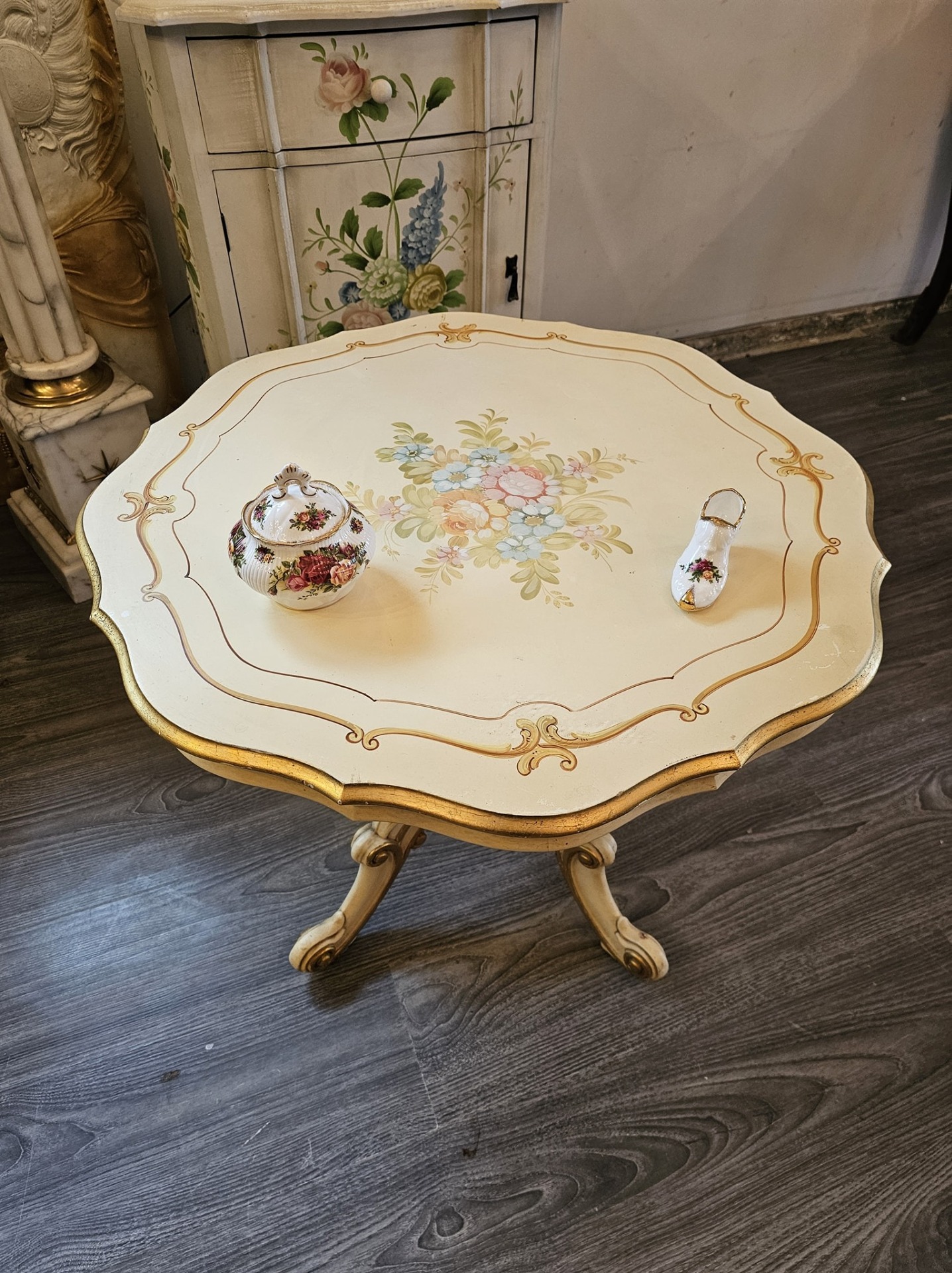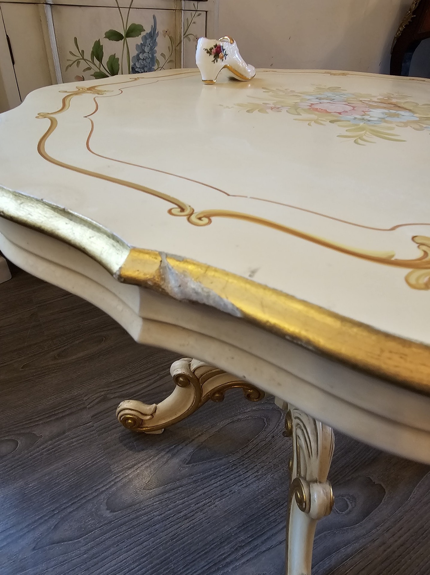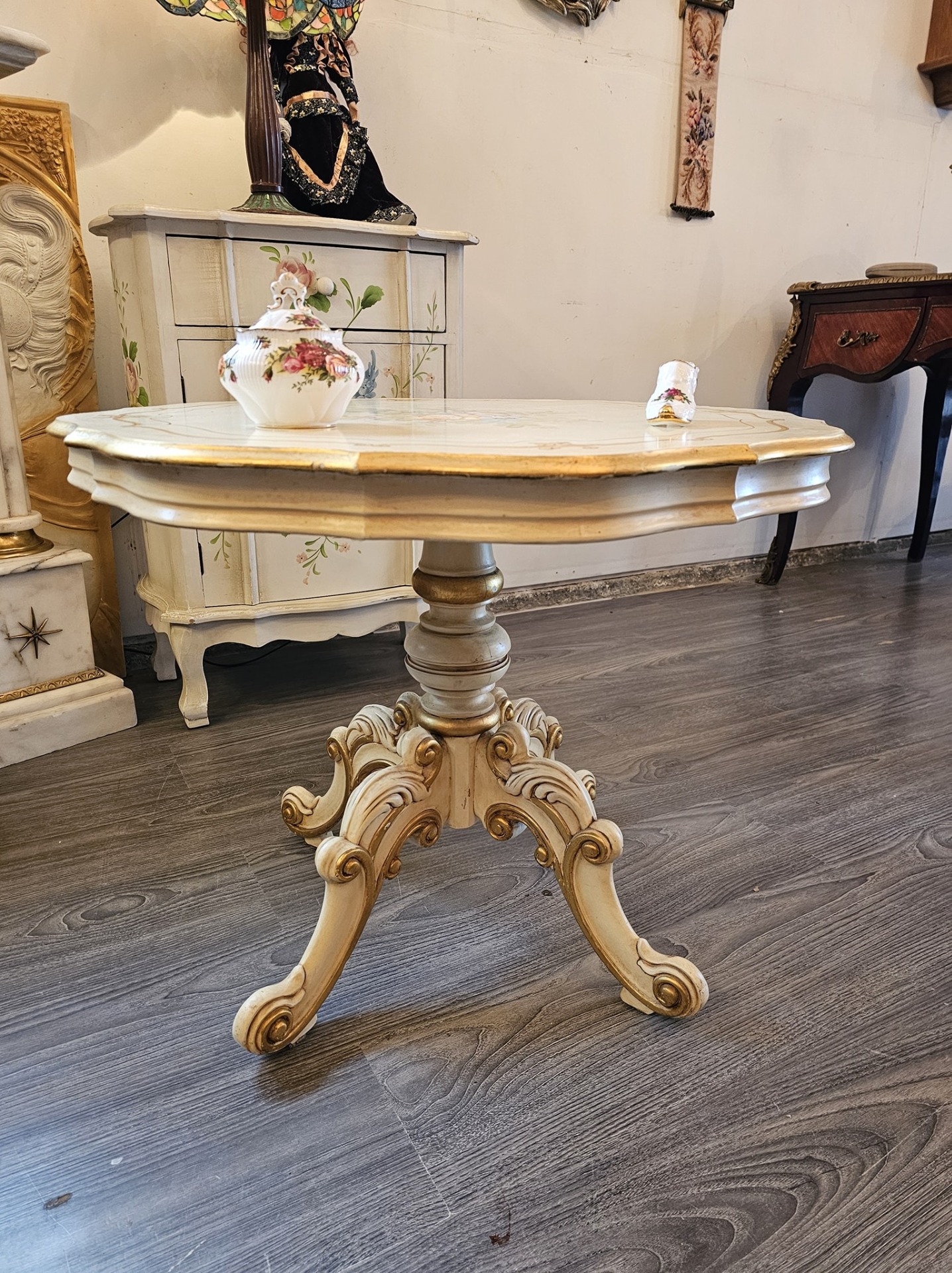 Masă de cafea vintage pictată manual, o piesă deosebită cu farmec romantic și detalii elegante în stil baroc francez. Blatul are margini sculptate, conturate cu