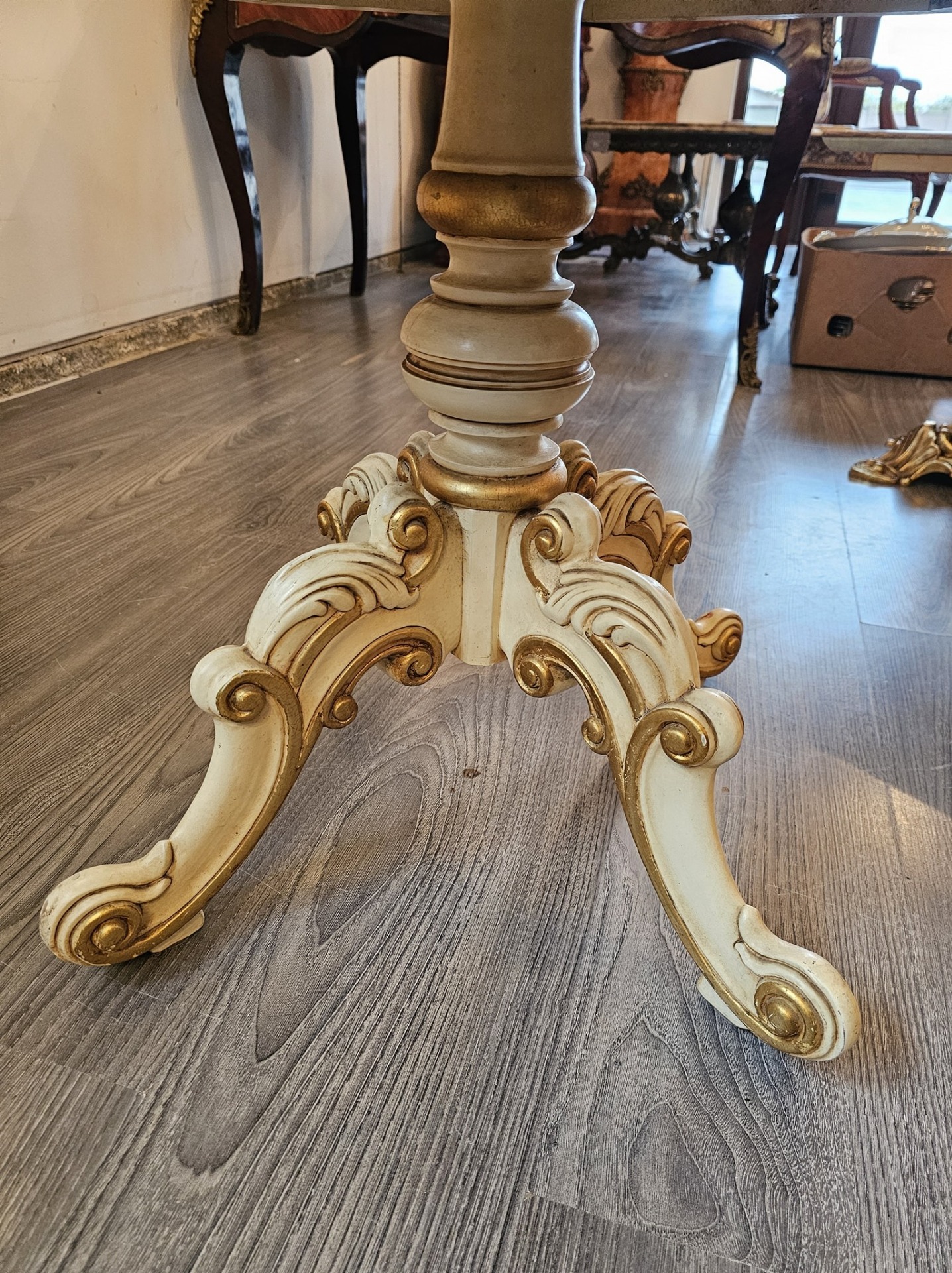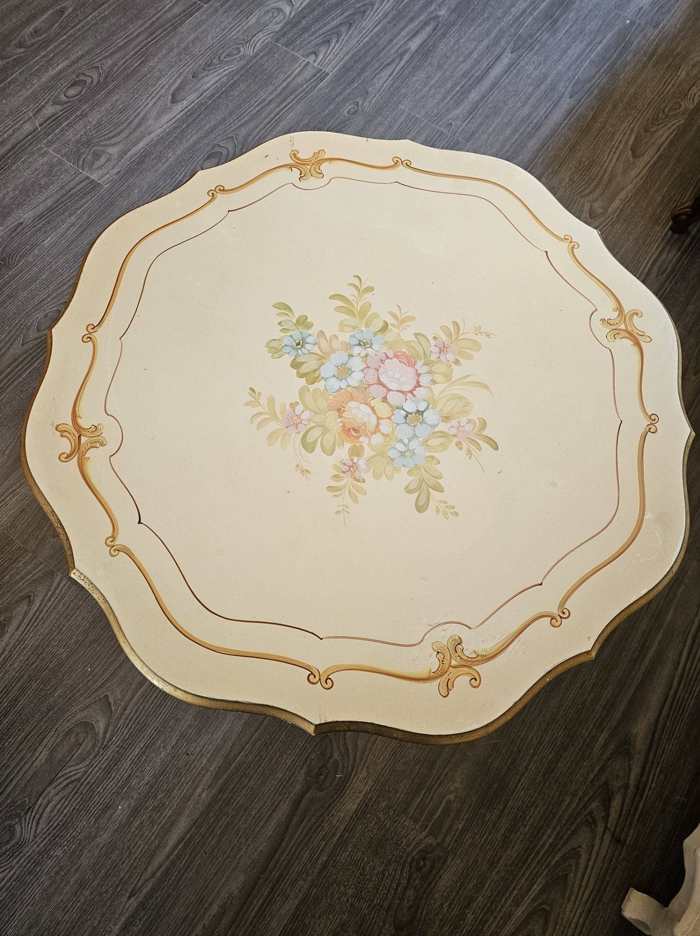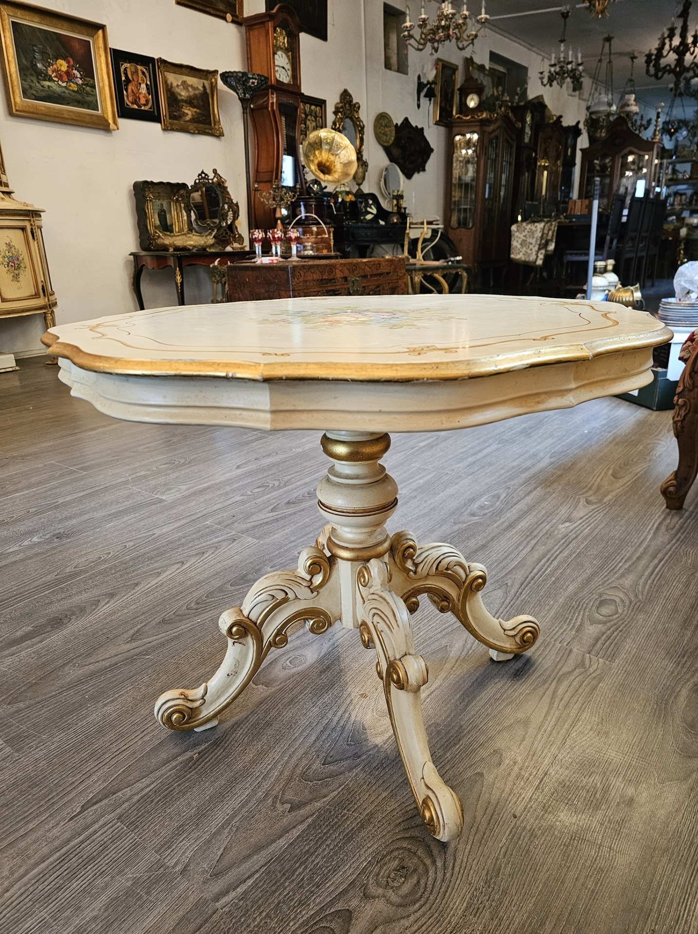 Masă de cafea vintage pictată manual, o piesă deosebită cu farmec romantic și detalii elegante în stil baroc francez. Blatul are margini sculptate, conturate cu