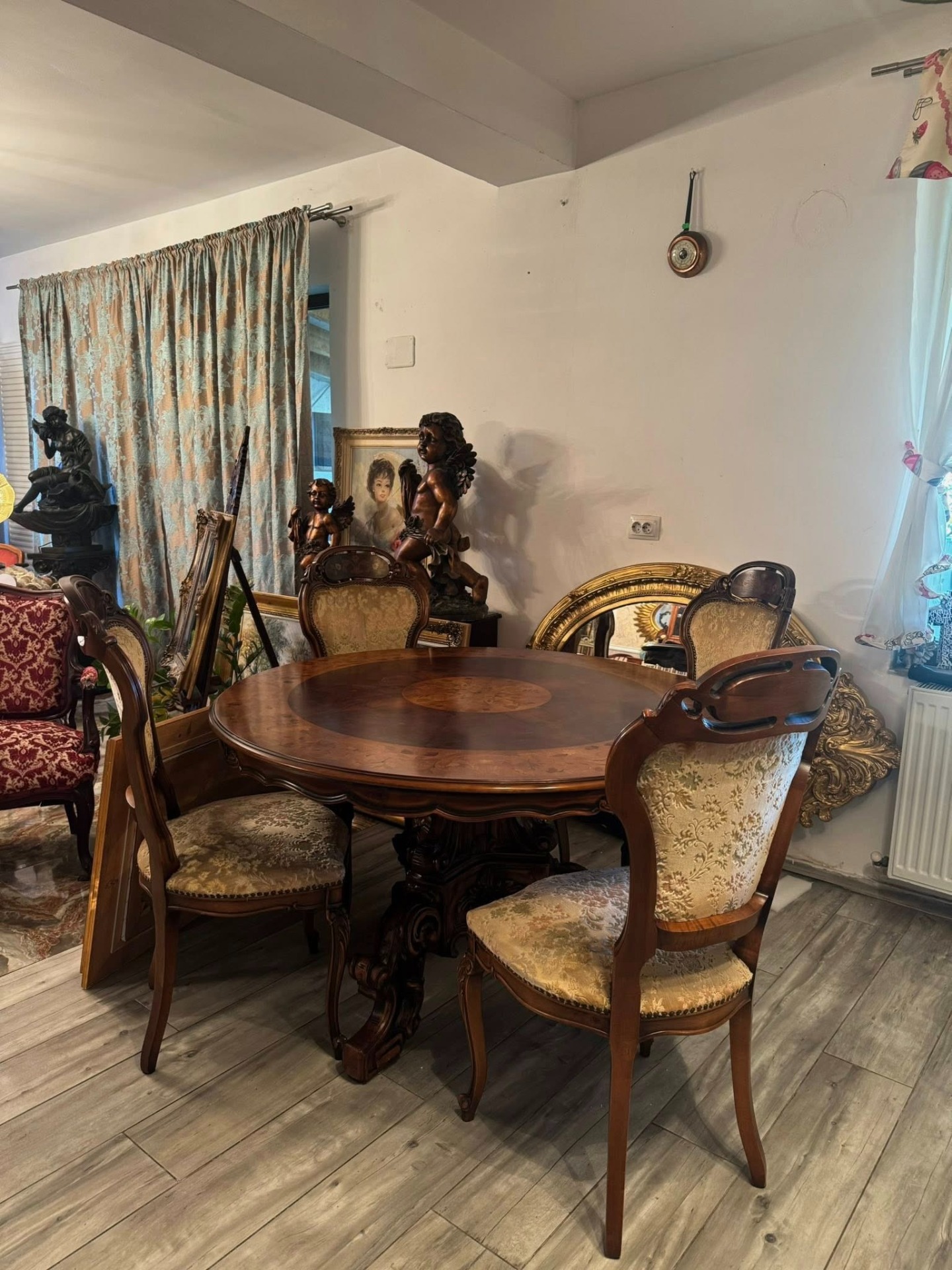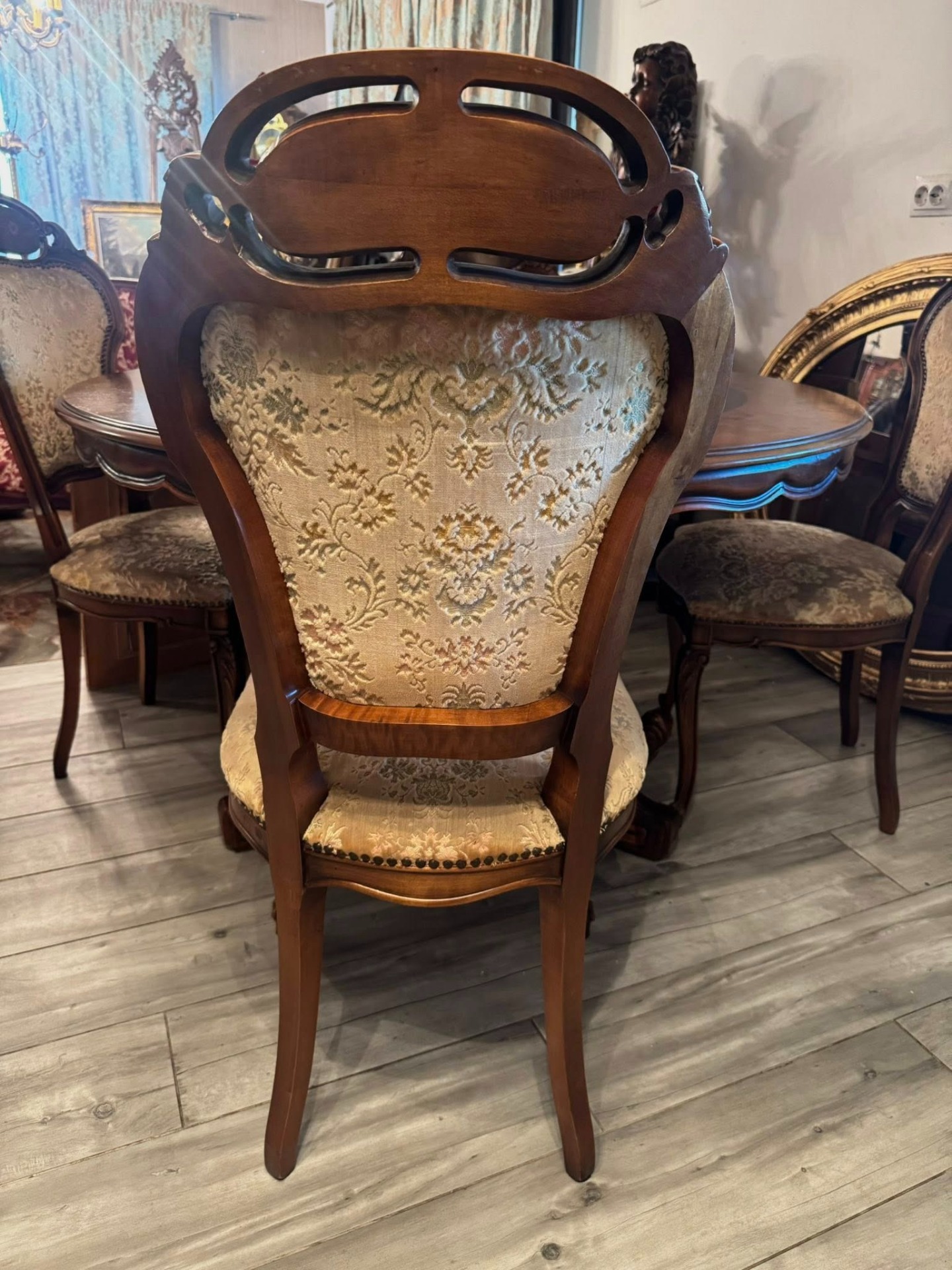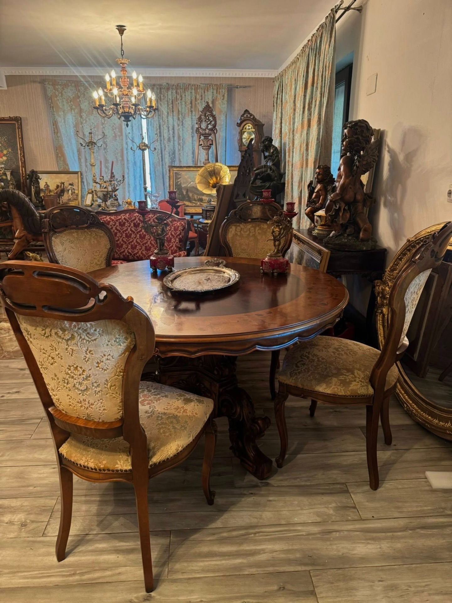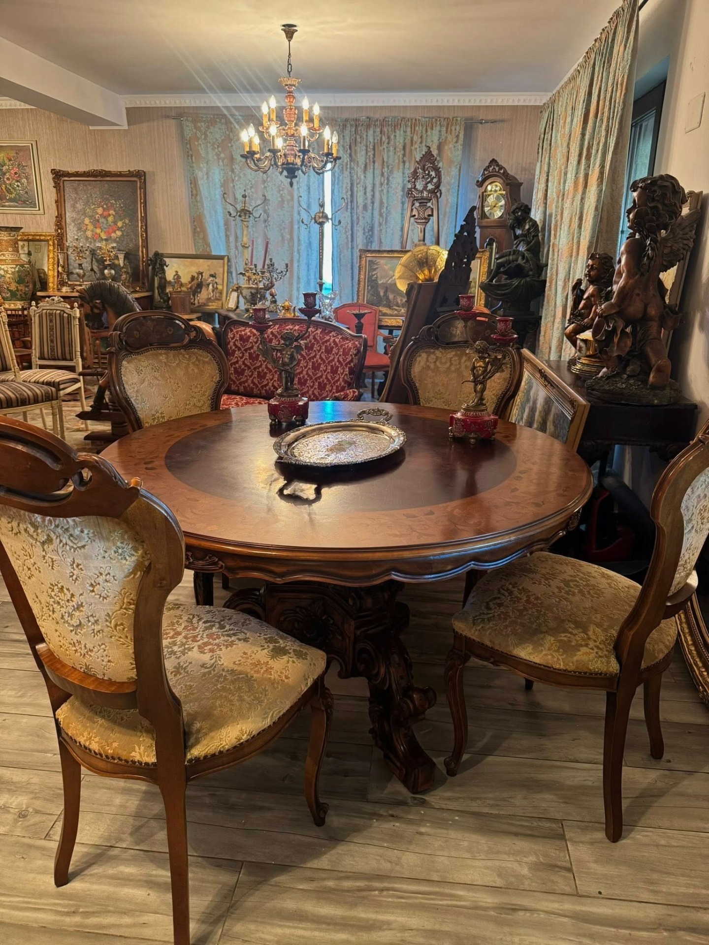 Un set de dining spectaculos, realizat din lemn de înaltă calitate, cu detalii sculptate manual și motive florale elegante. Scaunele sunt tapițate cu material fin, în nuanțe calde, completând perfect masa cu picior central bogat ornamentat.