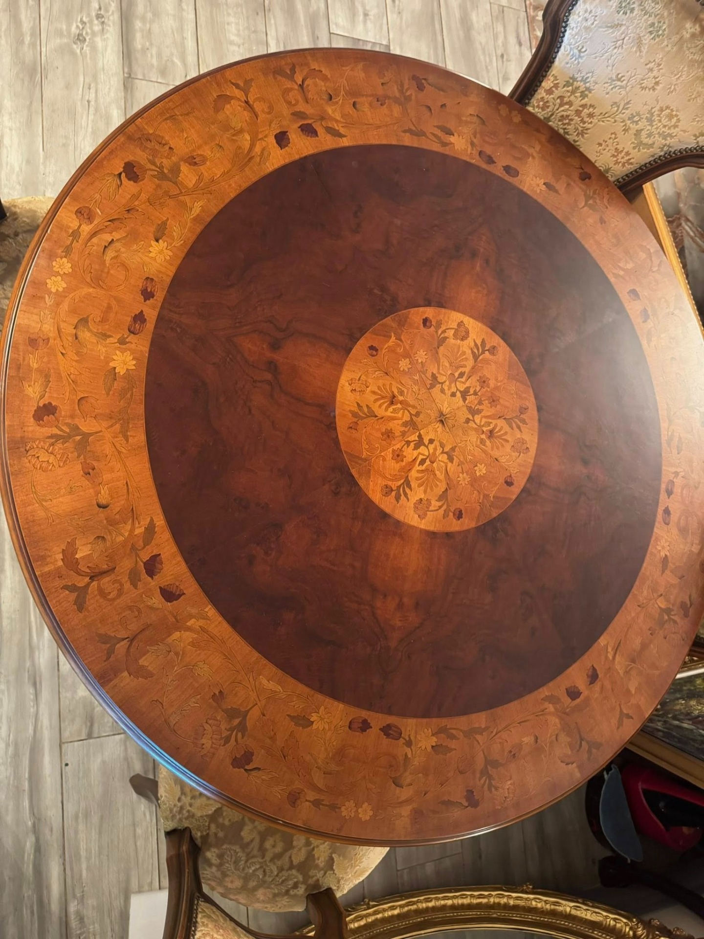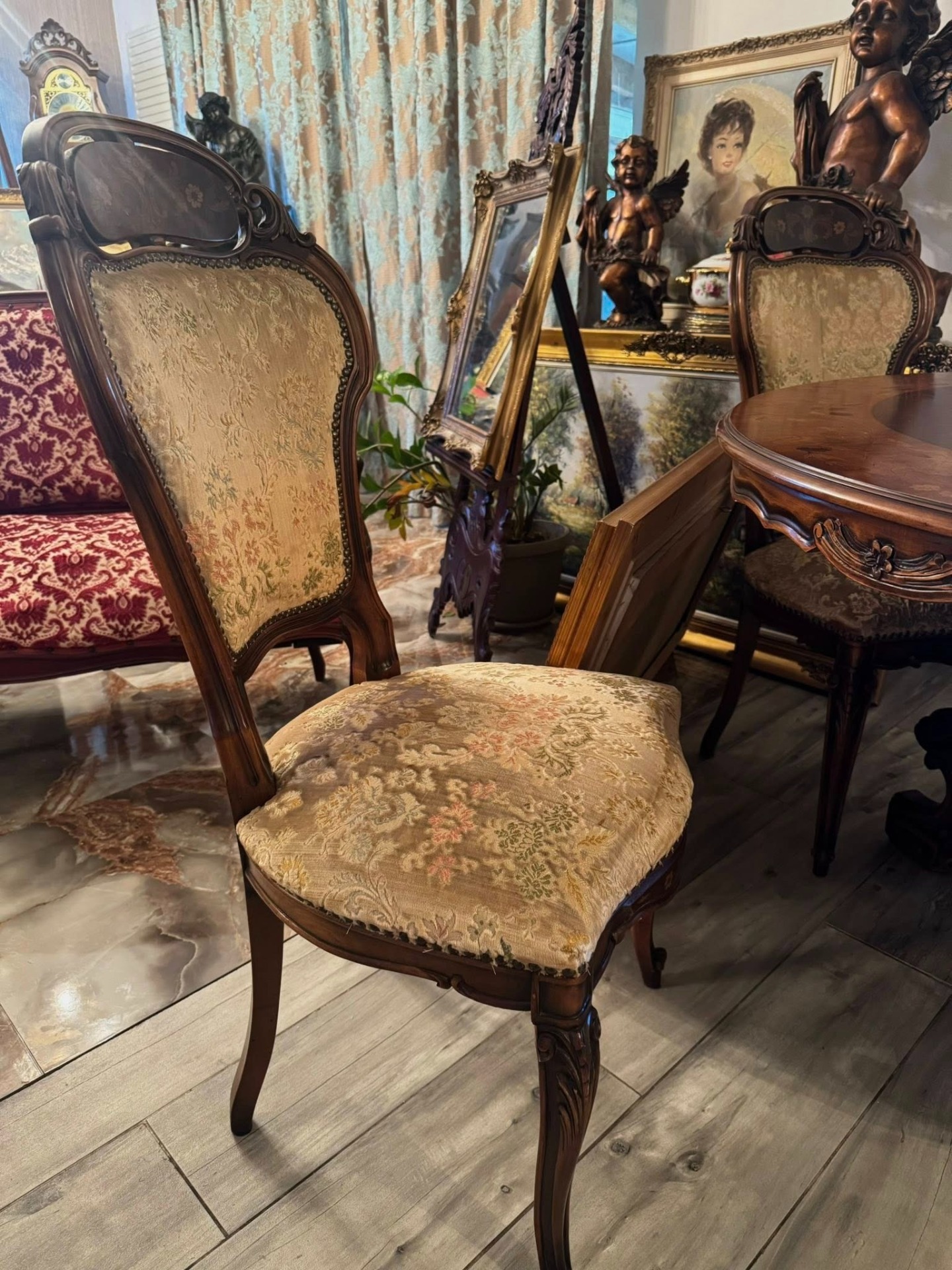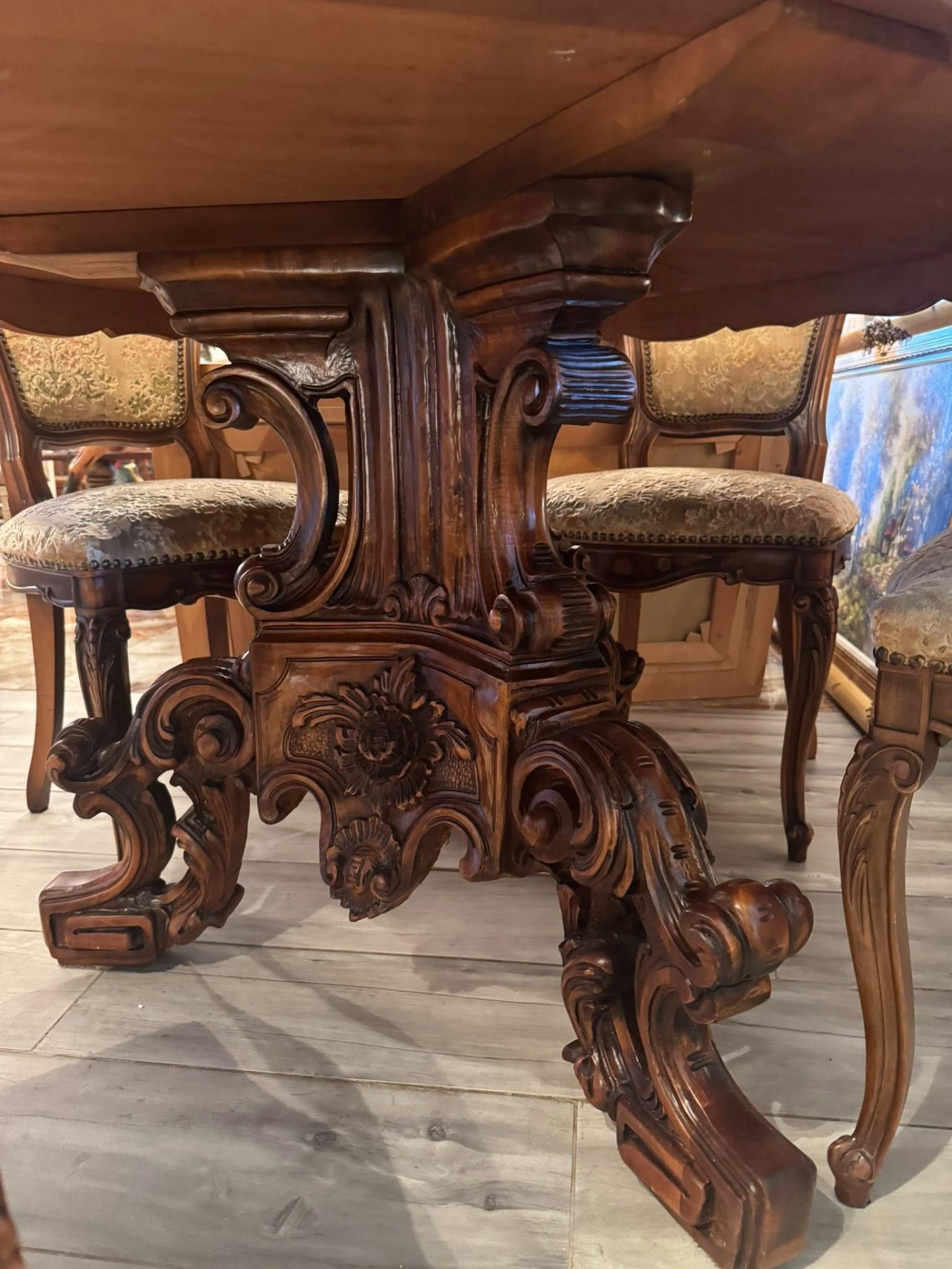 Un set de dining spectaculos, realizat din lemn de înaltă calitate, cu detalii sculptate manual și motive florale elegante. Scaunele sunt tapițate cu material fin, în nuanțe calde, completând perfect masa cu picior central bogat ornamentat.