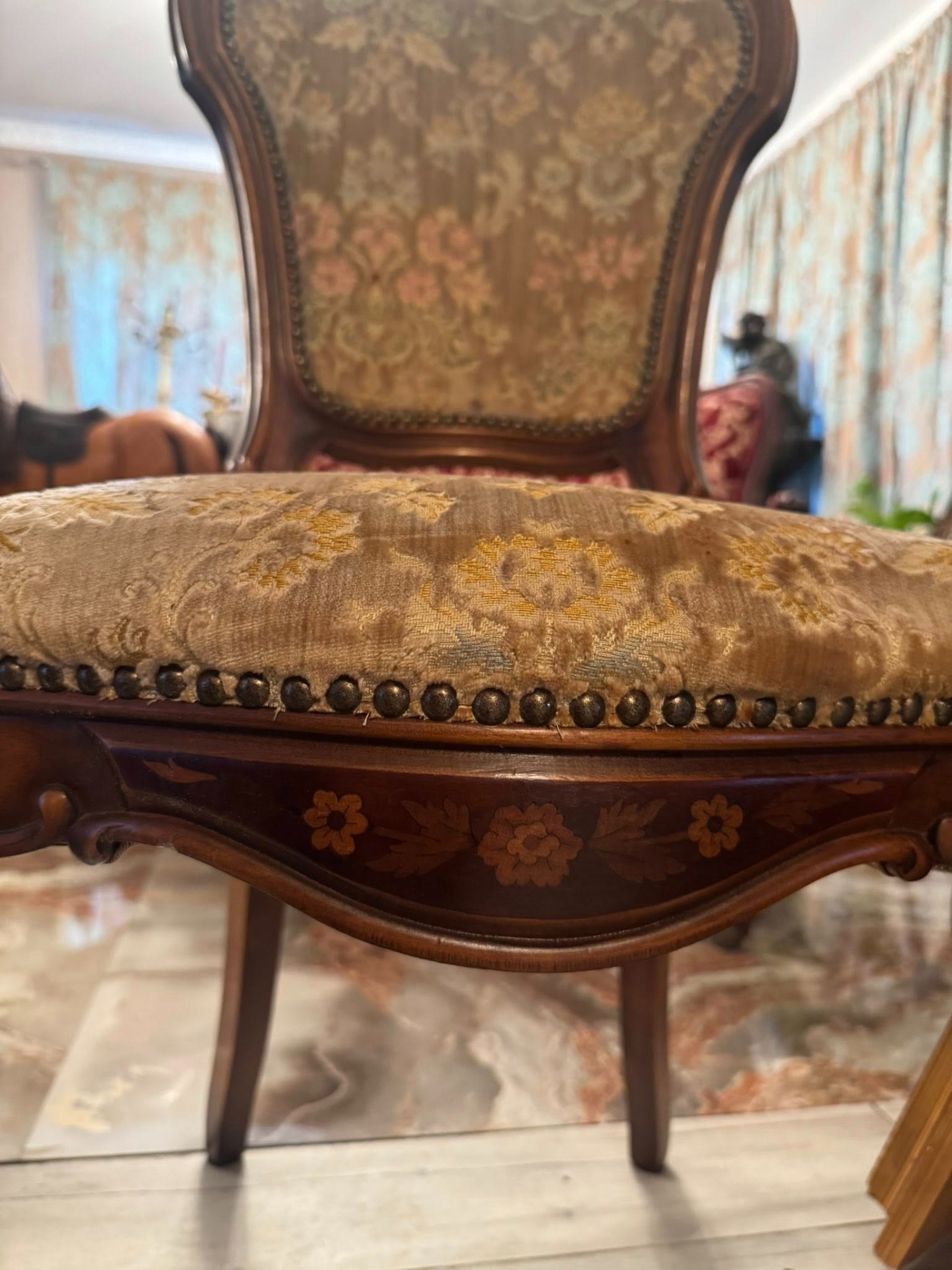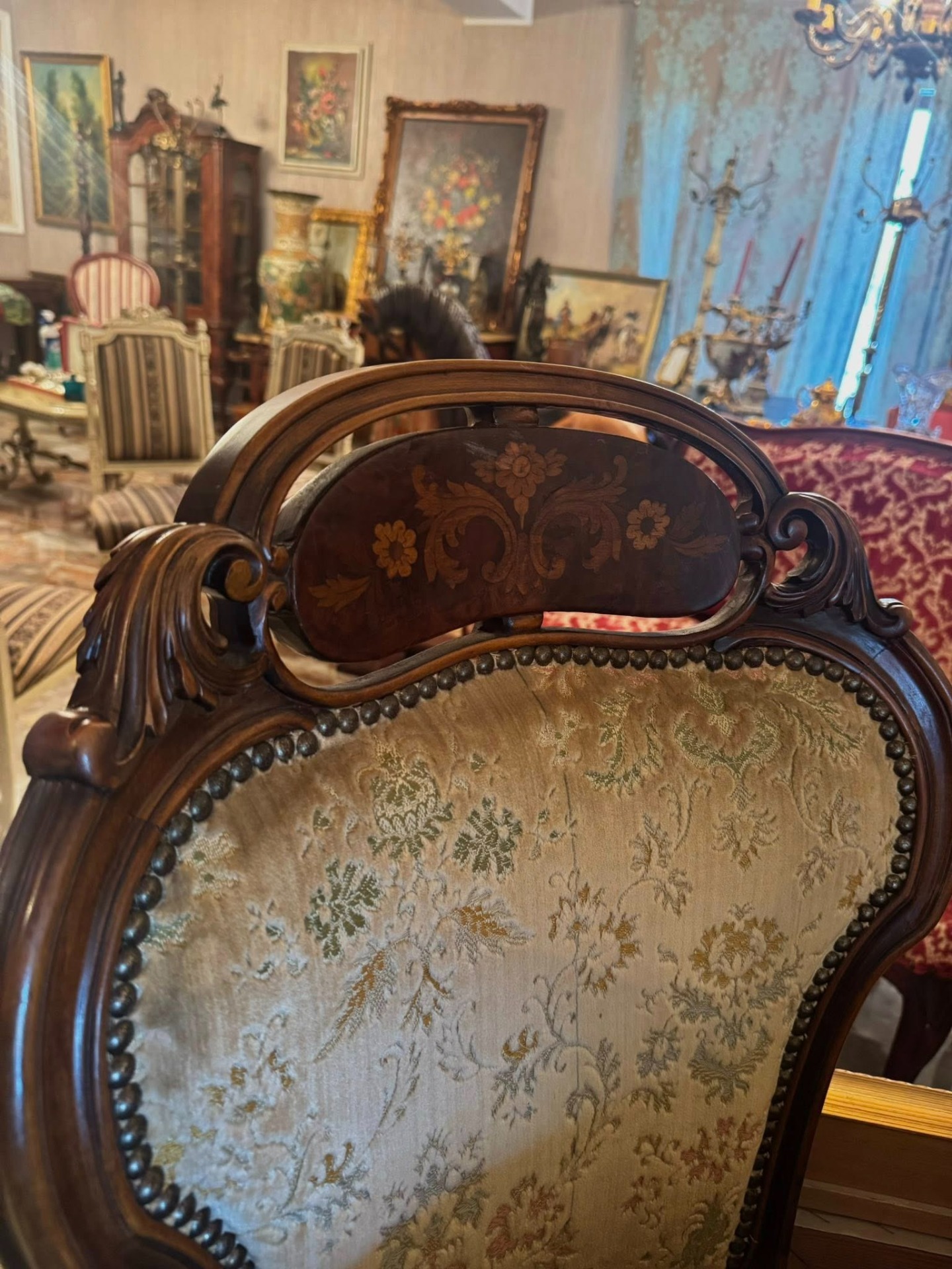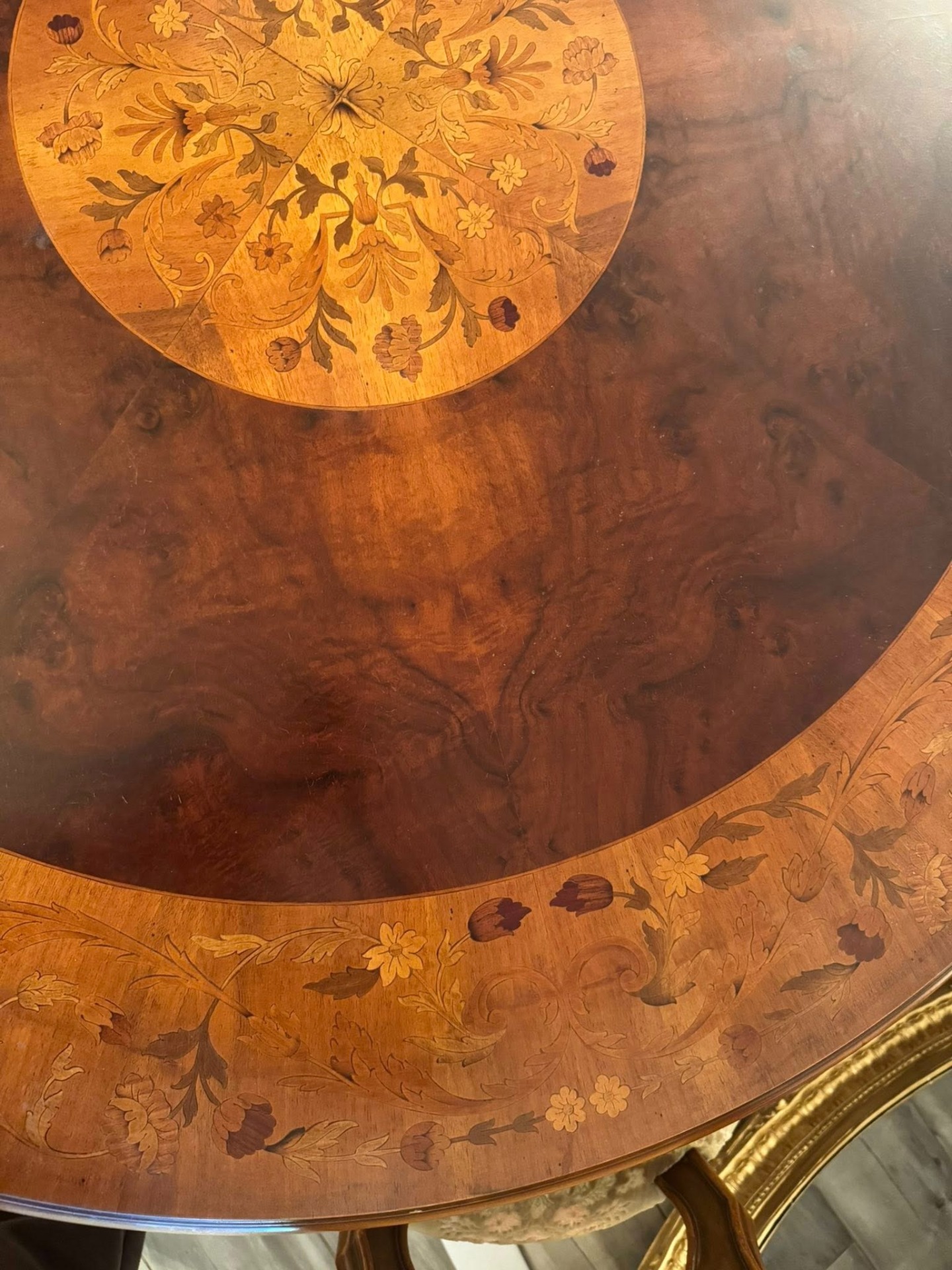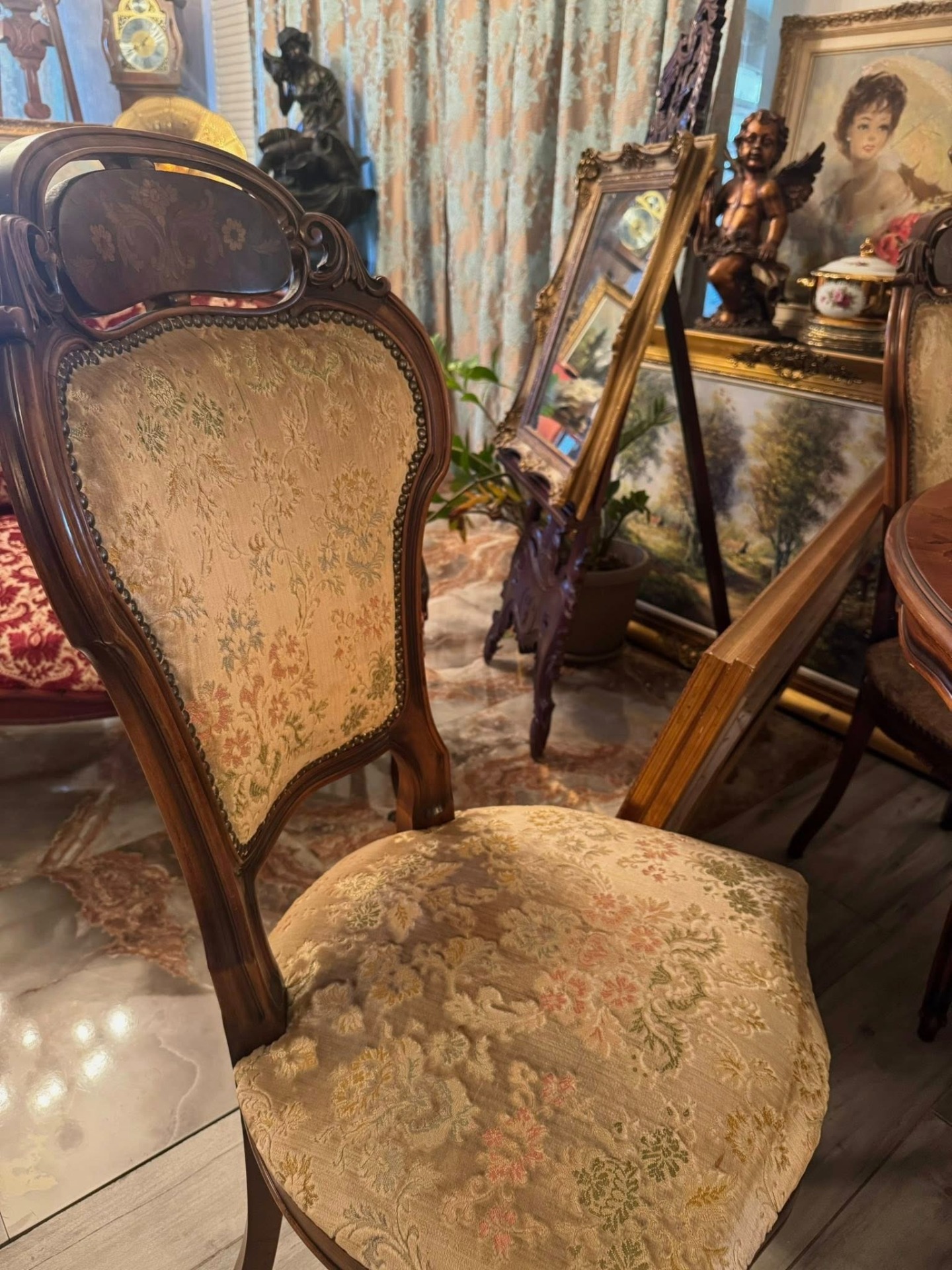 Un set de dining spectaculos, realizat din lemn de înaltă calitate, cu detalii sculptate manual și motive florale elegante. Scaunele sunt tapițate cu material fin, în nuanțe calde, completând perfect masa cu picior central bogat ornamentat.