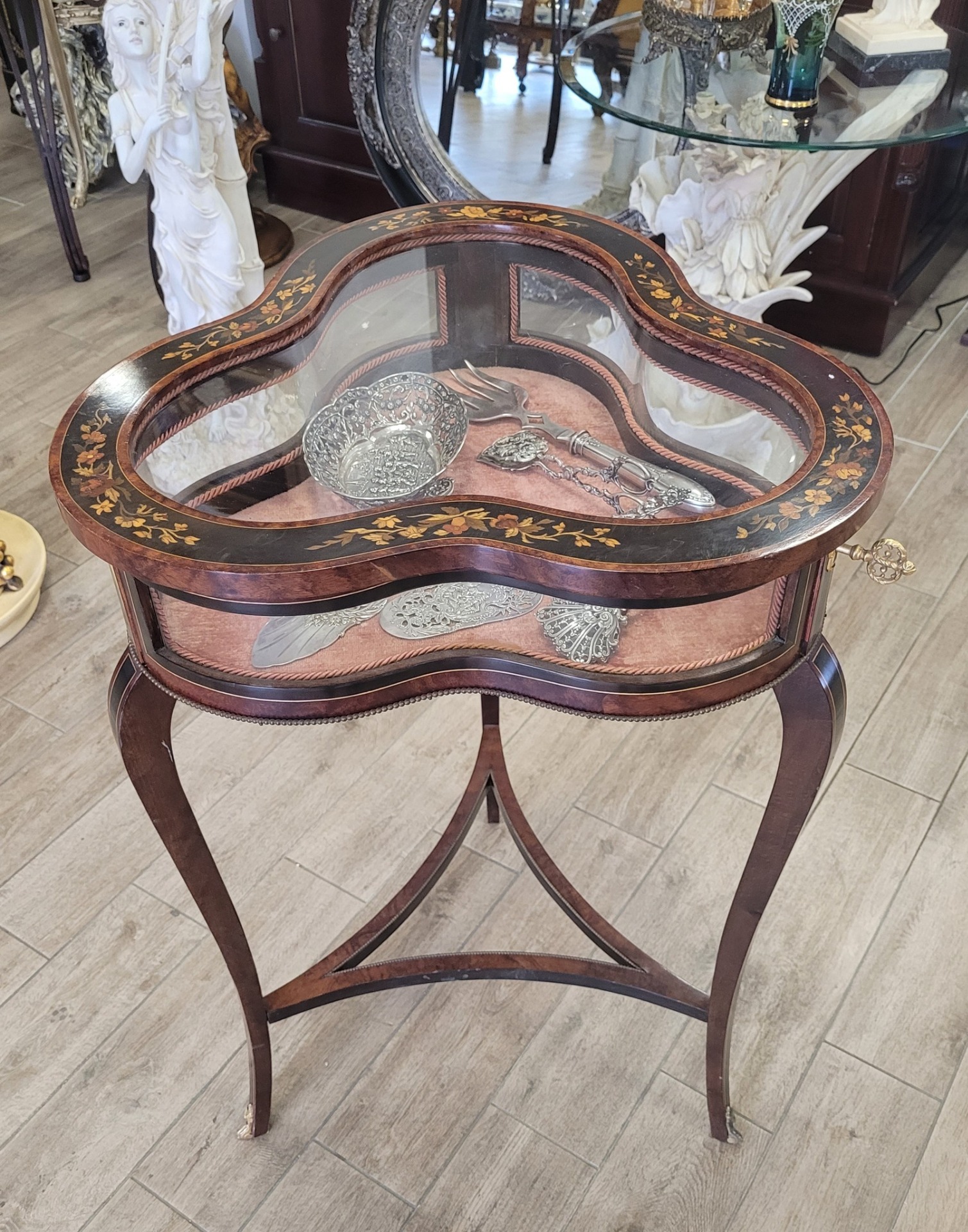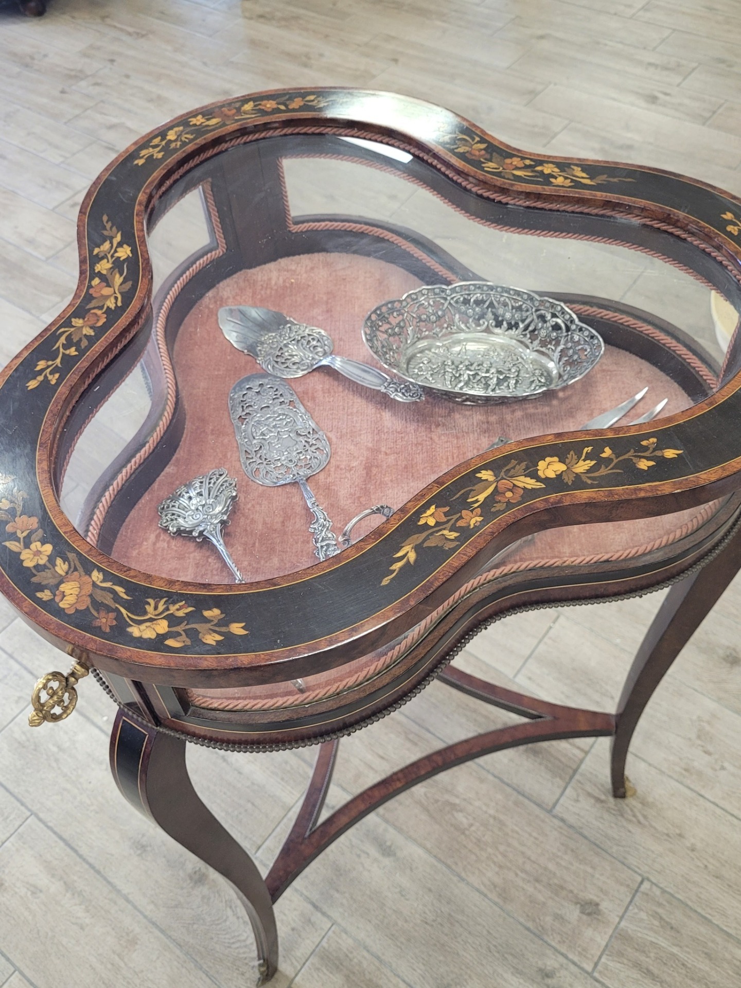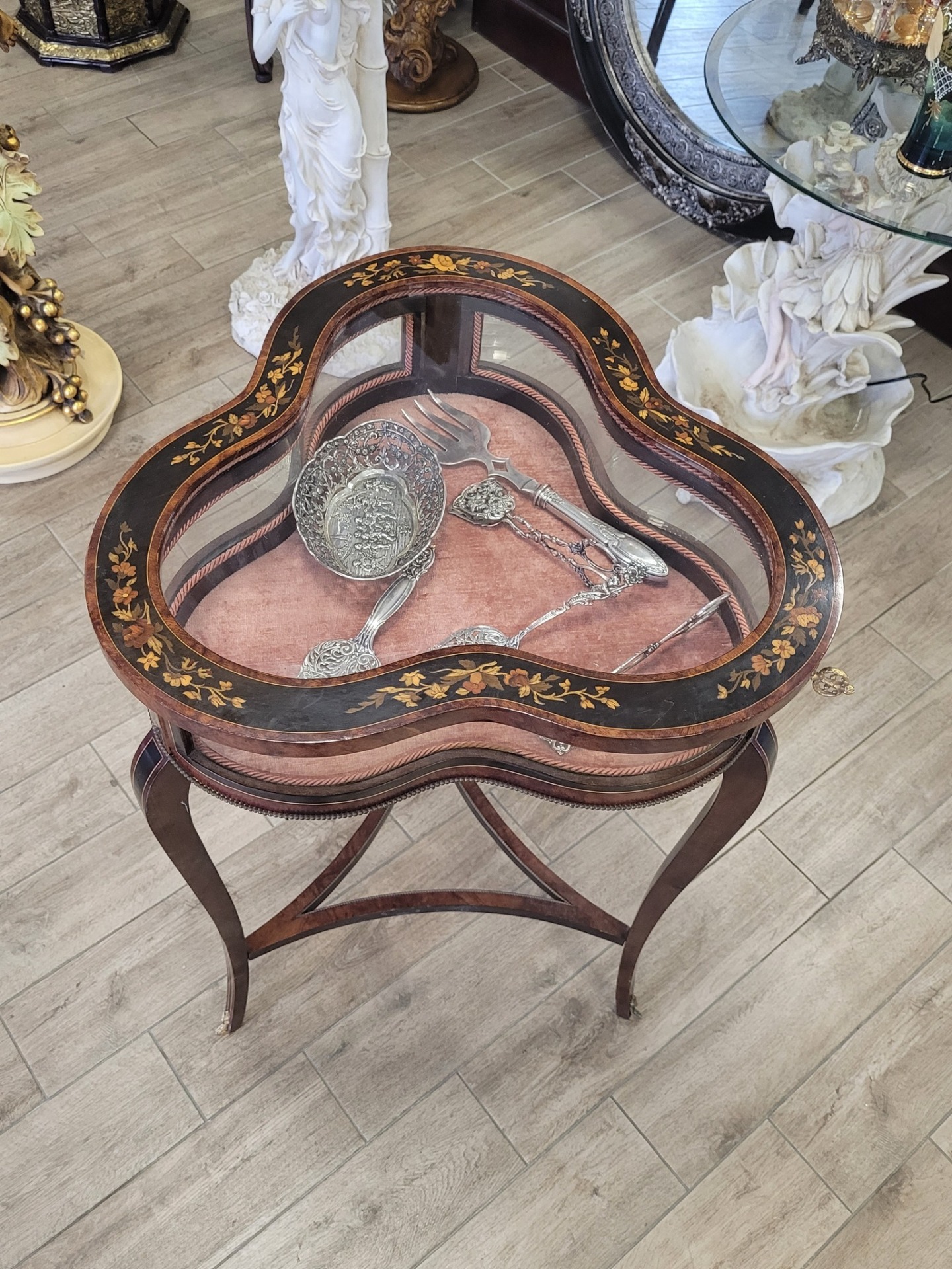 Masă-vitrină de prezentare vintage, cu intarsie florală.