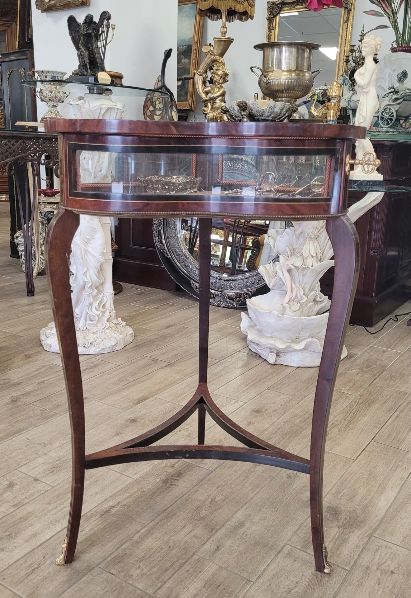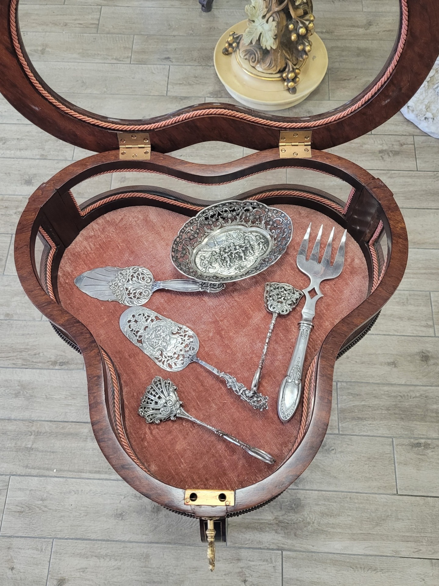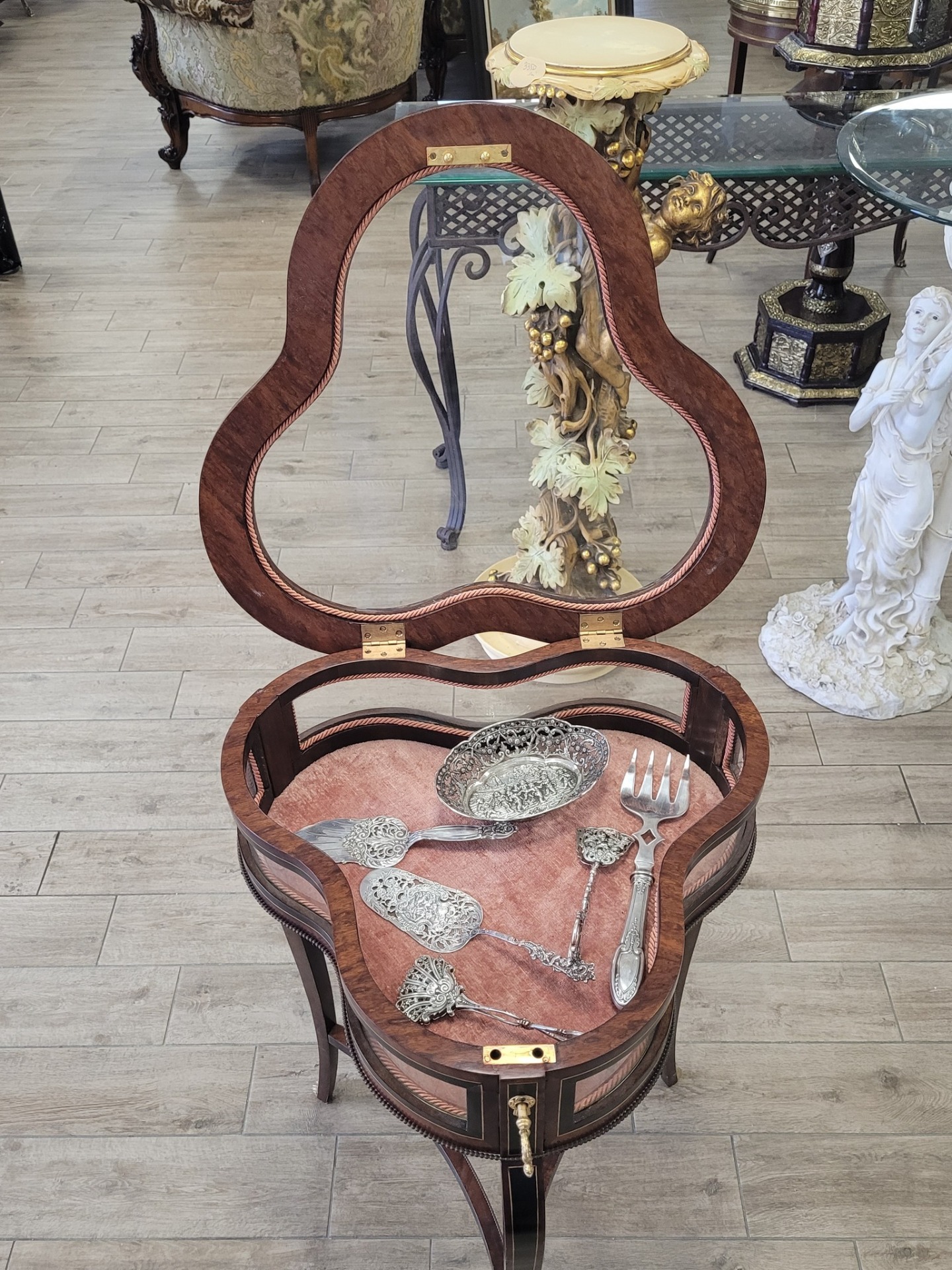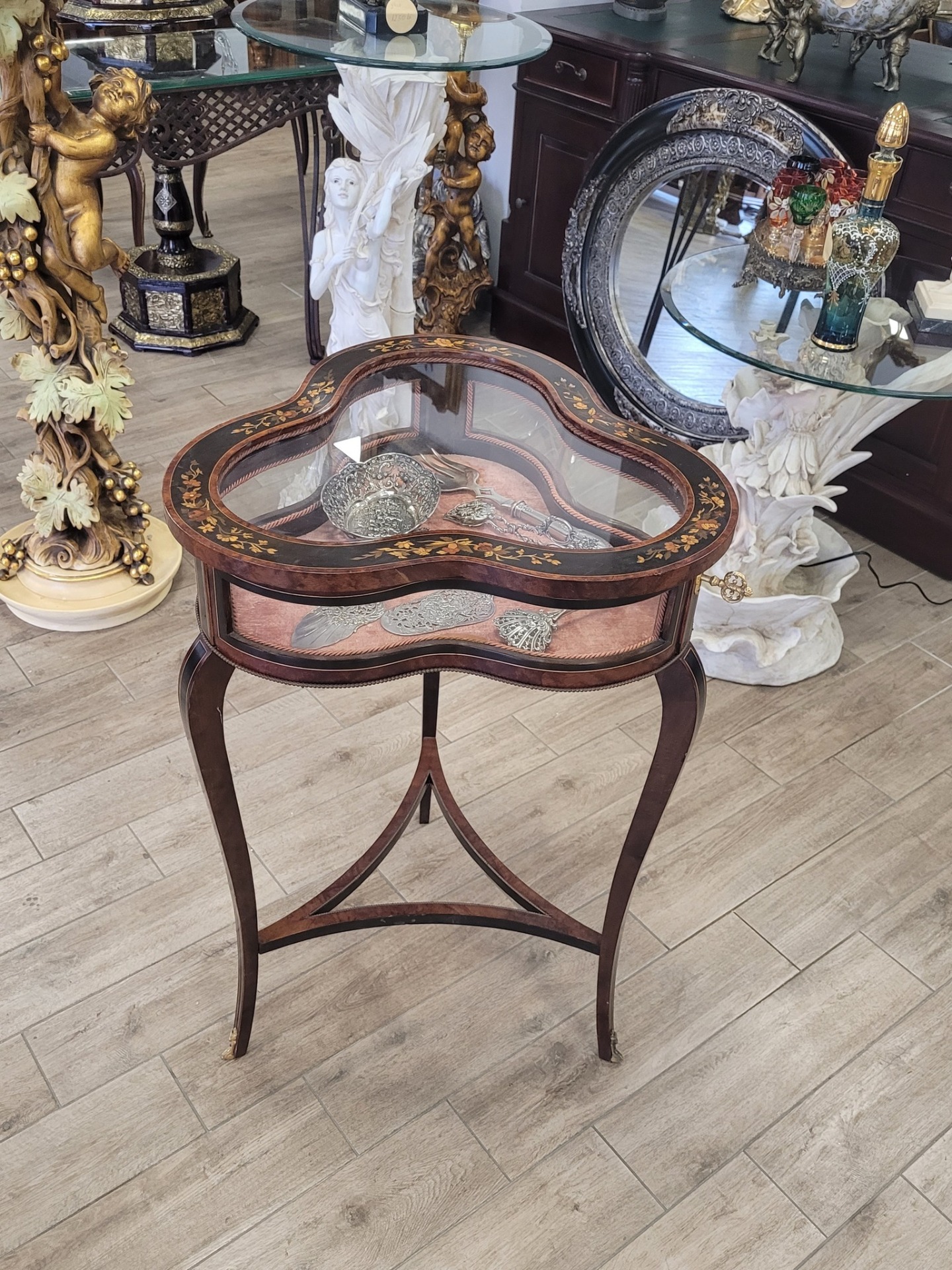 Masă-vitrină de prezentare vintage, cu intarsie florală.