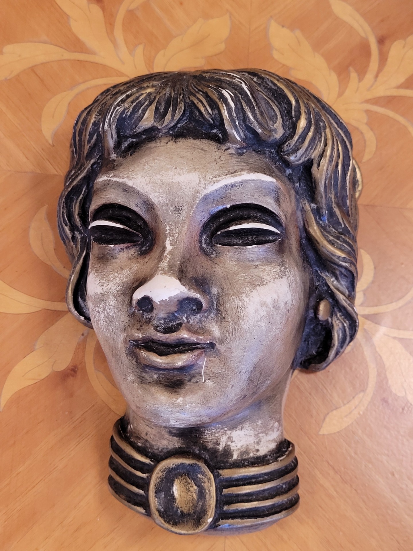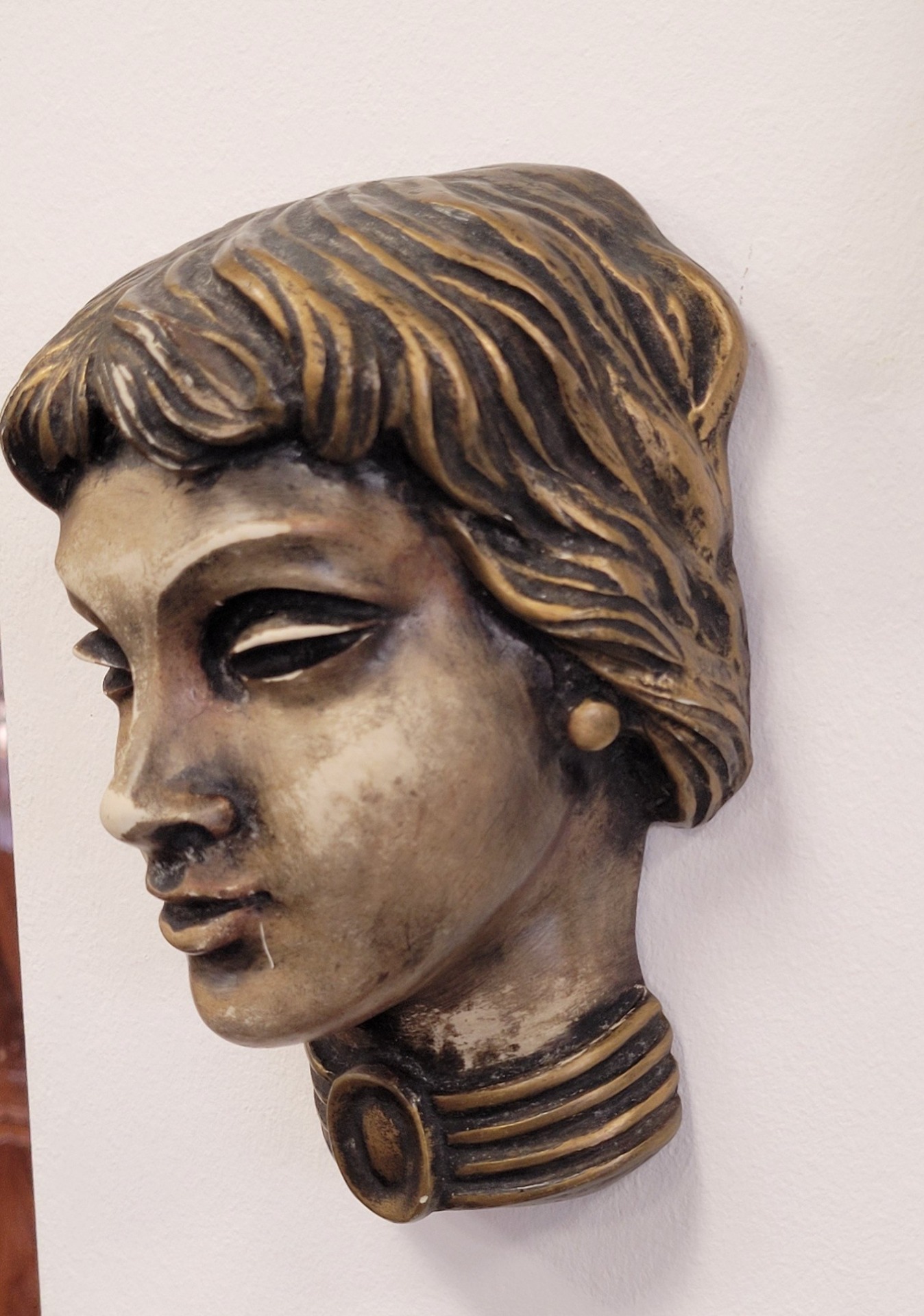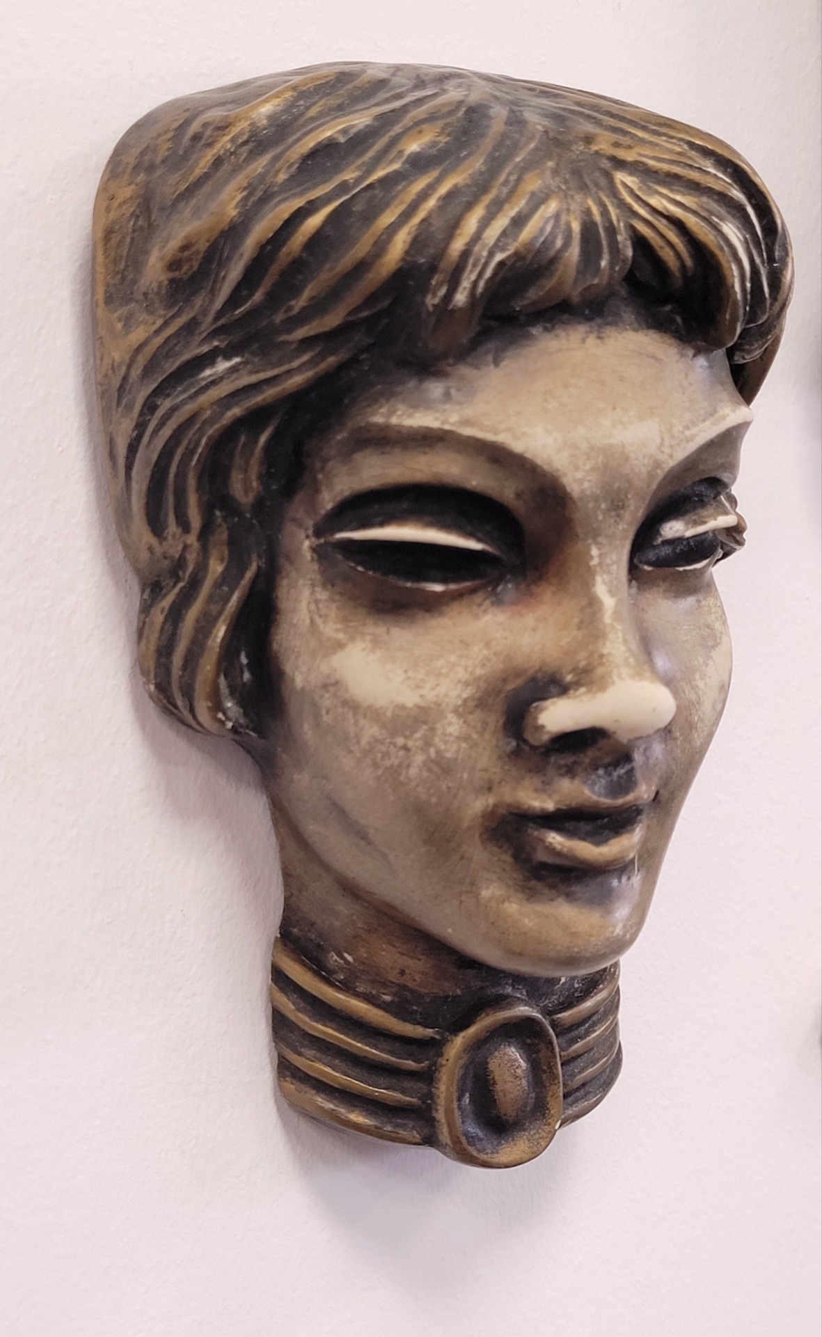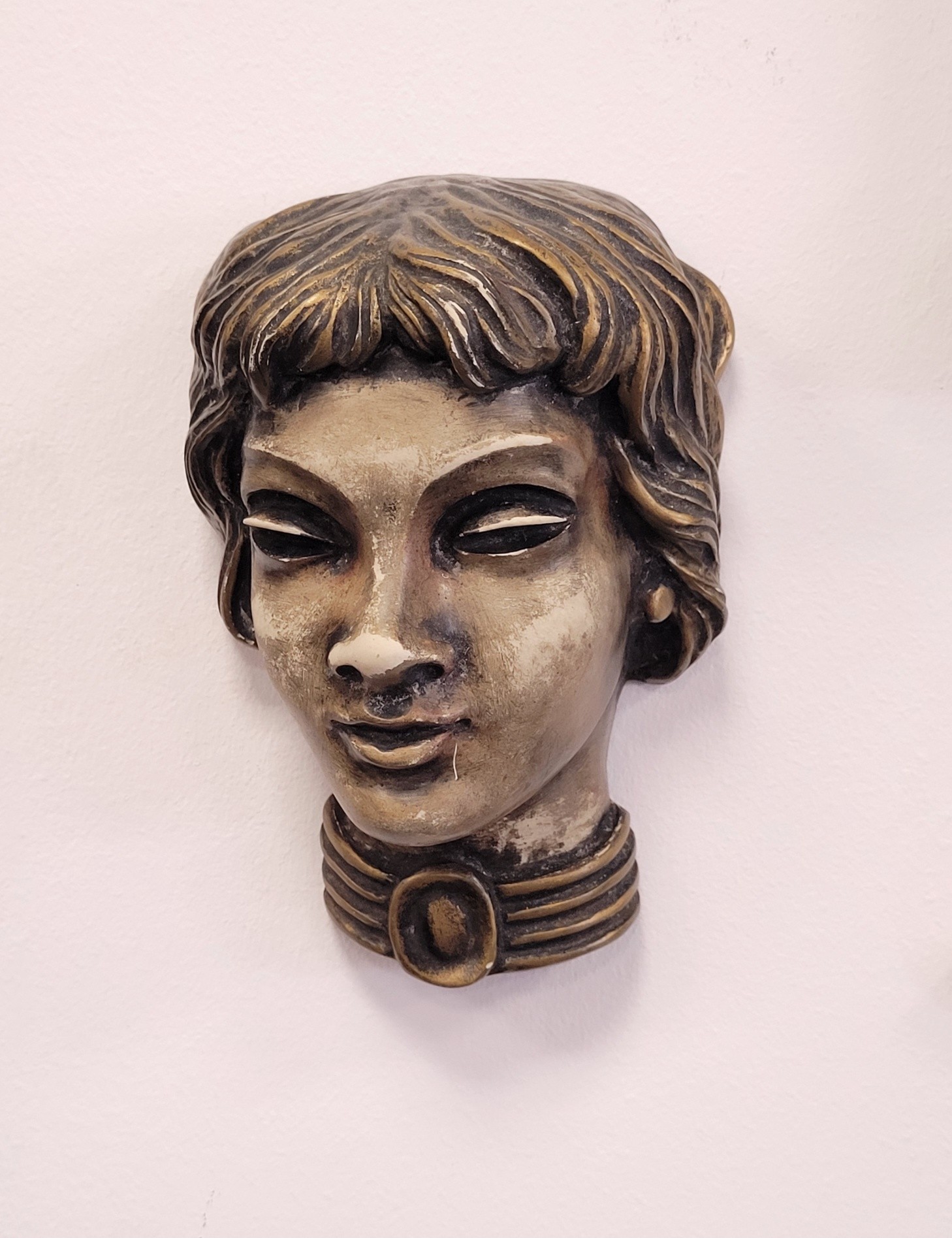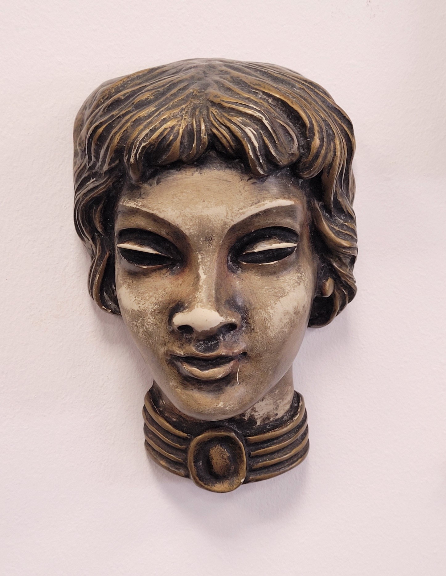 Mască decorativă de perete ACHATIT, vintage mid-century, Handarbeit (Germania), reprezentând chipul unei femei cu trăsături rafinate și o coafură specifică anilor '50-'60, un exemplu clasic al sculpturii decorative europene de mijloc de secol XX.