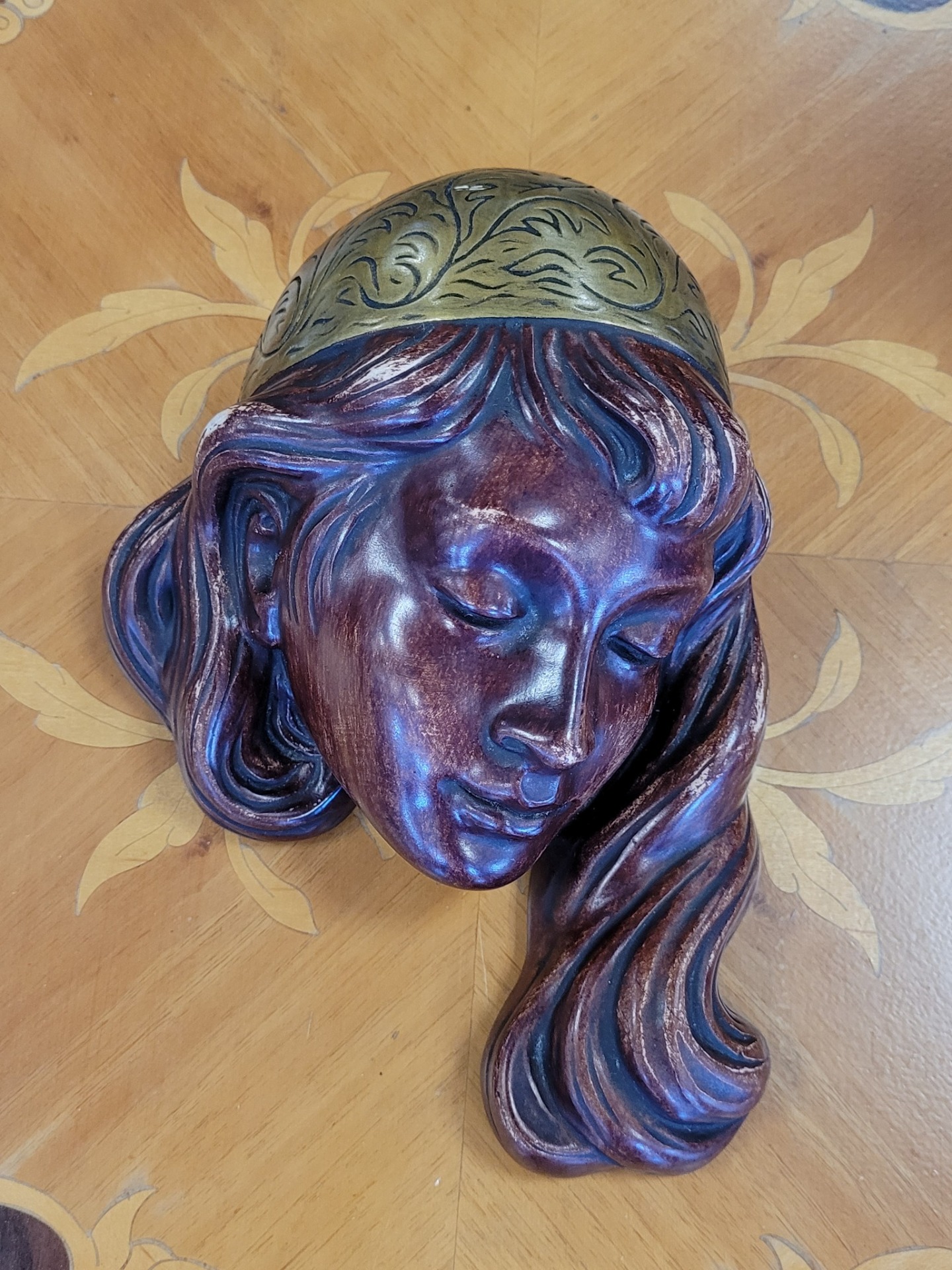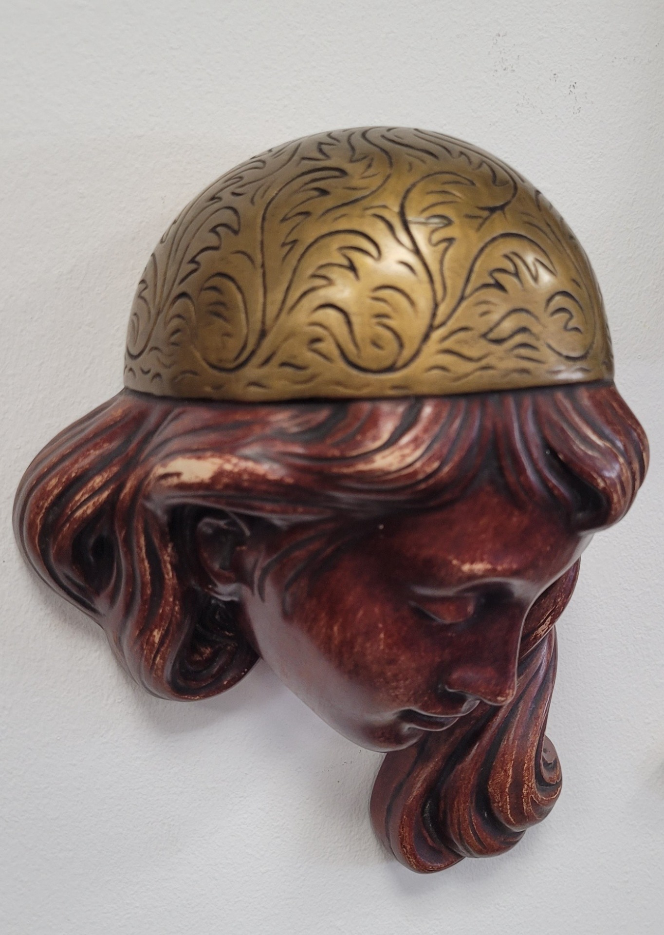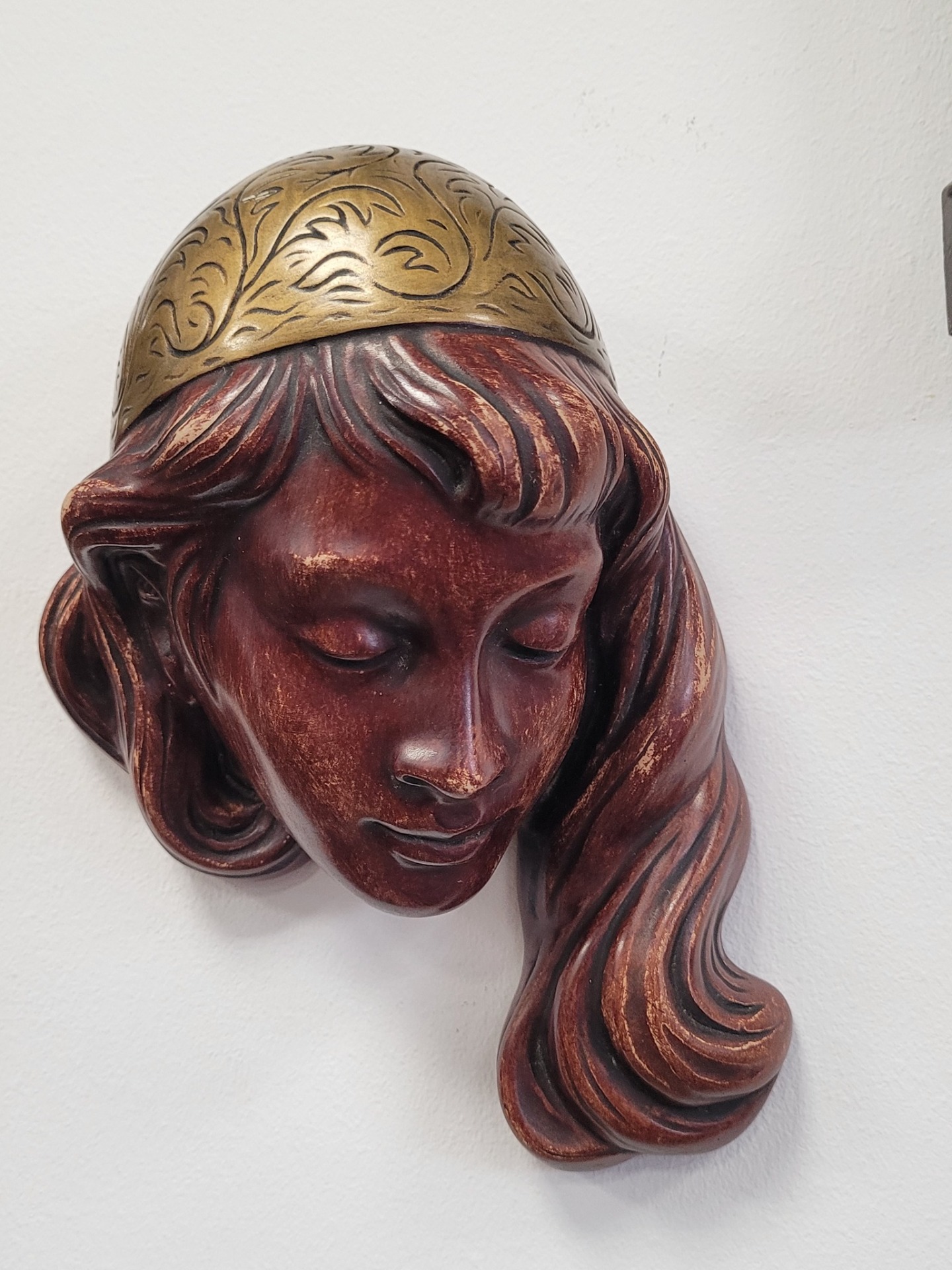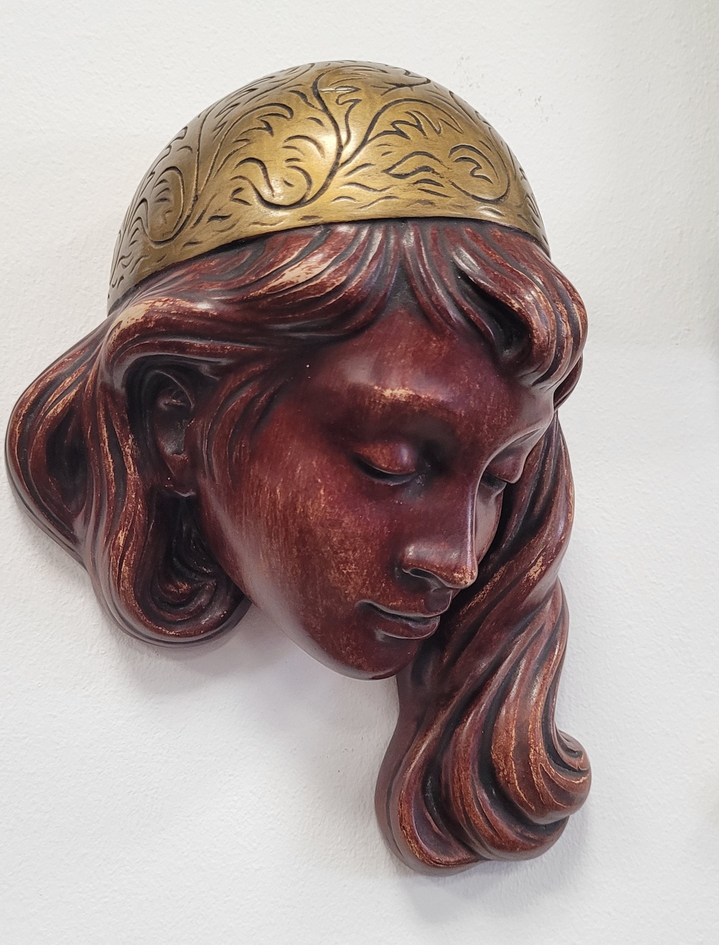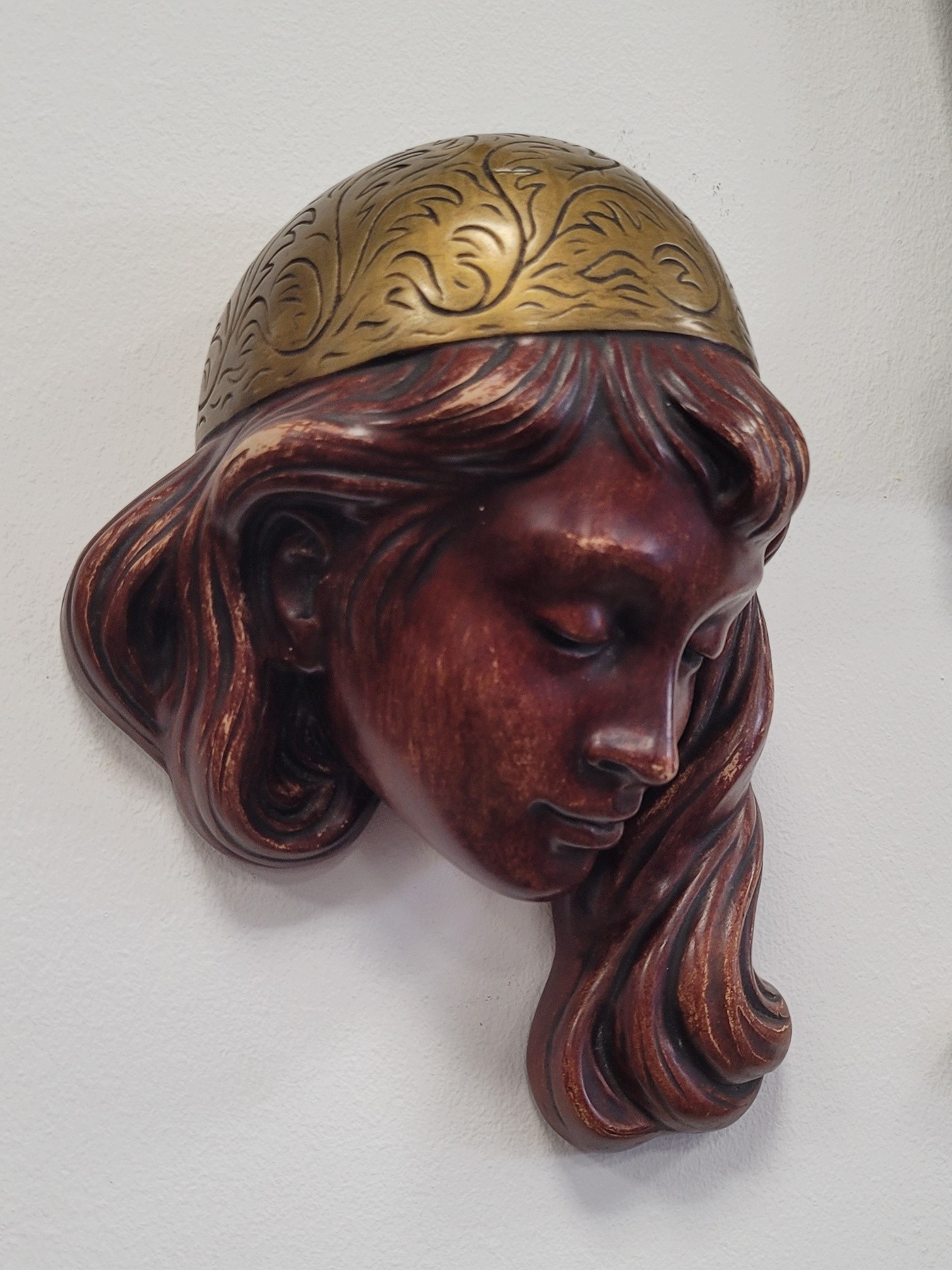 Mască decorativă de perete vintage, din ceramică, chip de fată cu diademă aurie, piesă de artă sculpturală deosebită, această mască de perete impresionează prin finețea trăsăturilor și armonia culorilor.