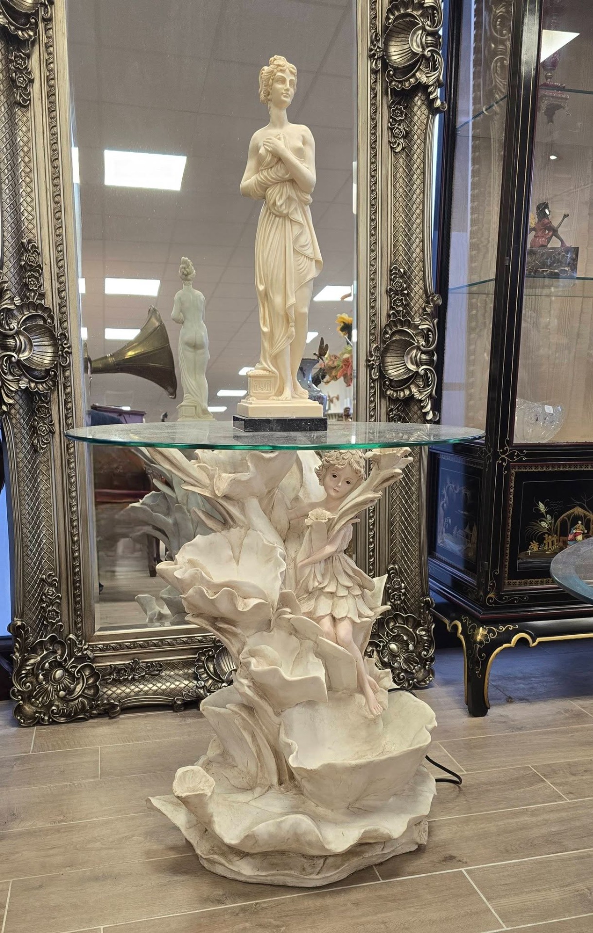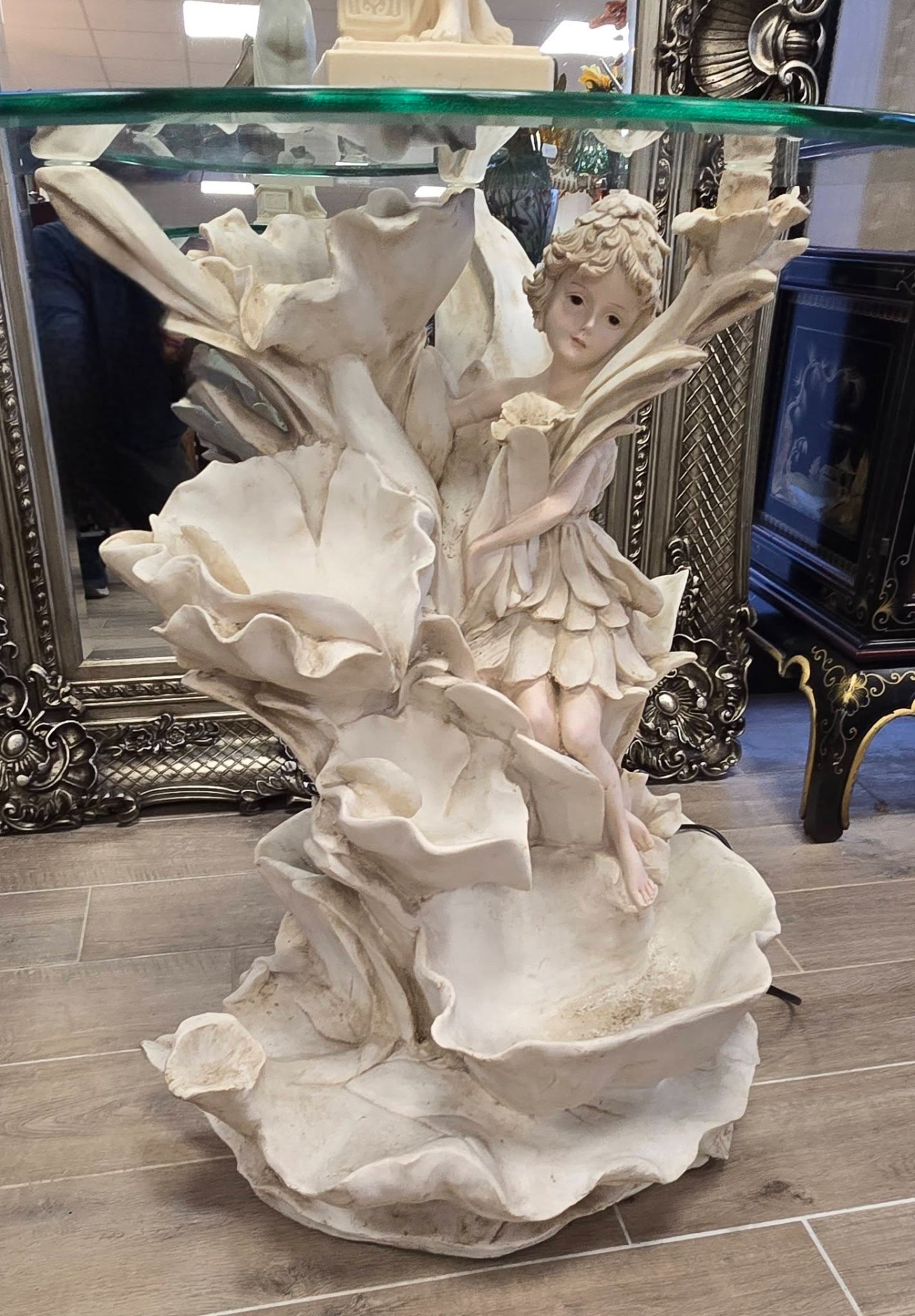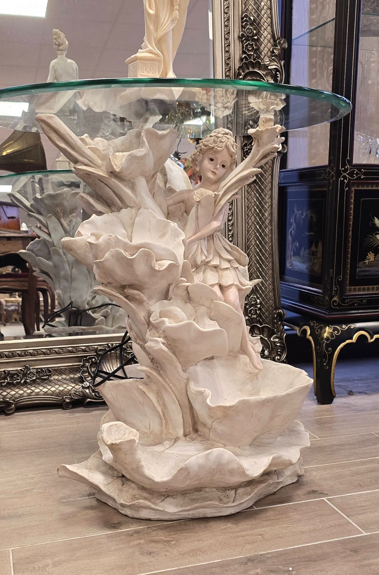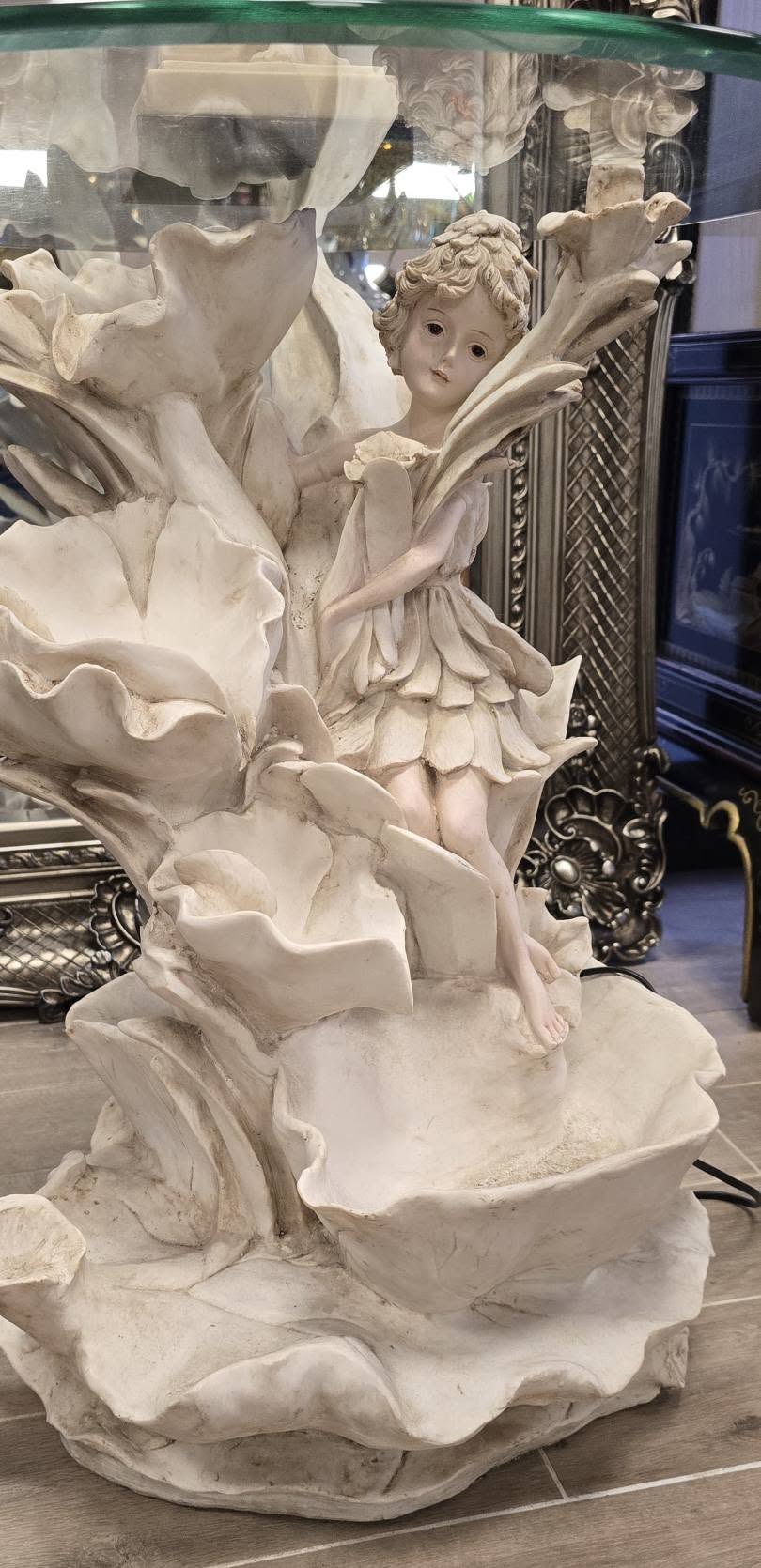 Măsuță cu fântână arteziană din rășină de înaltă calitate și blat din sticlă, cu tematică romantico-fantastică, stilizată cu o zână și frunze de nufăr pe care curge apa cu ajutorul pompei submersibile.