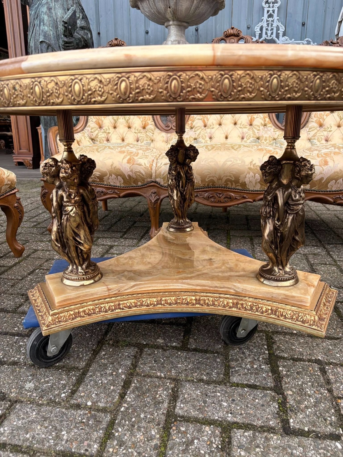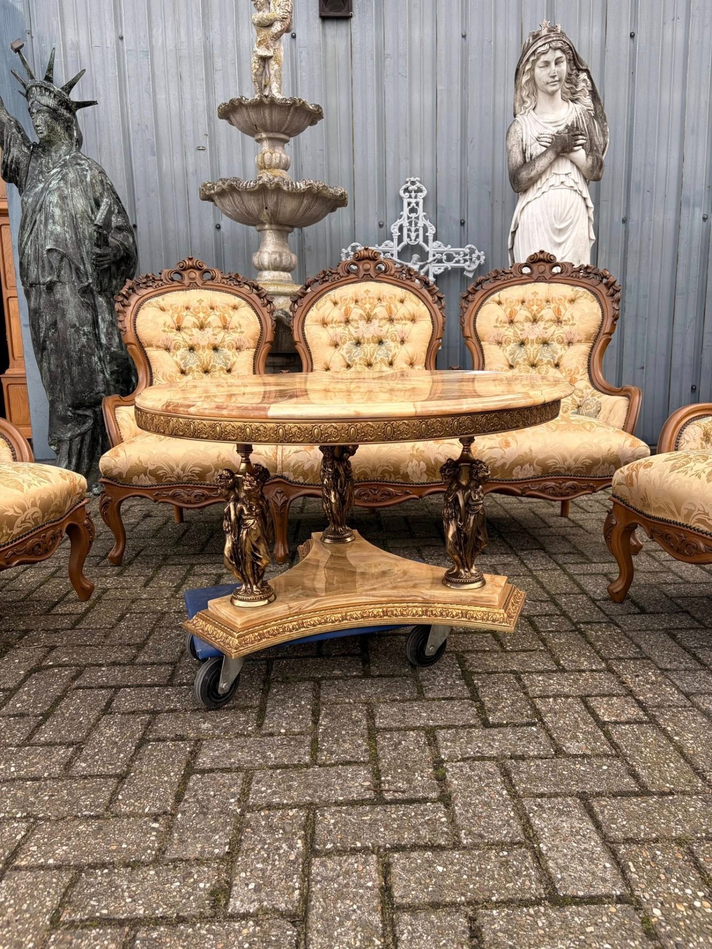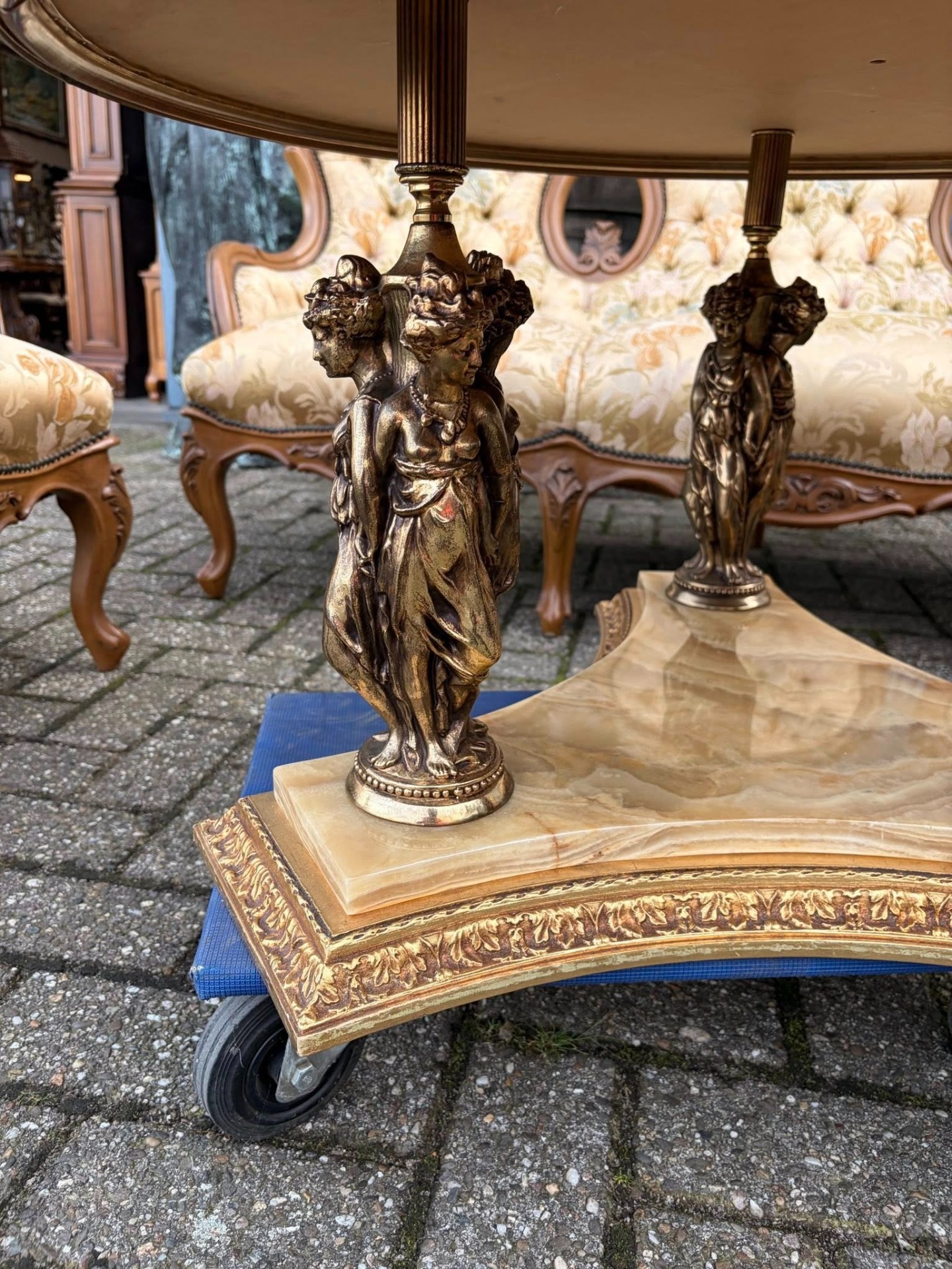 Picioarele mesei sunt foarte ornamentate și includ figuri sculpturale (cel mai probabil nimfe sau cariatide) în stil clasic/baroc
