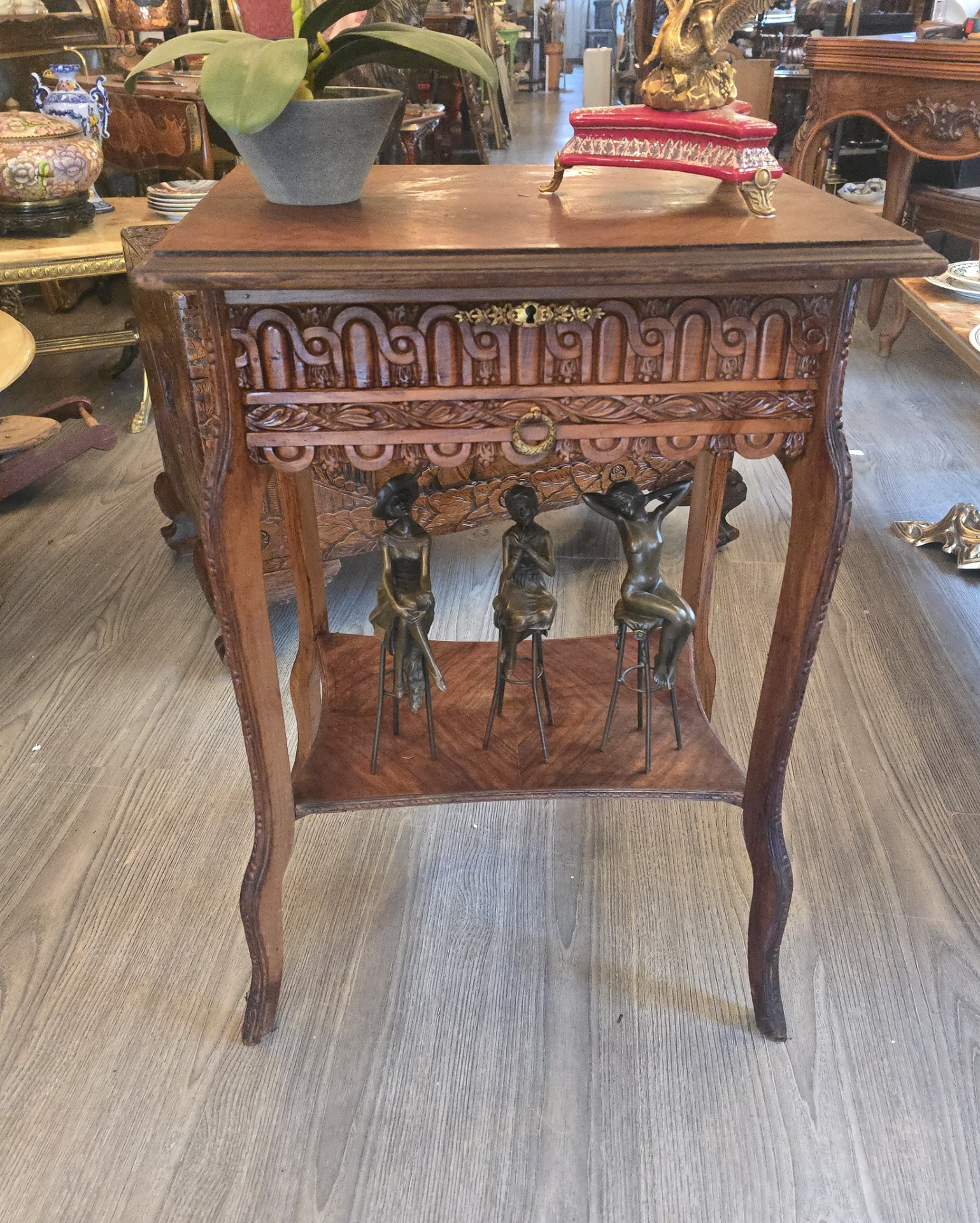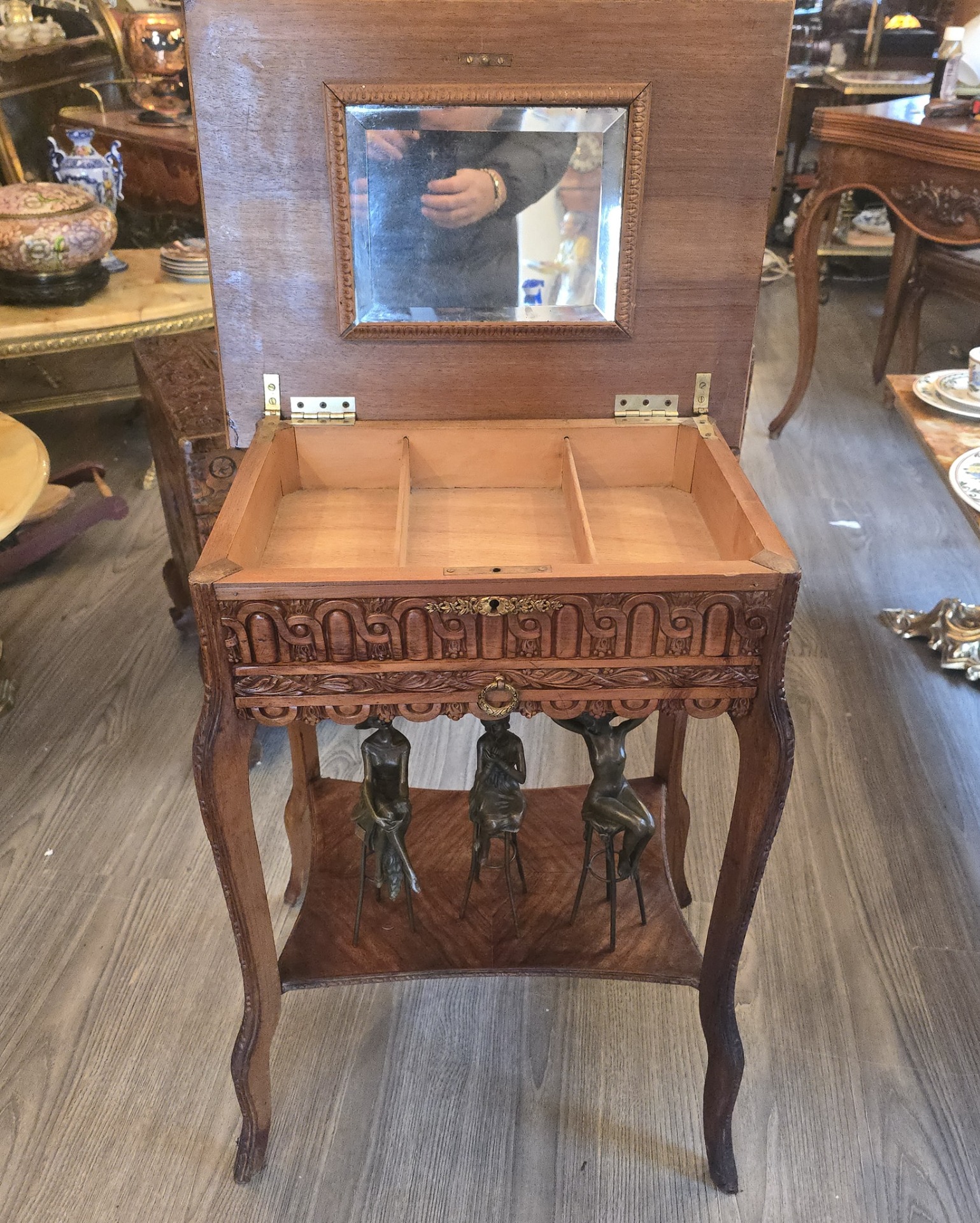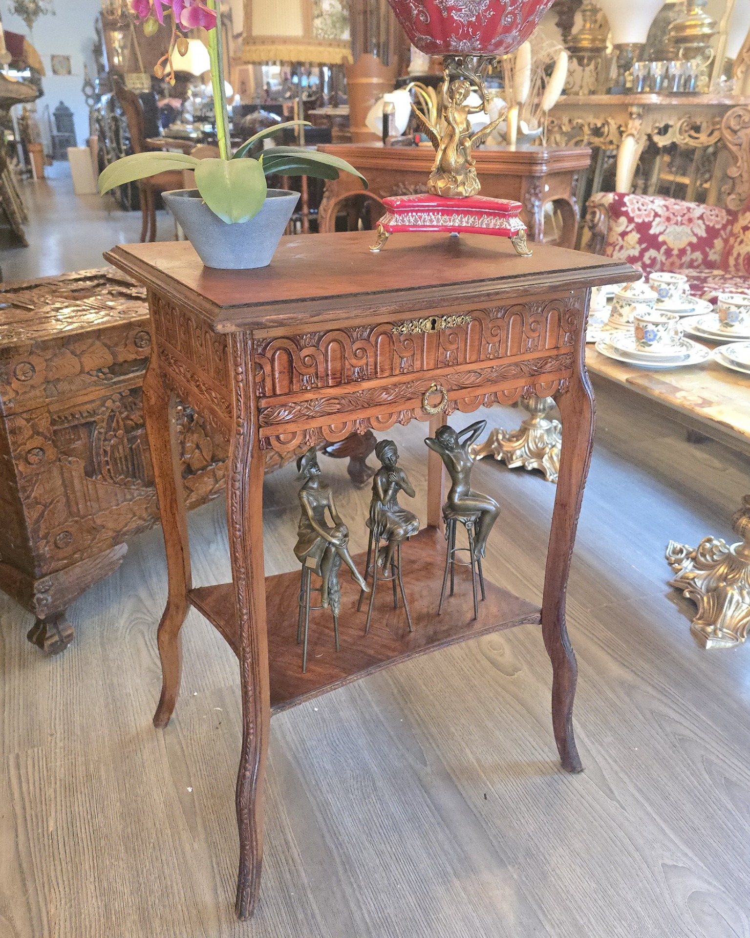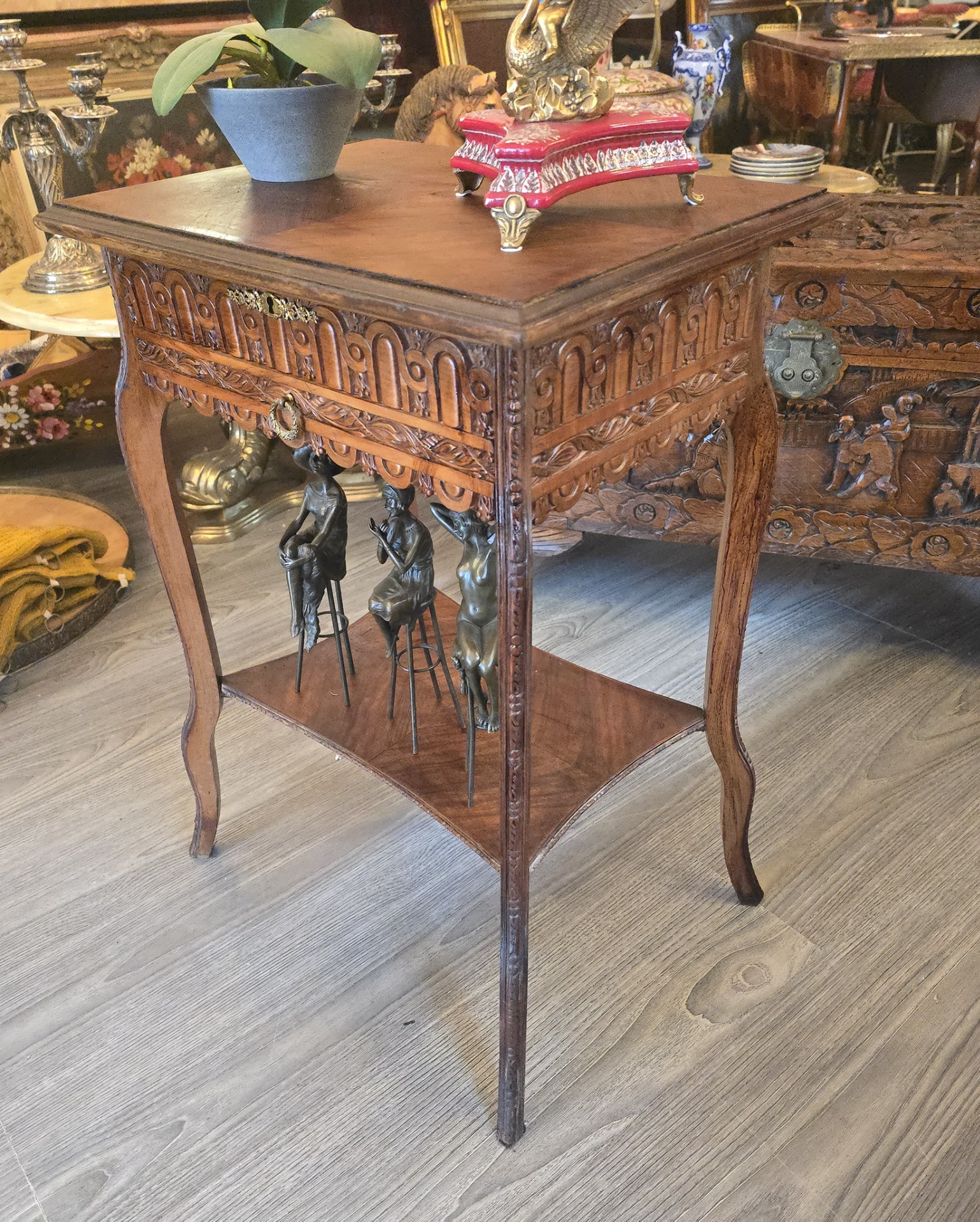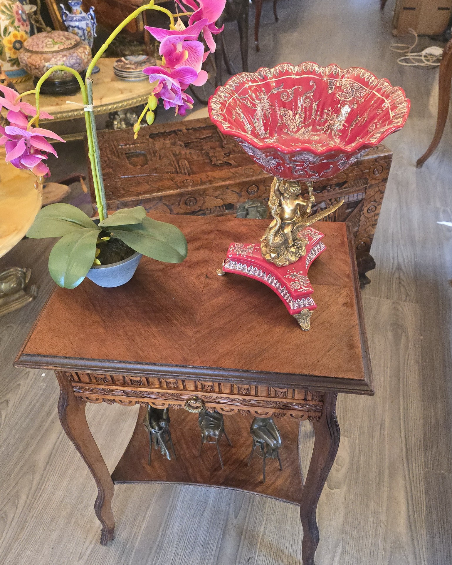 Vând măsută de tip ,,vanity' din lemn masiv, ○ piesă elegantă si compactă, ideală pentru hol, dormitor sau living. Designul clasic cu picioare curbate si sculpturi detaliate pe laterale aduce un plus de rafinament oricărui spațiu.