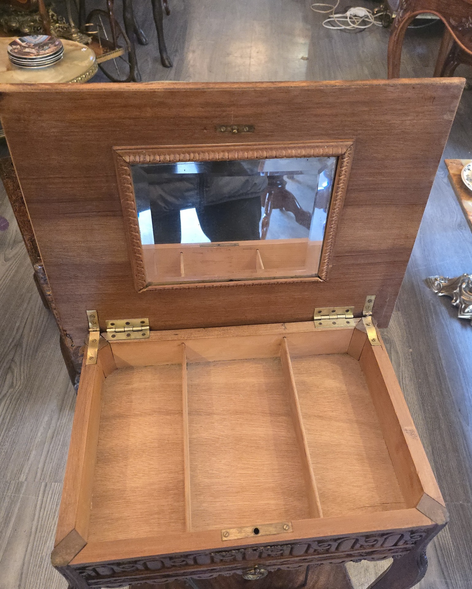 • Functionalitate: Blat rabatabil dotat cu oglindă interioară si compartiment organizat pentru depozitare (bijuterii, acte sau accesorii)