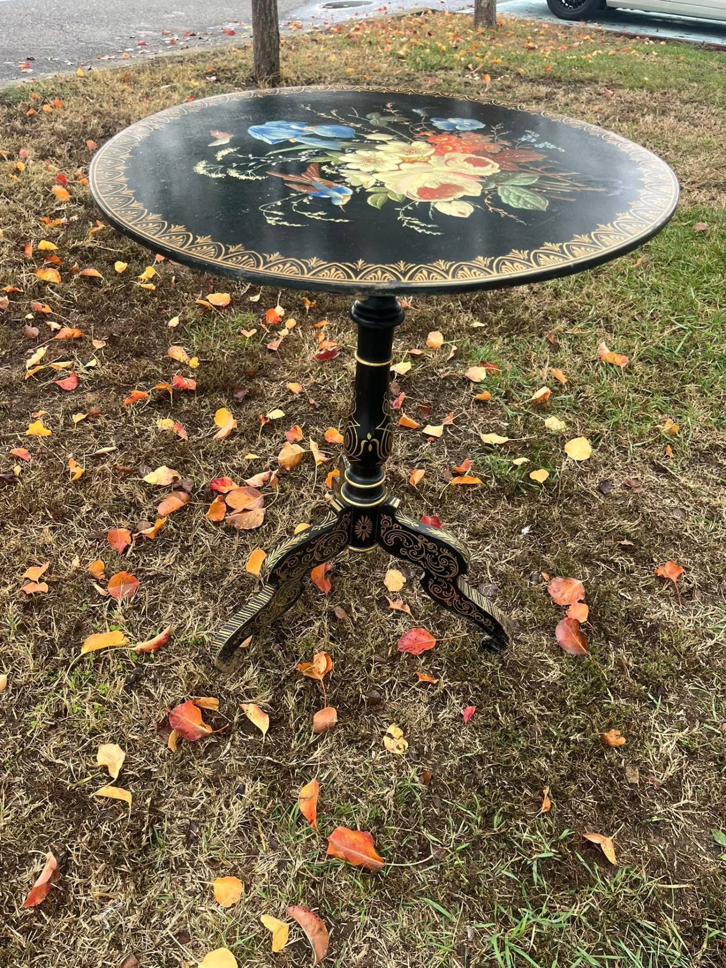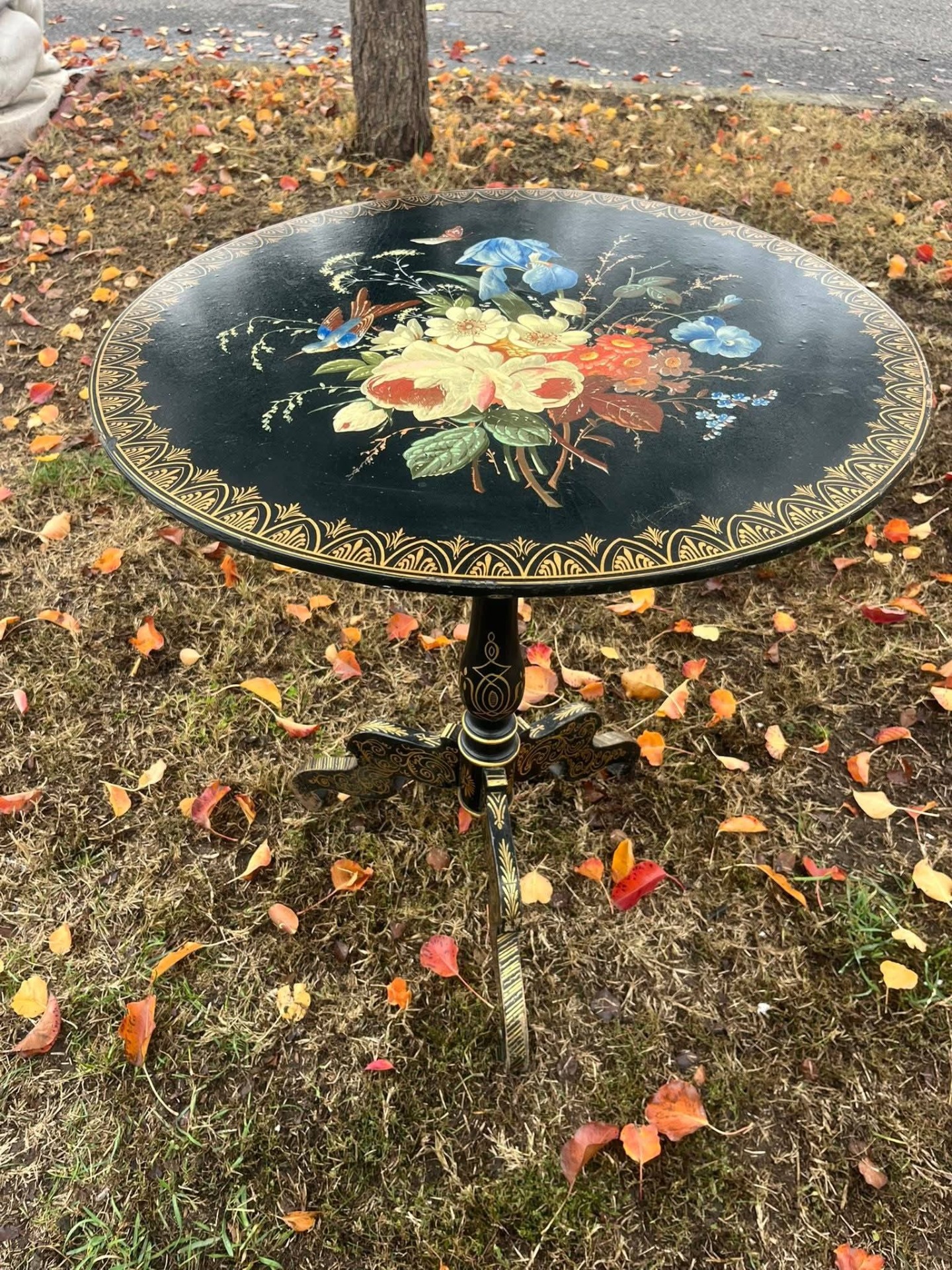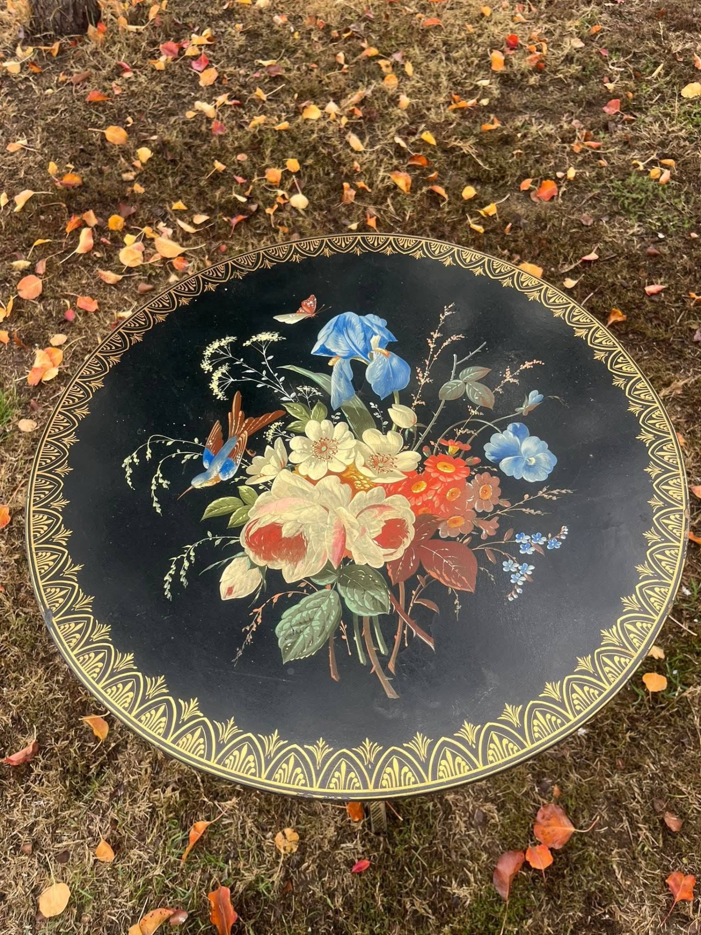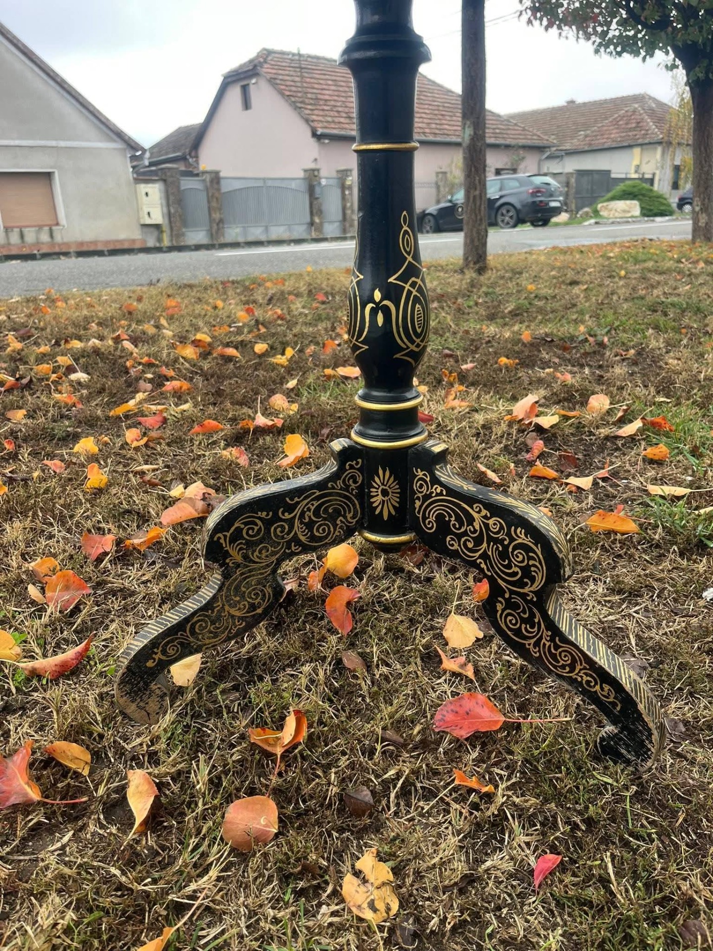 Măsuță decorativă deosebită, cu picior triplu și blat rotund, decorată manual în stil clasic. Piesa are un fond negru elegant, ornamentat cu motive florale