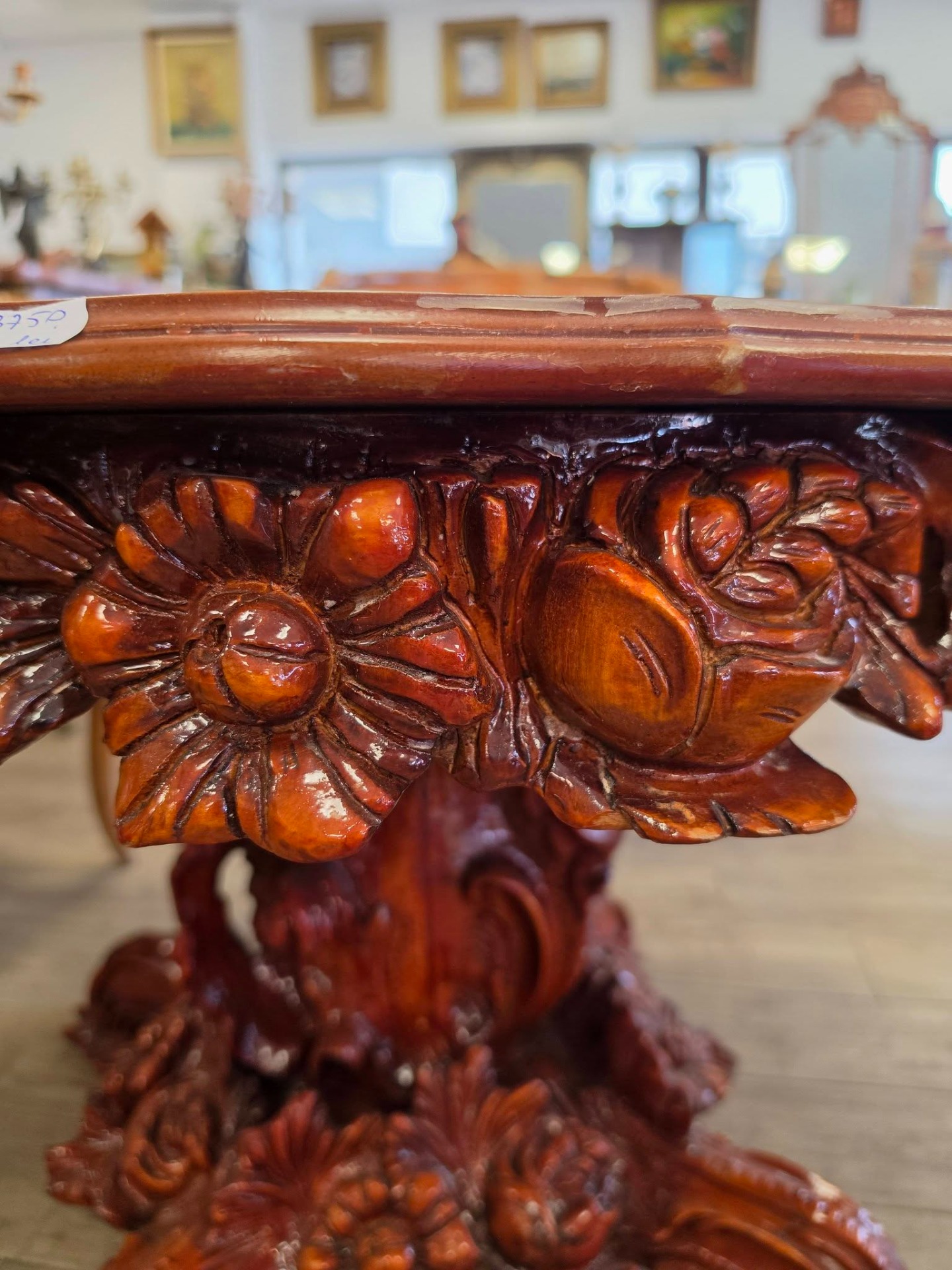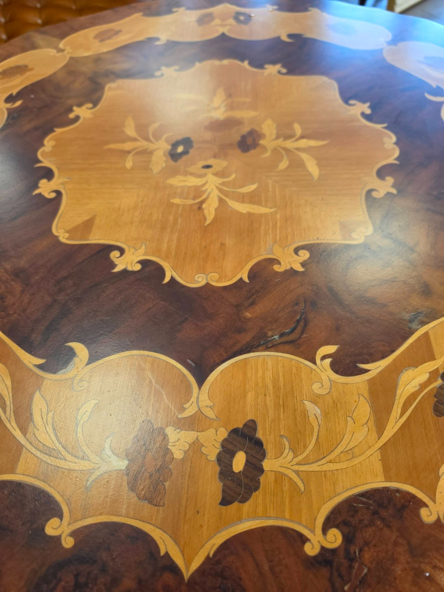 Măsuța rotundă stil baroc – piesă deosebită cu intarsie și sculpturi manuale