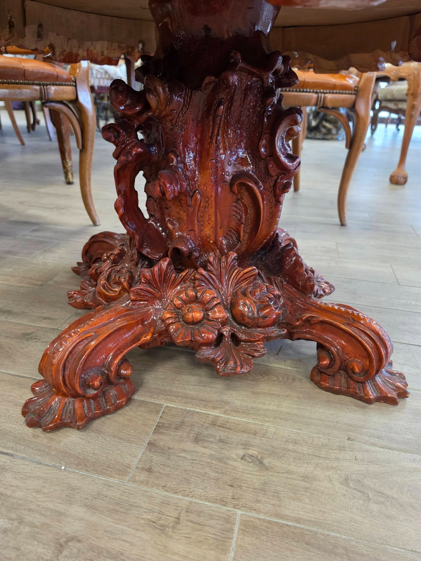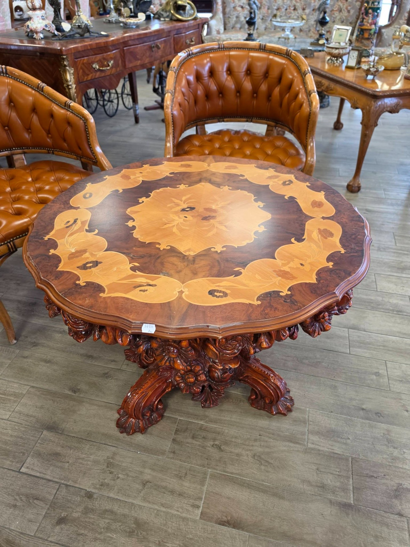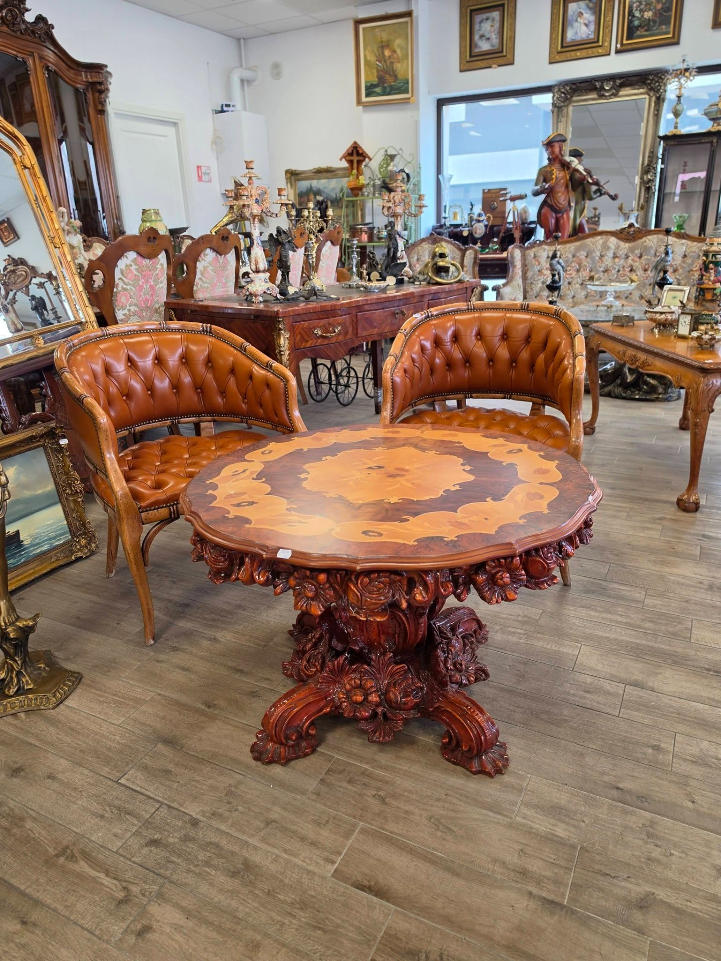 Masă elegantă, deosebită, realizată în stil baroc, cu blat rotund decorat prin tehnica intarsiei (marchetărie), cu motive florale rafinate. Baza este masivă, bogat sculptată manual, cu detalii ornamentale impresionante, oferind stabilitate și un aspect luxos.
