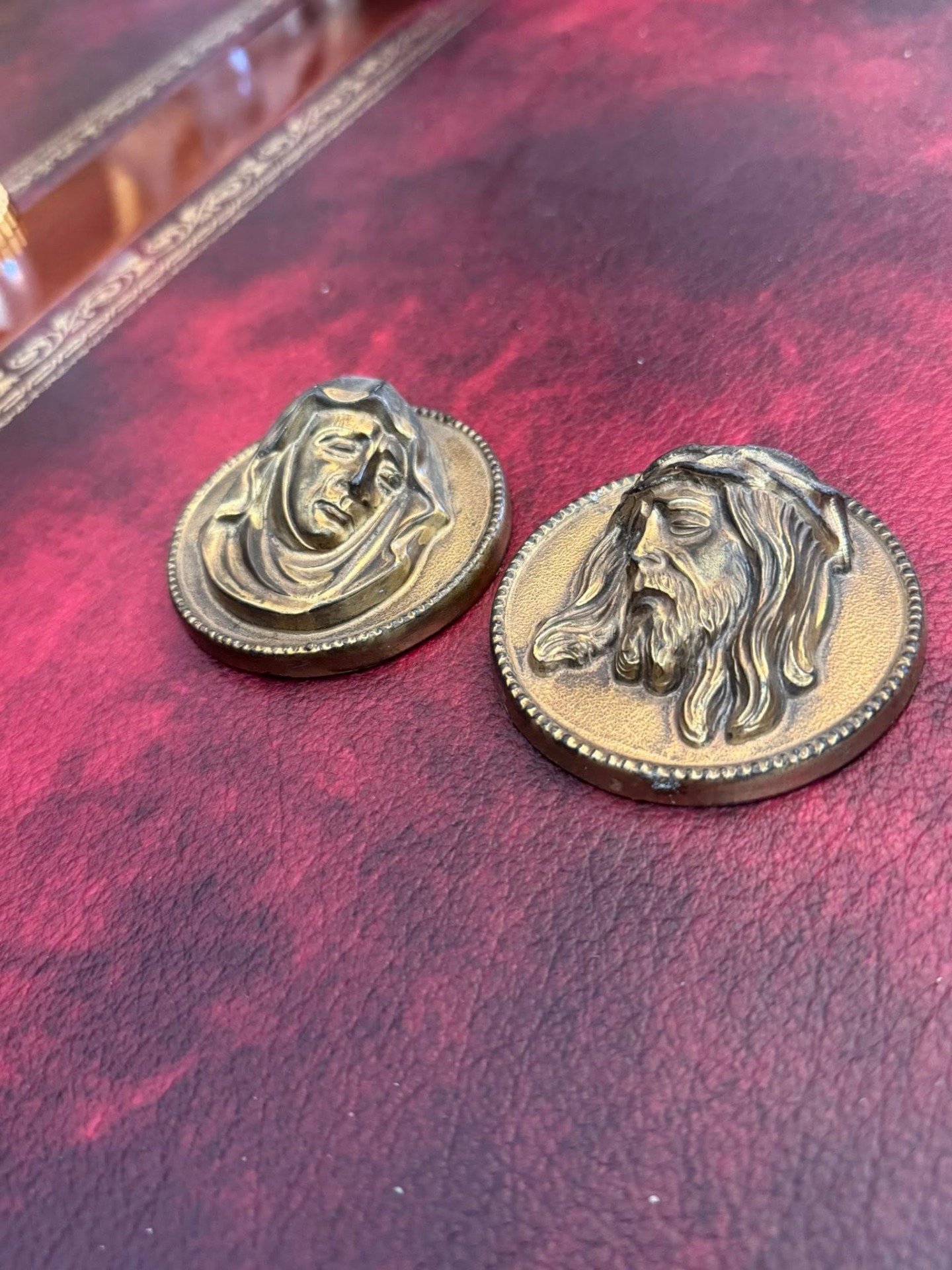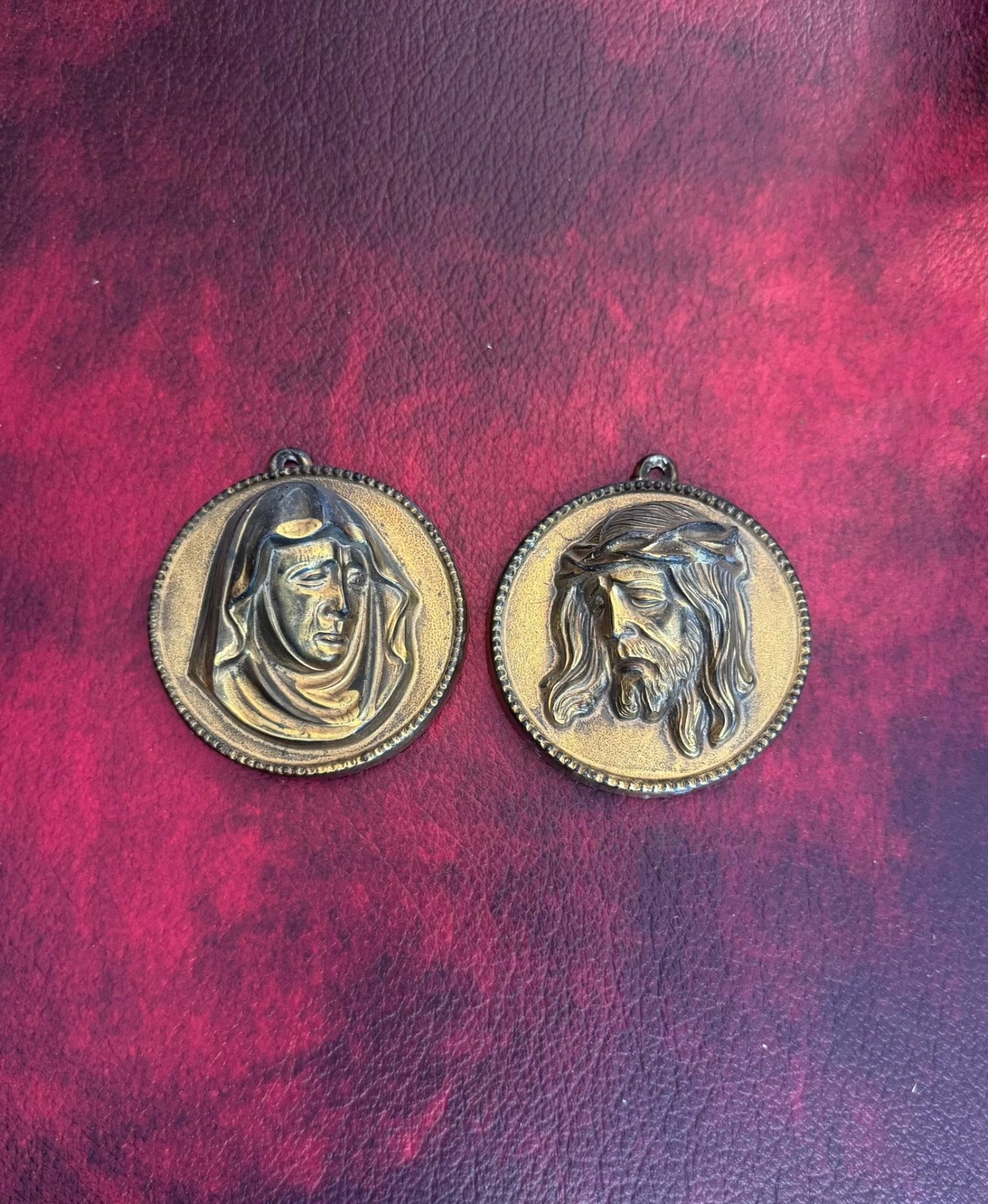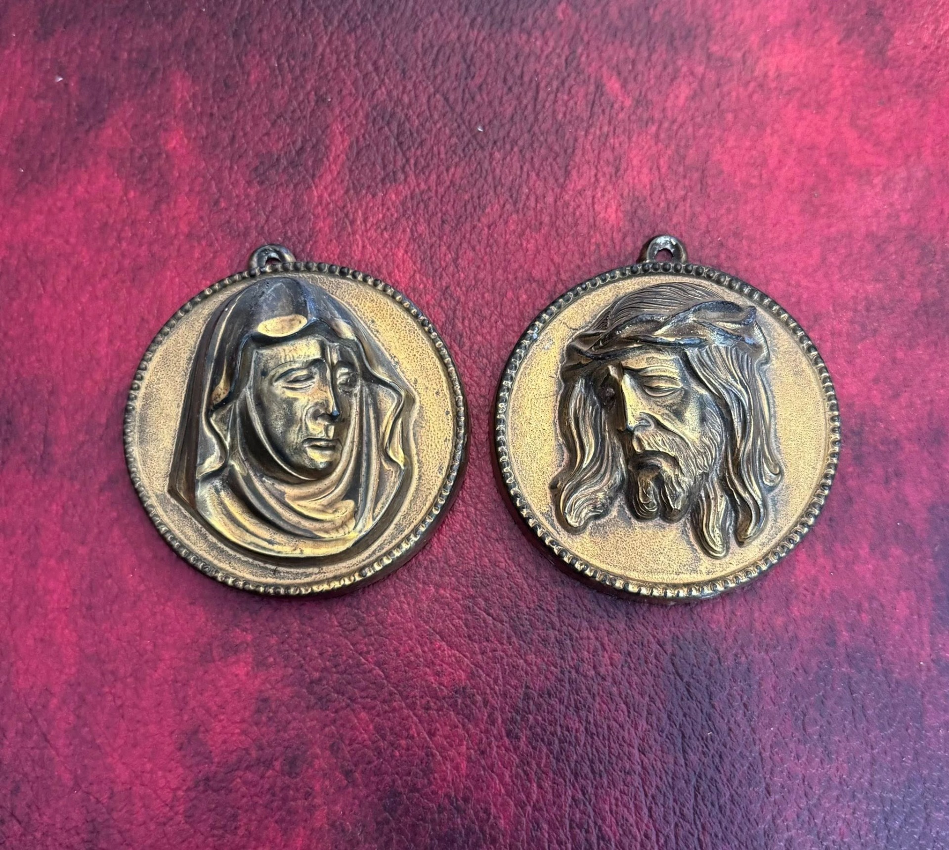 Medalioane religioase realizate din bronz, reprezentând pe Isus și Fecioara Maria.