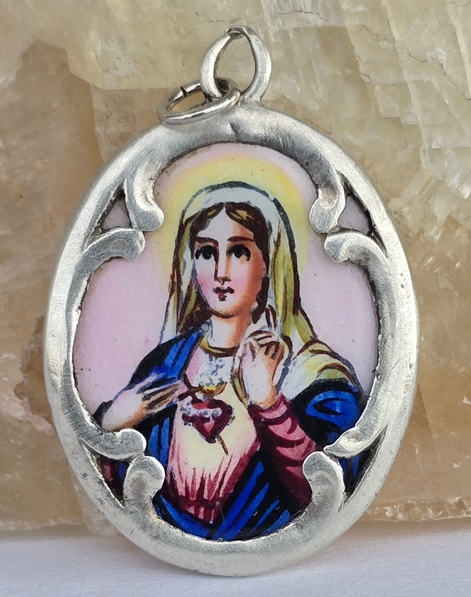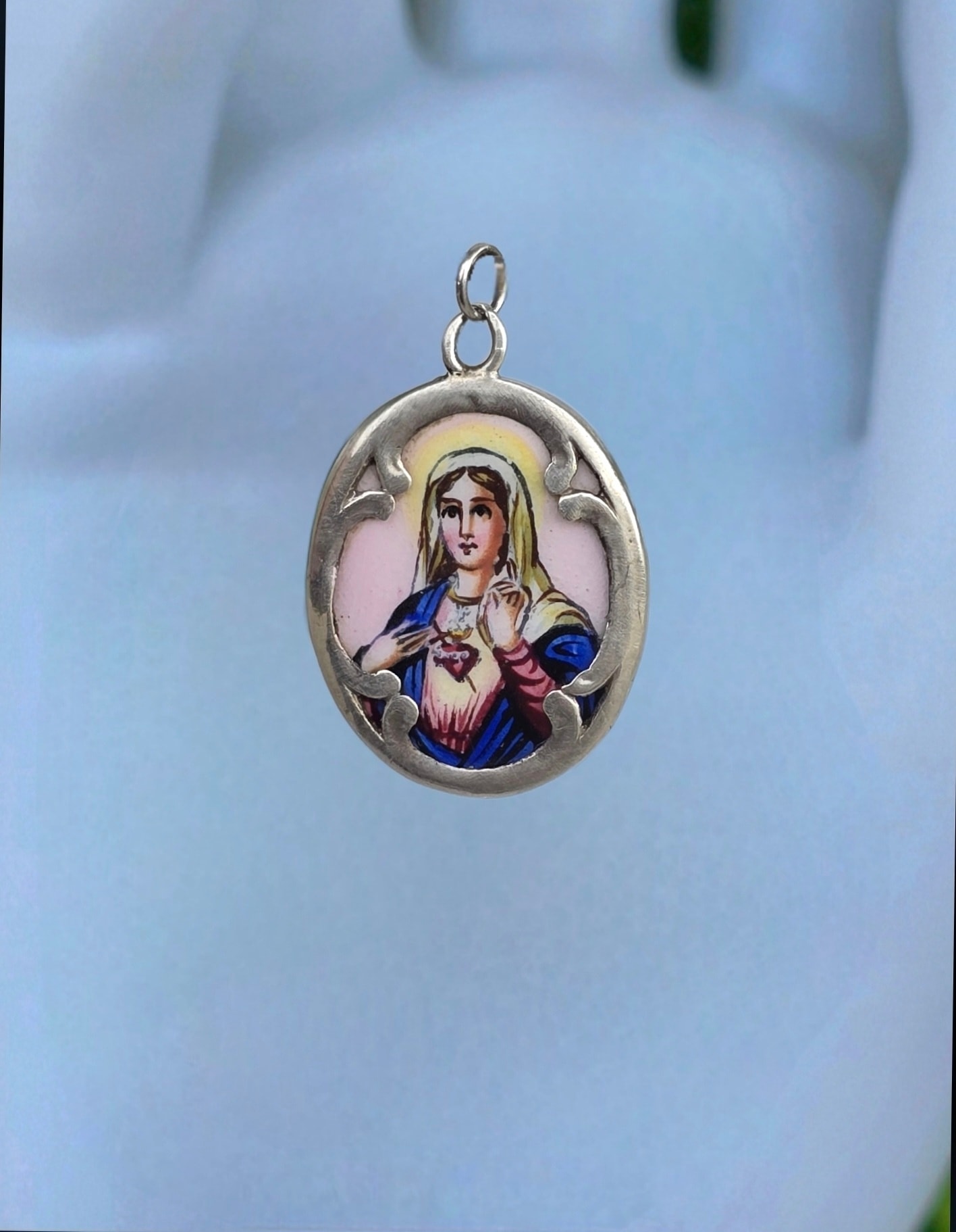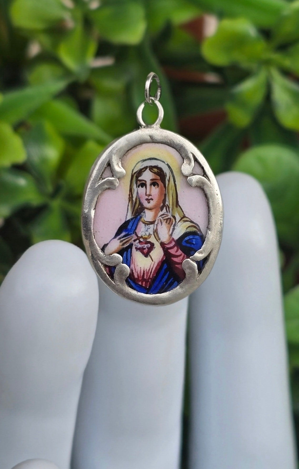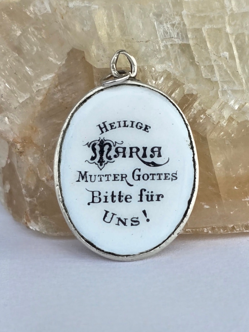 Medalion-iconiță "Maica Domnului cu Inima Neprihănită", vechi, devoțional, din argint, rar, de colecție, cu email pictat manual, inscripționat pe revers în limba germană: "Heilige Maria Mutter Gottes Bitte für Uns!" (Sfântă Maria, Maica lui Dumnezeu, roagă-te pentru noi!)