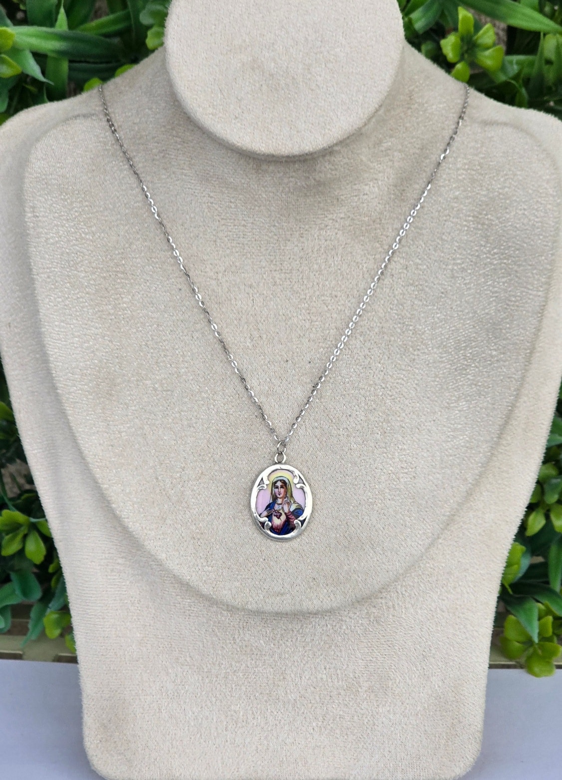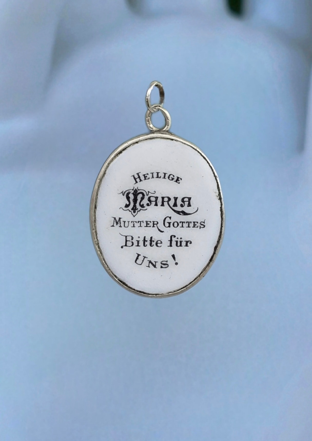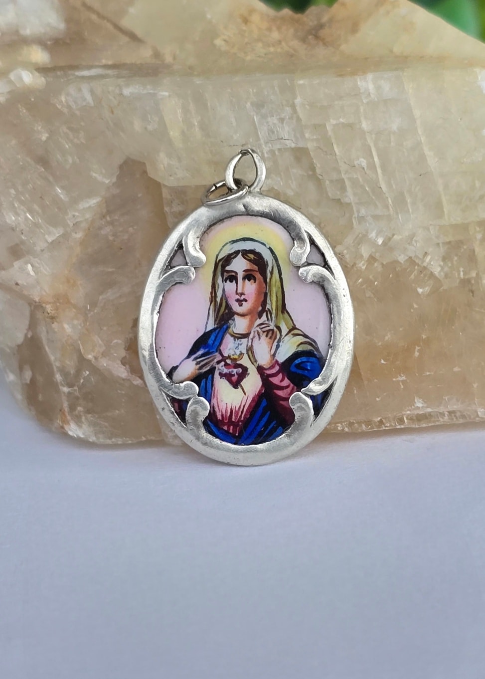 Medalion-iconiță "Maica Domnului cu Inima Neprihănită", vechi, devoțional, din argint, rar, de colecție, cu email pictat manual, inscripționat pe revers în limba germană: "Heilige Maria Mutter Gottes Bitte für Uns!" (Sfântă Maria, Maica lui Dumnezeu, roagă-te pentru noi!)