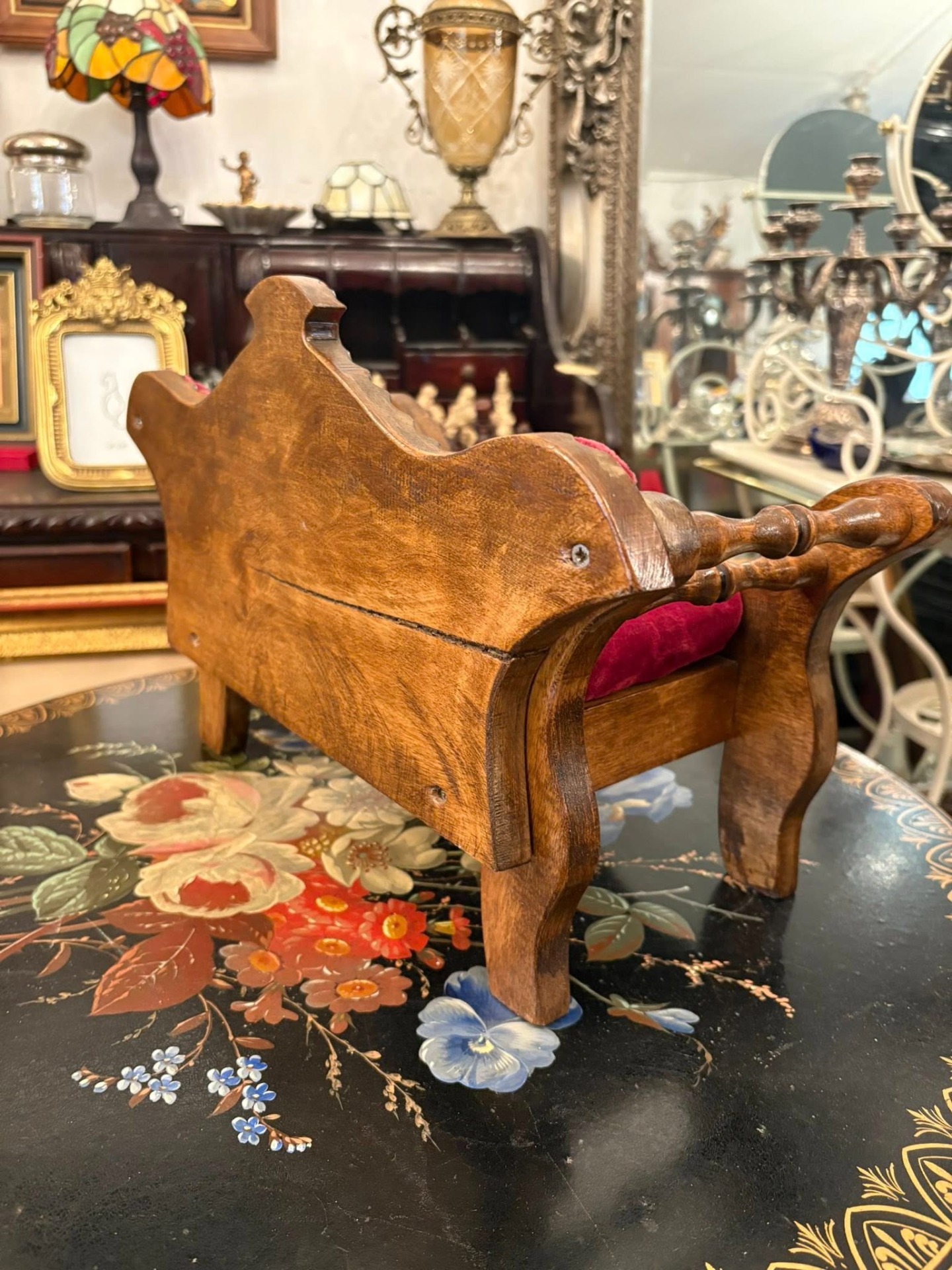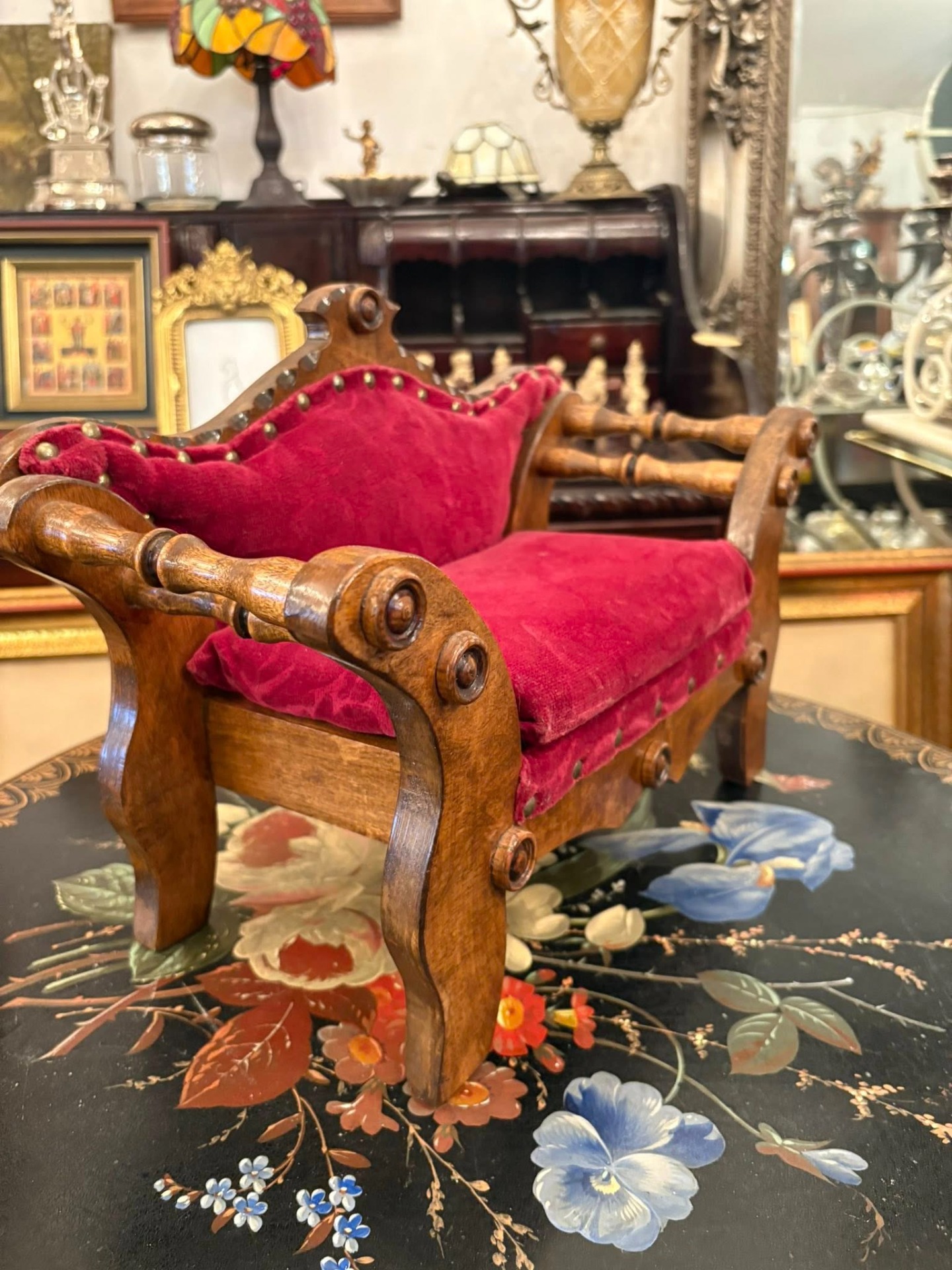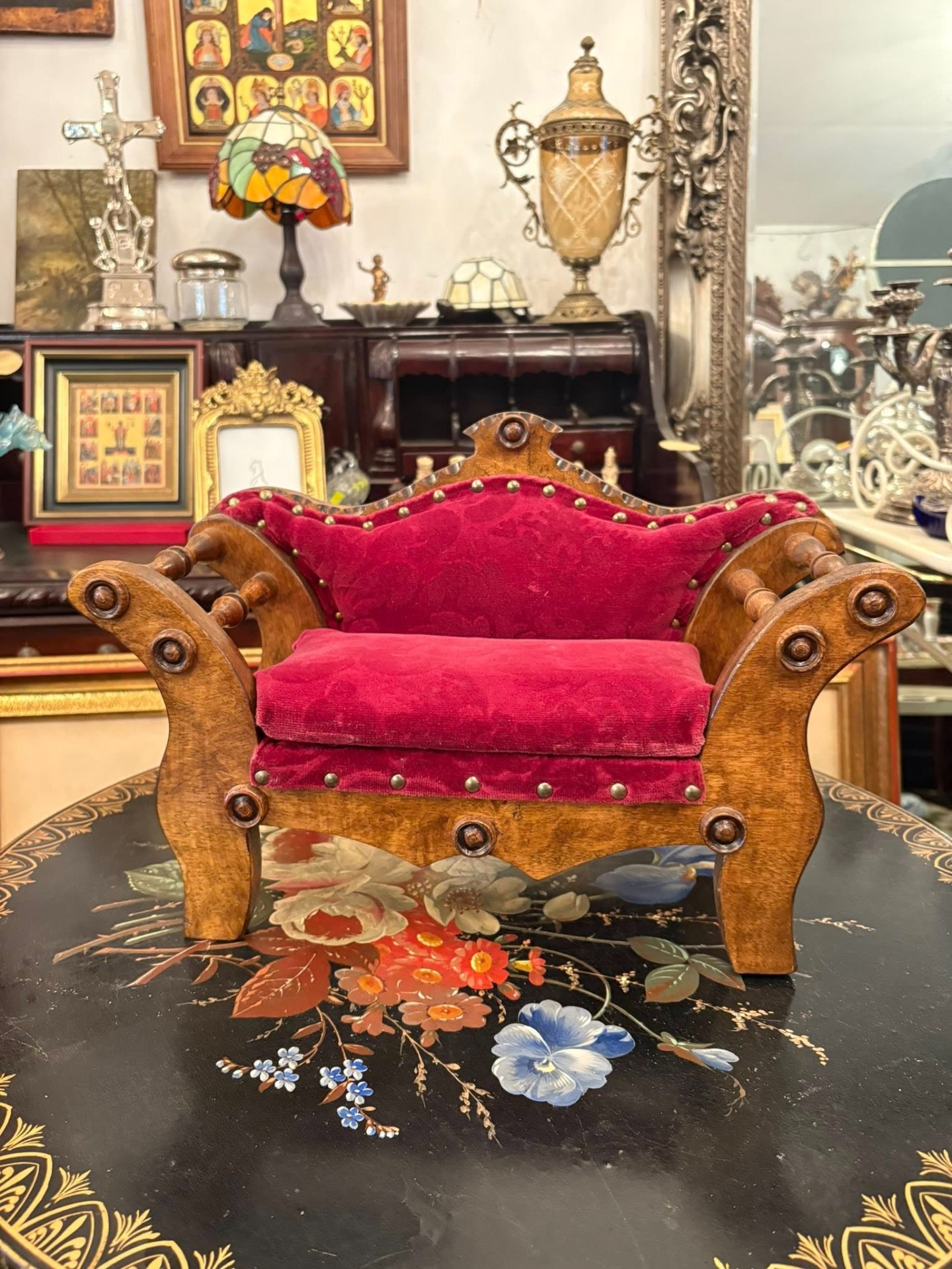 Mini-canapea vintage din lemn masiv, lucrată manual, cu tapițerie din catifea roșie și detalii decorative în stil victorian, ideală ca piesă decorativă sau