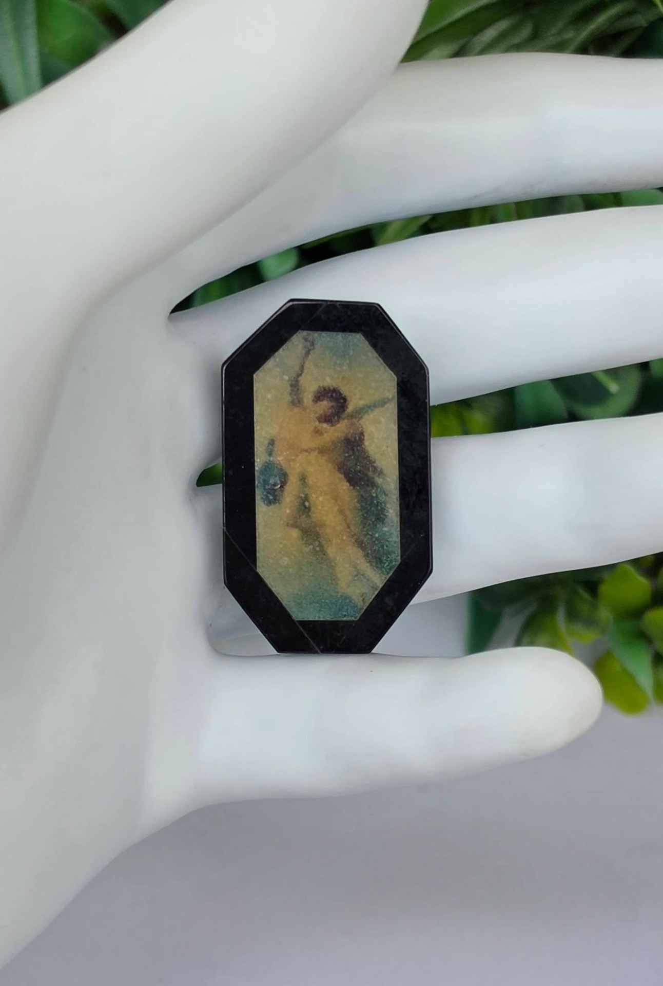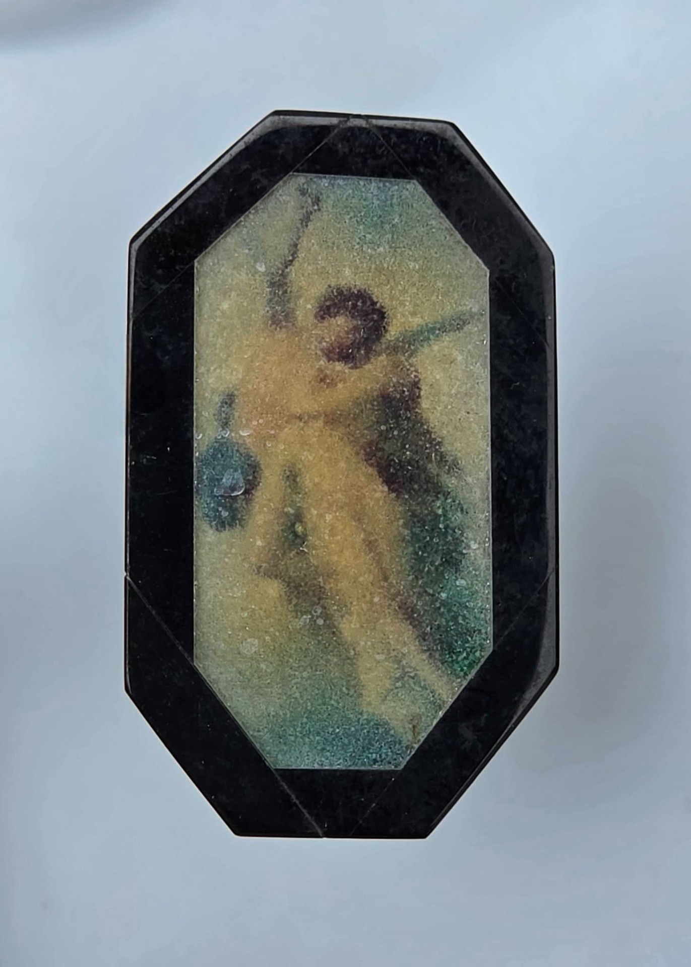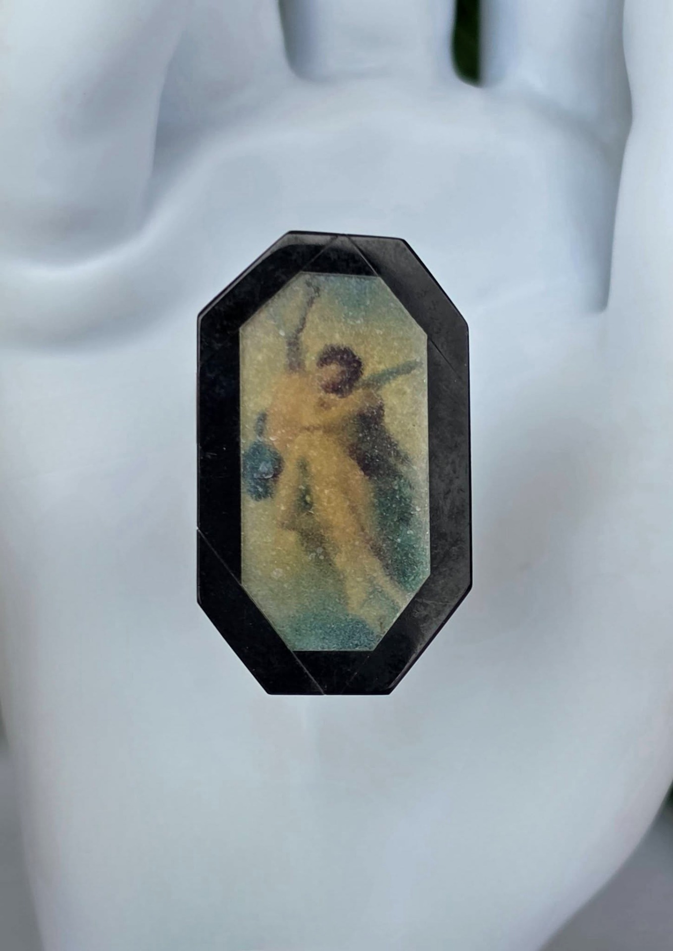 Miniatură cu tematică "Cupidon și Psyche îmbrățișați", un mit clasic despre iubire, din obsidian negru cu intarsie din cuarț alb translucid.