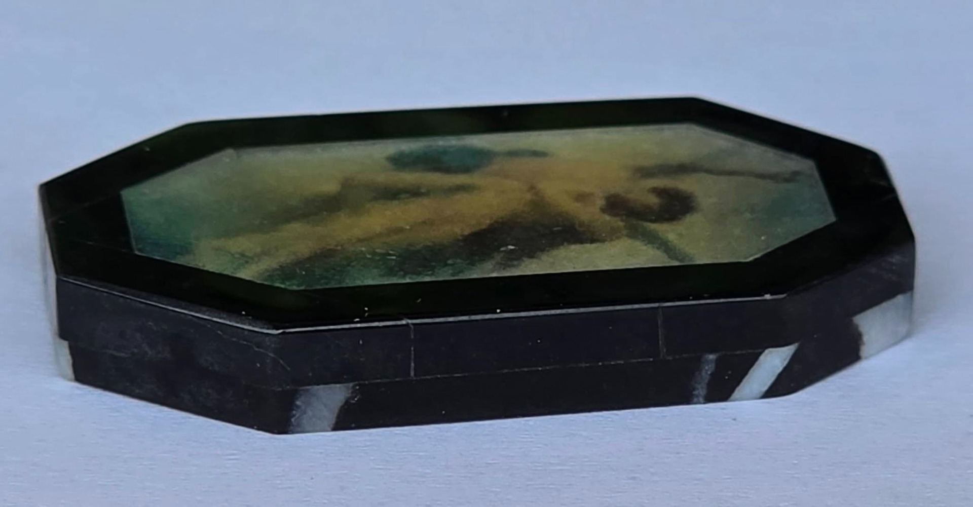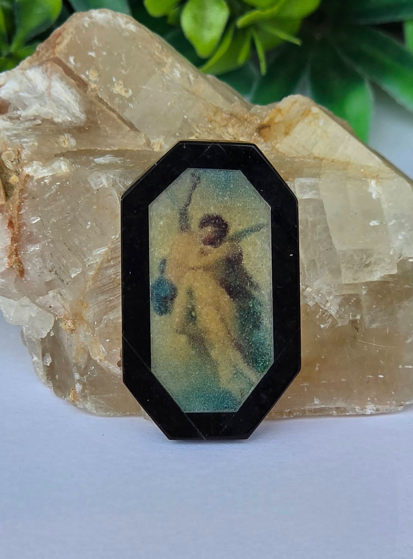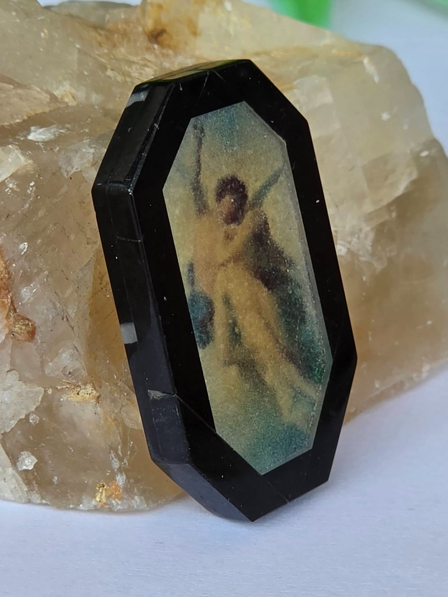 Miniatură cu tematică "Cupidon și Psyche îmbrățișați", un mit clasic despre iubire, din obsidian negru cu intarsie din cuarț alb translucid.