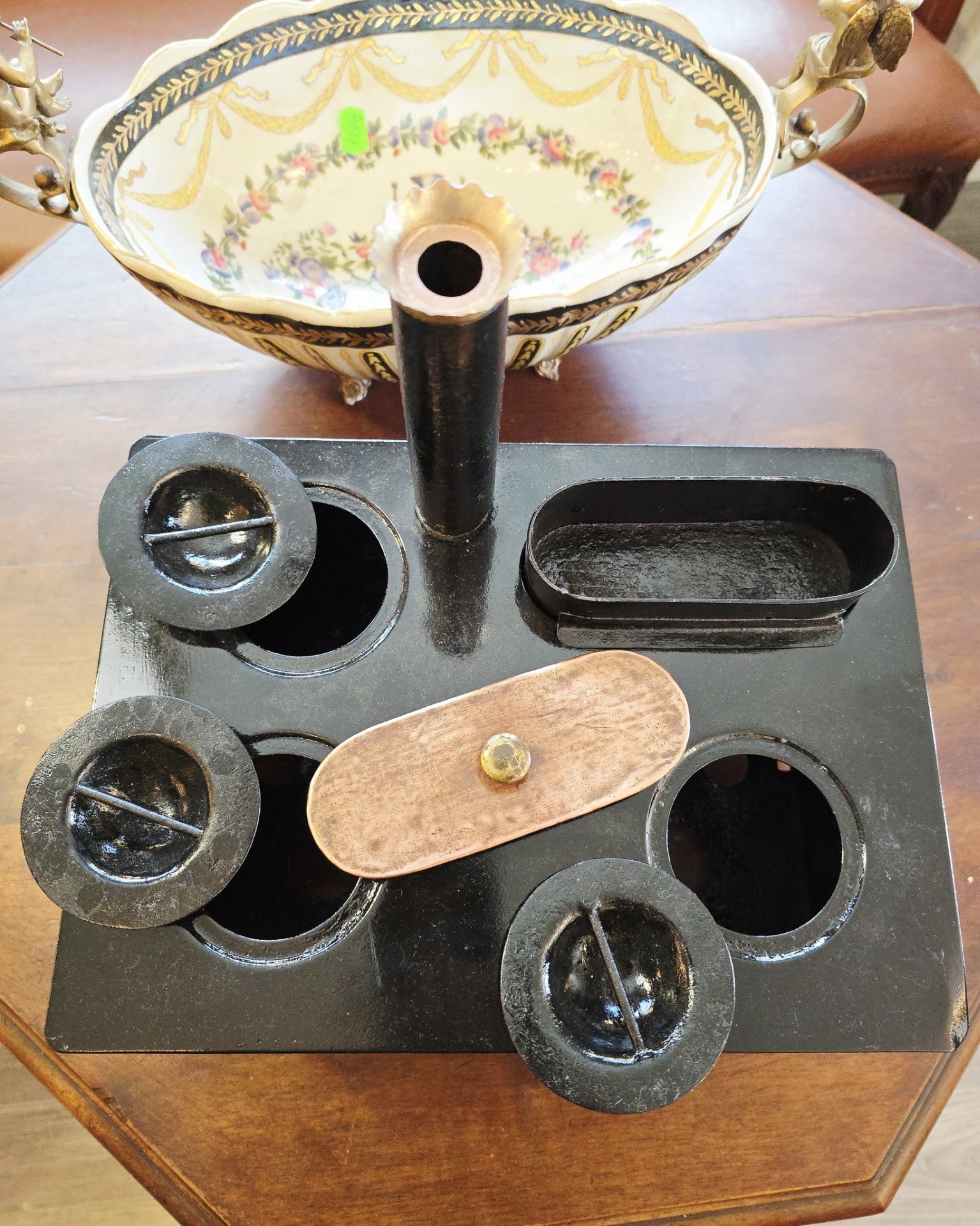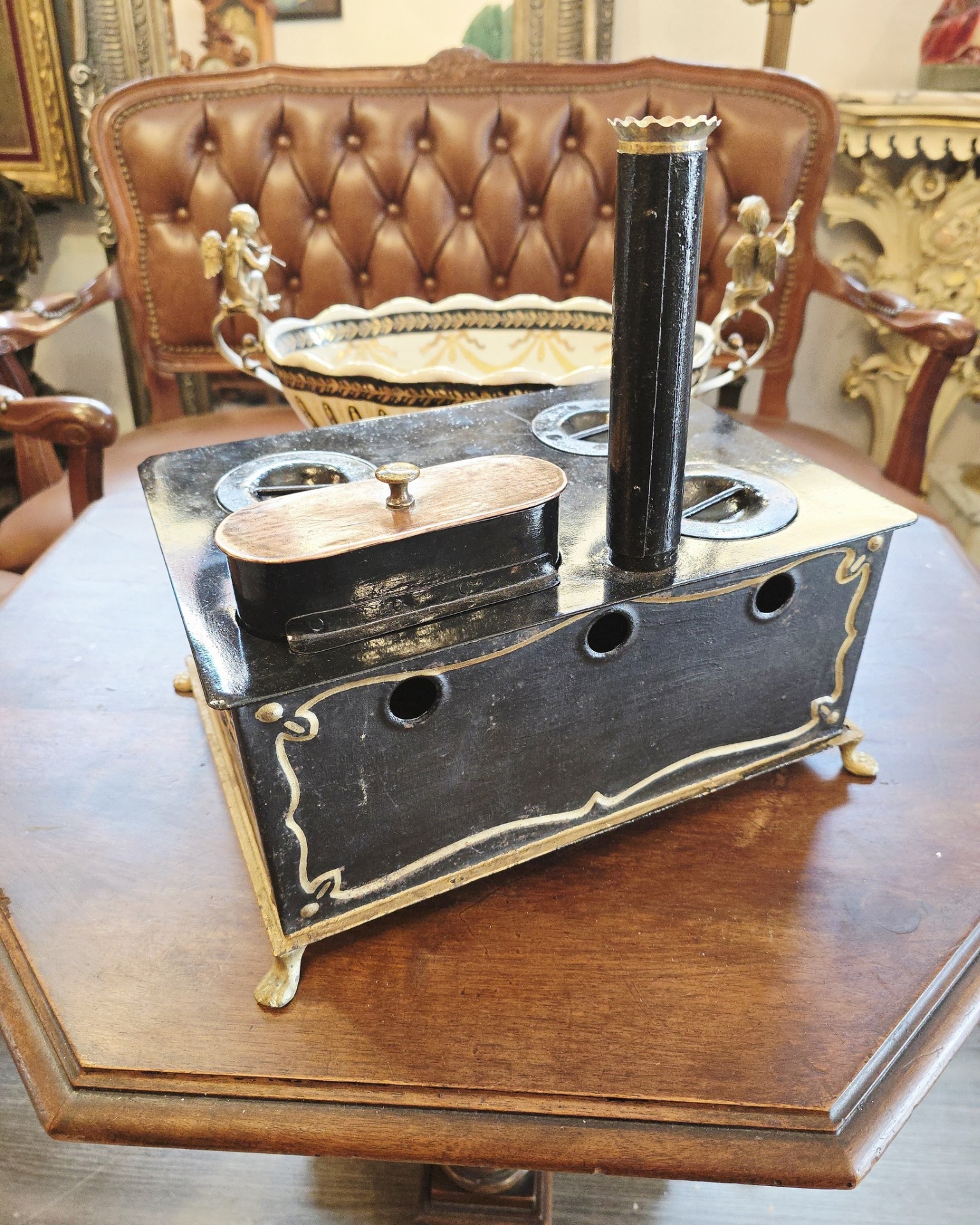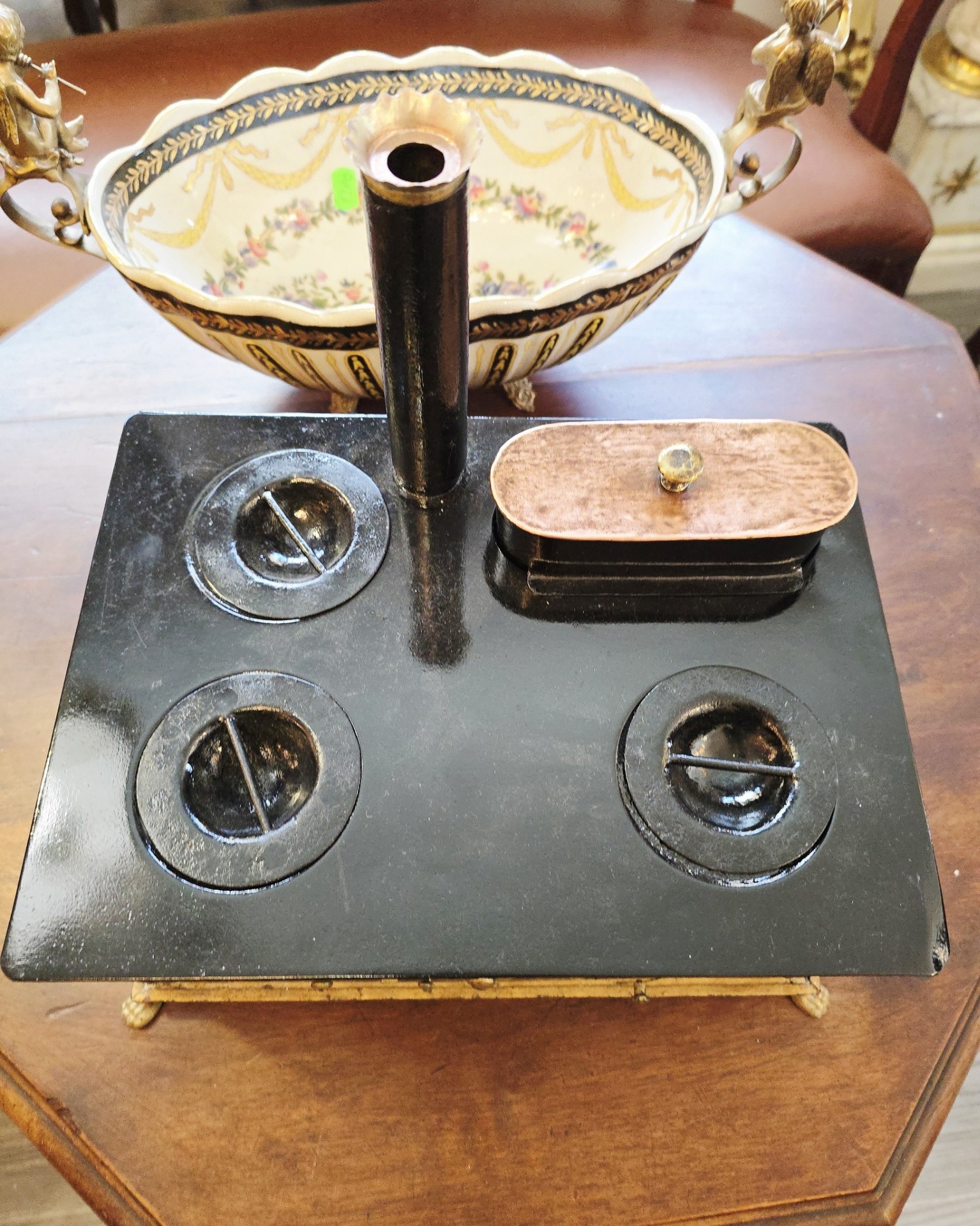 Material tabla emailata si pictata,piciorele din alama cabriole