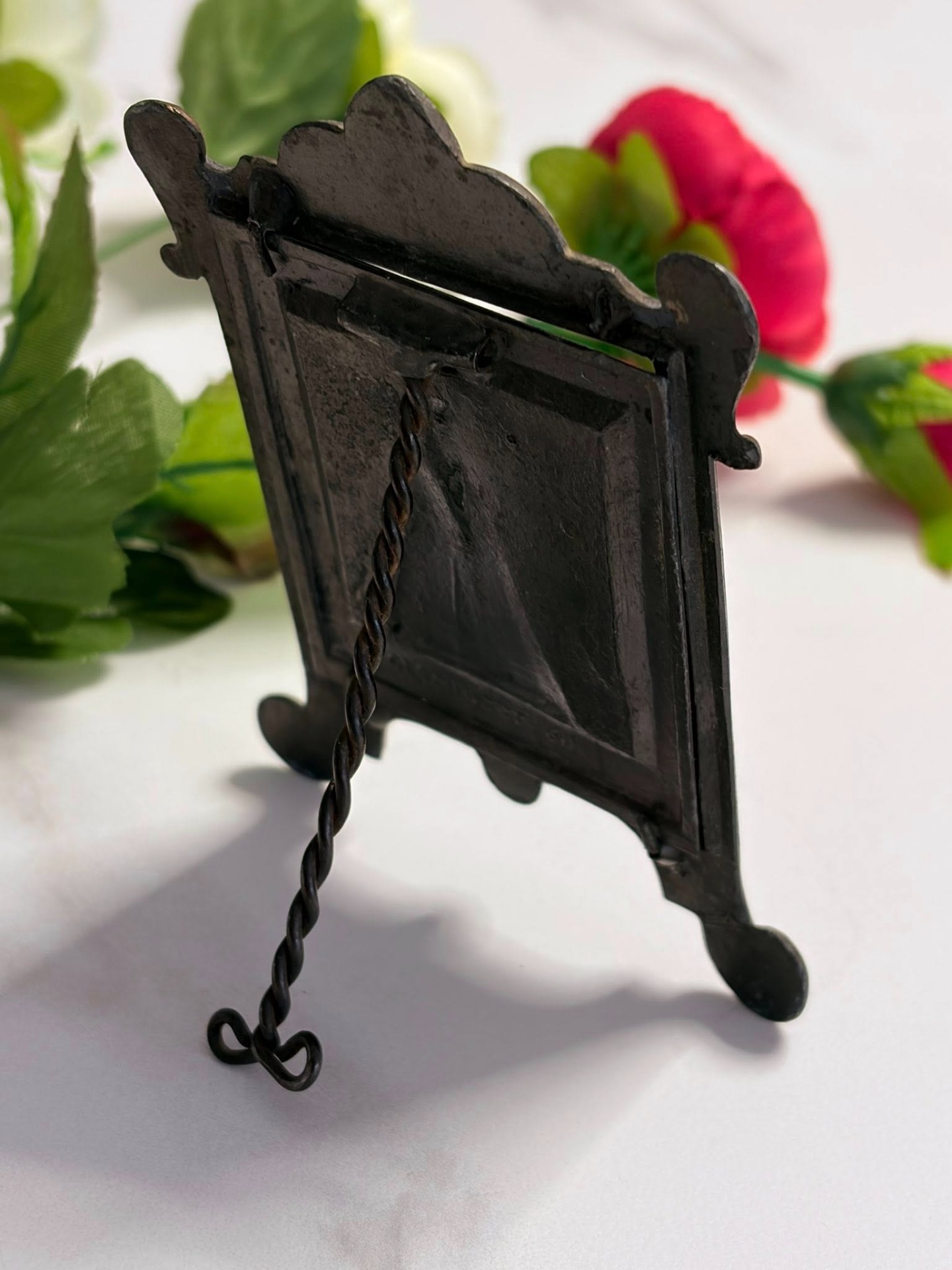 • Design: Ramă decorată cu volute și suport original tip șevalet, stabil.