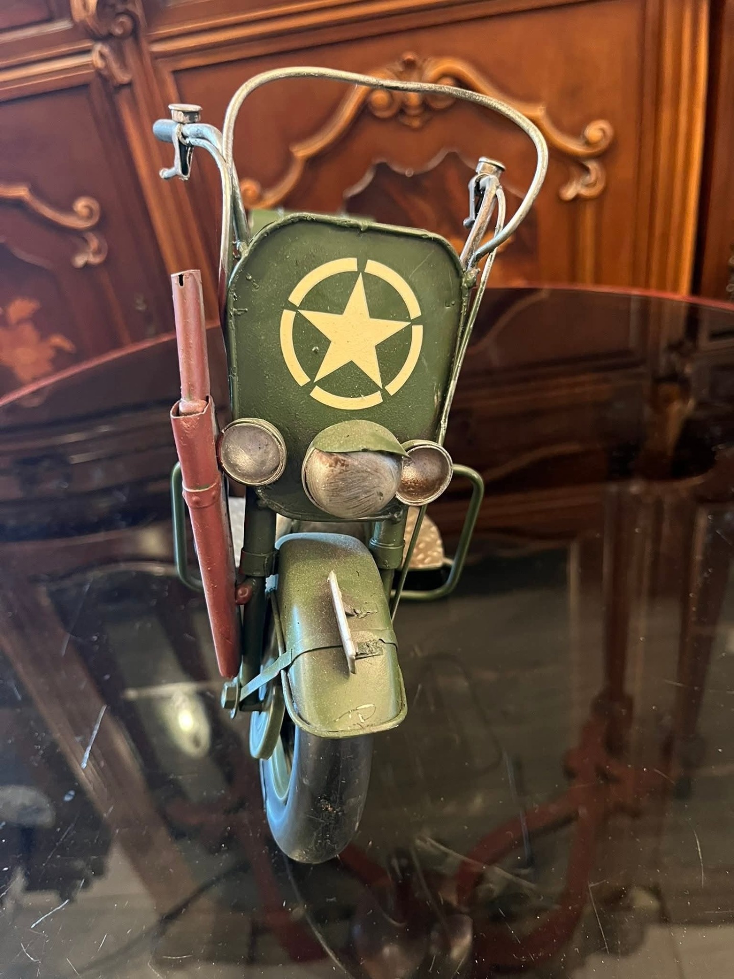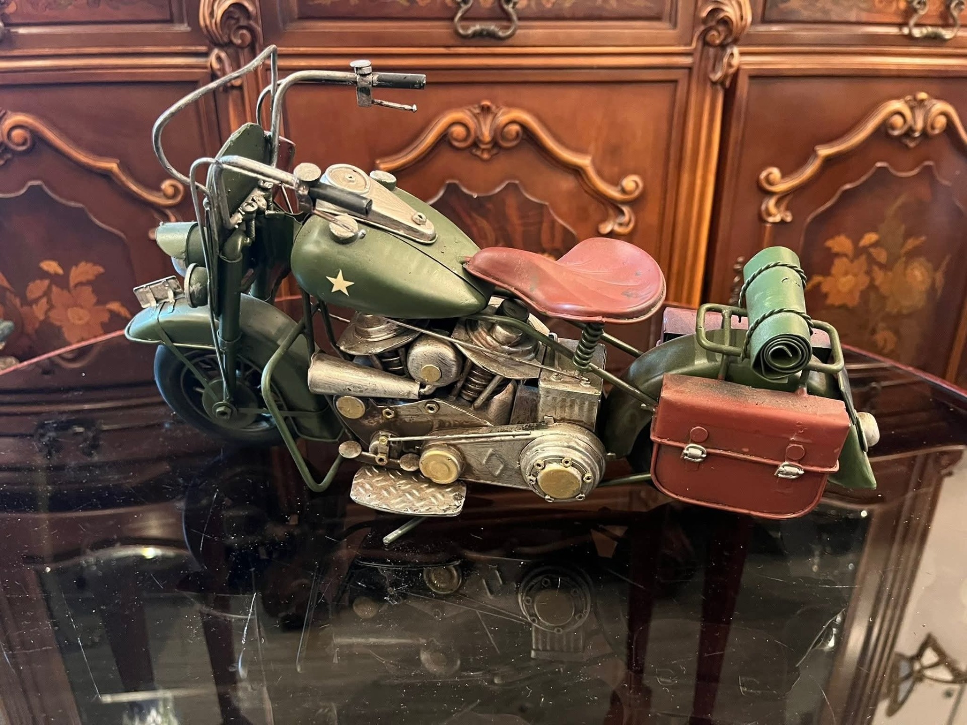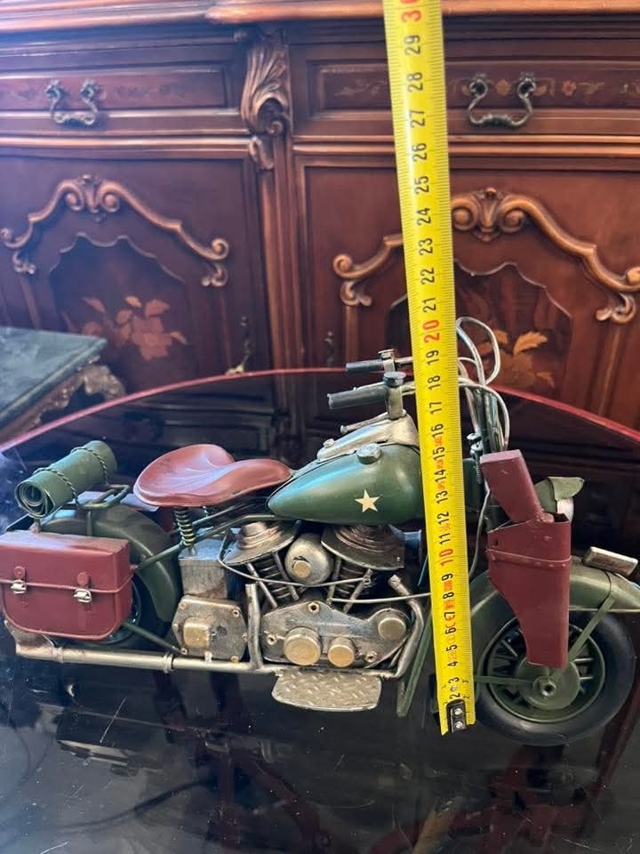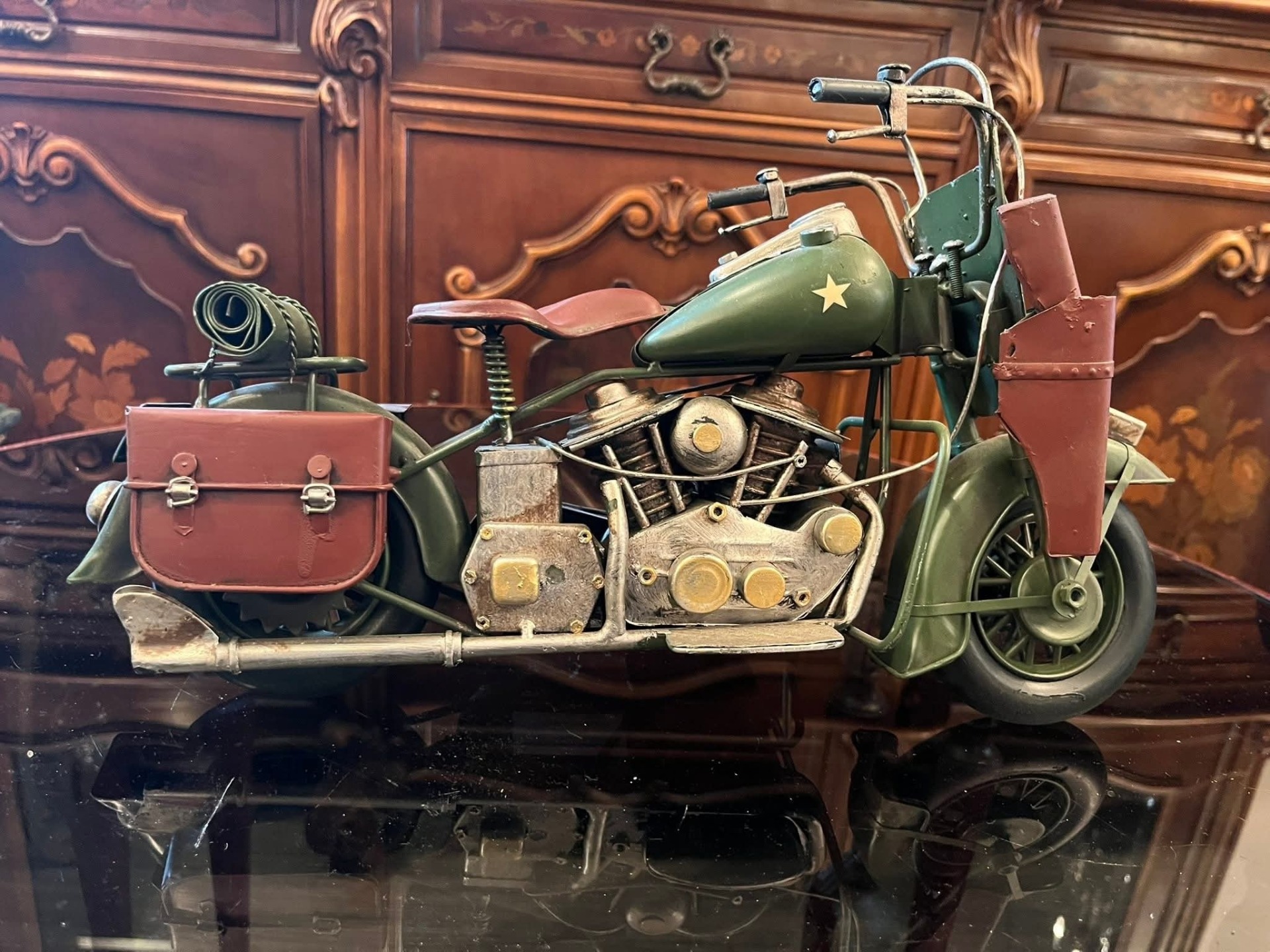 Motocicletă decorativă stil vintage/militar, realizată din metal, cu detalii atent lucrate. Model inspirat din motocicletele militare americane din perioada celui de-al Doilea Război Mondial, vopsită în verde olive, cu simbol stea și accesorii specifice: genți laterale, bidon, rolă, faruri, ghidon, motor detaliat etc.