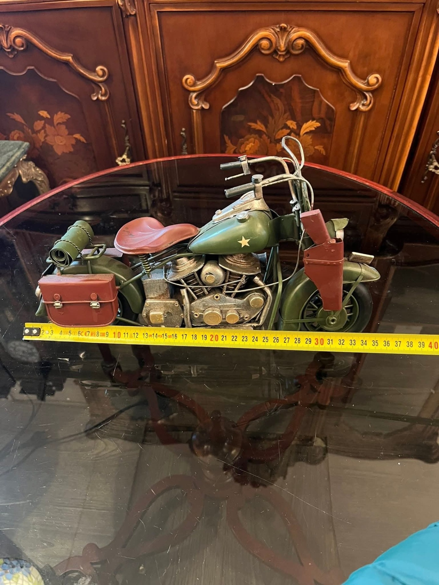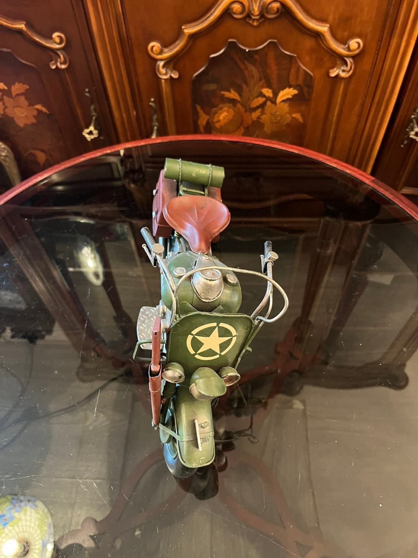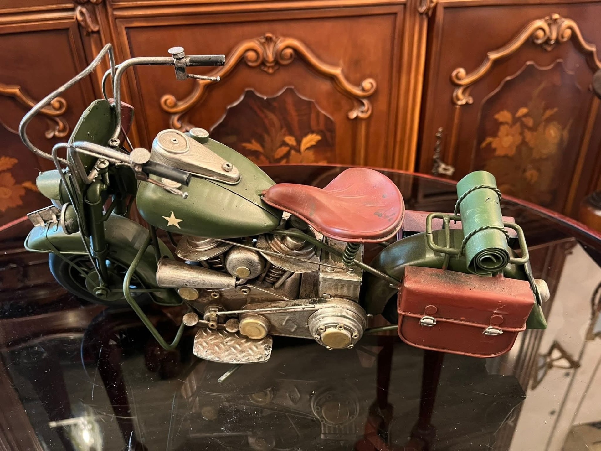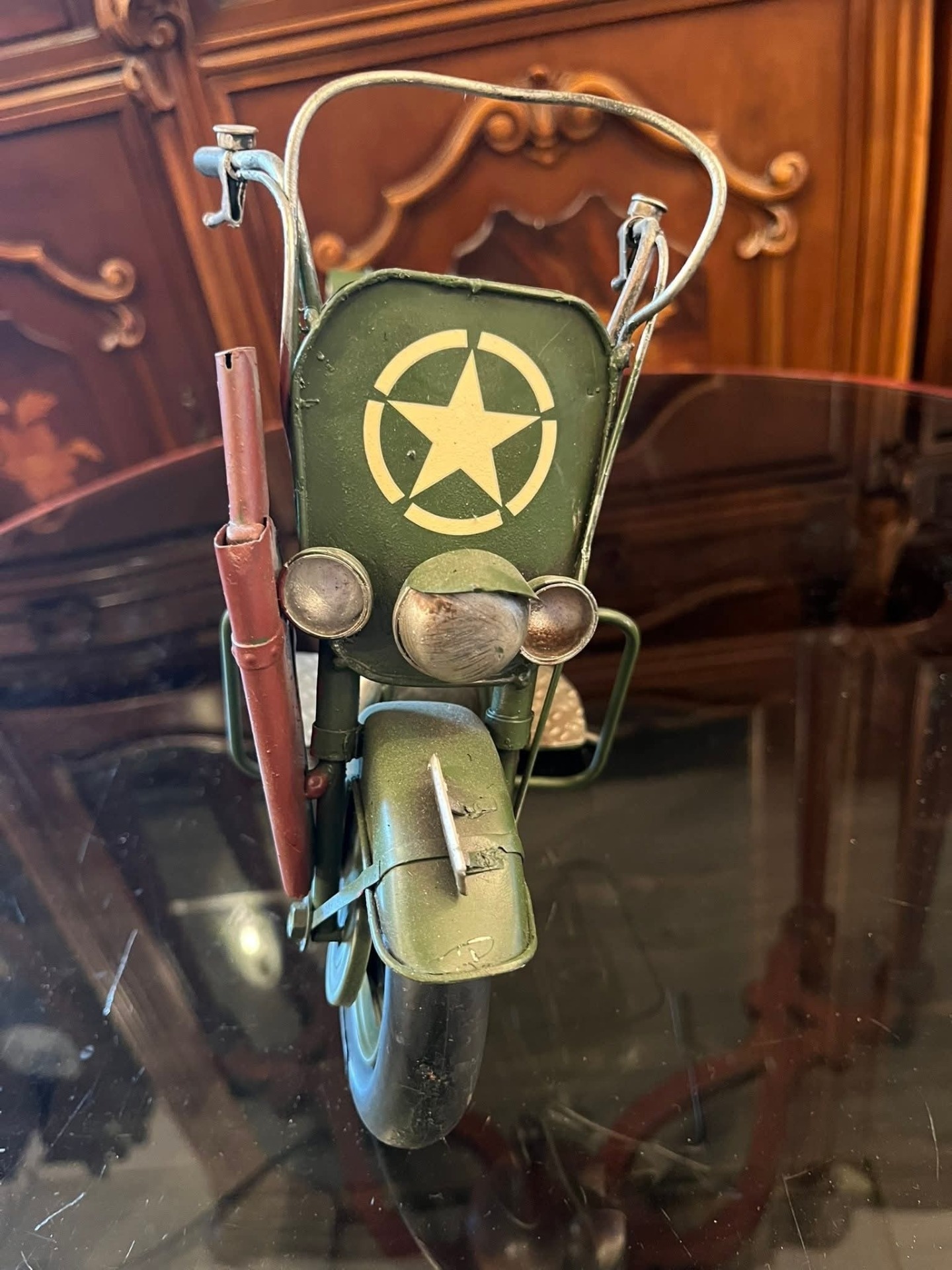 Motocicletă decorativă stil vintage/militar, realizată din metal, cu detalii atent lucrate. Model inspirat din motocicletele militare americane din perioada celui de-al Doilea Război Mondial, vopsită în verde olive, cu simbol stea și accesorii specifice: genți laterale, bidon, rolă, faruri, ghidon, motor detaliat etc.