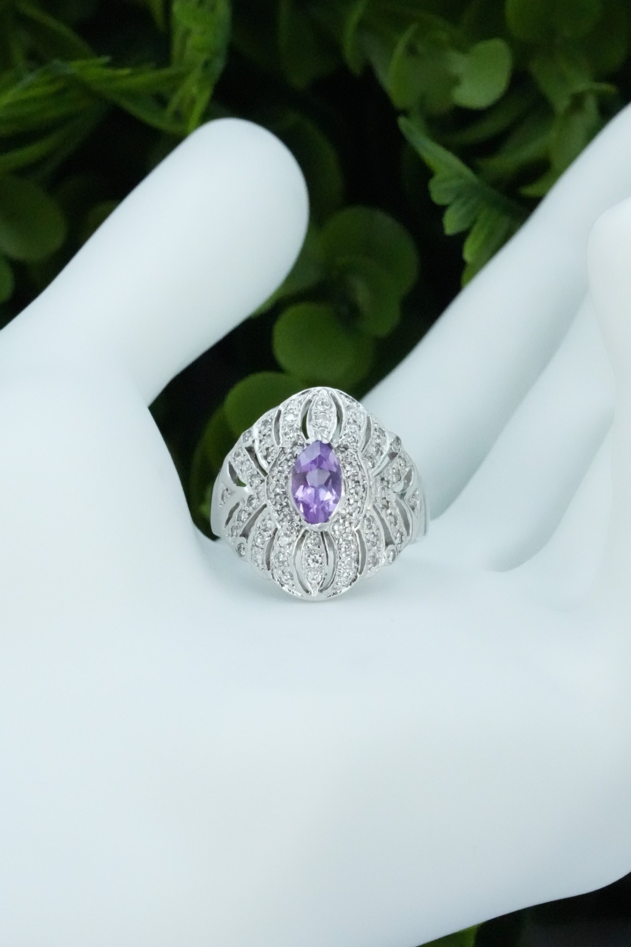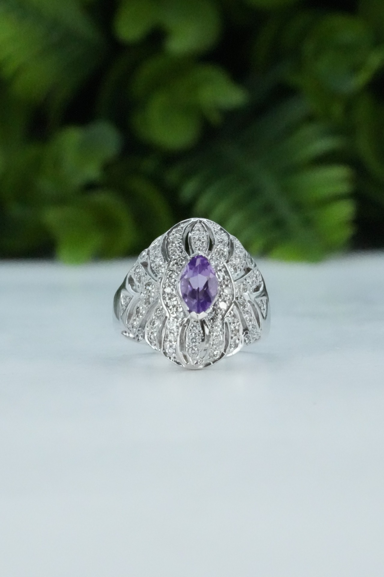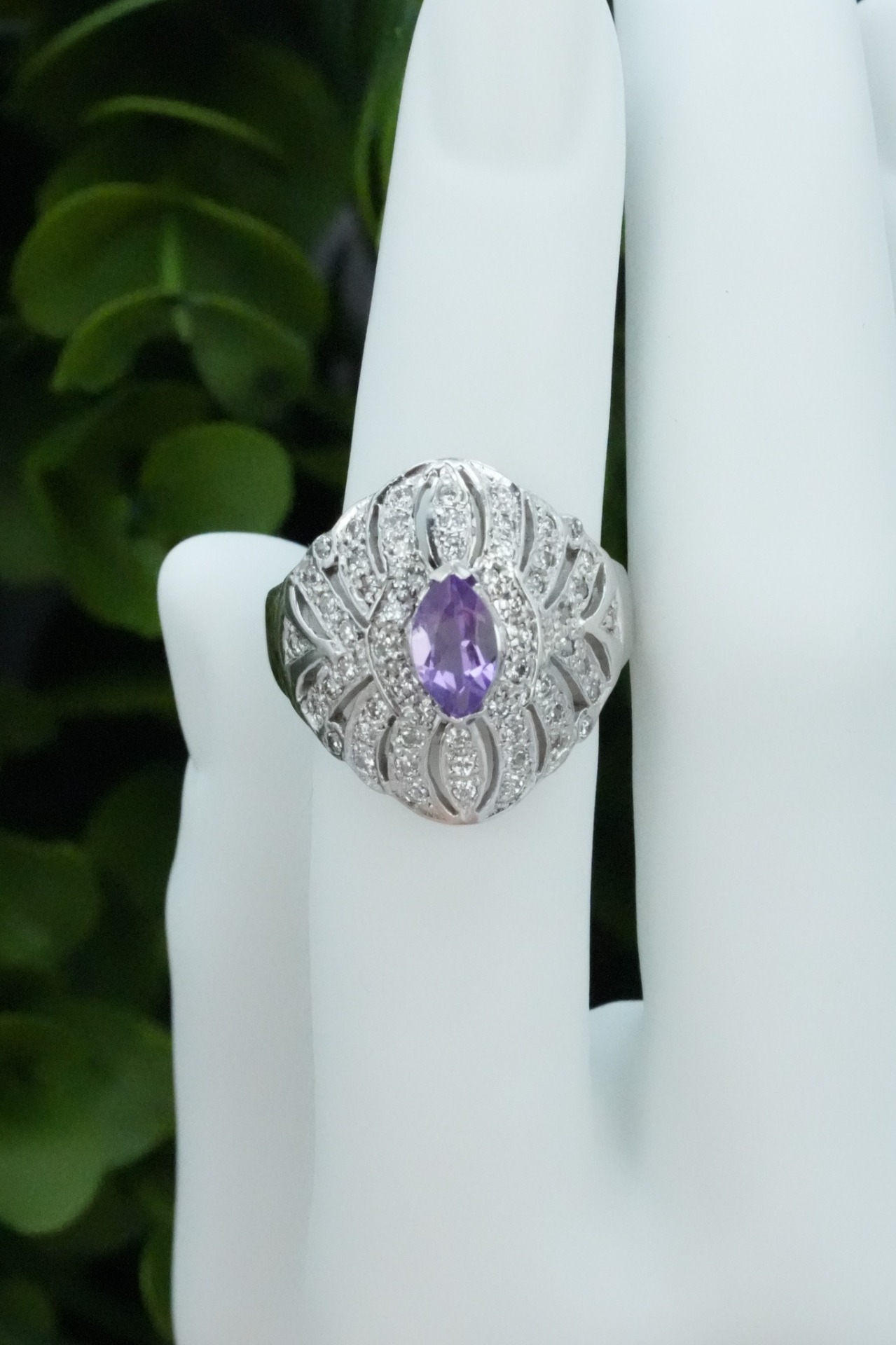 Inel vechi din argint, cu ametist natural și pietre cubic zirconia.