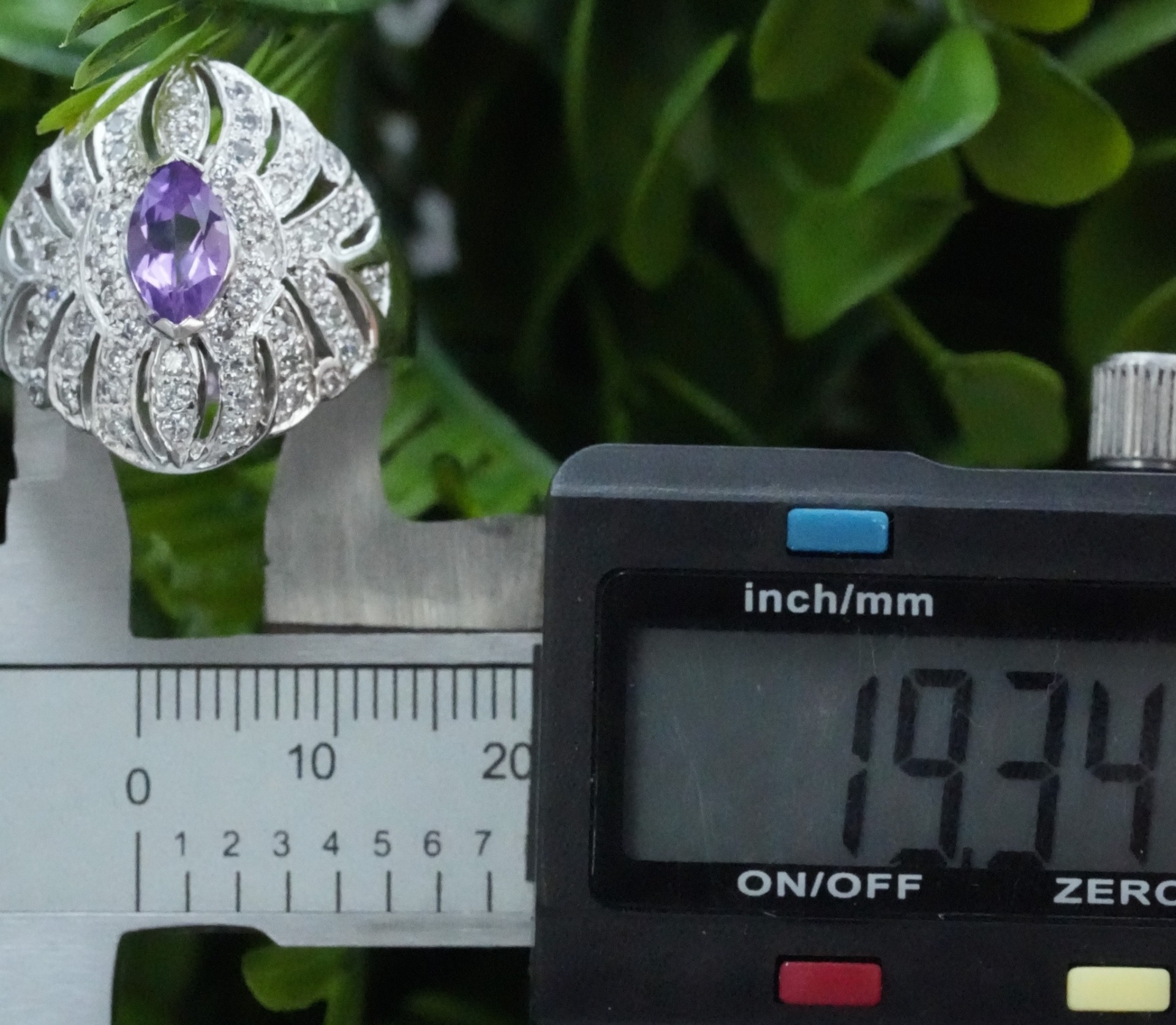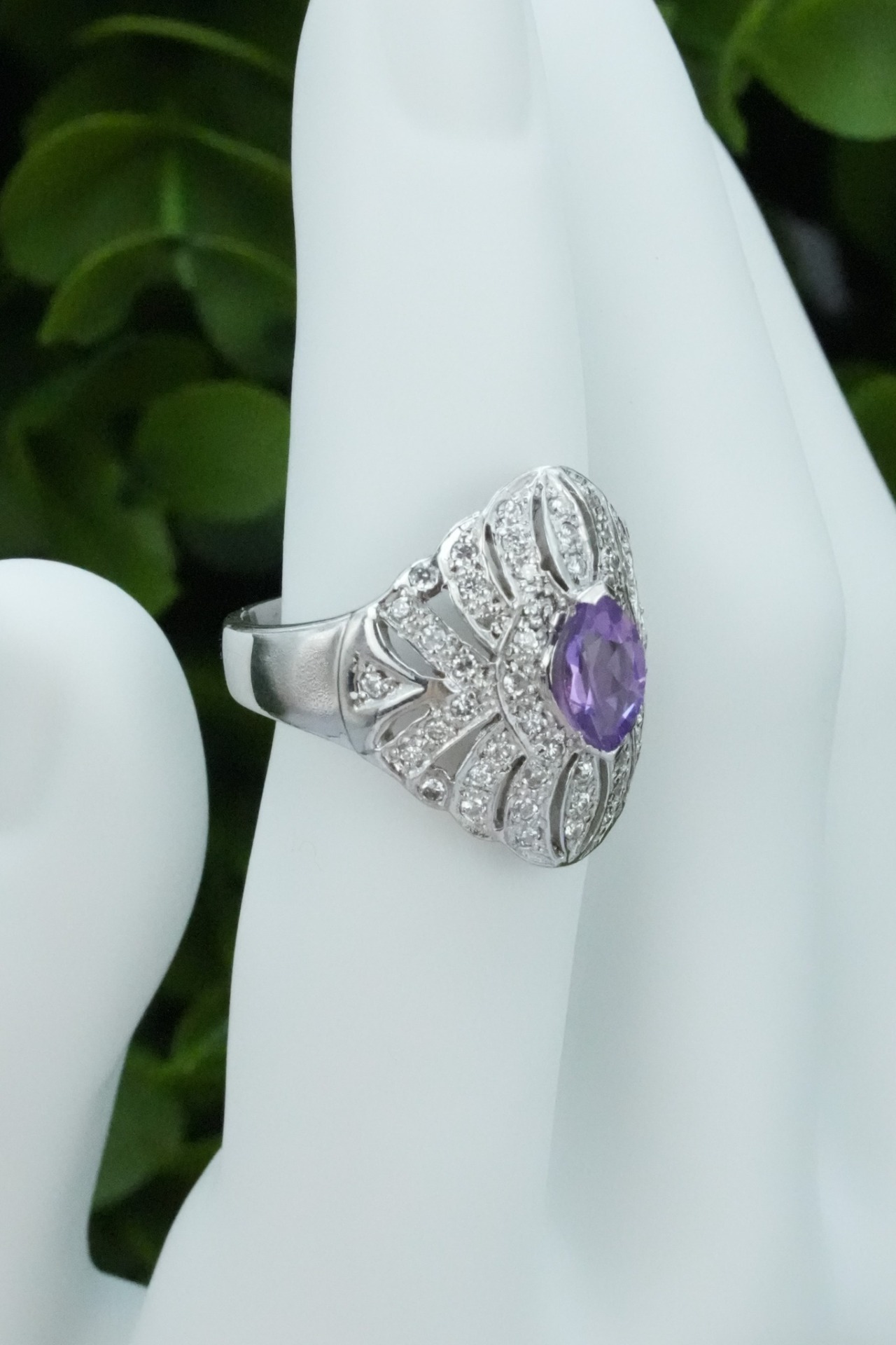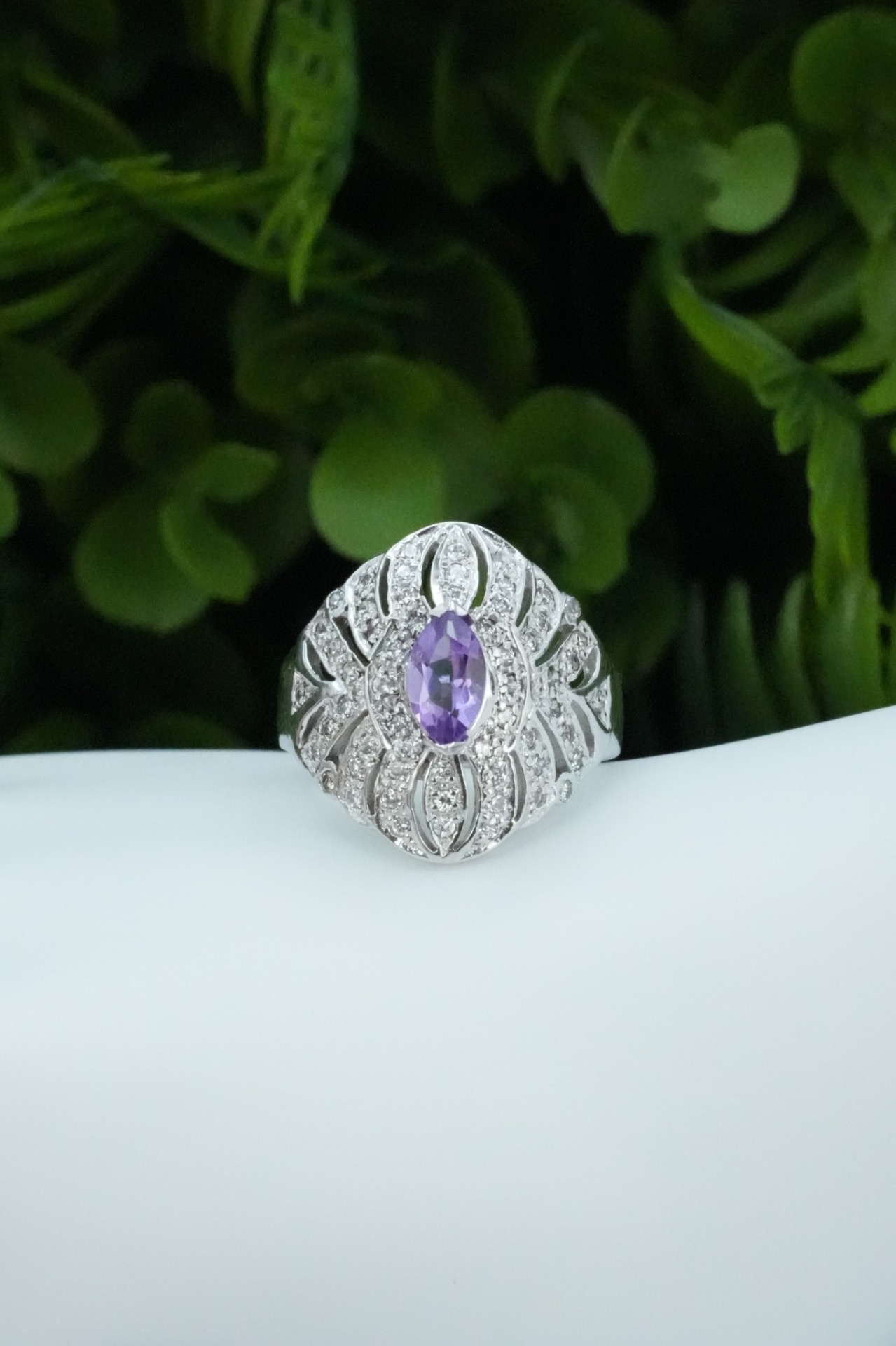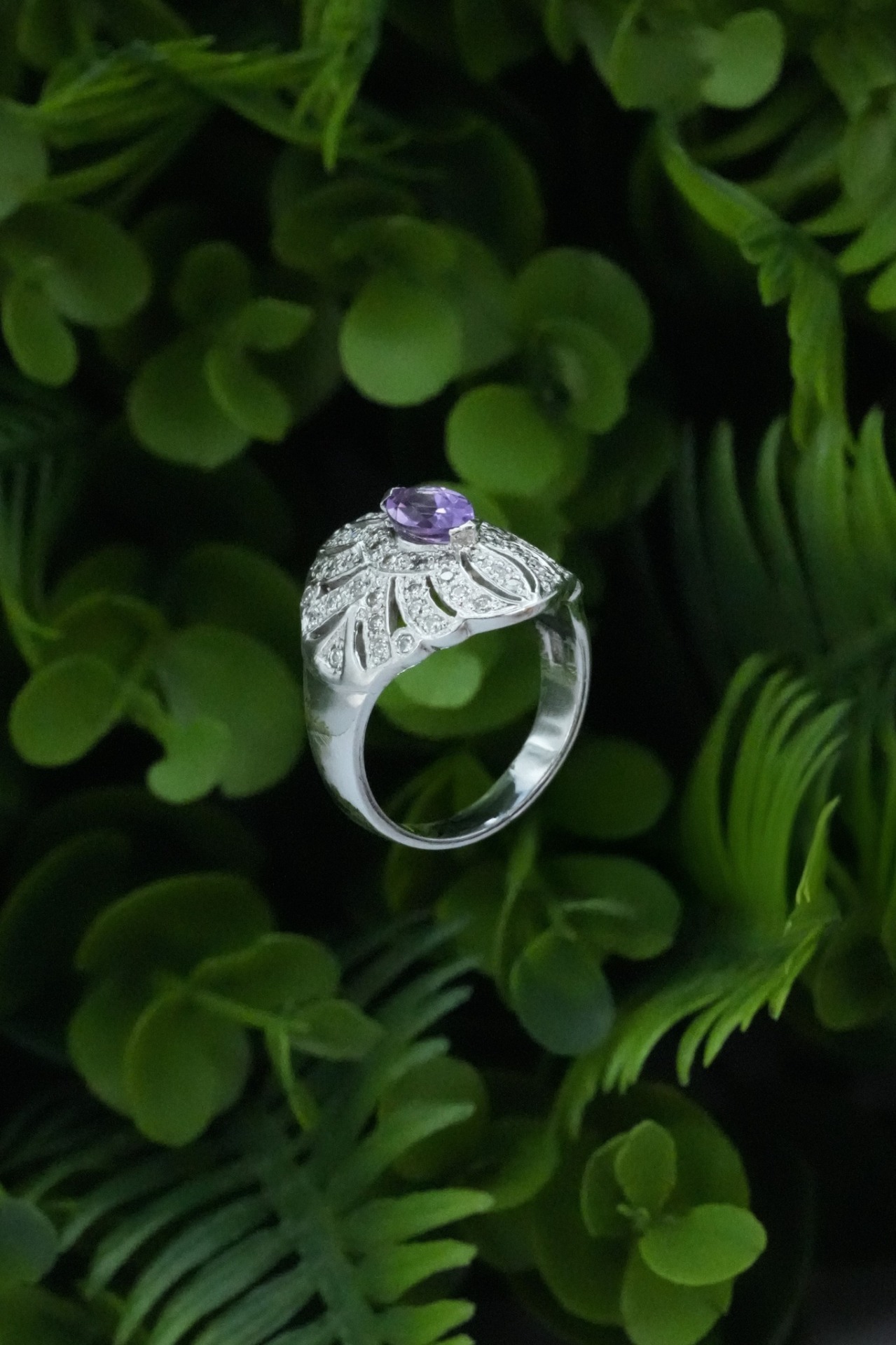 Inel vechi din argint, cu ametist natural și pietre cubic zirconia.