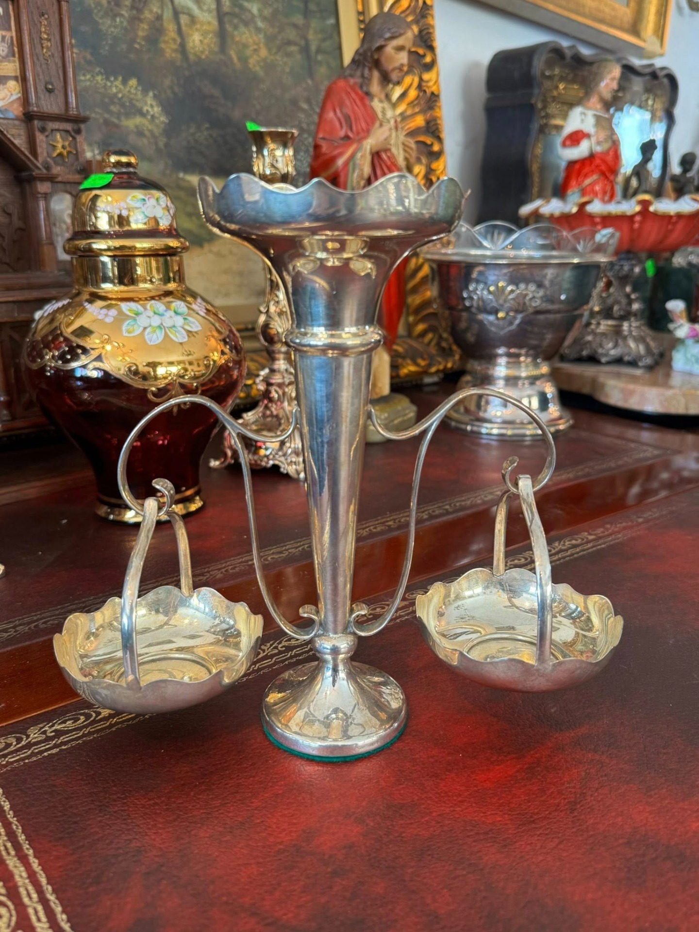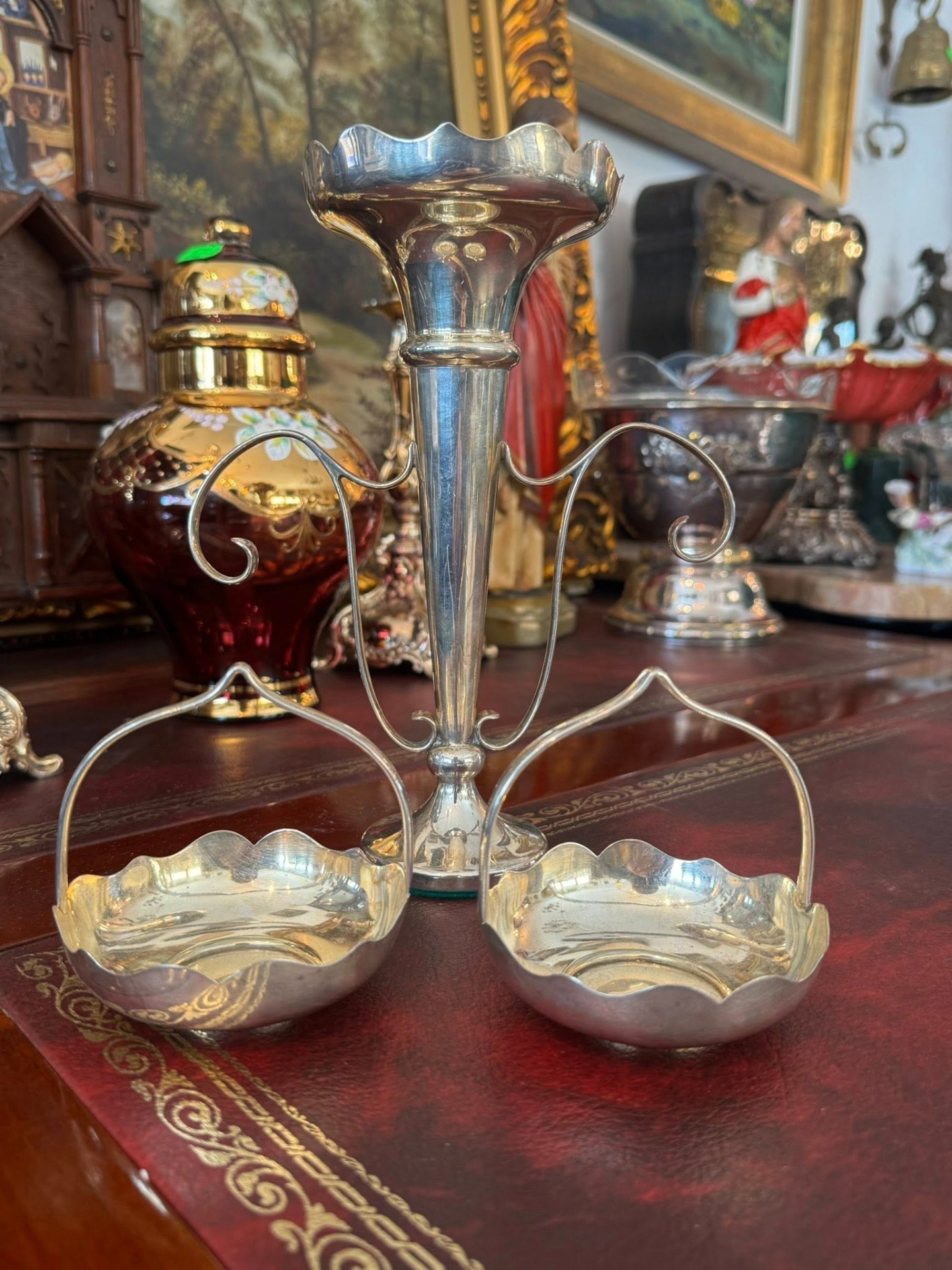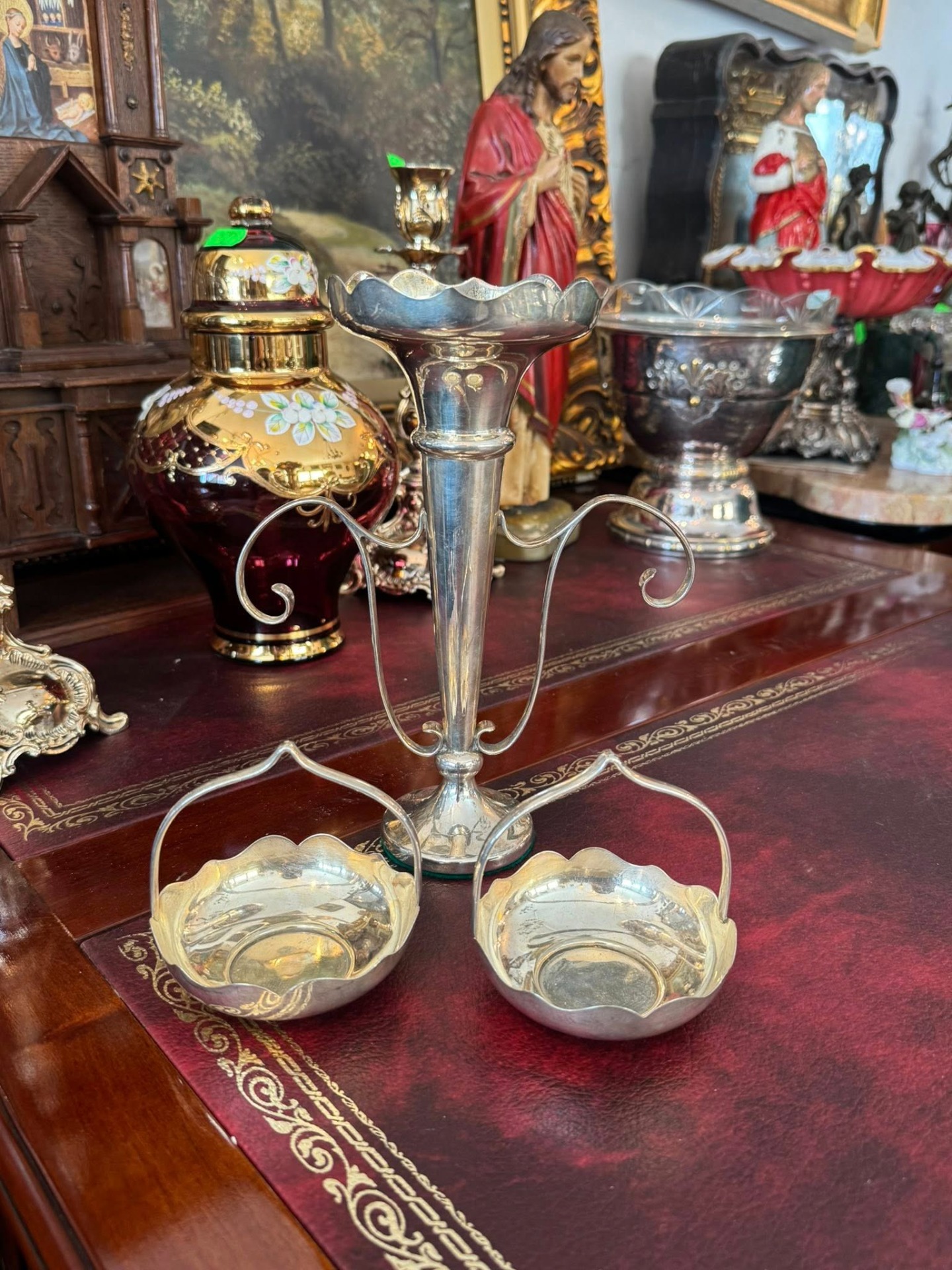 În epoca victoriană sau la începutul secolului XX, astfel de piese erau folosite pe masa de prânz: vaza centrală pentru decor floral, iar coșulețele laterale pentru bonboane, nuci, zahăr sau sare.