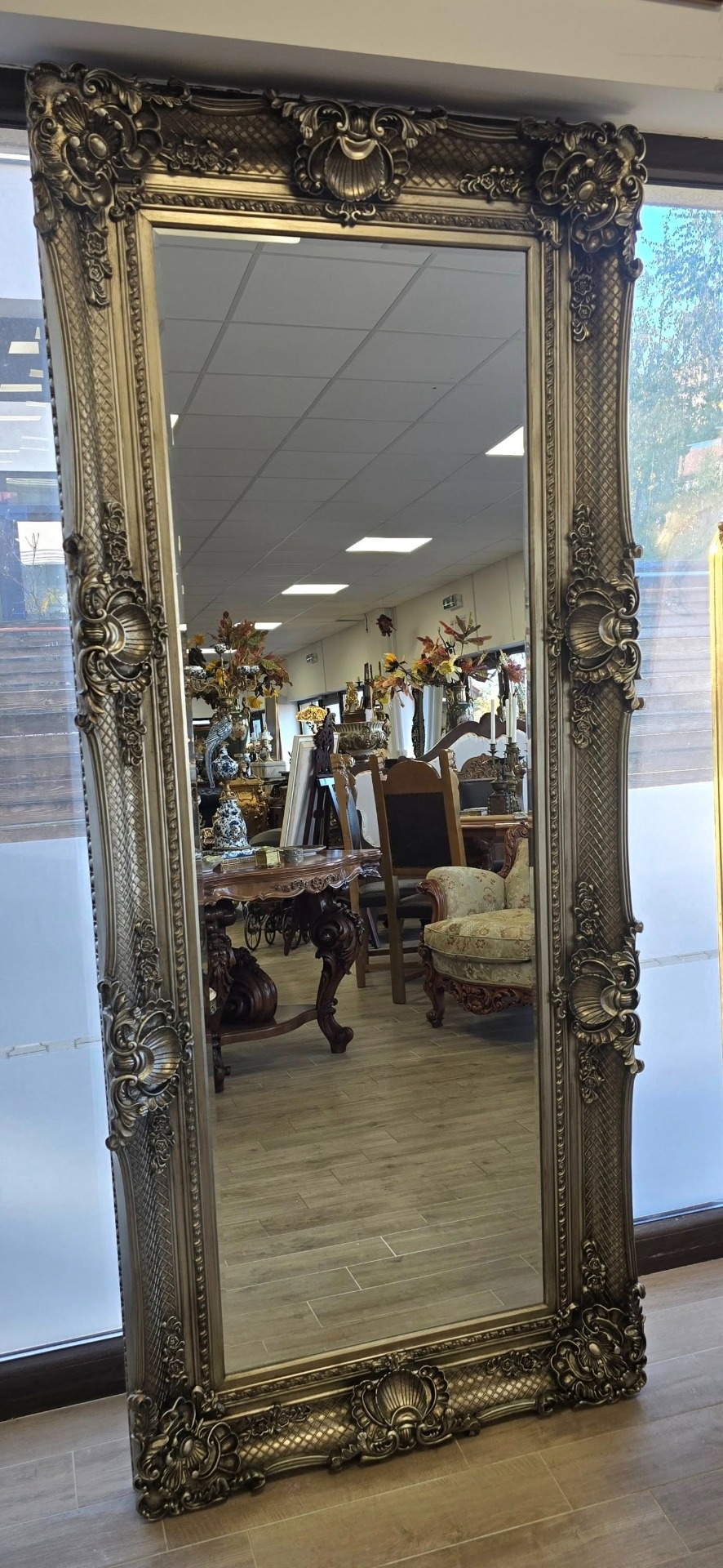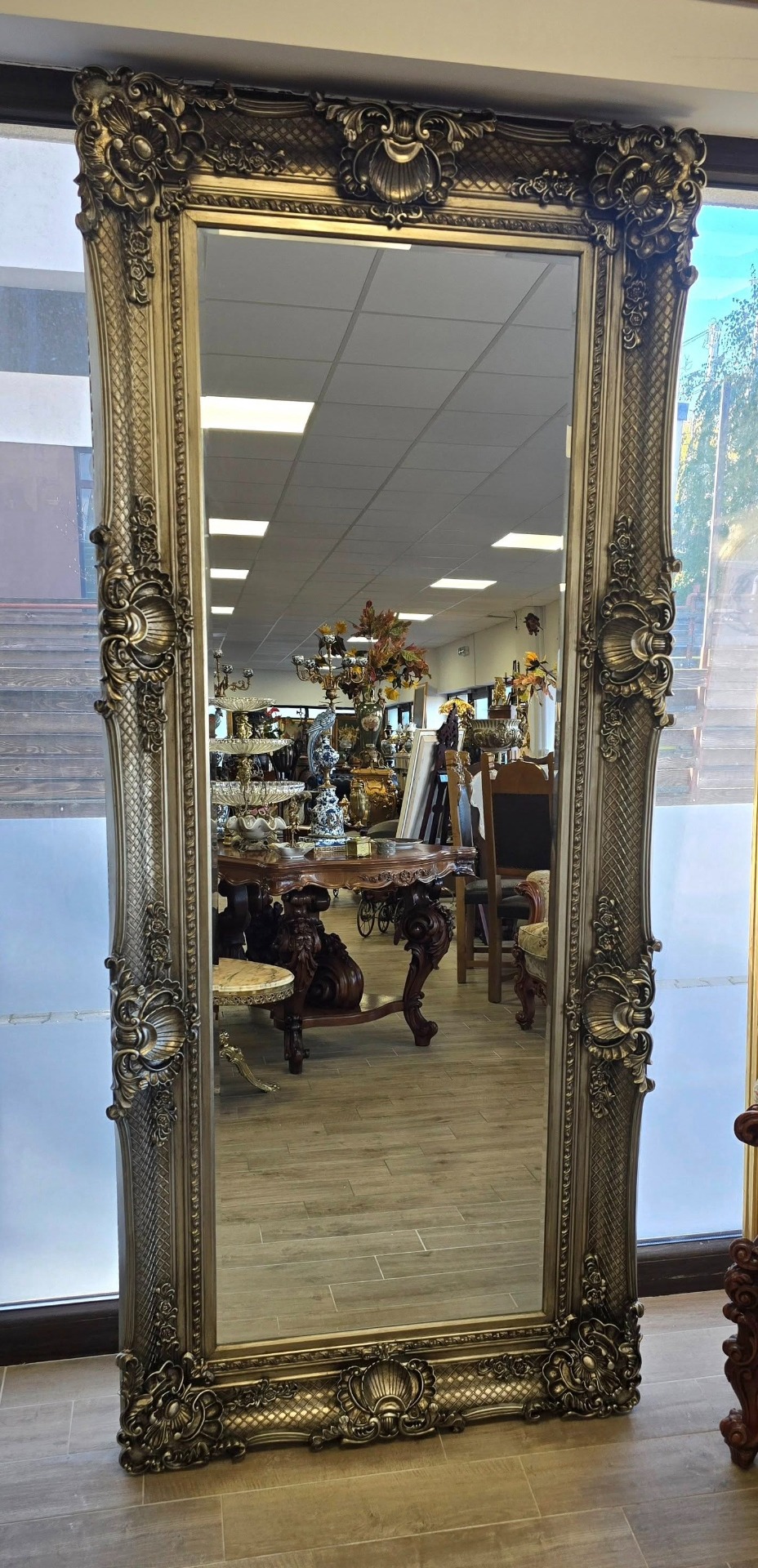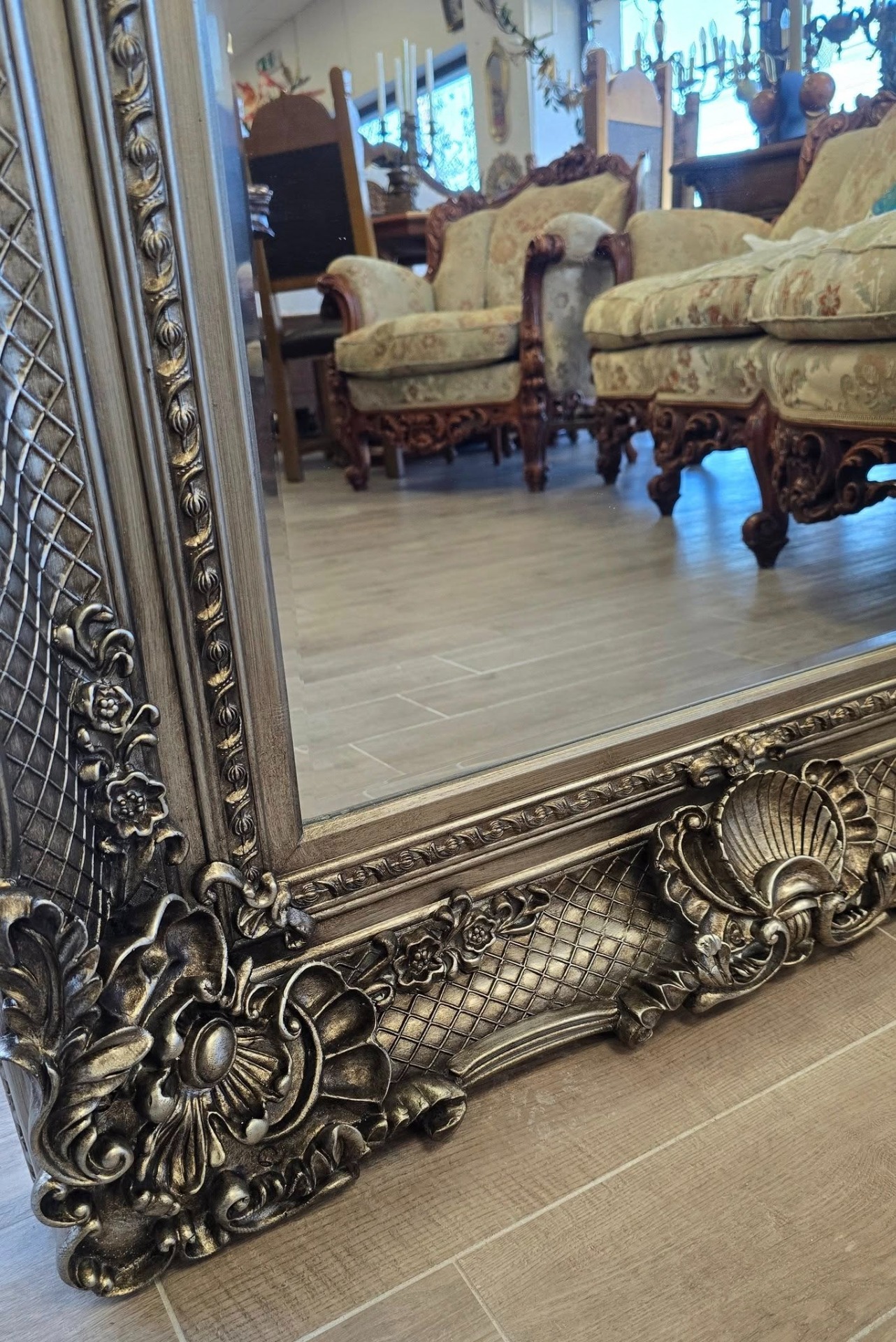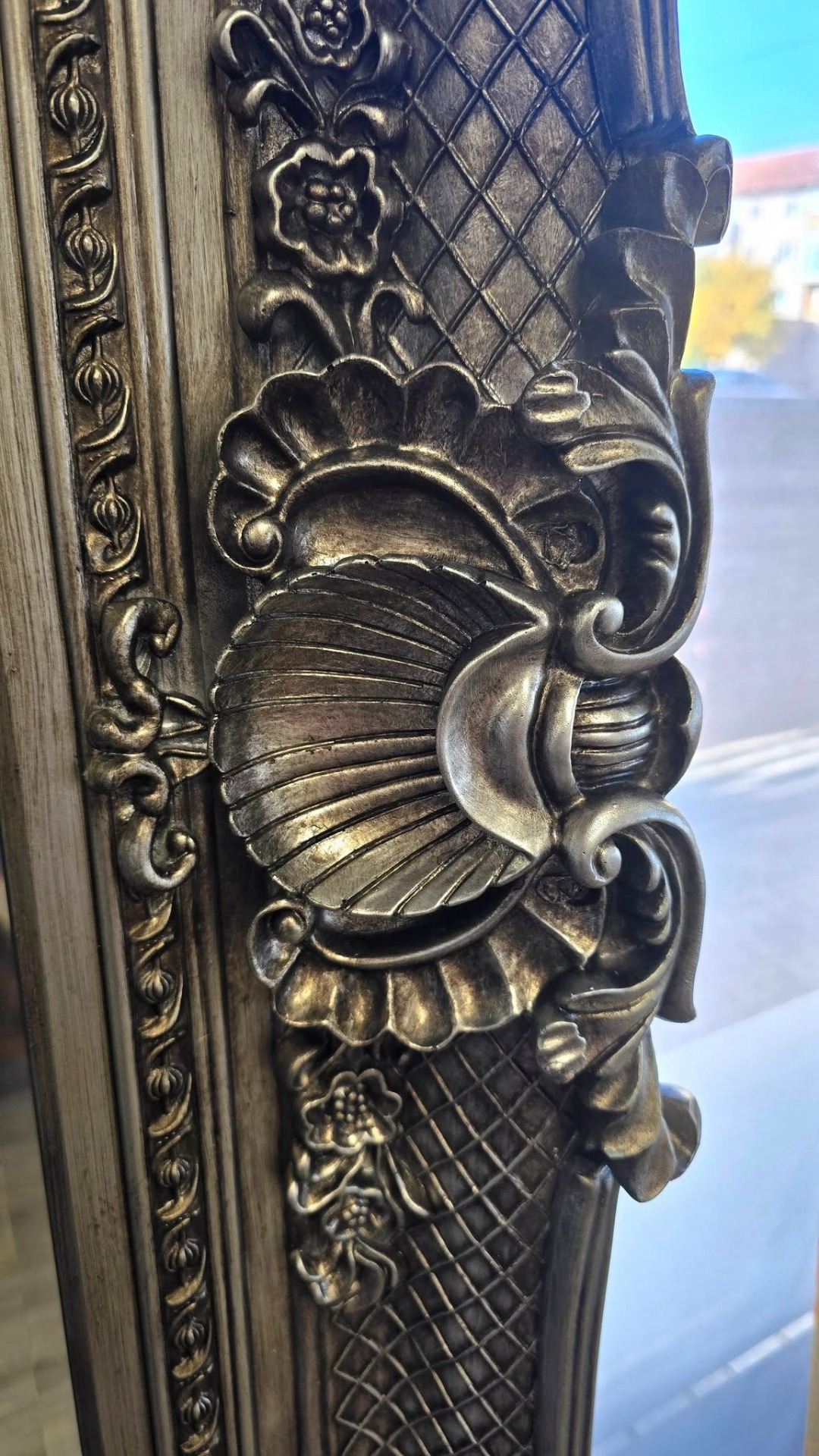 Oglinda deosebită, cu ramă argintie, în stil baroc.