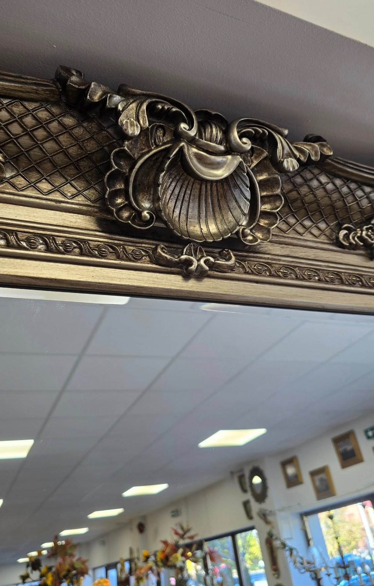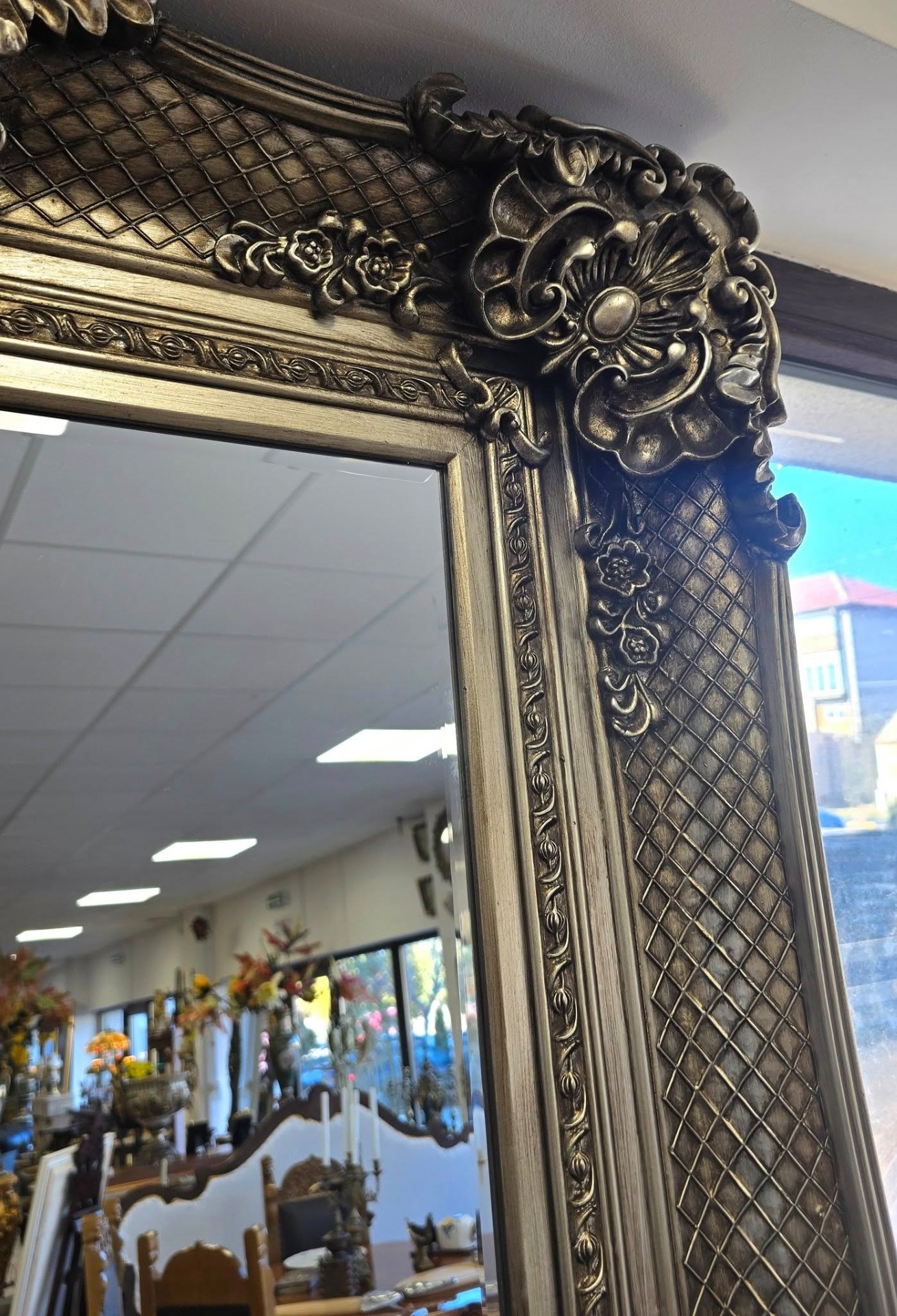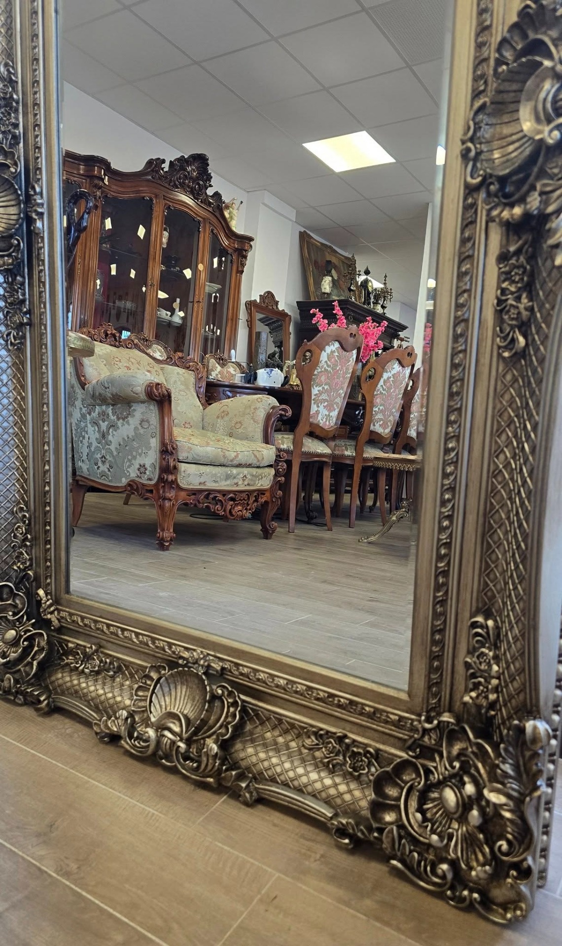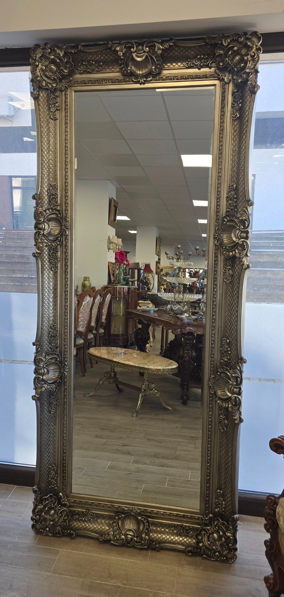 Oglinda deosebită, cu ramă argintie, în stil baroc.