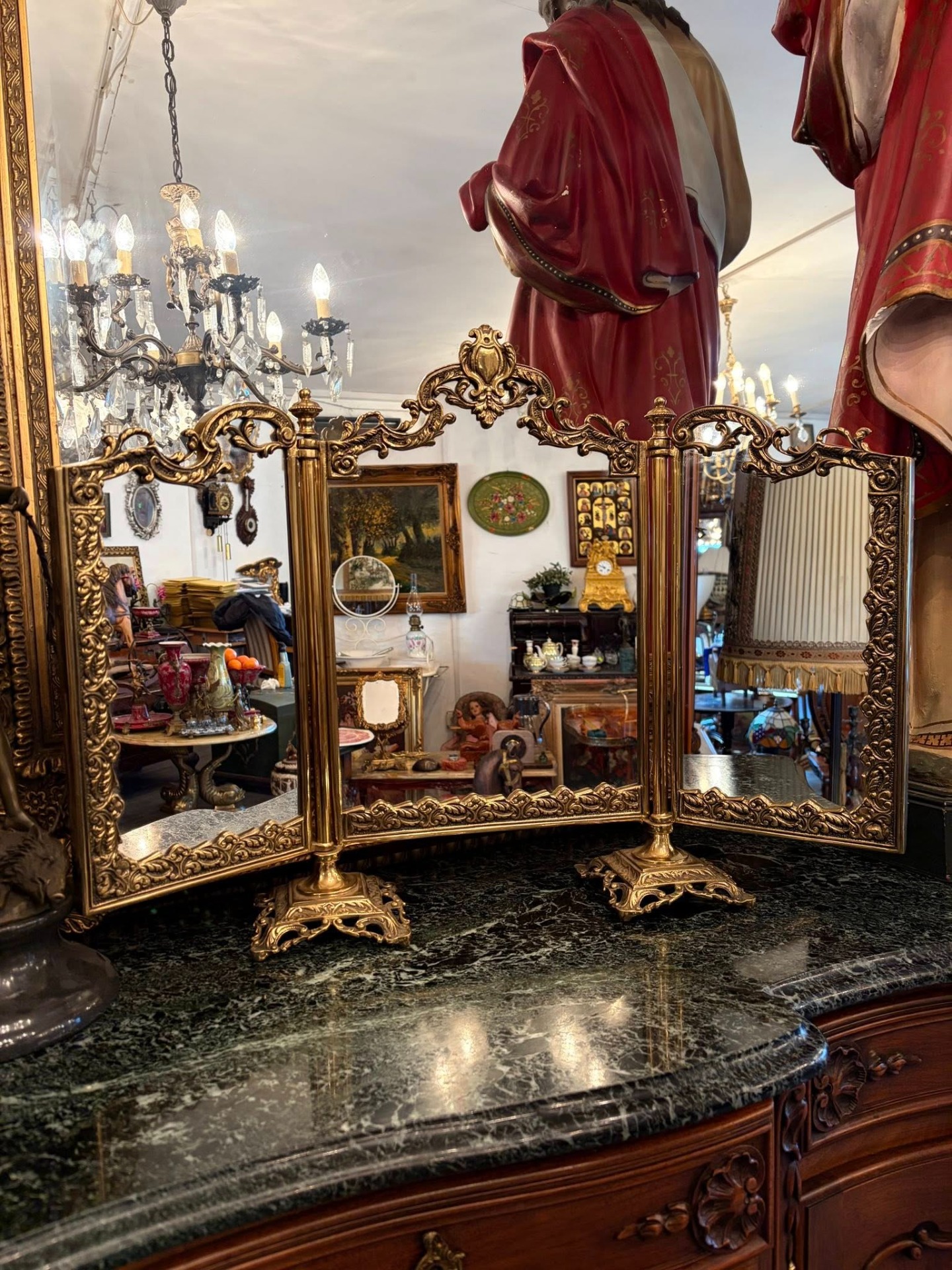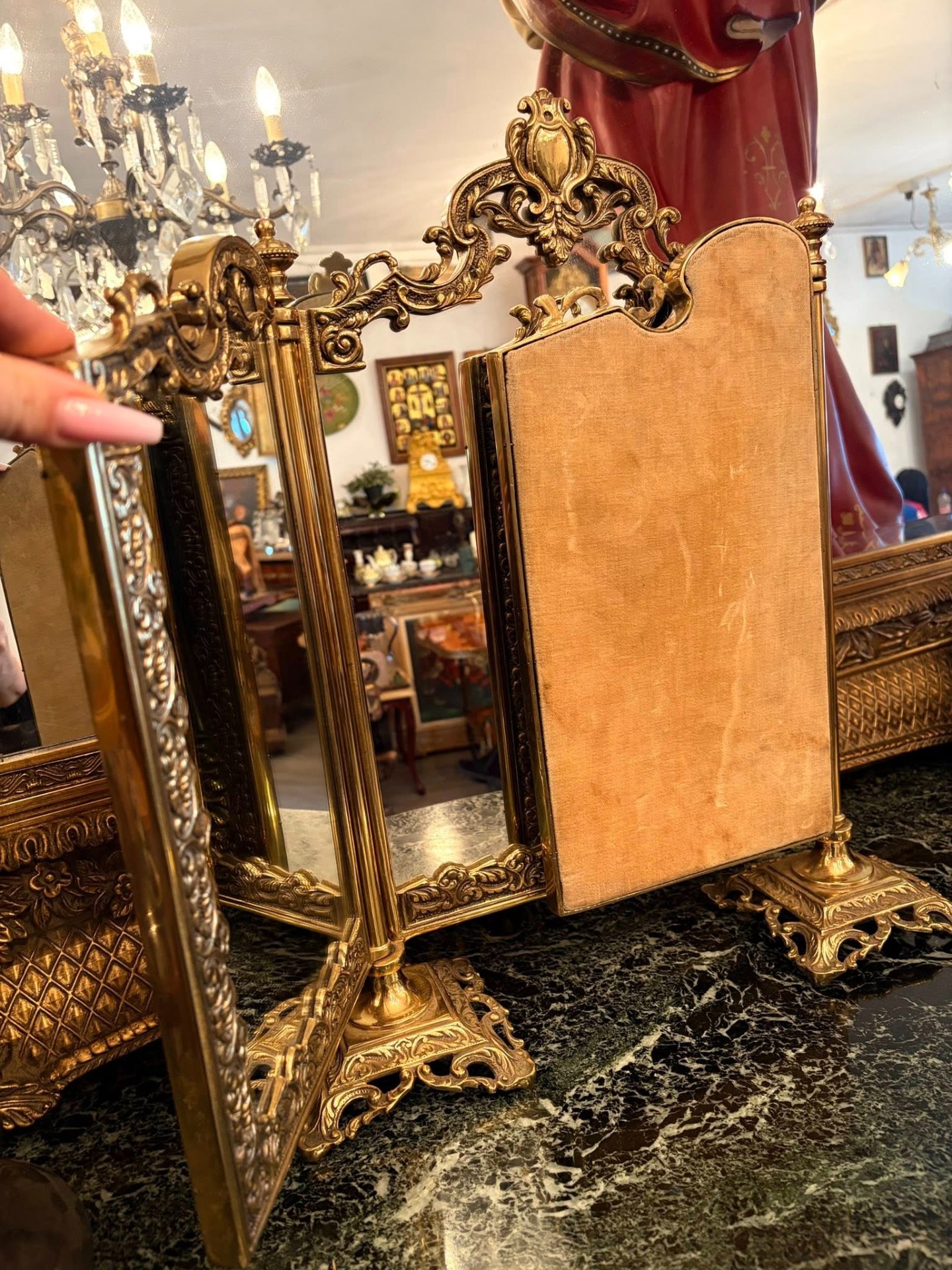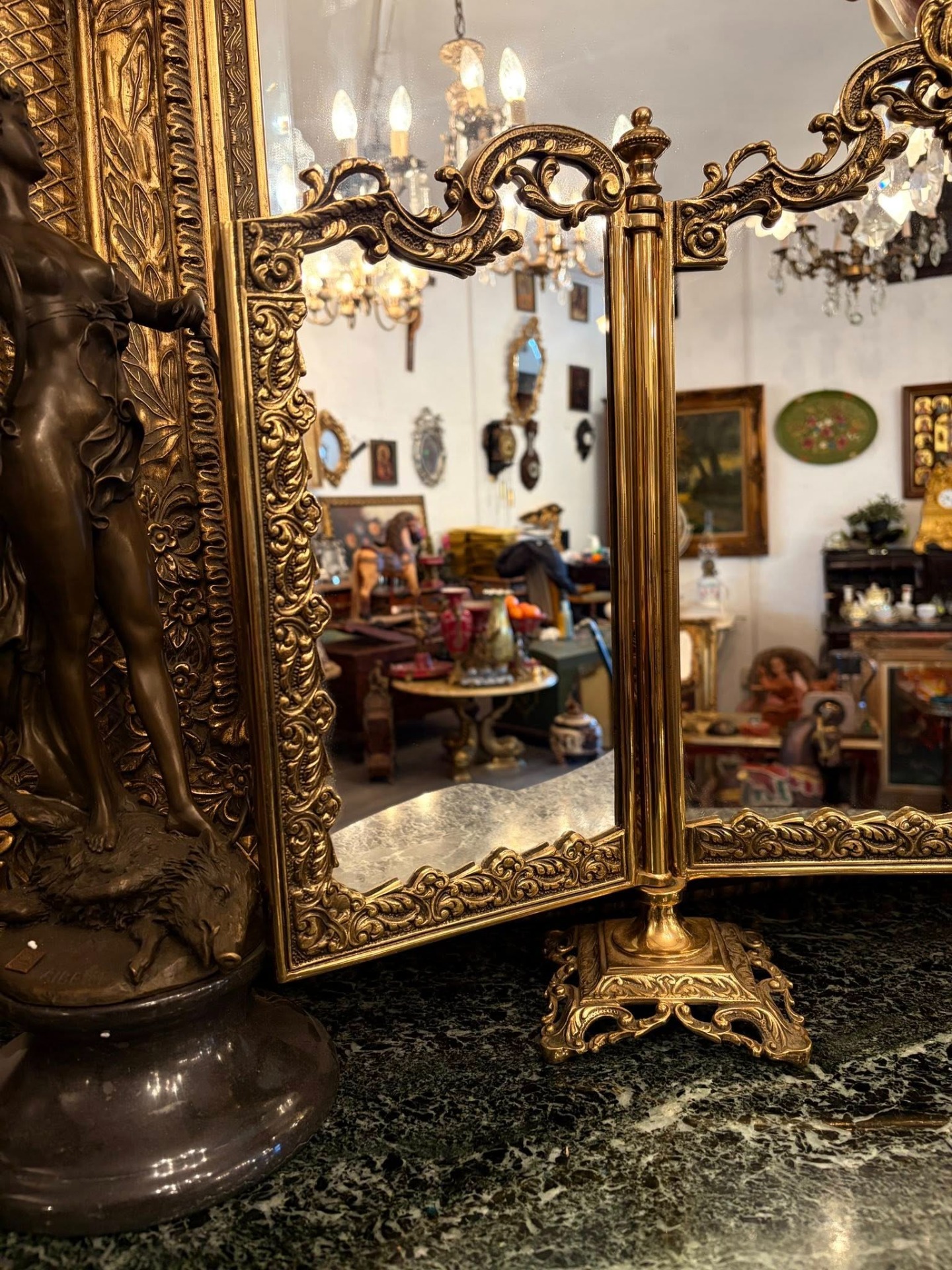 De vânzare superbă oglindă triptic (cu trei fețe), din bronz masiv, bogat ornamentată în stil baroc/rococo. Piesă elegantă, ideală pentru toaletă, comodă, vitrină sau decor interior clasic.