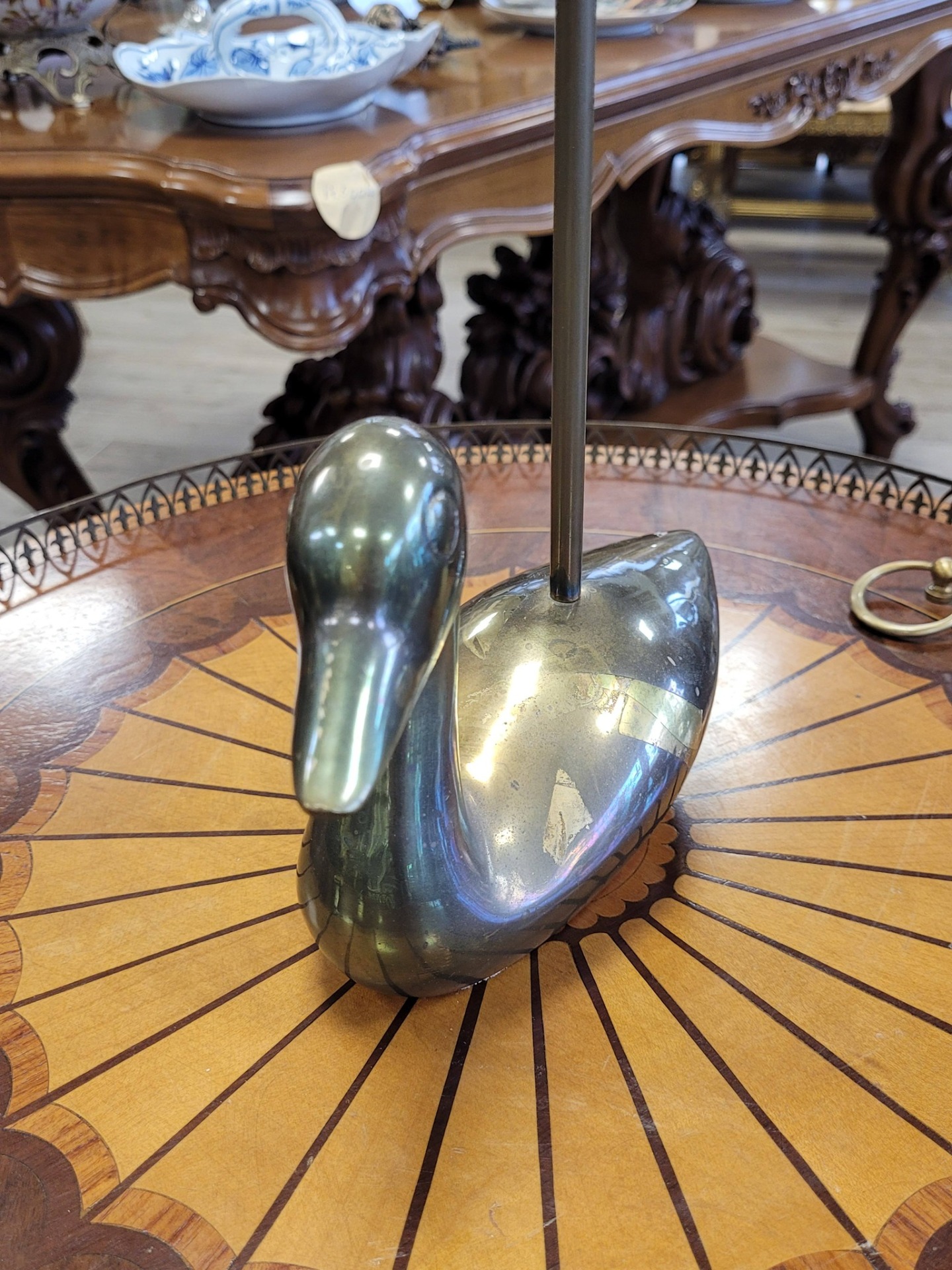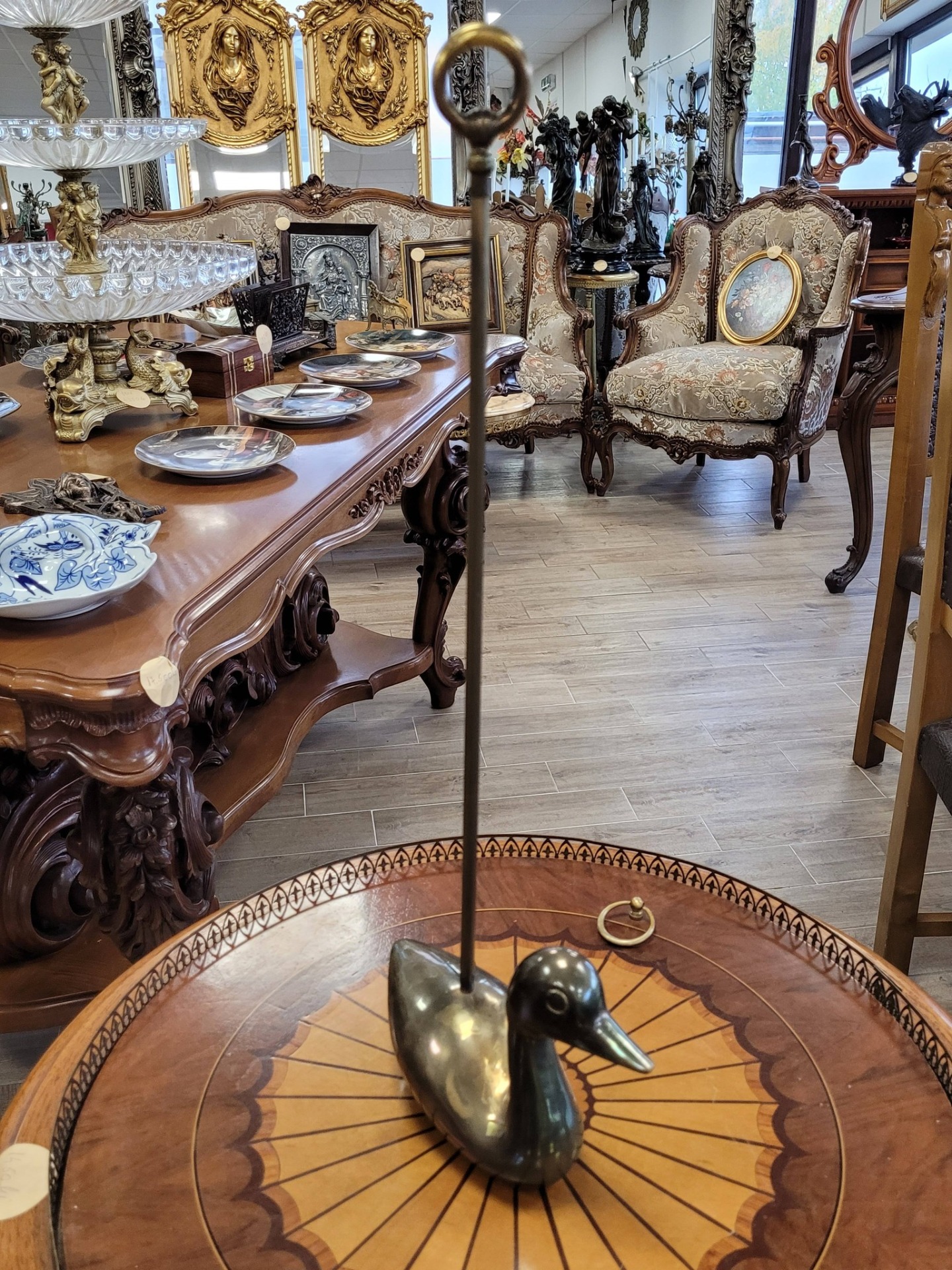 Opritor pentru ușă vechi, din bronz, cu baza în forma stilizată a unei rațe, prevăzut cu o tijă înaltă, finisată la capăt cu un inel.