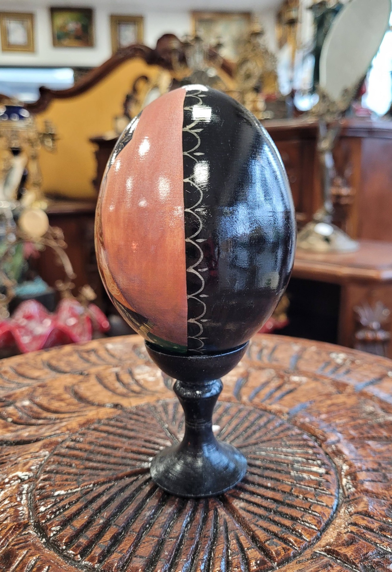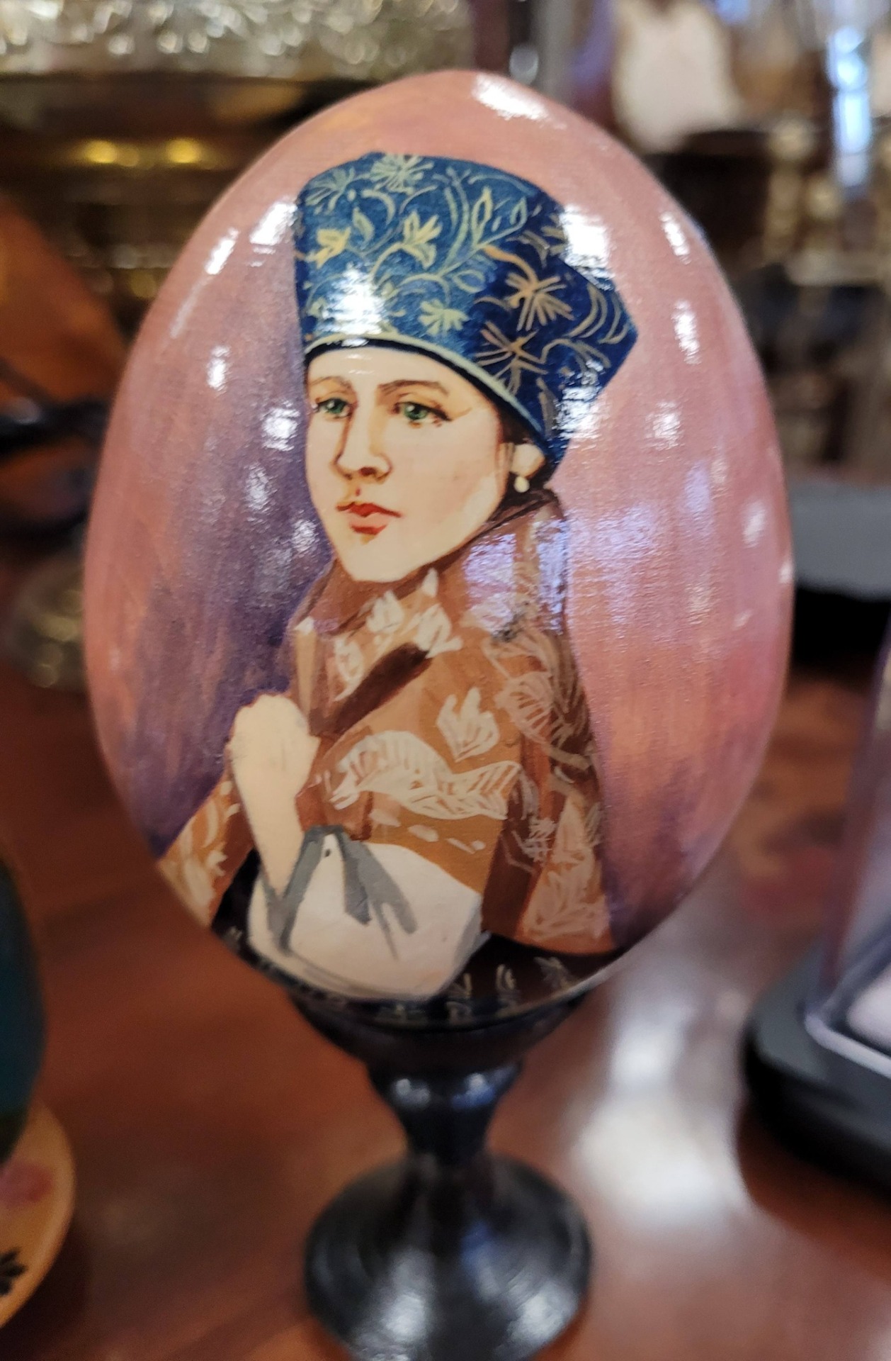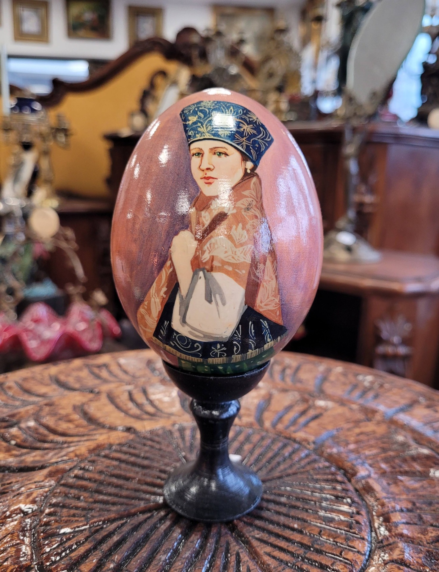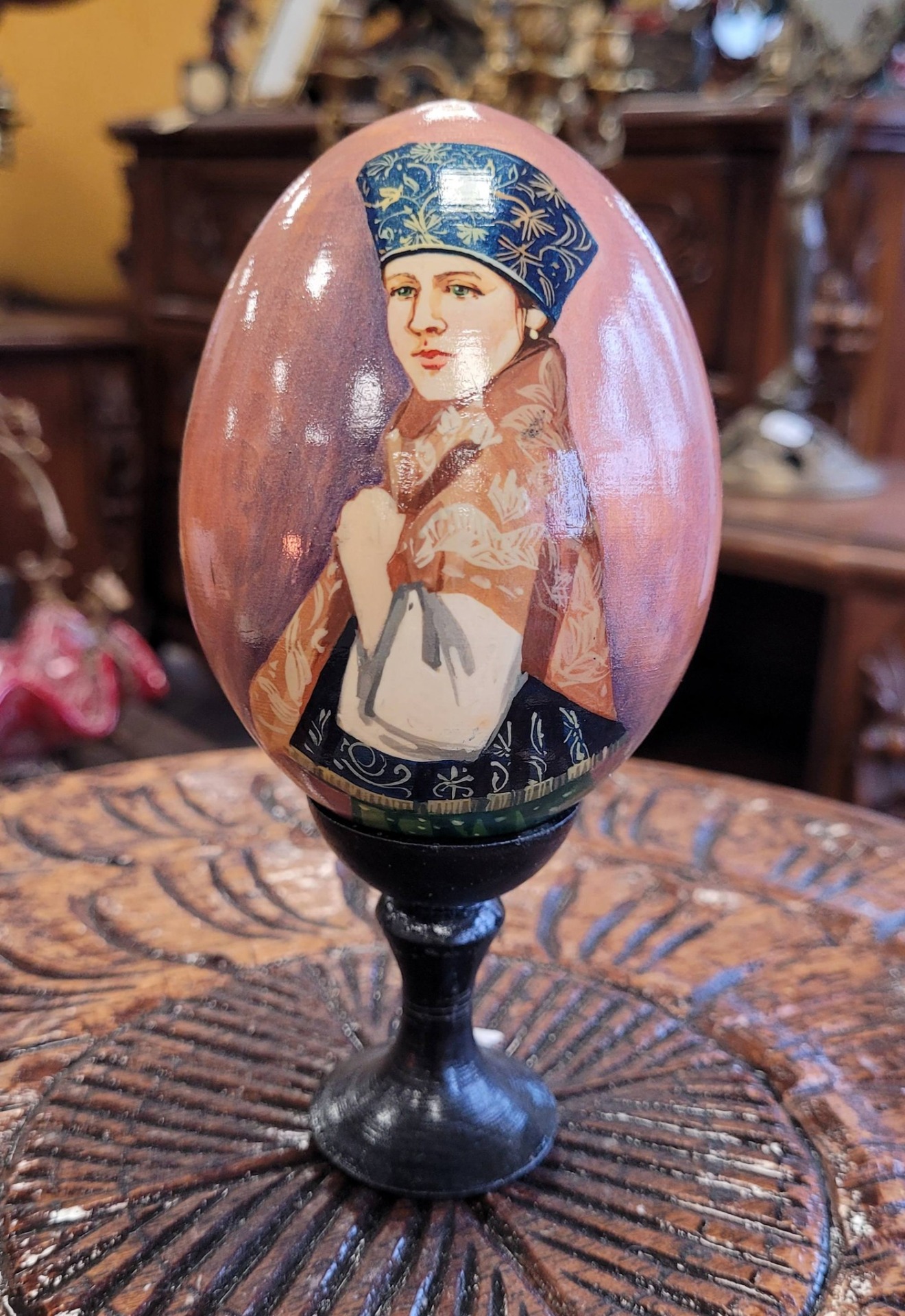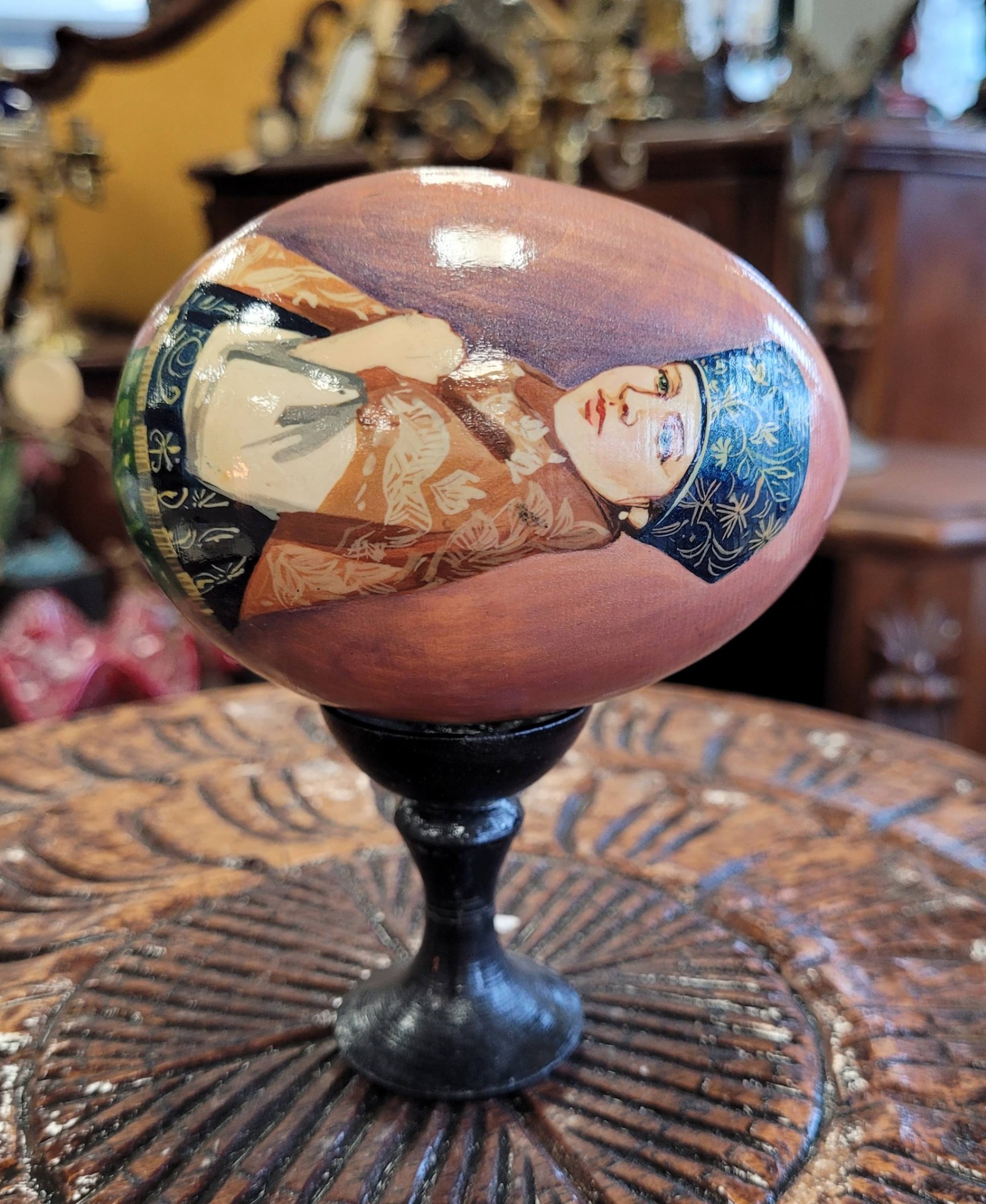 Ou decorativ din lemn pictat manual - Portret feminin cu maramă albastră (Artă Miniaturală), o veritabilă piesă de artă, pictată manual cu o atenție remarcabilă