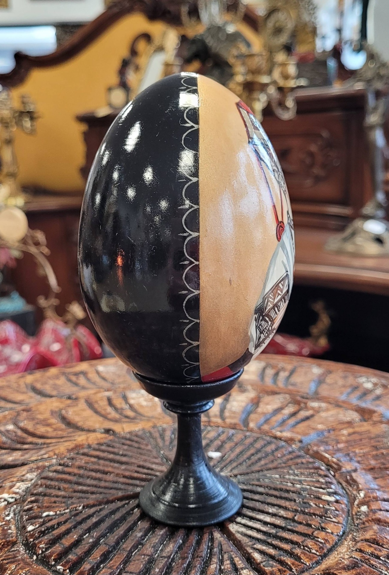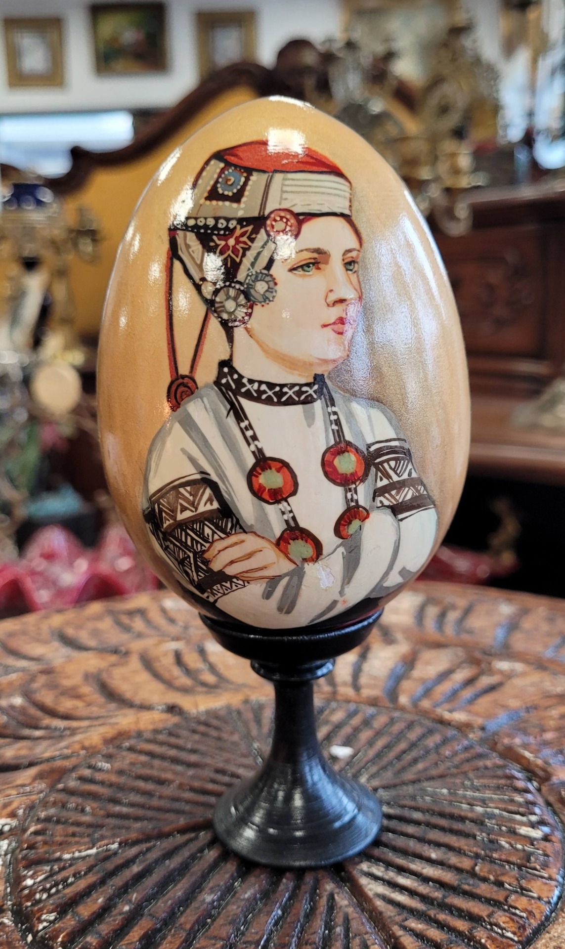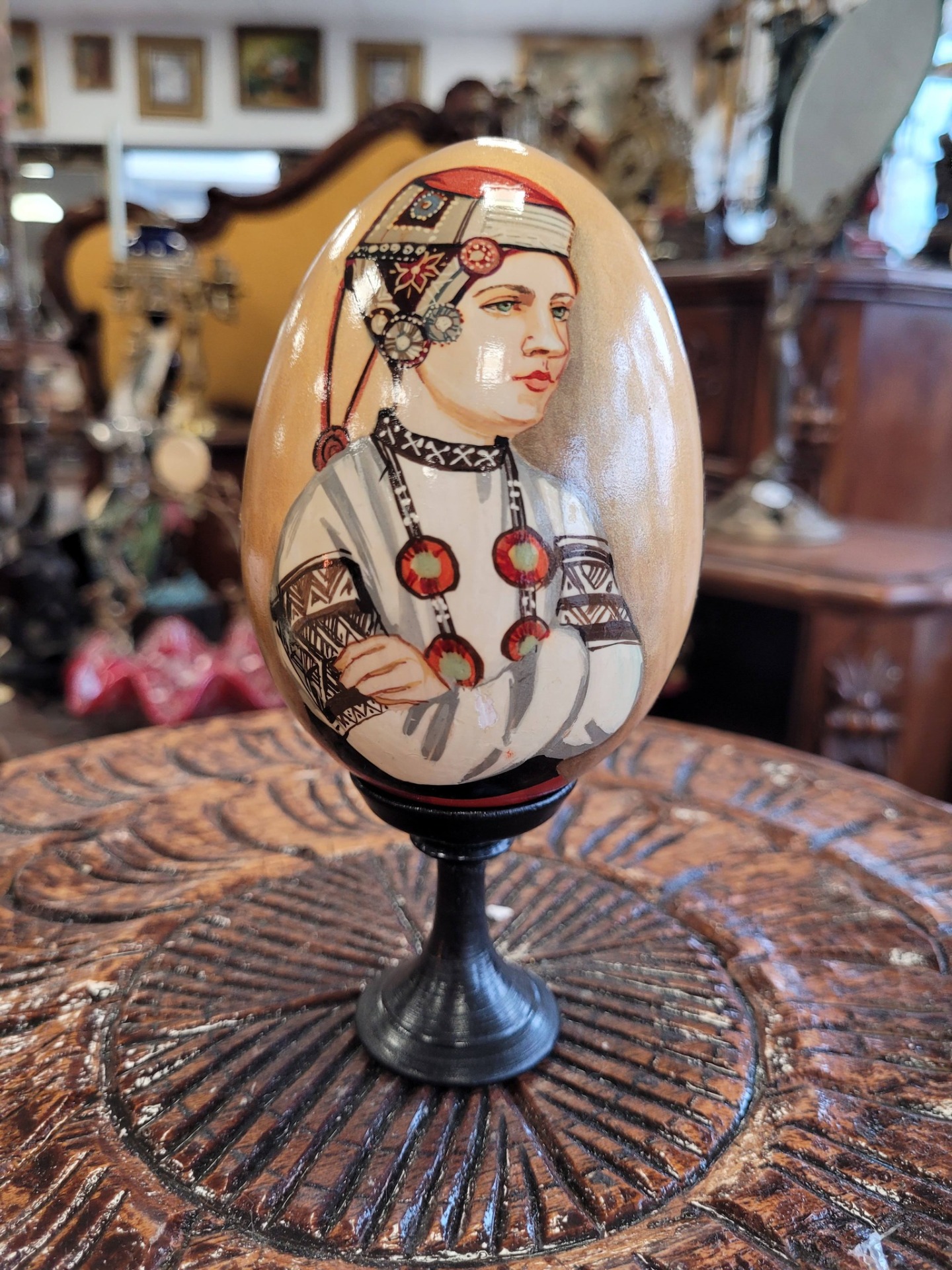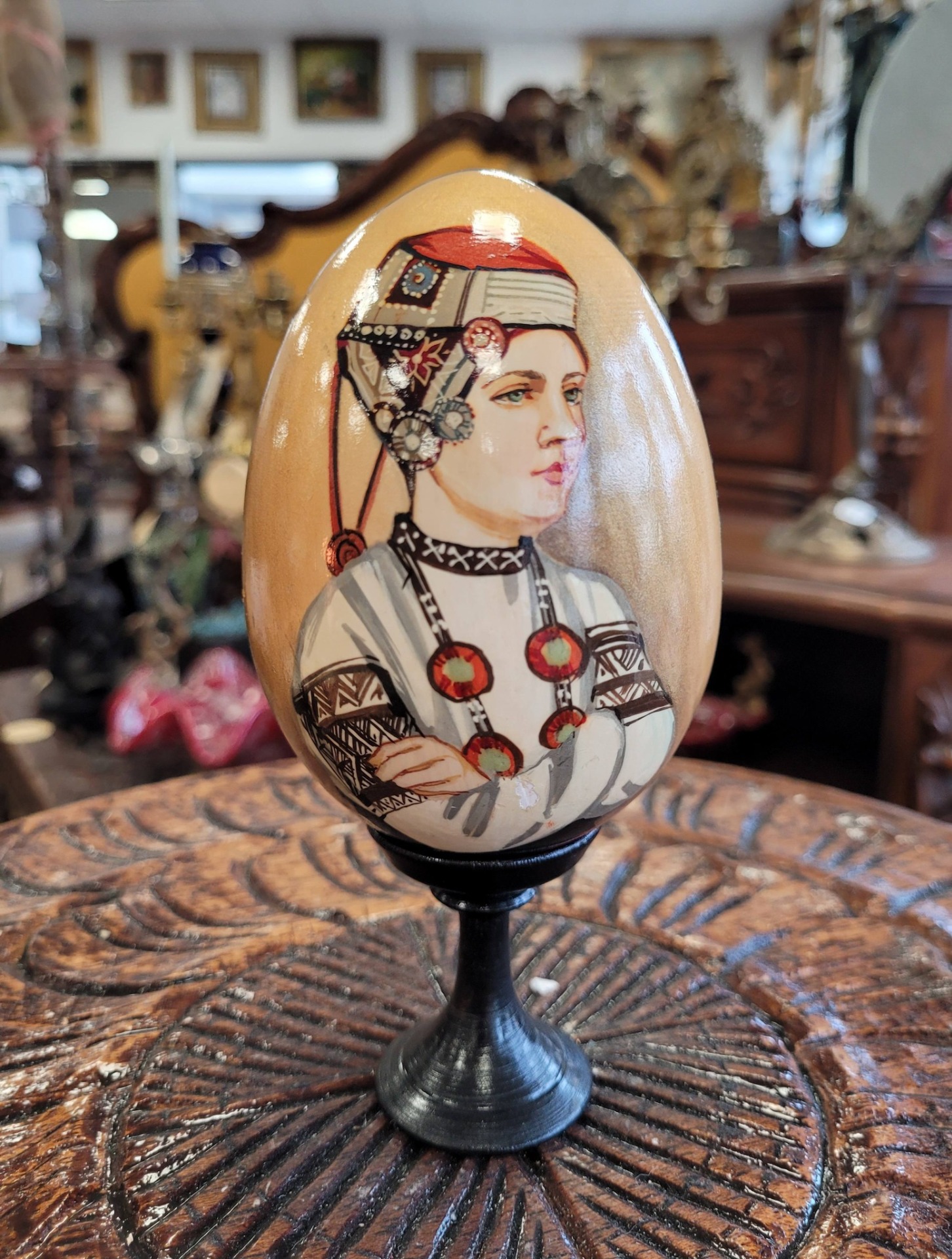 Ou decorativ din lemn pictat manual - Portret feminin în costum tradițional (Artă Miniaturală), o veritabilă piesă de artă, pictată manual cu o atenție