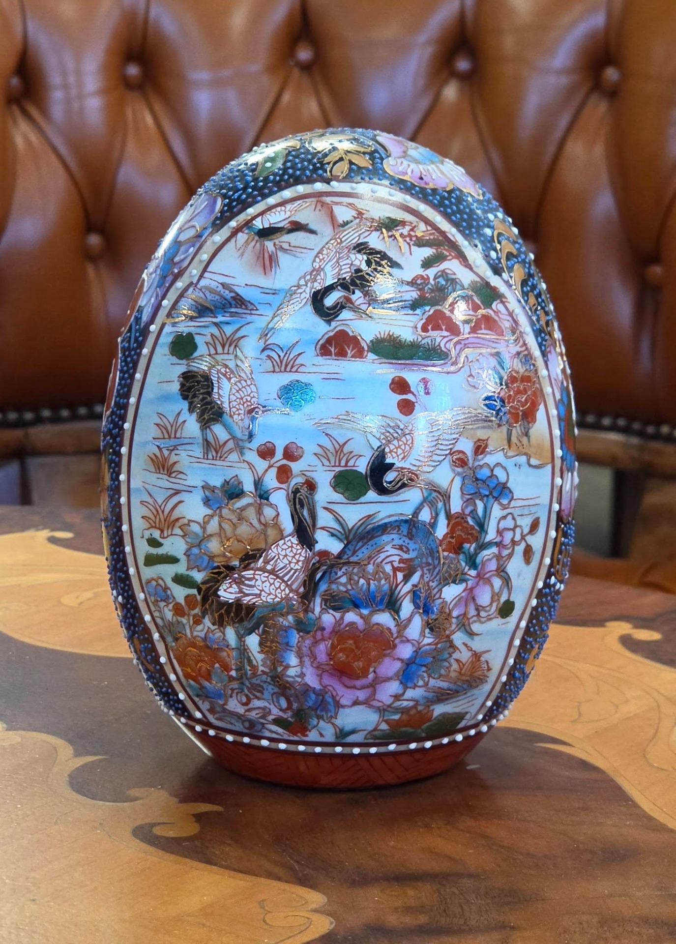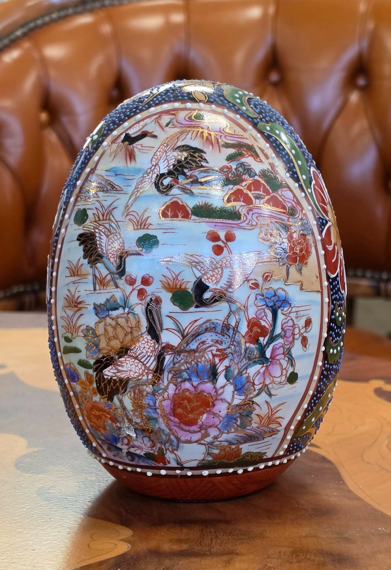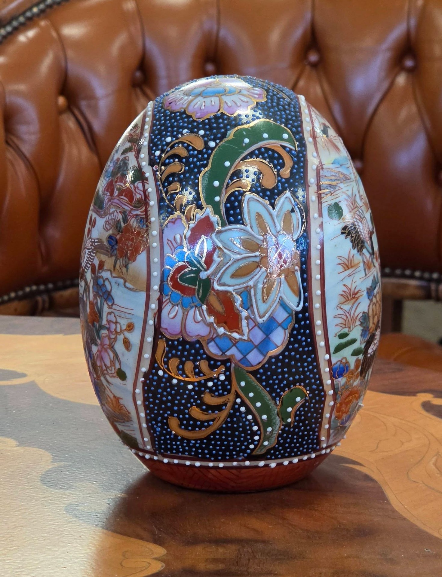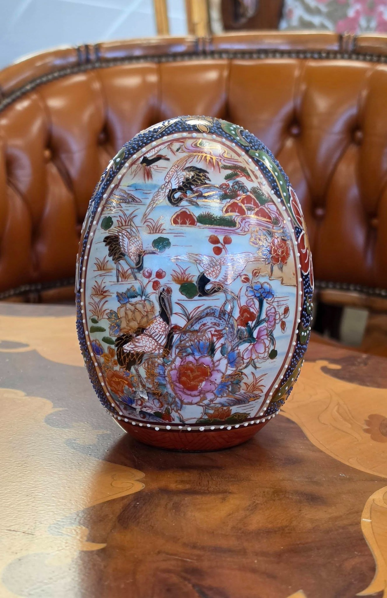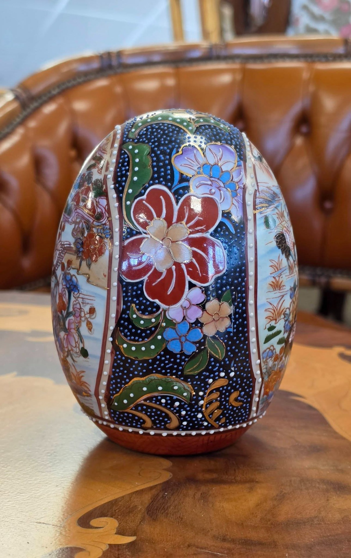 Ou decorativ din porțelan, stil Satsuma, pictat manual, ideal pentru a completa un decor rafinat sau o colecție de obiecte asiatice.