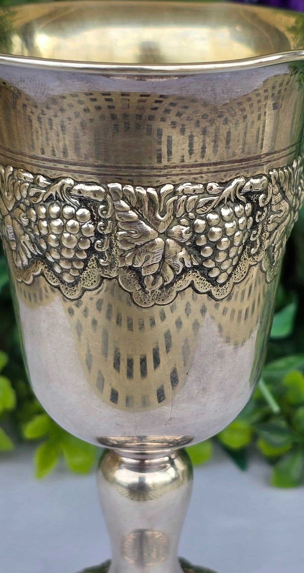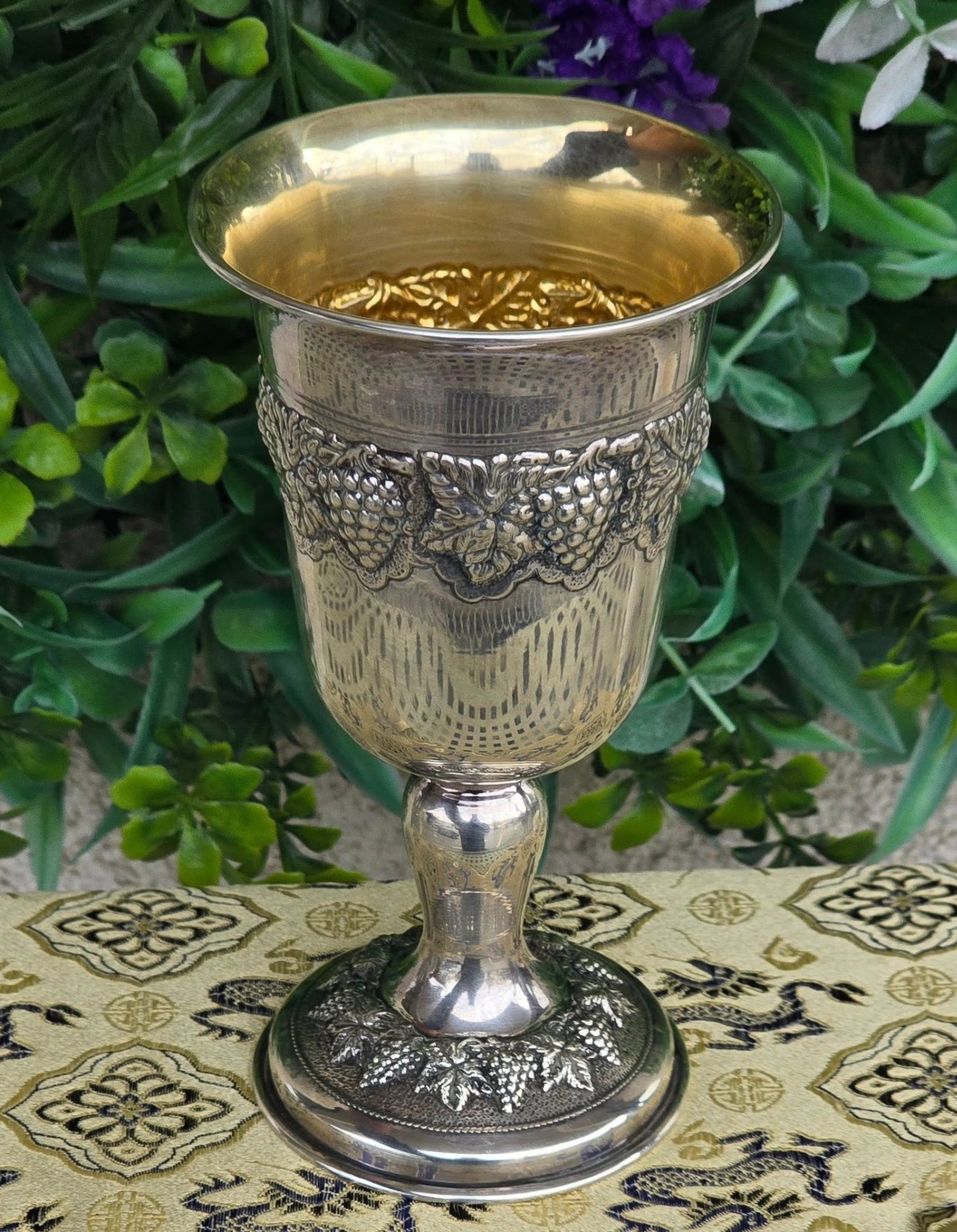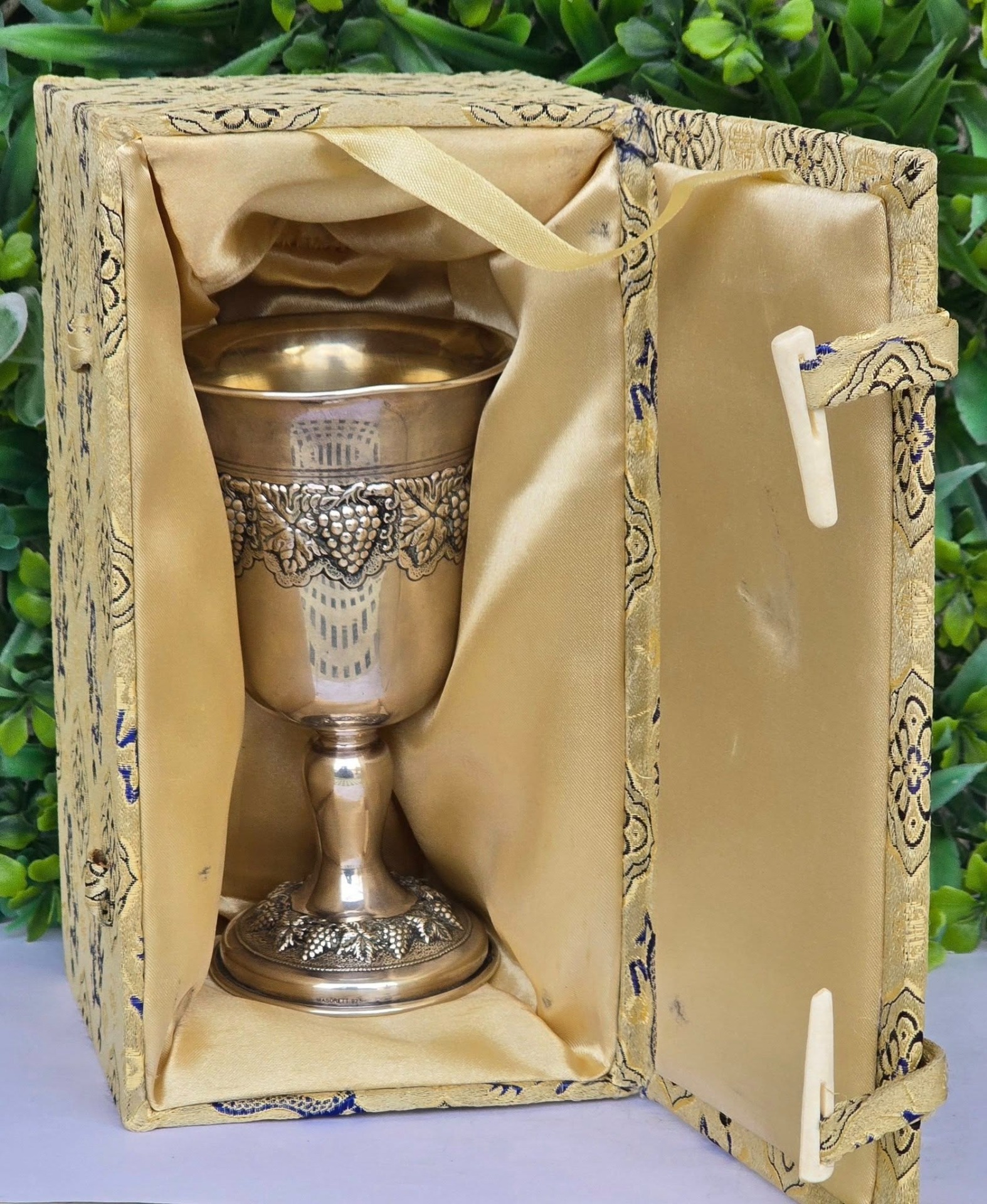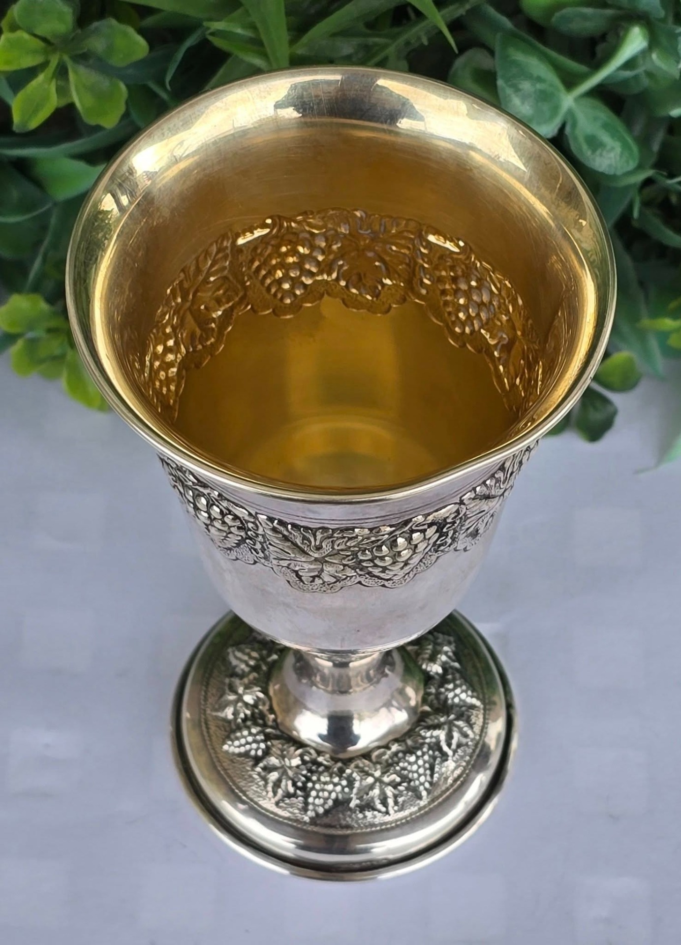 Pahar Kiddush din argint, cu interior aurit, decorat în motiv viticol, cu cutie originală, manufactură de atelier israelian (anii 1950-1960, Israel).