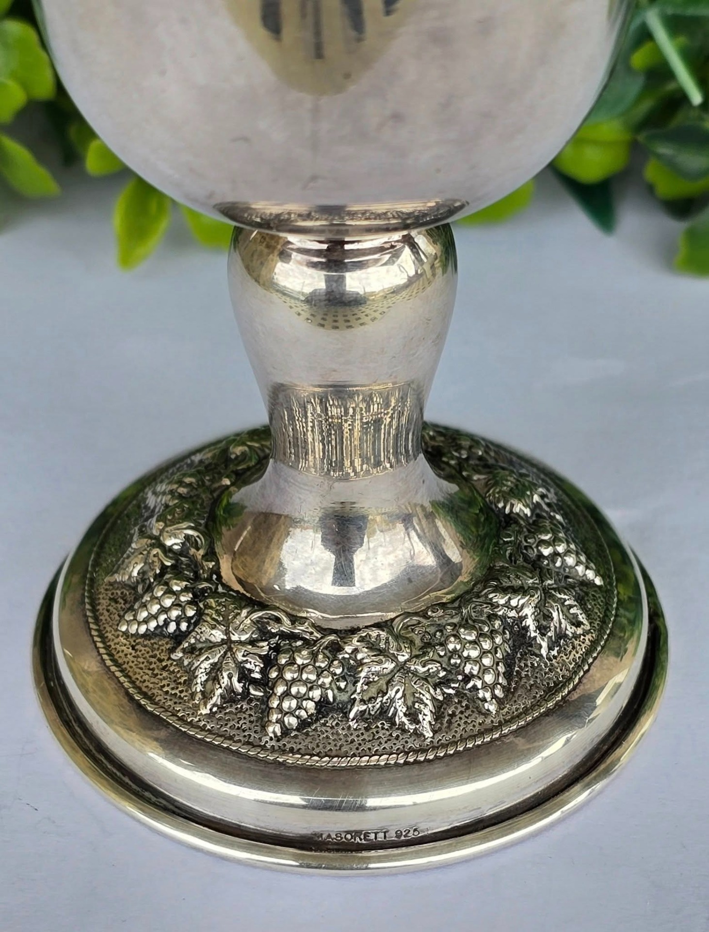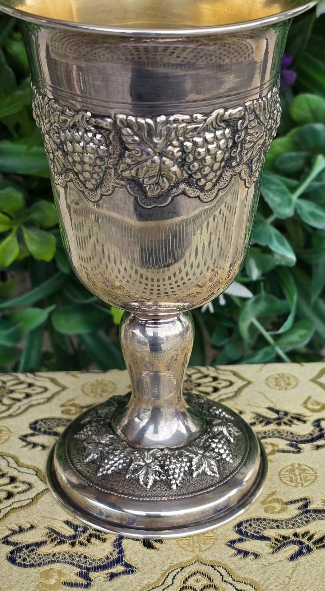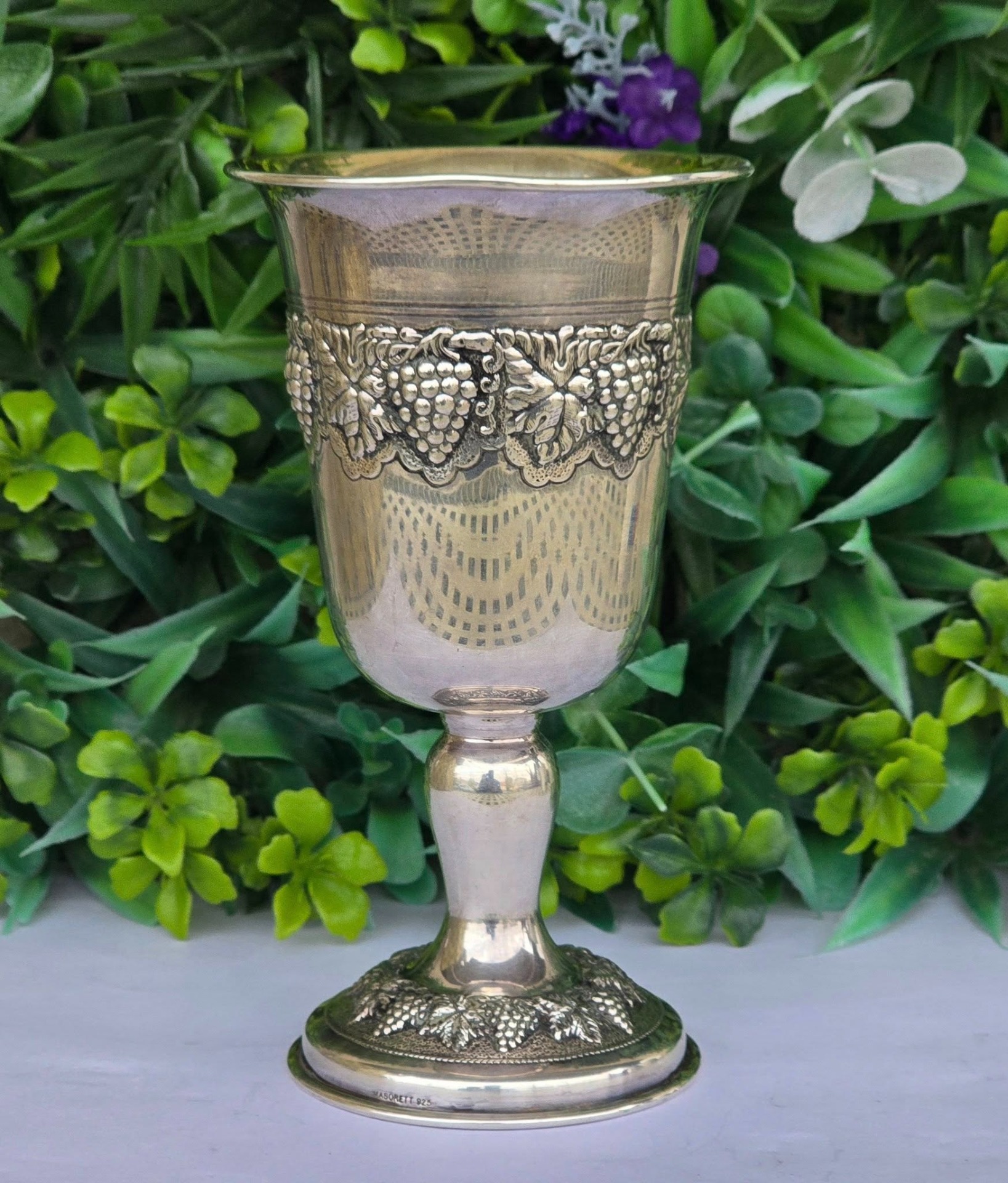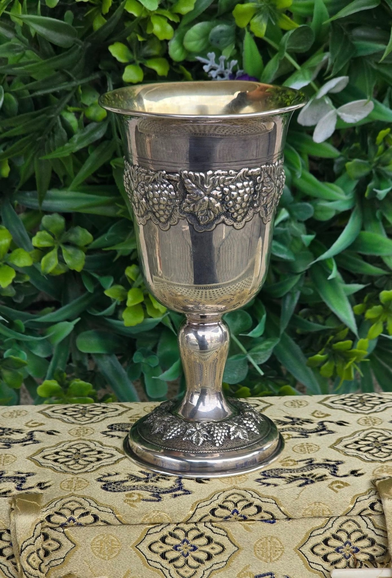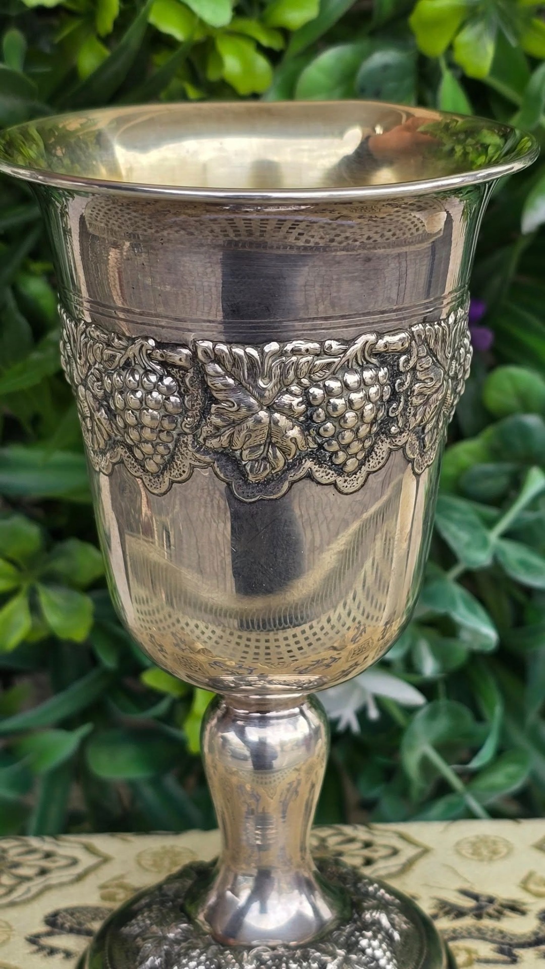 Pahar Kiddush din argint, cu interior aurit, decorat în motiv viticol, cu cutie originală, manufactură de atelier israelian (anii 1950-1960, Israel).