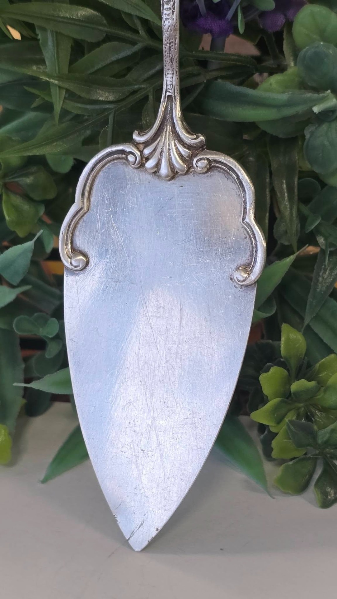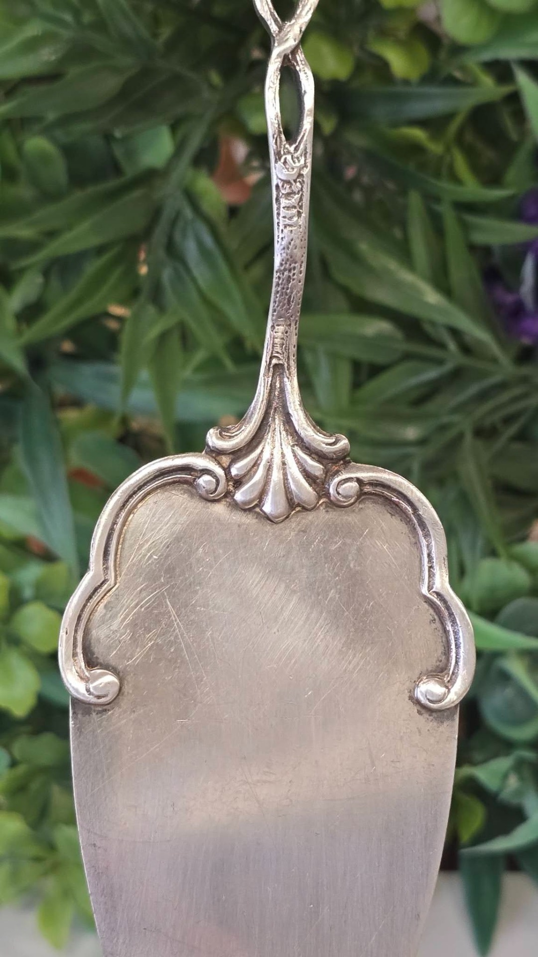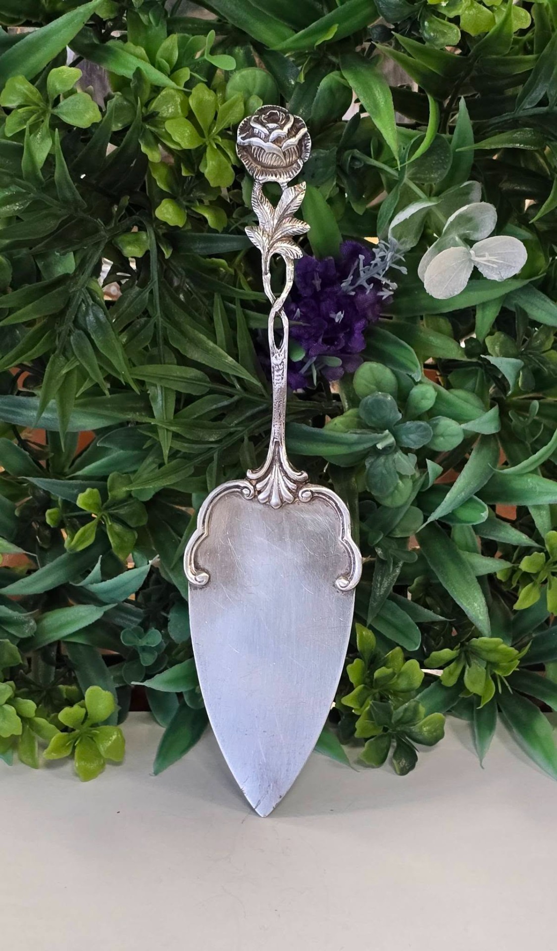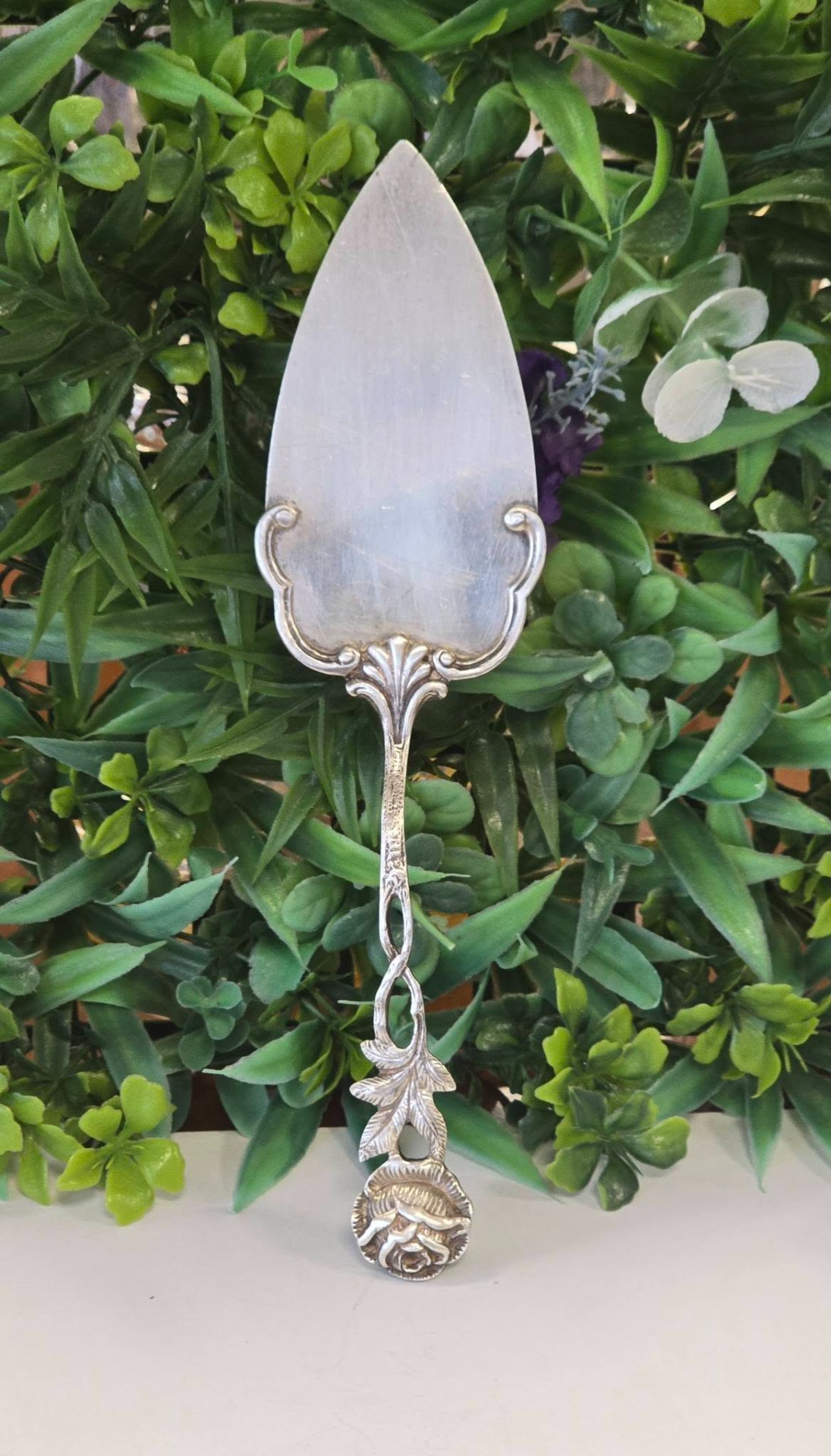 Paletă veche pentru desert, din argint, frumos lucrată manual în motiv "Hildesheim Rose" (anii 1940, Germania).