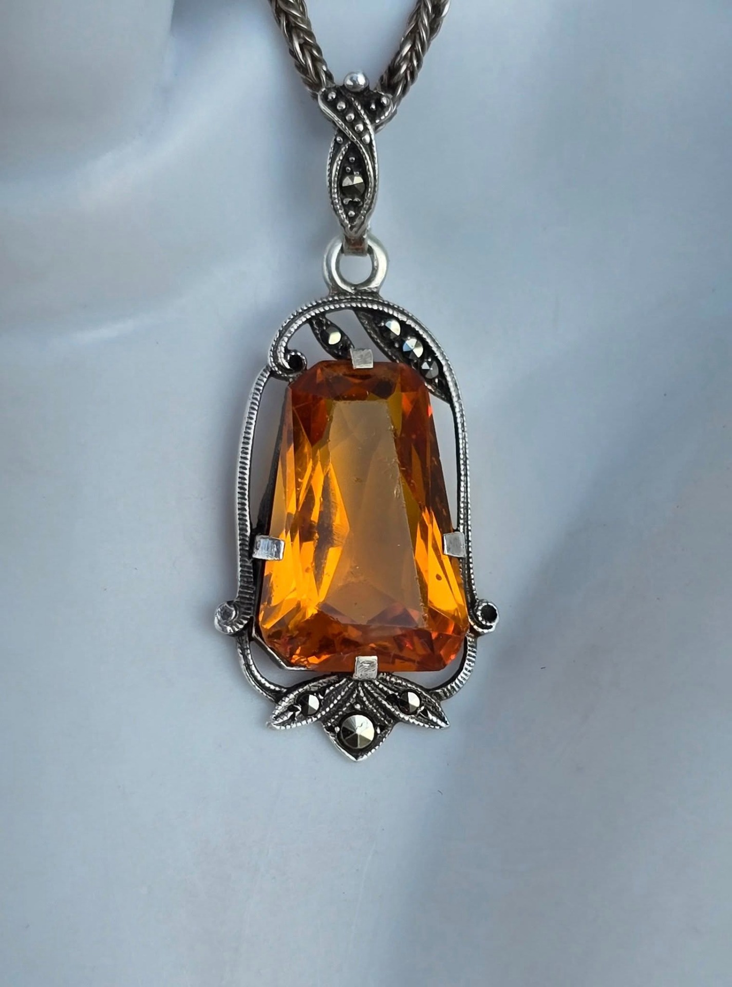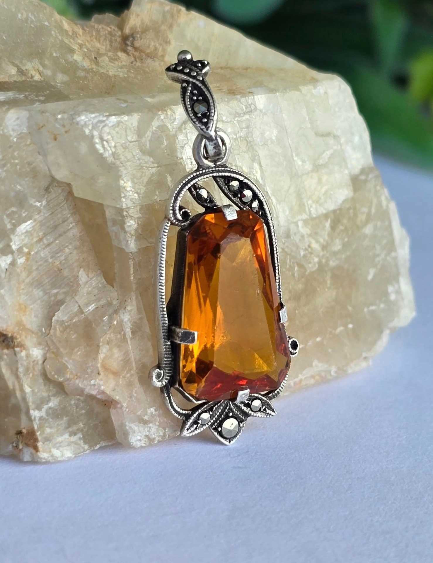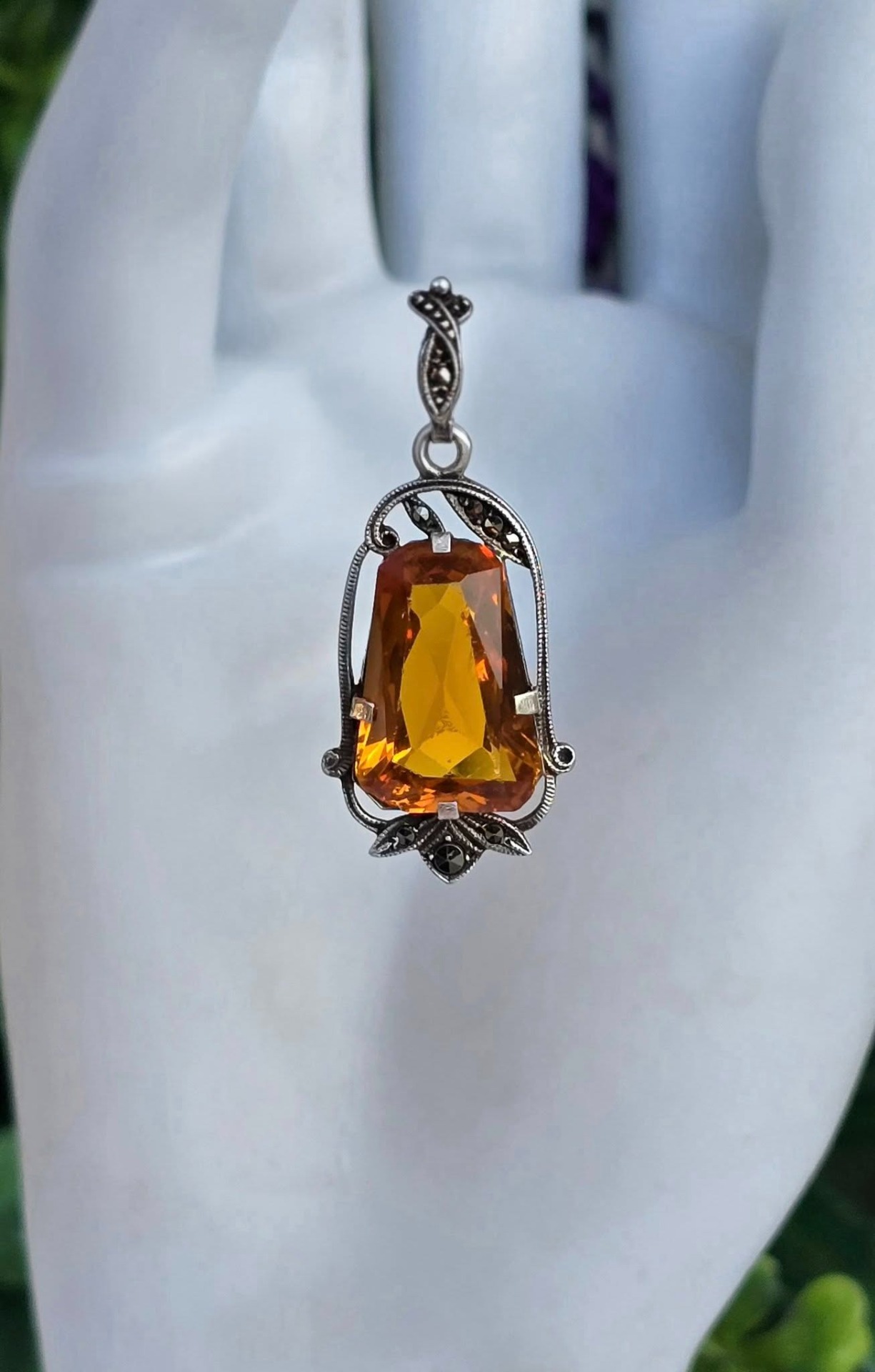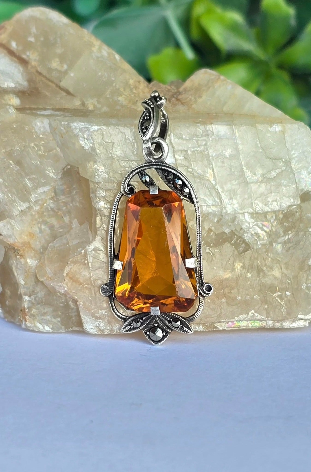 Pandantiv Art Deco din argint, cu citrin simulat și marcasite (anii 1930-1940, Germania).