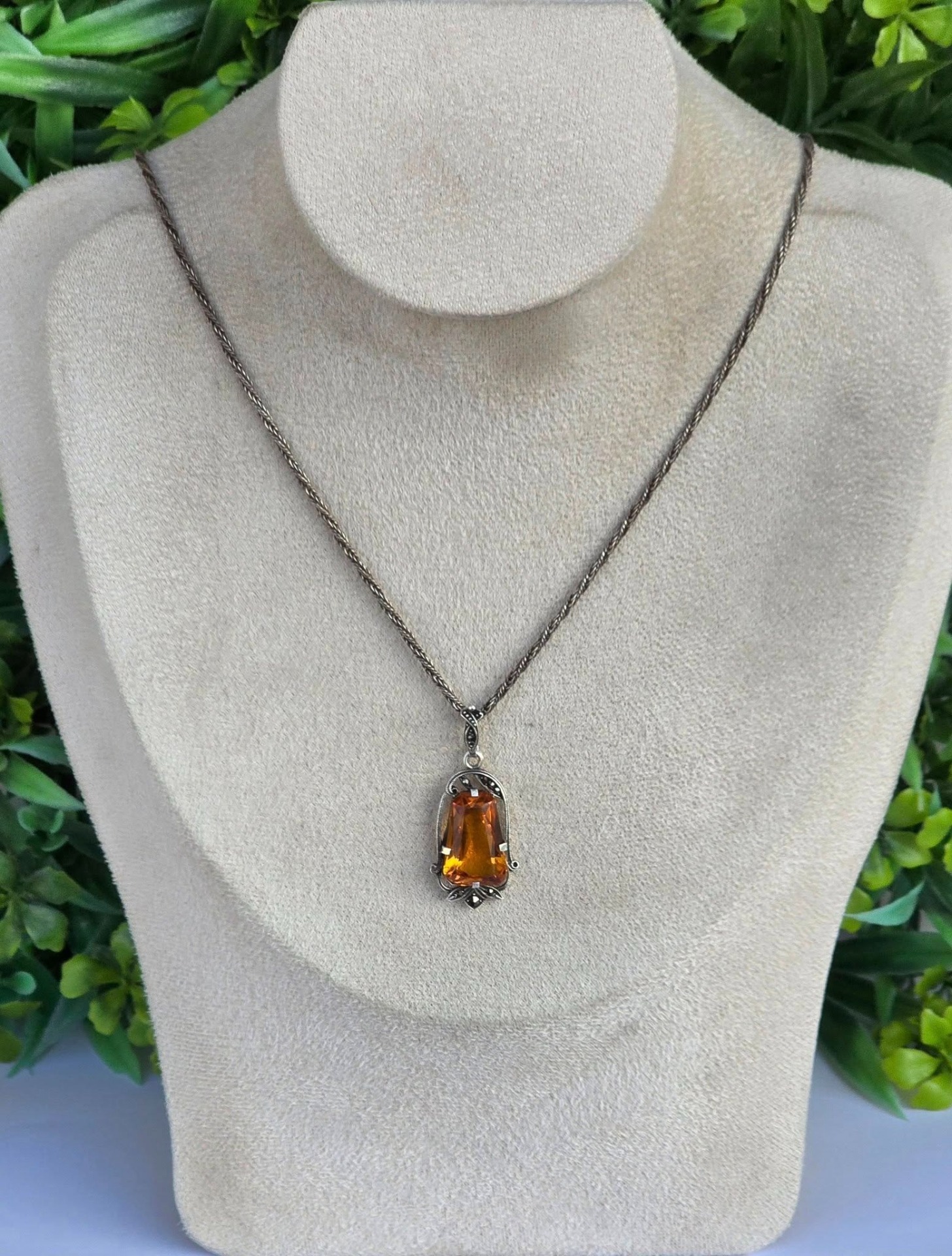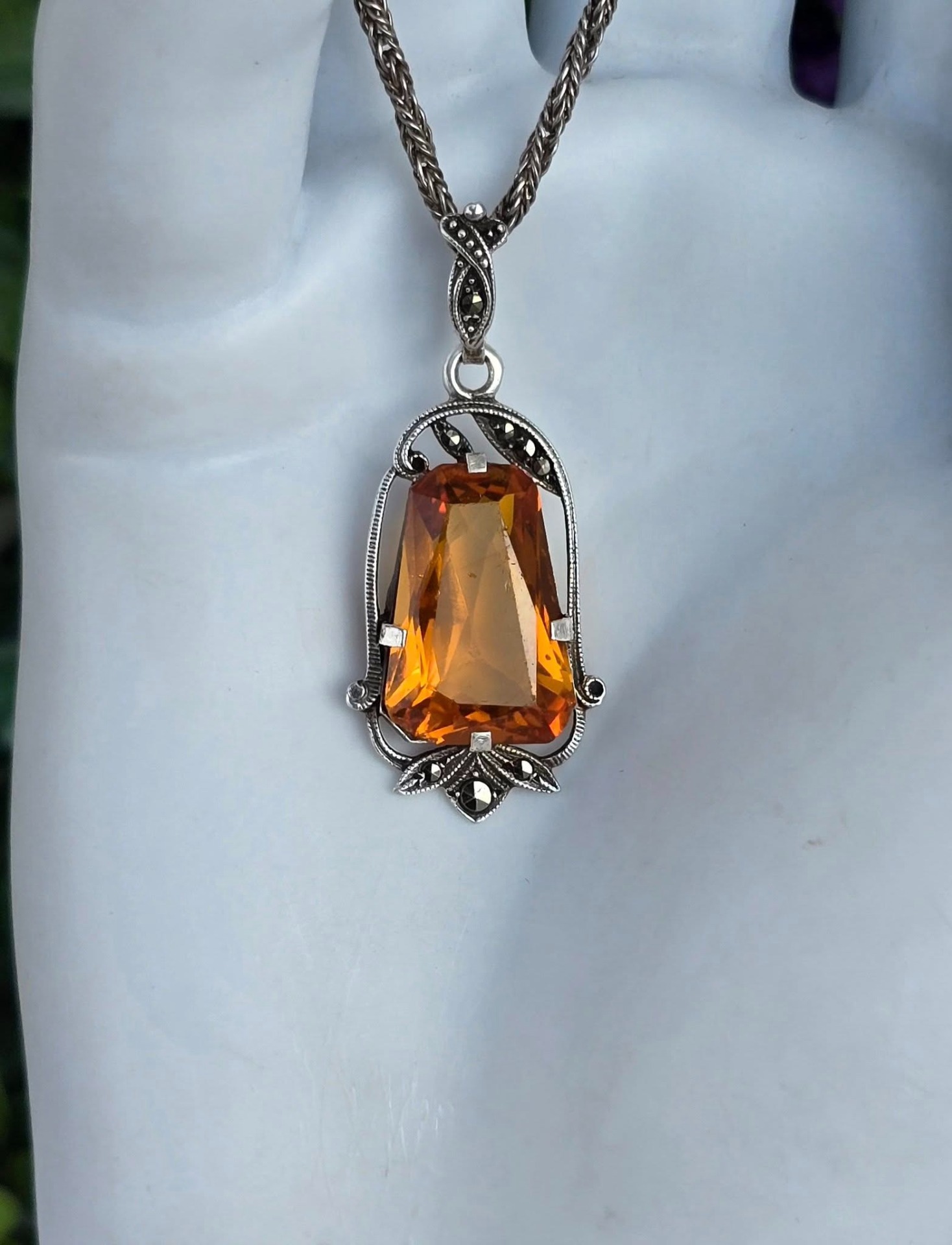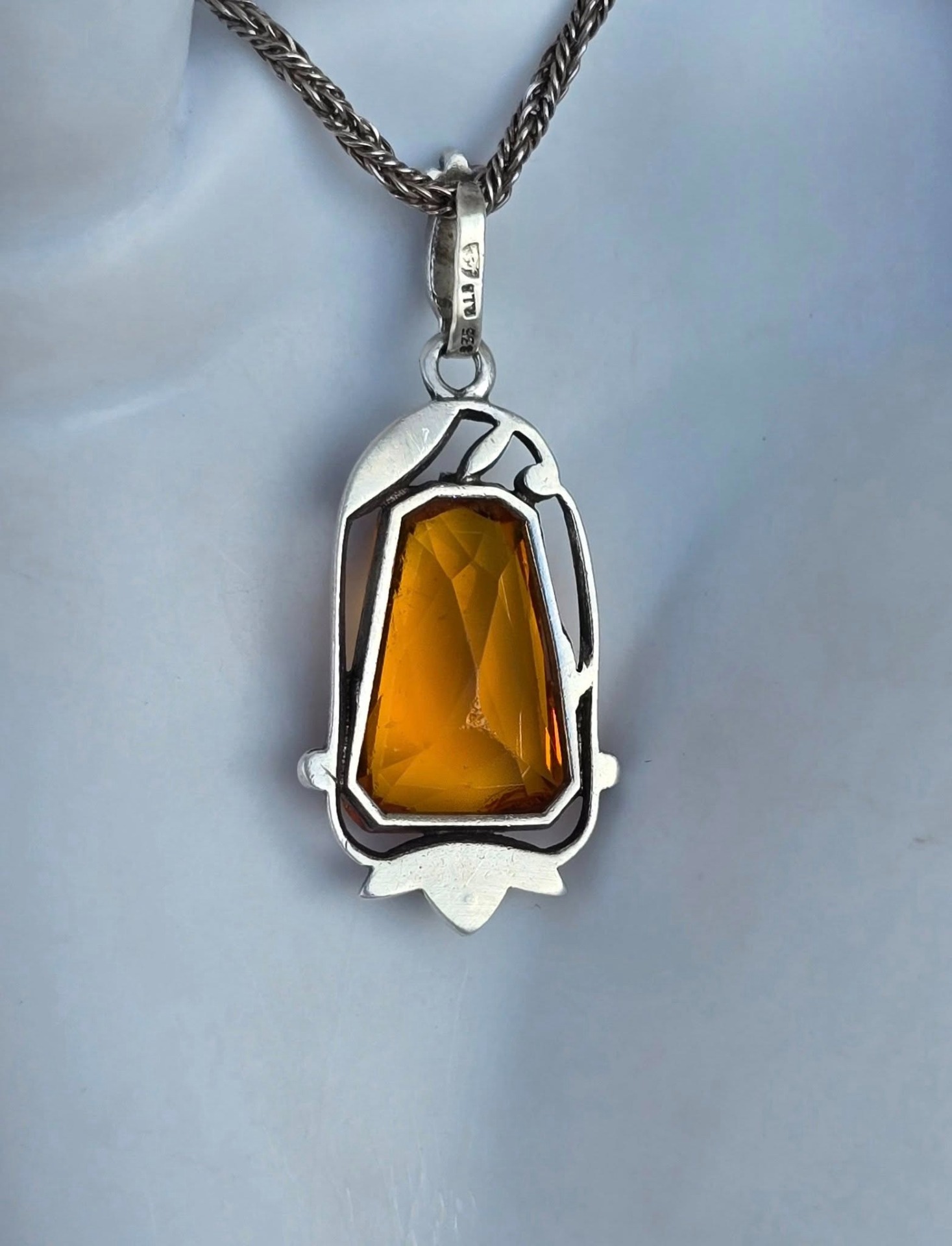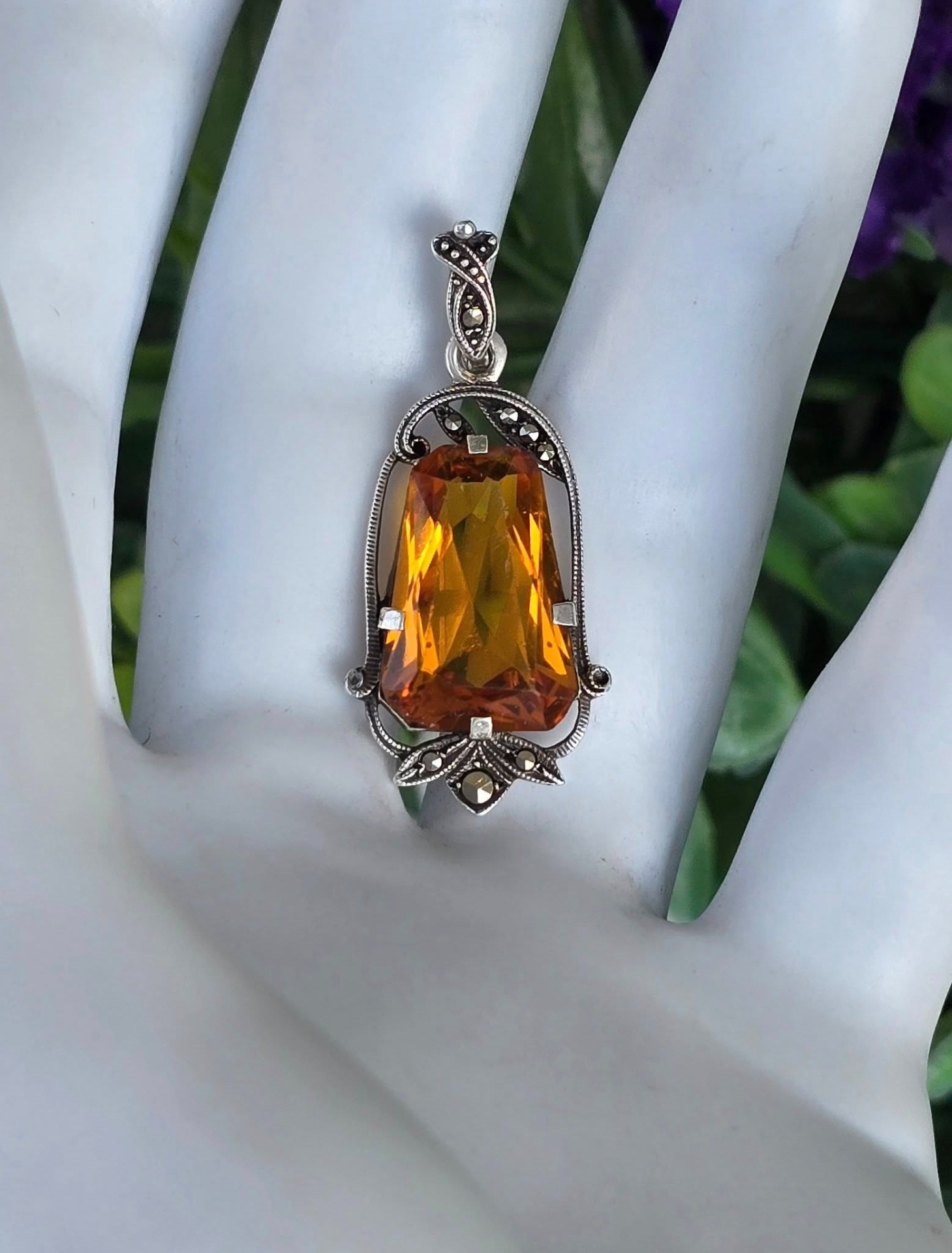 Pandantiv Art Deco din argint, cu citrin simulat și marcasite (anii 1930-1940, Germania).