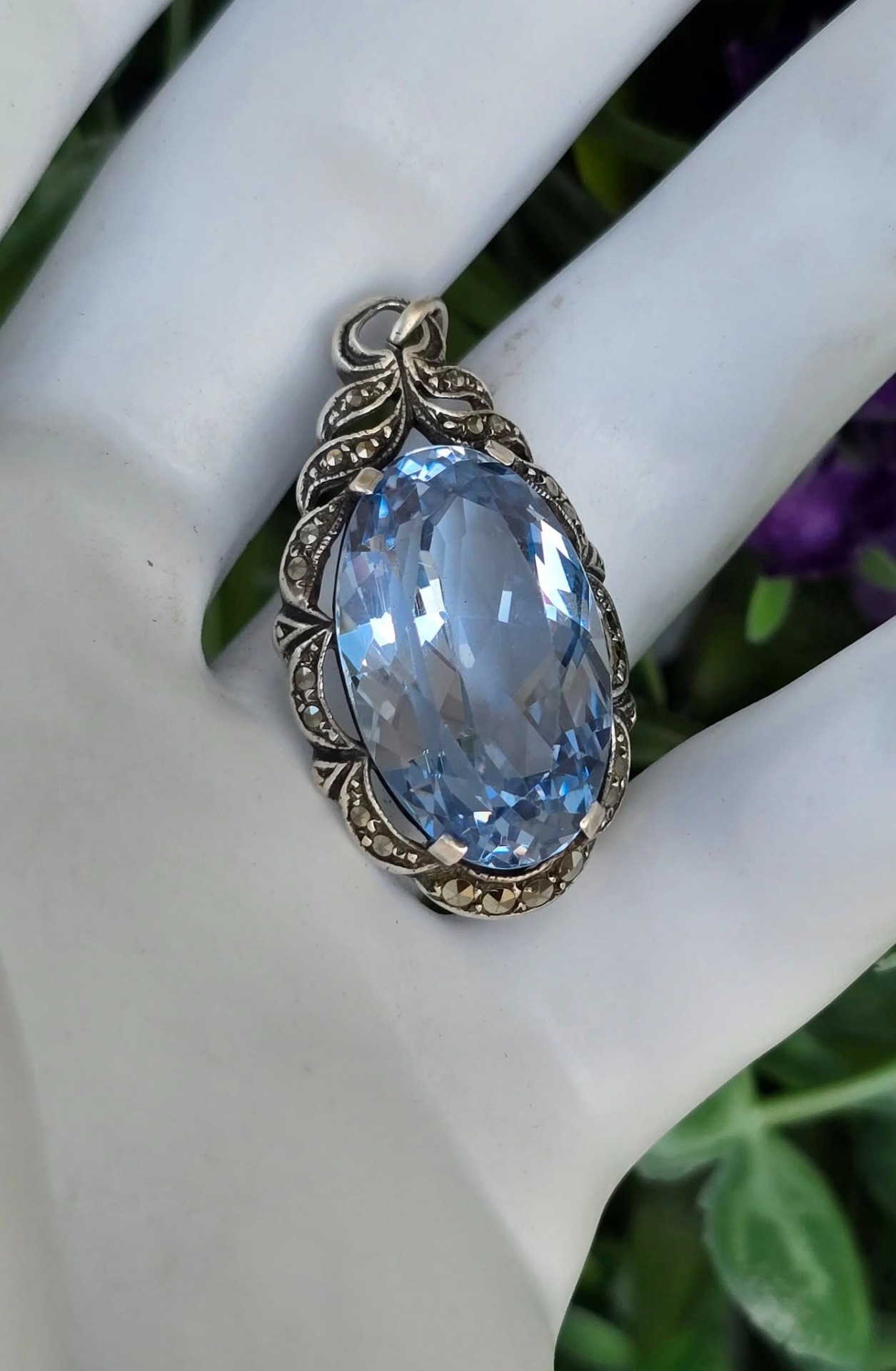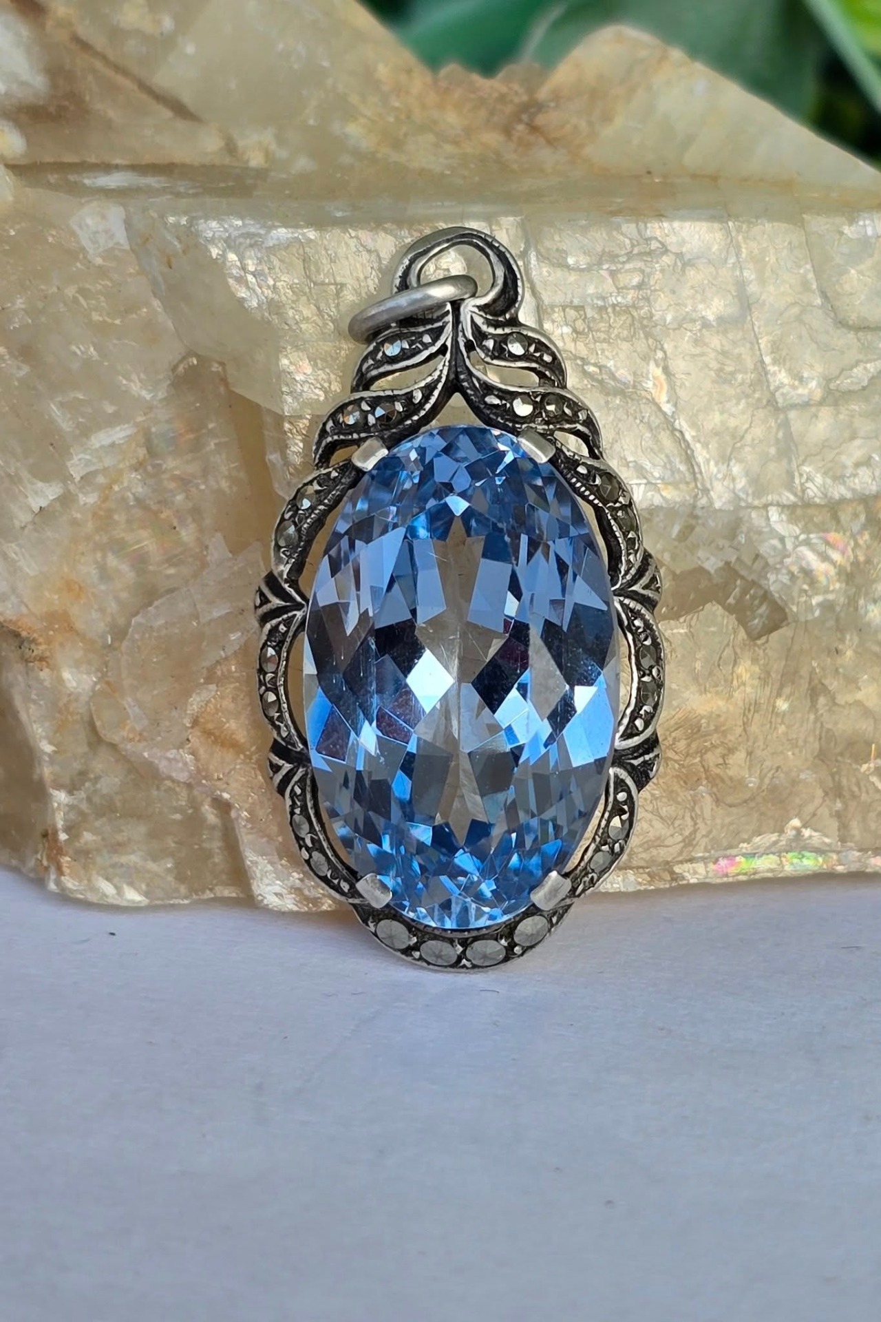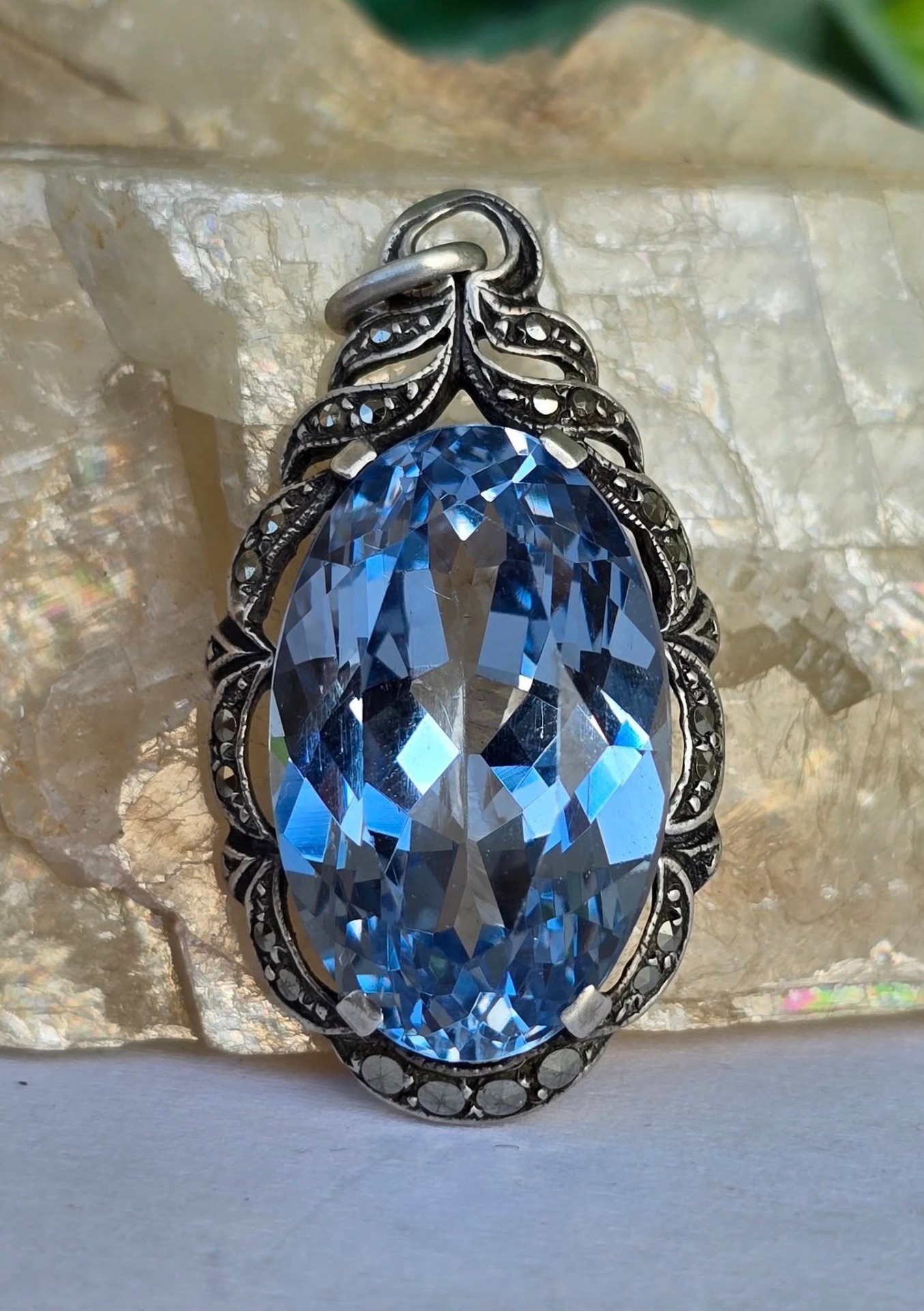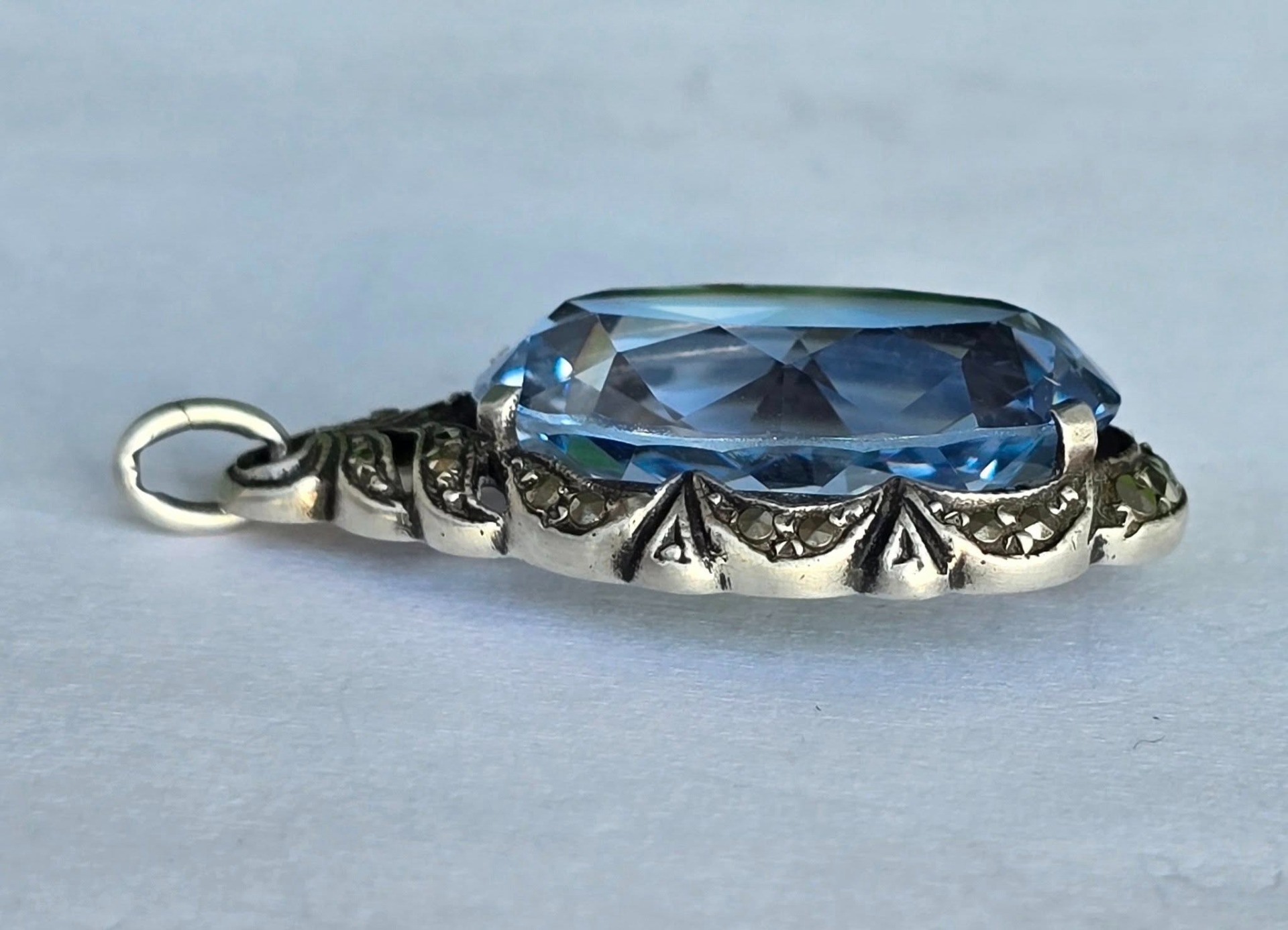 Pandantiv Art Deco din argint, cu un superb topaz natural și marcasite (anii 1930-1940, Germania).